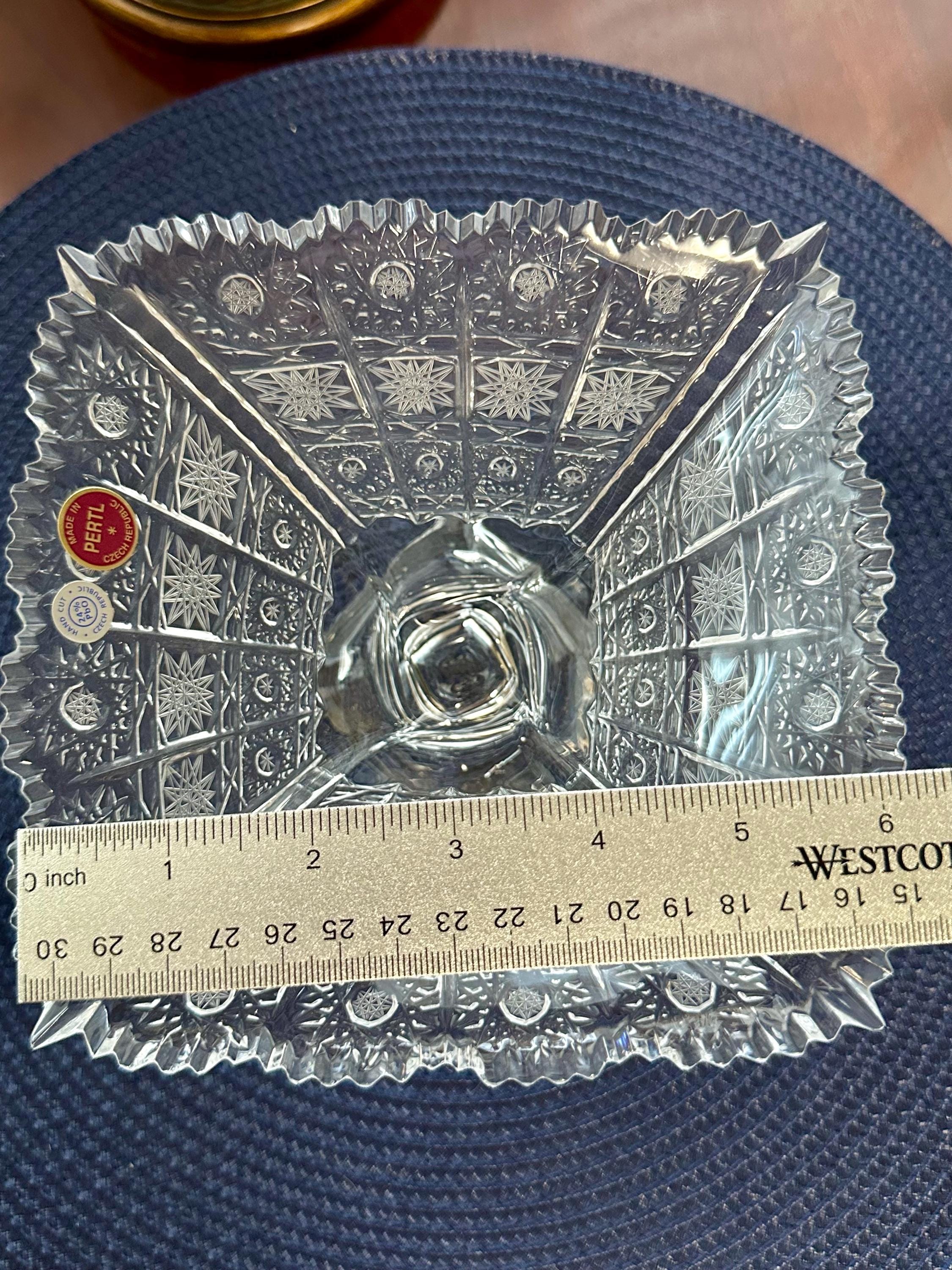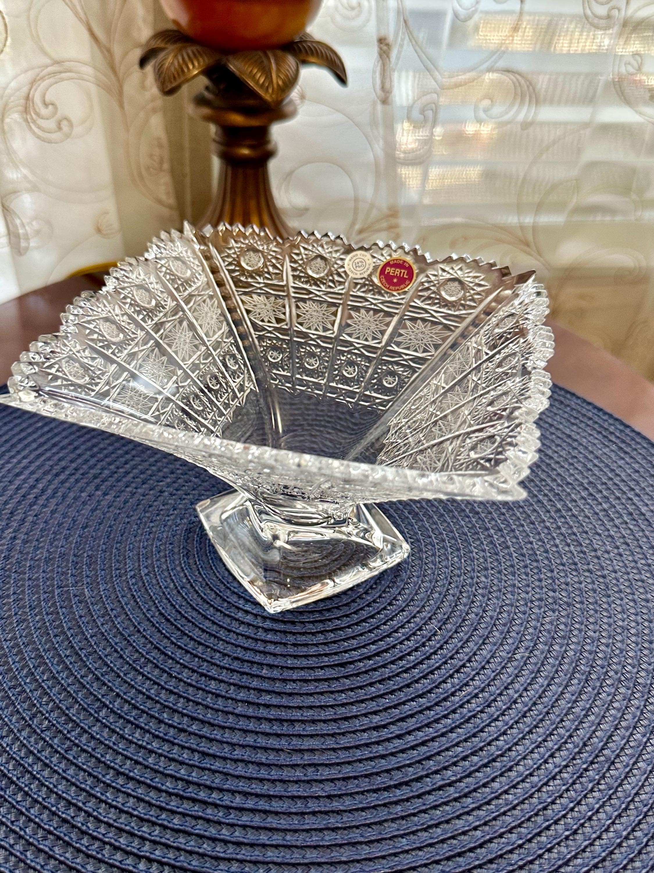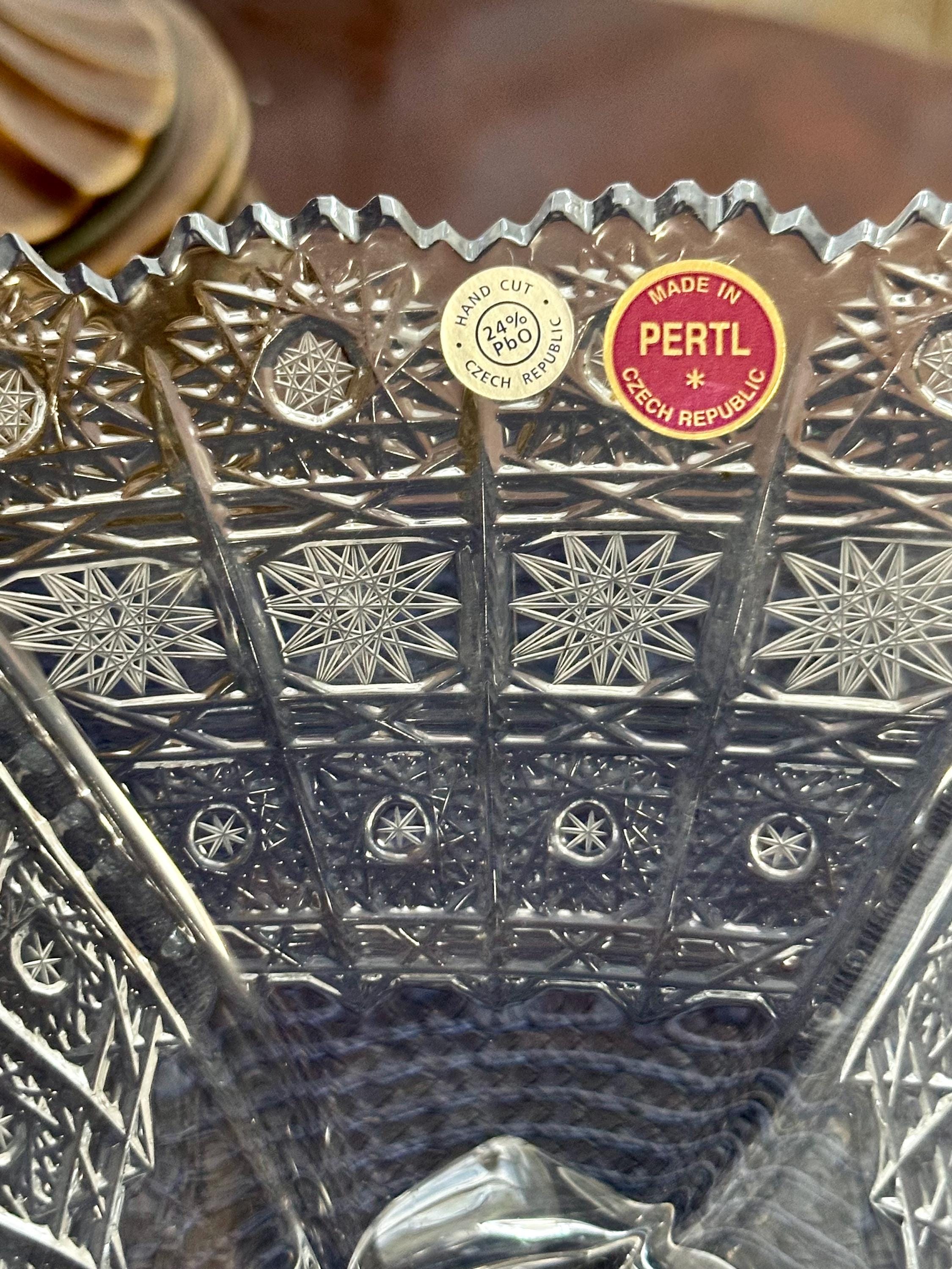 This is a rare find. This beautiful bowl is made in PERTL, CZECH REPUBLIC. This Bohemian crystal (Bohemian glass) is handmade with 24% lead, which enhances the glass's hand-cut designs. This does not come in the original box. But it will be shipped to you with care and love. There are no chips, cracks, or blemishes on this beautiful bowl. The color may be different due to the camera or lighting. If you have any questions or would like additional pictures, please contact us. Though we try to reduce and reuse, the cost of additional shipping materials are included in the price.