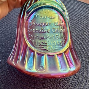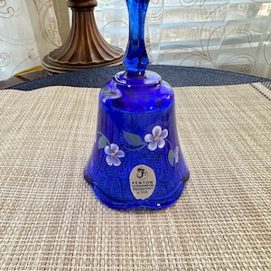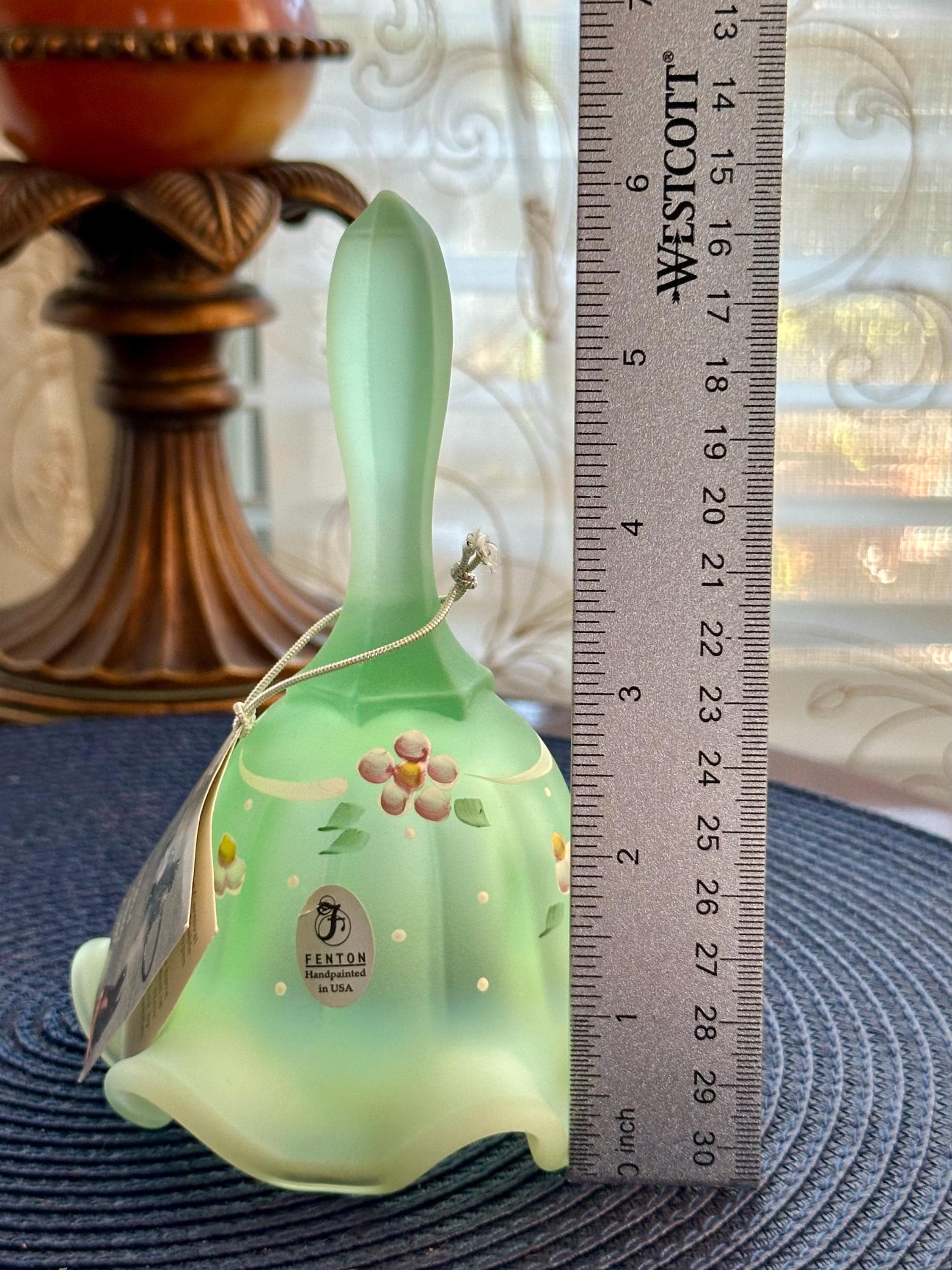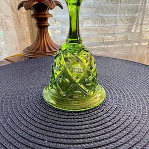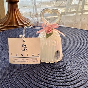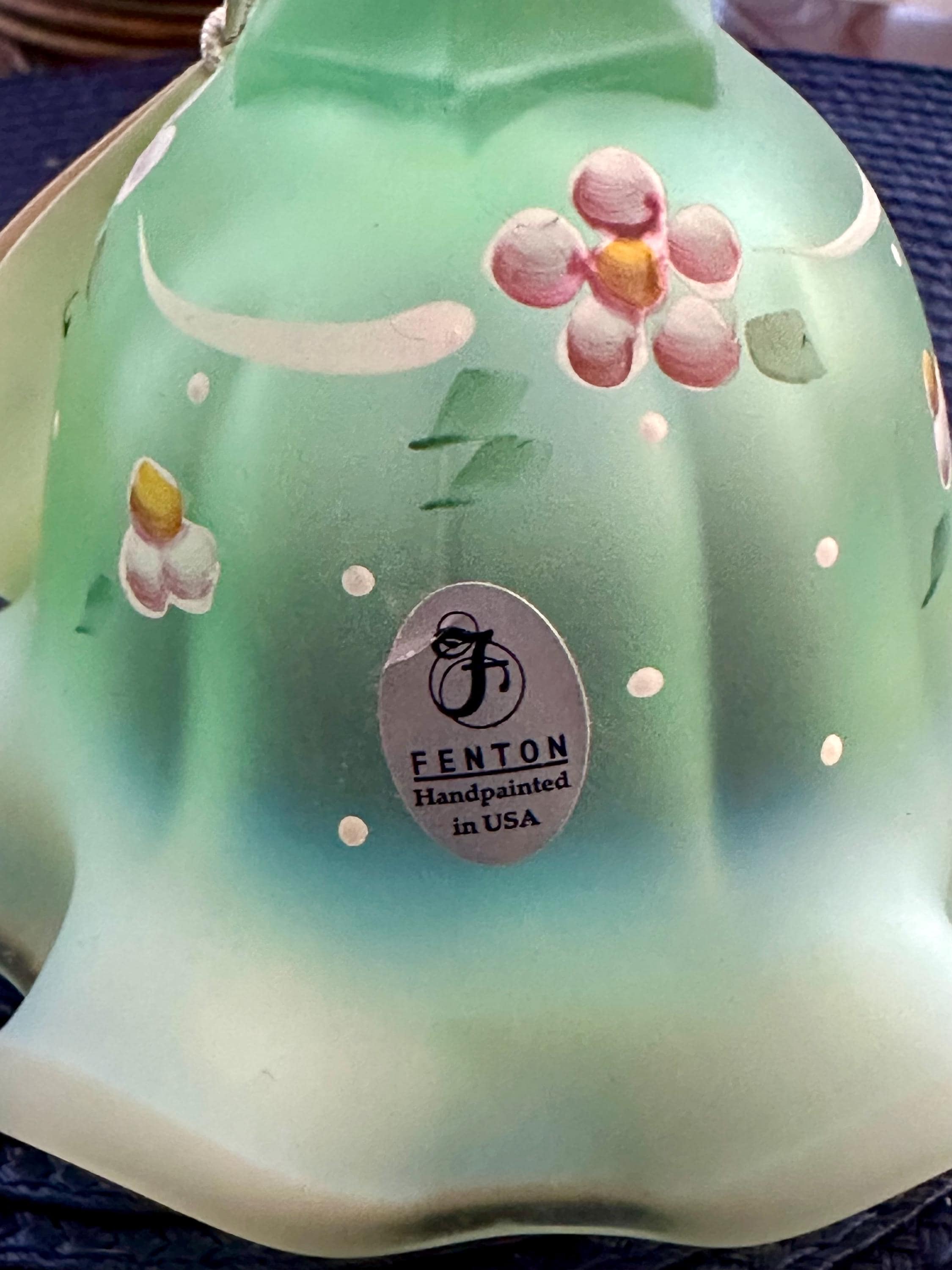 This is a Fenton, made in the USA bell. This bell is named "Dotted Swiss WIllow Green Opalescent Satin Glass Bell". This is a beautiful sea green bell with flowers and dots on it. This be has the original tag and sticker on it. We do not have the box but we will send it to your home with love and care.