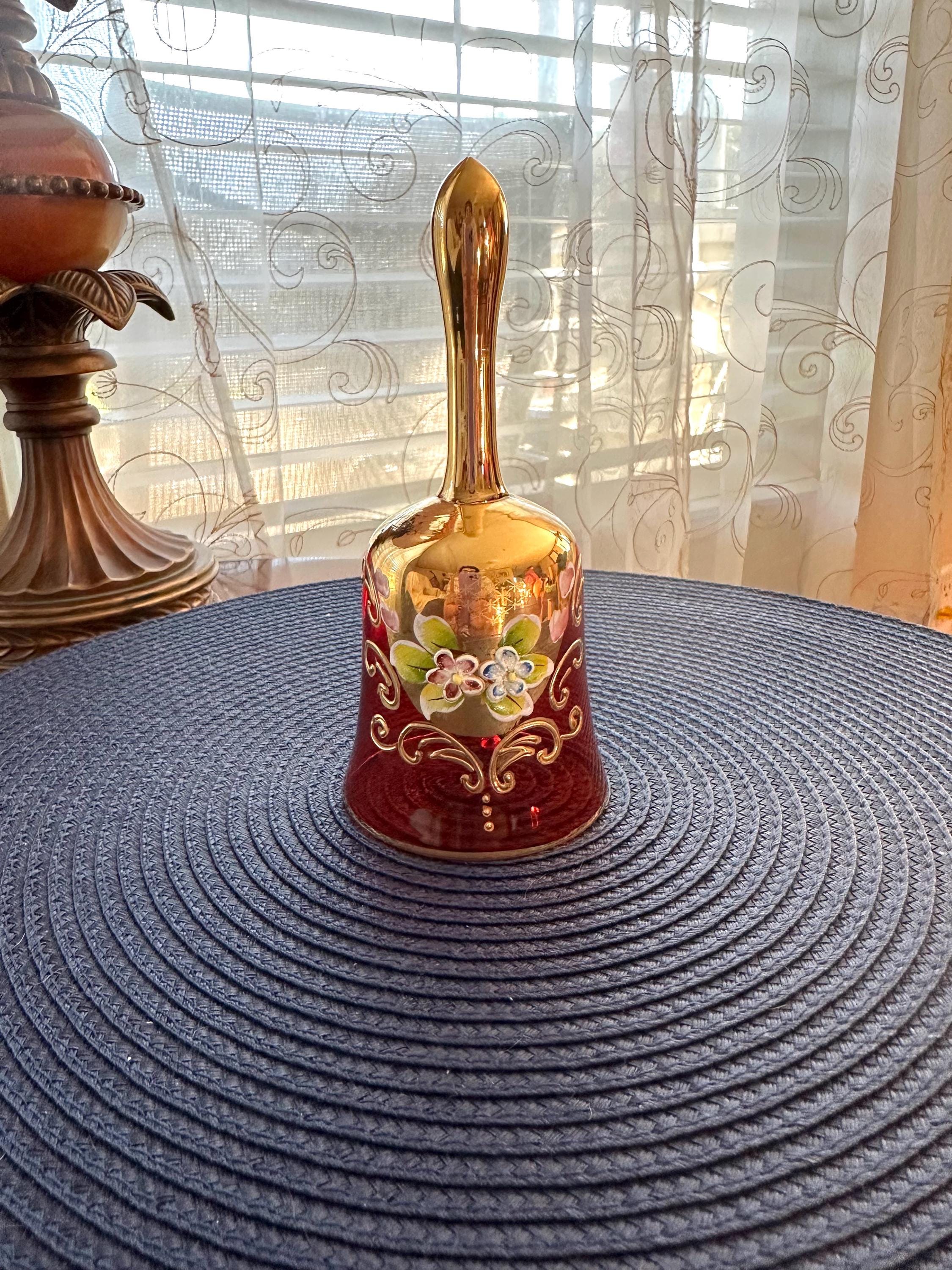 This is a unique and gorgeous bell to add to your collection. This bell is a cranberry red with gold and hand-painted flowers. This bell is 6 inches tall and is an older item; with age, there are some areas that show its age. There is a dimple in the paint and a few areas where the gold is faded. Pictures are included, and if you have any questions or would like additional pictures, please contact us.