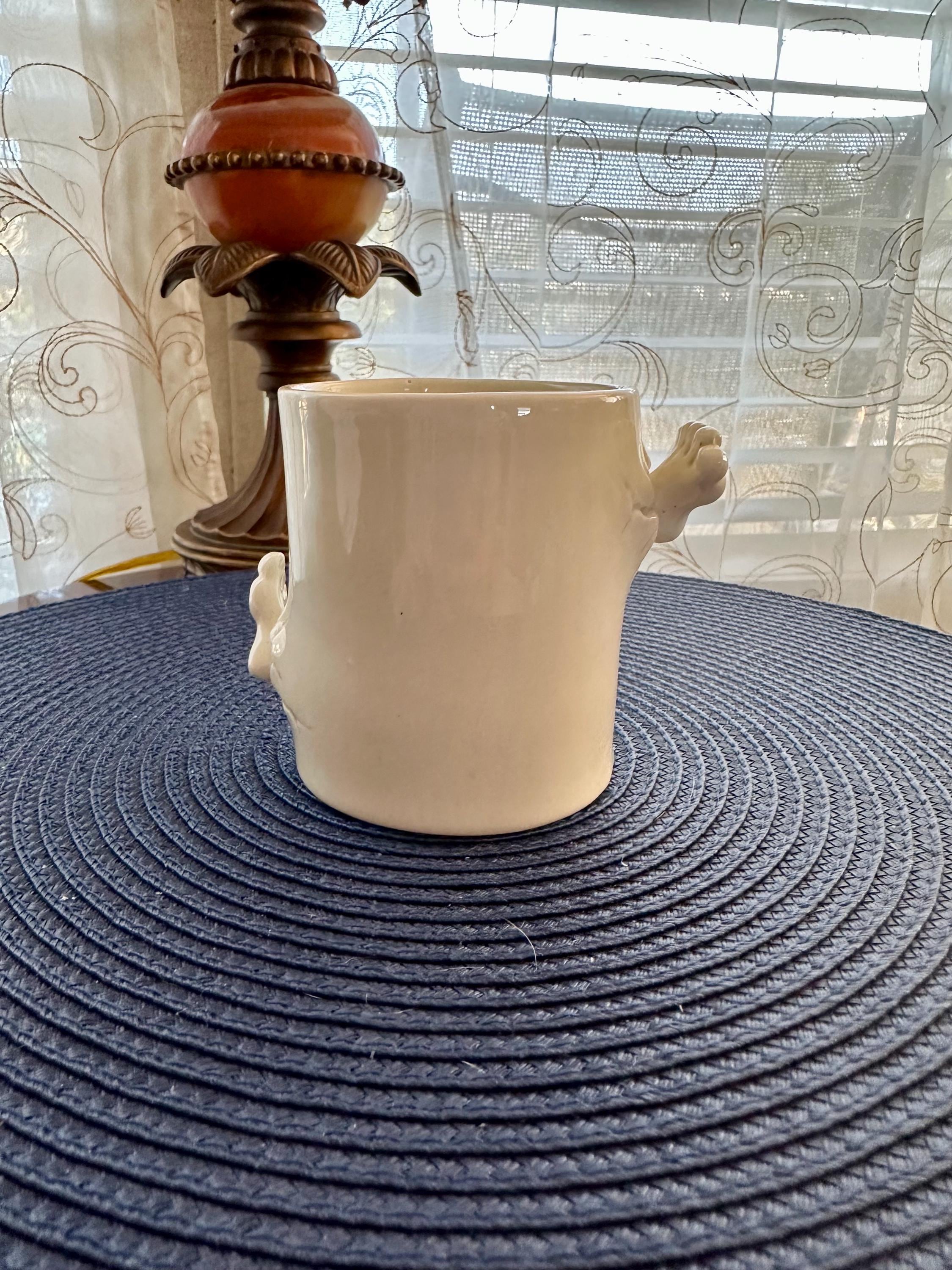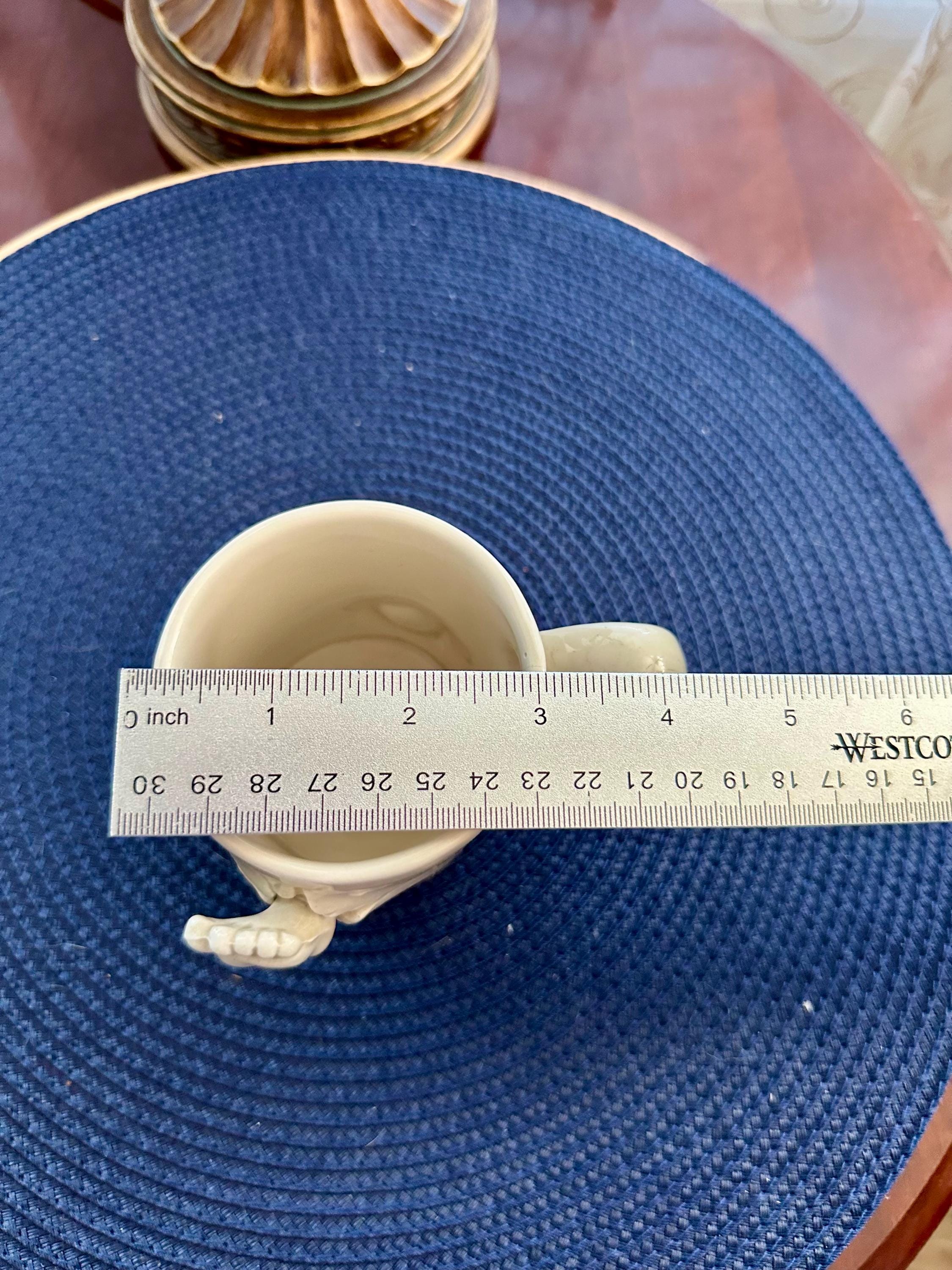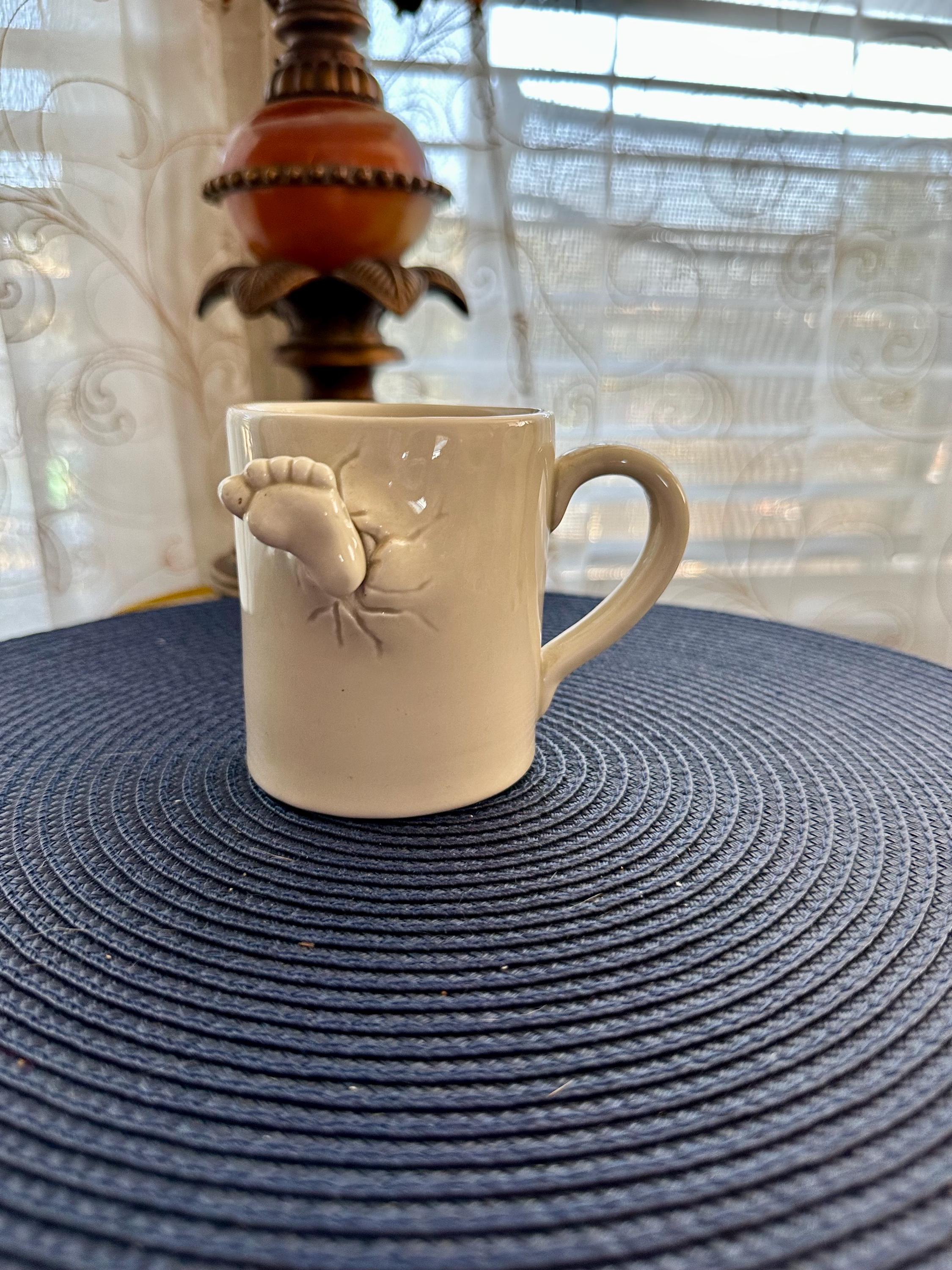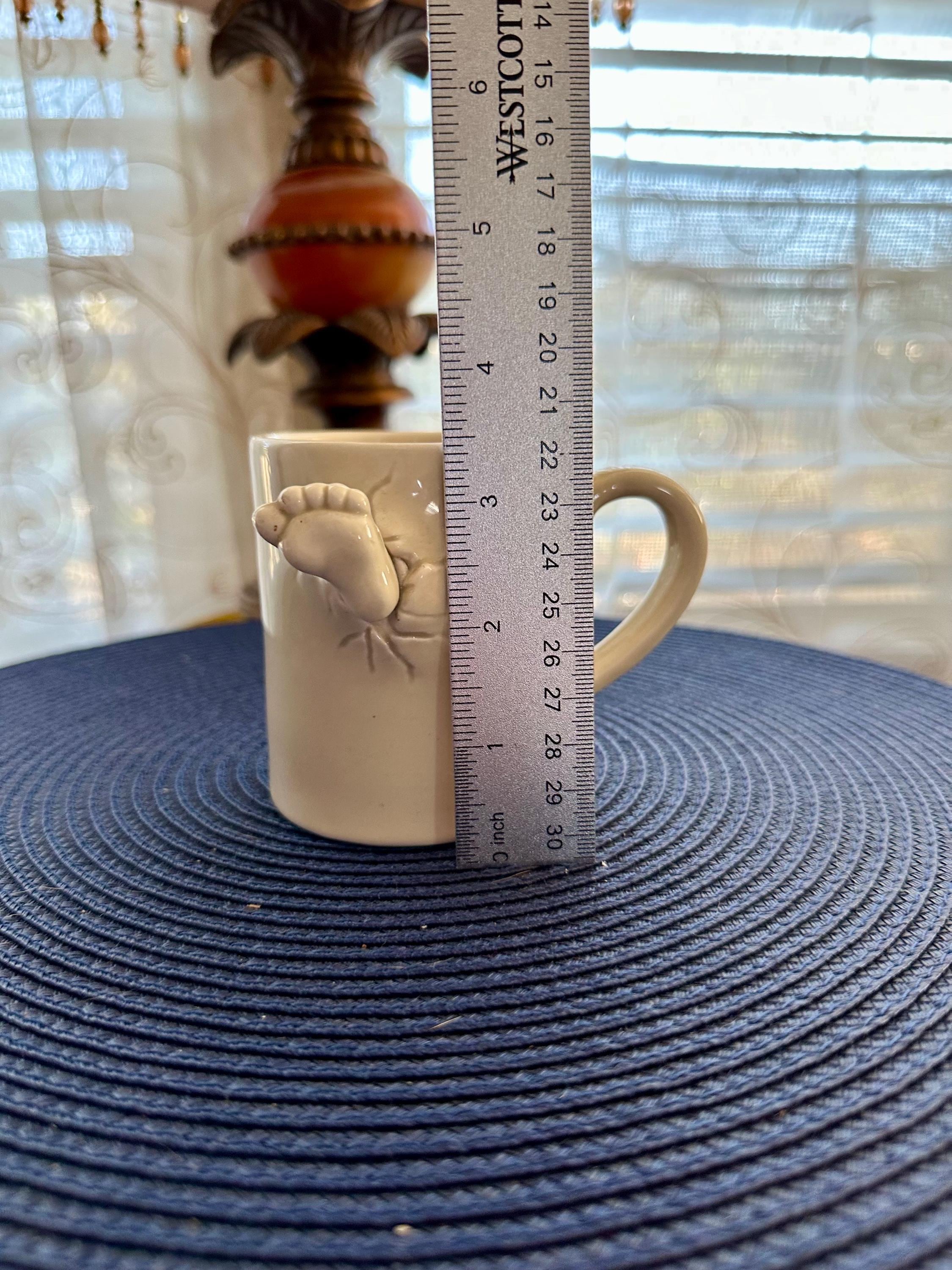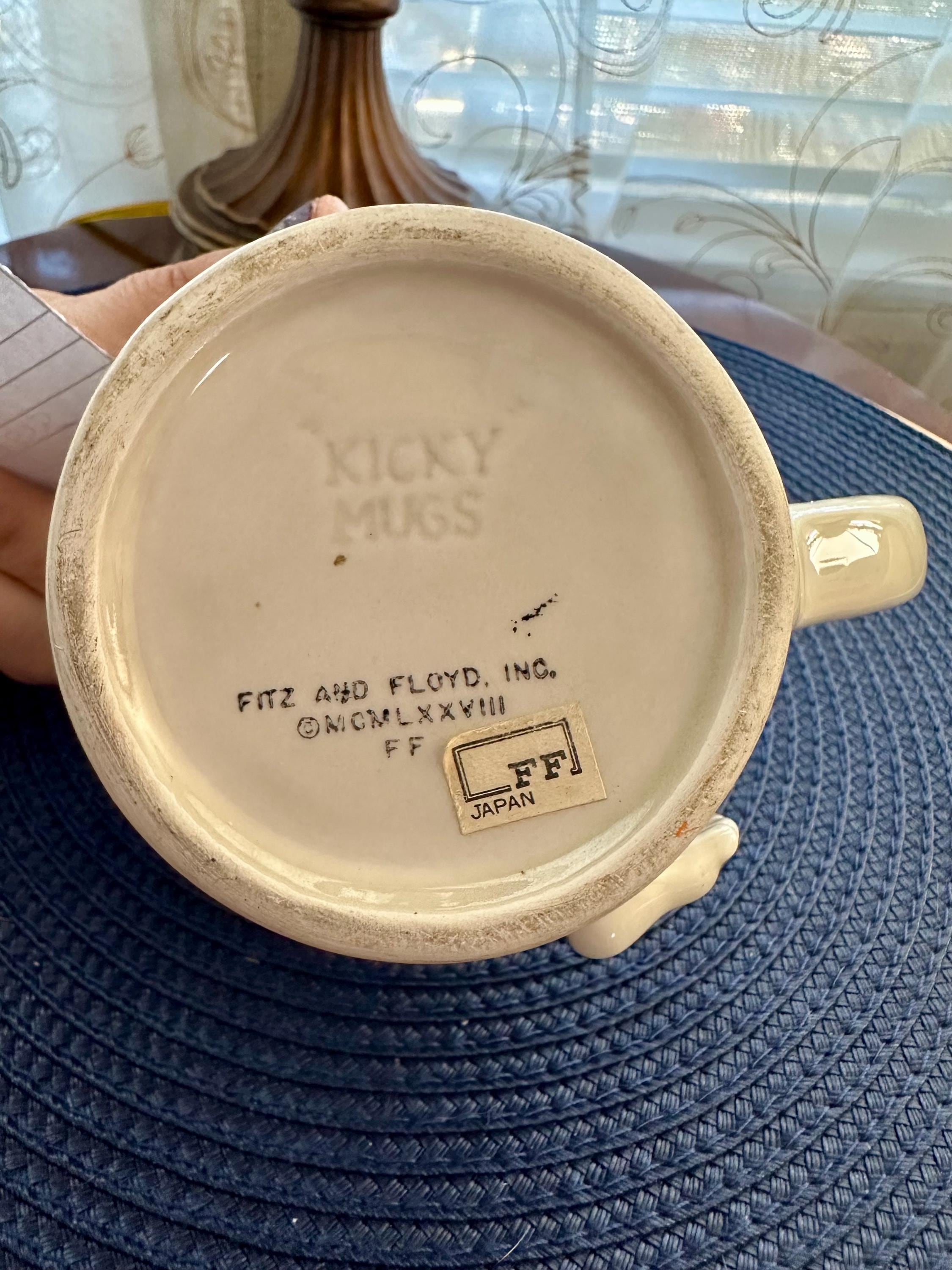Lets talk about a conversational piece. This is a 1978 Fitz & Floyd "Kicky Mug". This is made in Japan and you can see it was made in 1978 by reading the Roman numerals (MCMLXXVII) on the bottom. This is a retired mug and though there are more out there, this is your opportunity to have your own. This mug is a standard mug size of 3.5 inches tall and approximately 4.5 inches wide (including the handle). I was unable to find out if this is dishwasher or microwave safe. I do not recommend putting this in the dishwasher or the microwave. There is no cracks, crazing or chips. There are 5 toes on each foot.