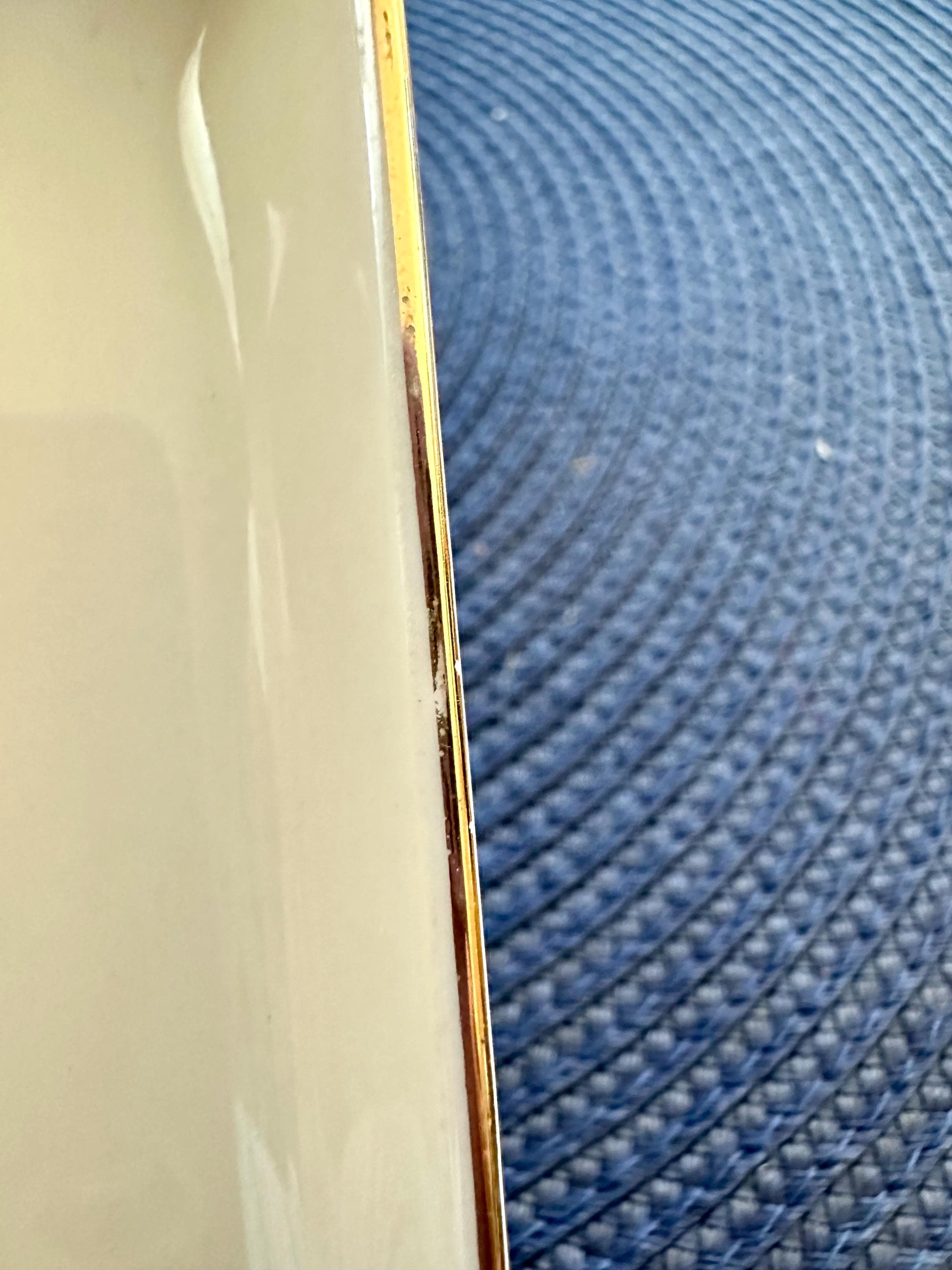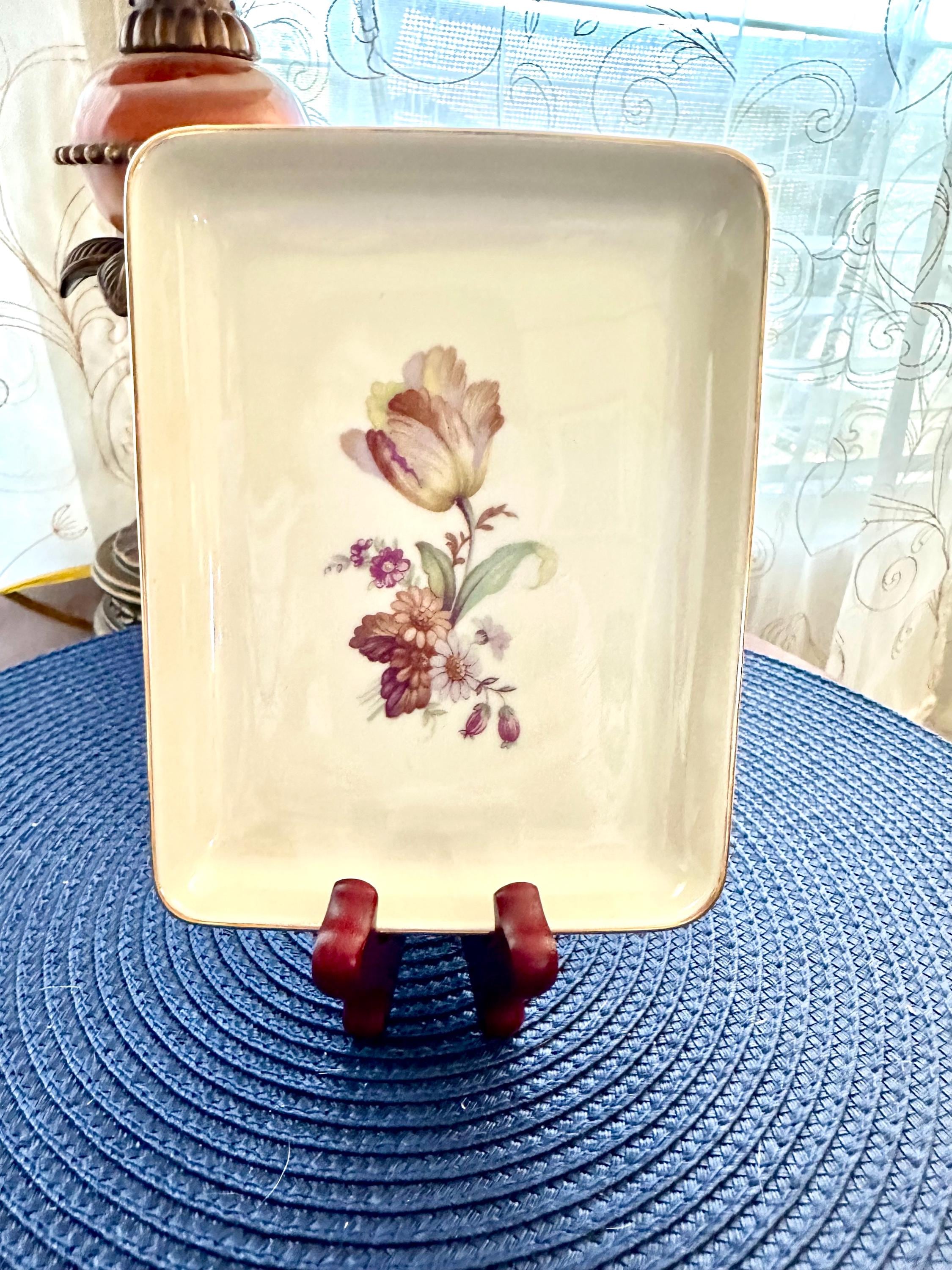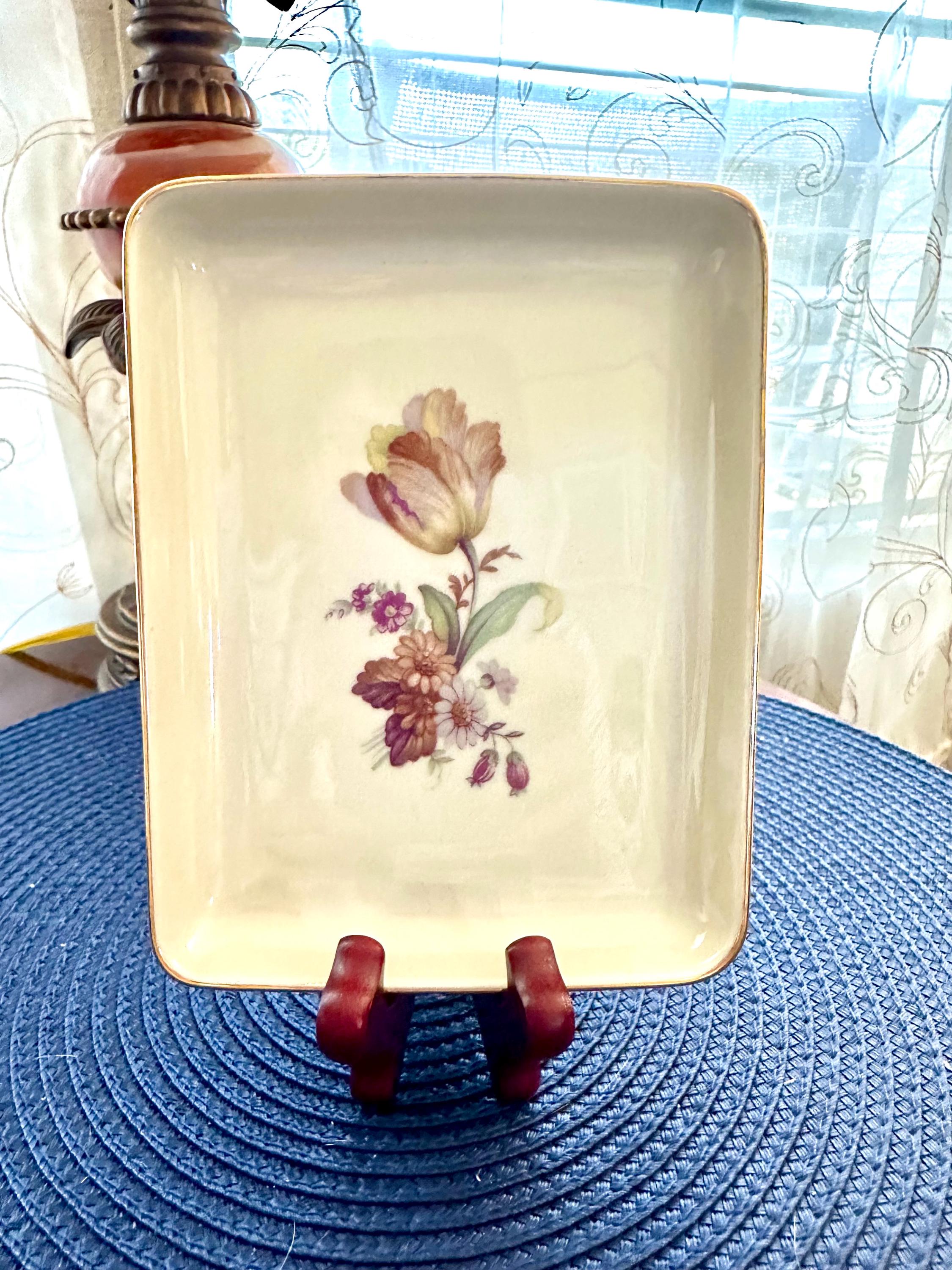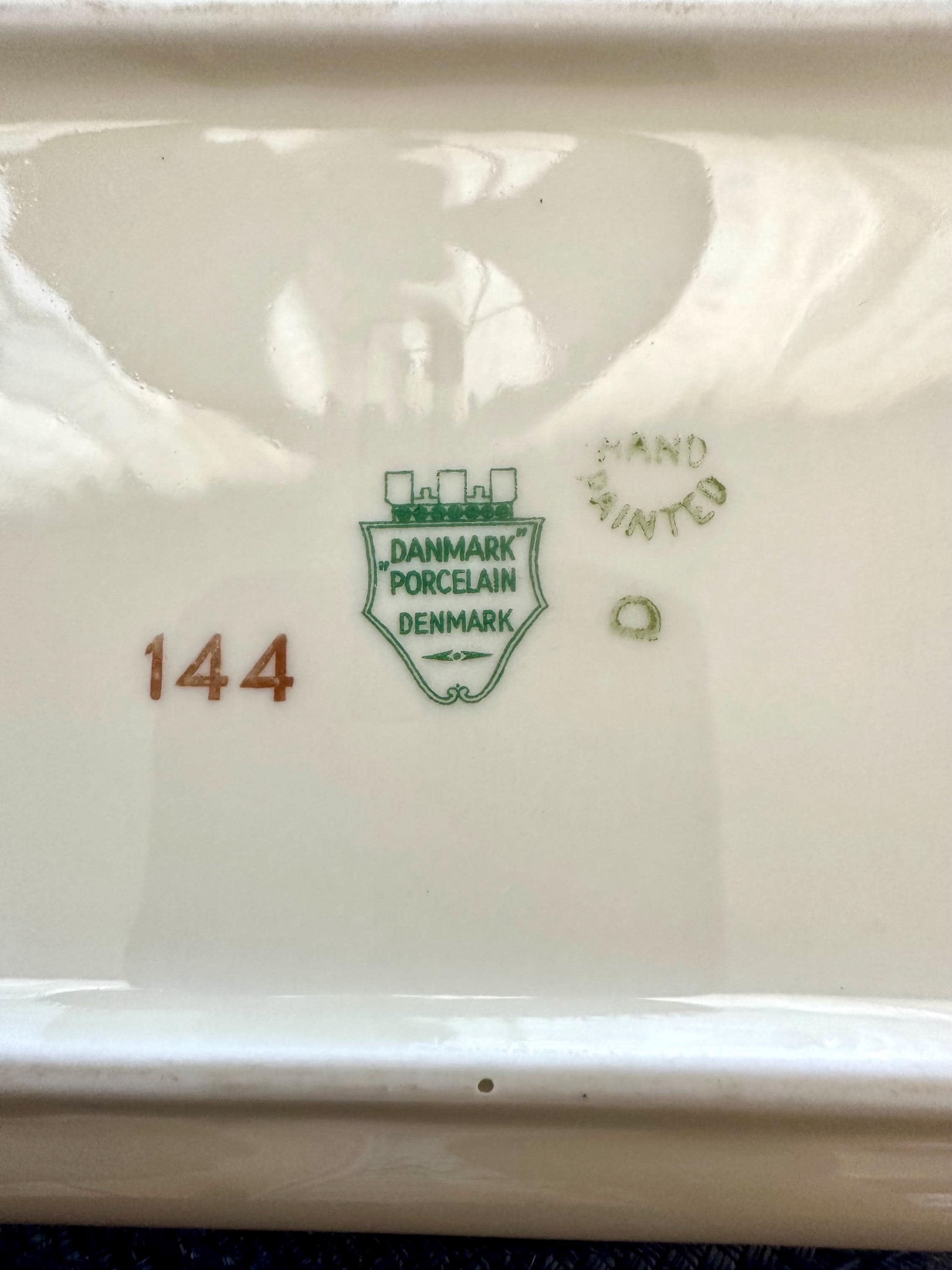 This is a vintage trinket dish with a flower on it with gold trim. This plate is 4.5 inches by 6 inches. There is a slight amount of gold trim that is missing (picture is included). The back of this plate is marked "144", "Denmark Porcelain Denmark" and "Hand Painted". There is no cracks or crazing on this plate. The plate stand is not included.