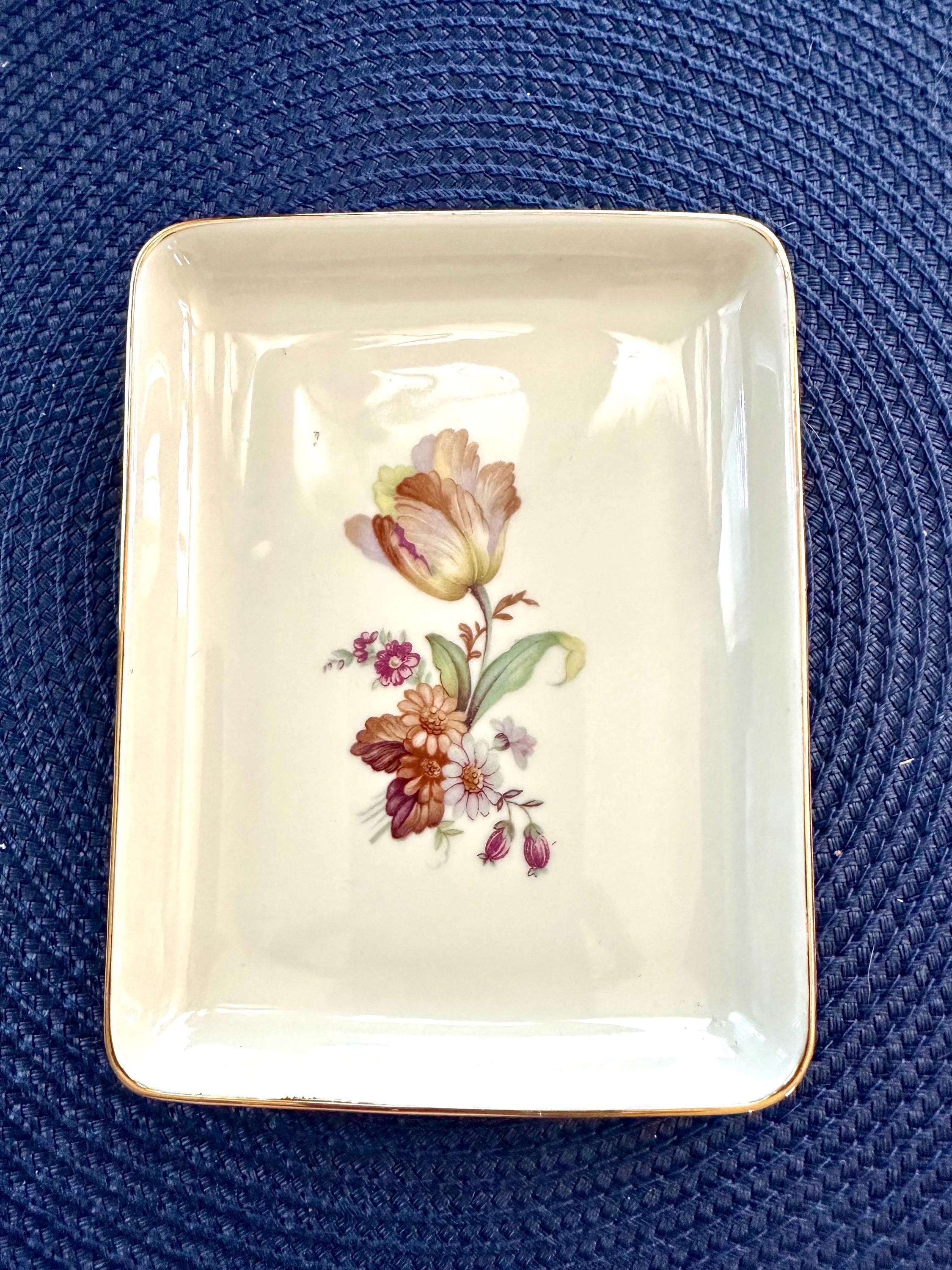 This is a vintage trinket dish with a flower on it with gold trim. This plate is 4.5 inches by 6 inches. The back of this plate is marked "144", "Denmark Porcelain Denmark", and "Hand Painted". There are no cracks or crazing on this plate.
