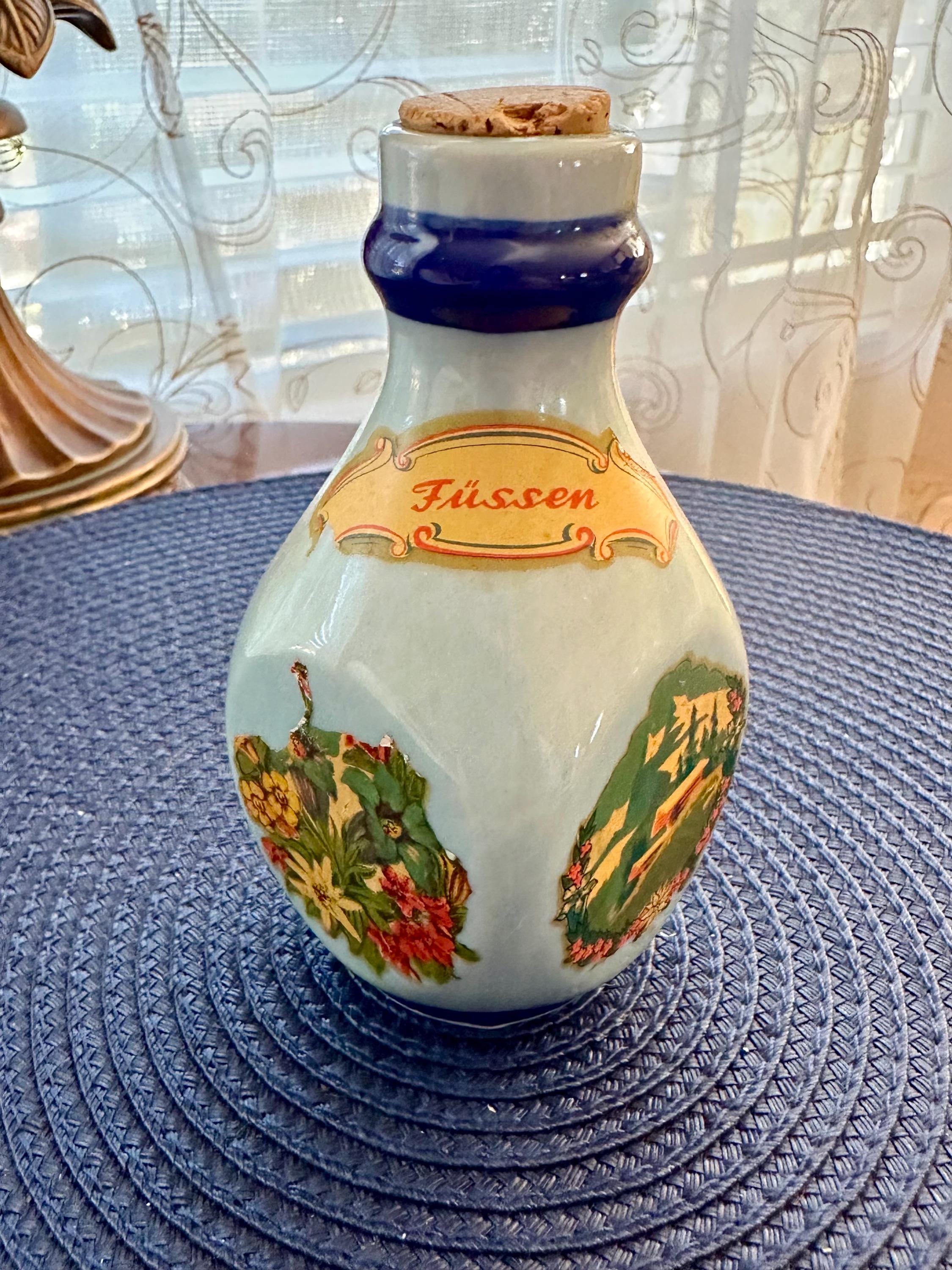 This is a German mini decanter. This vintage piece is most likely from the 1960s. The designs are coming off the bottles due to age. The bottom of the bottle is stamped "775 0.100L" and " Altenkunstadt Bavaria". This bottle is under 5 inches tall. The cork stopper is in the bottle and is not removable. This is a fun piece to add to your collection and is rare to find. If you have any questions or would like additional pictures, please contact us.
