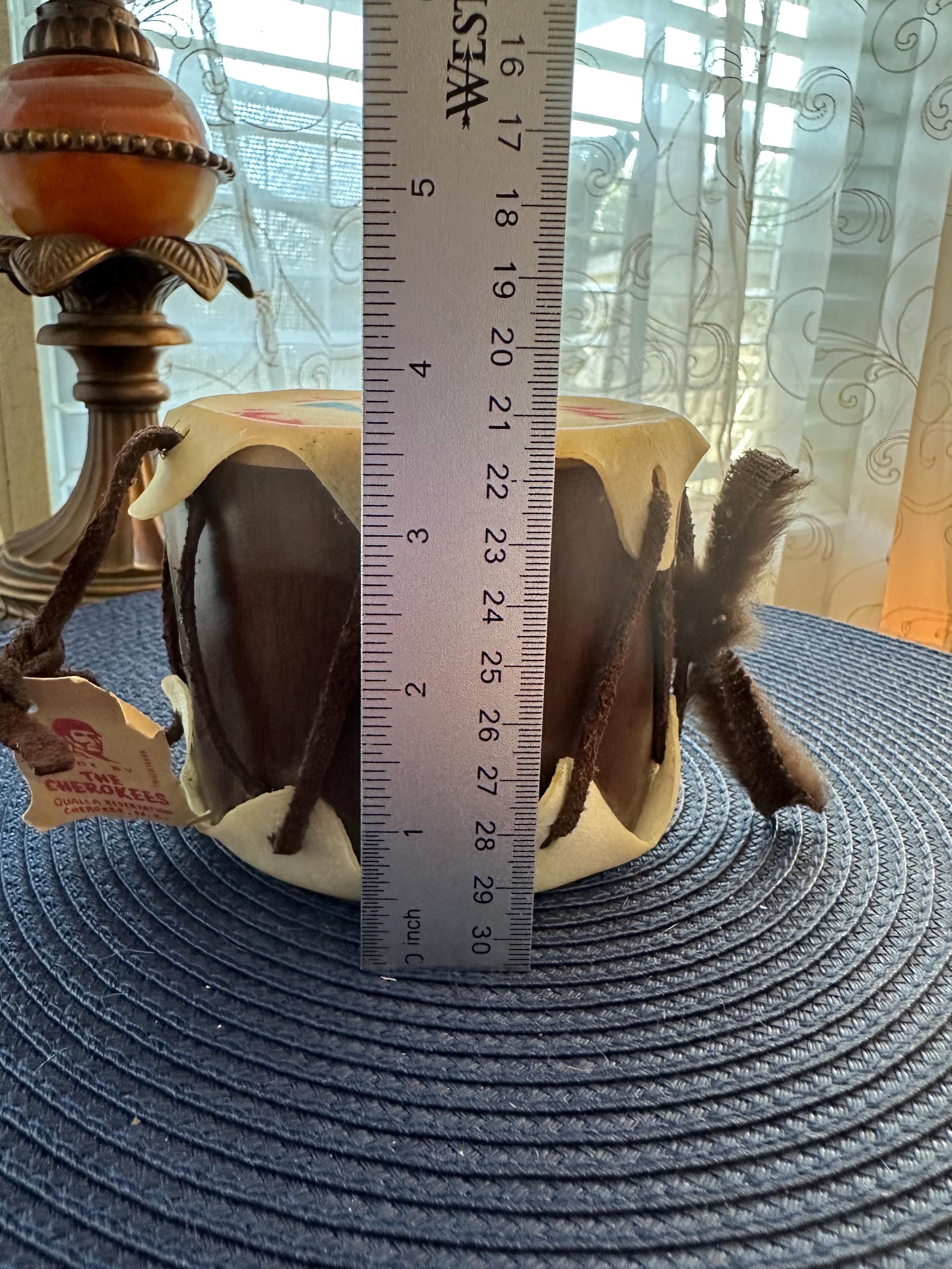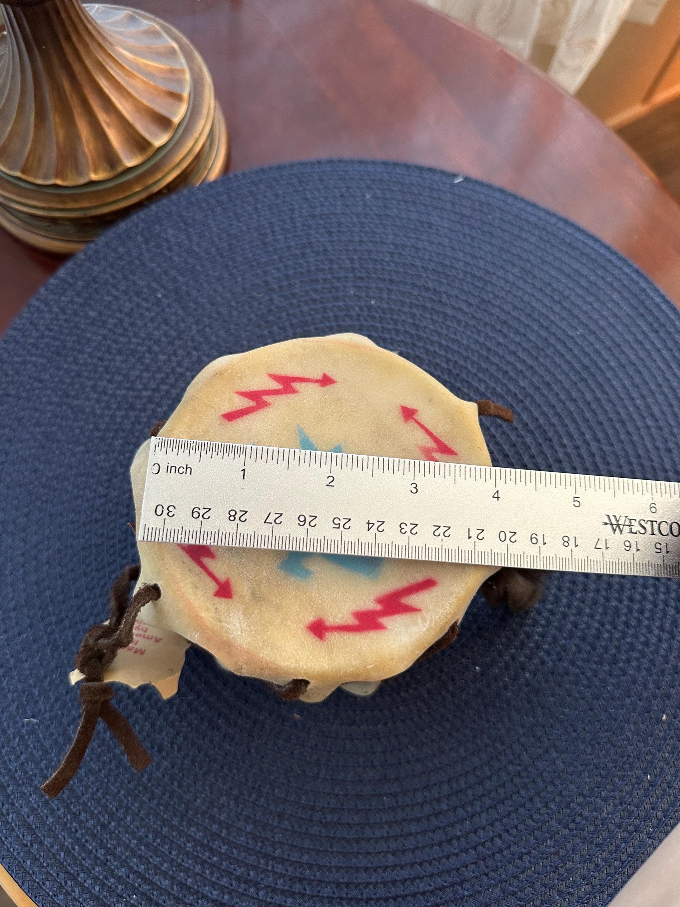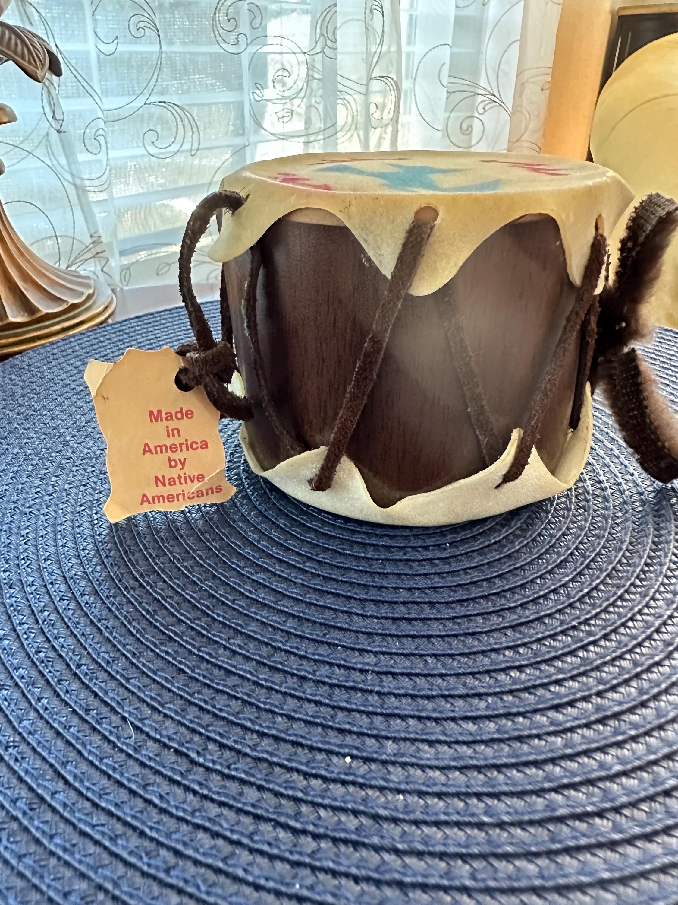This is an authentic Native American Indian toy drum. This is in great condition. There is a portion of the drum wrapping that is not glued down completely. This is an easy fix if you would like to. I did not repair it because I did not want to use something that was not "authentic" for fear of changing the authenticity of this item. This drum is 4 inches wide and 3.5 inches tall. The color may be different due to the lighting or the camera. If you would like additional pictures or if you have any questions, please contact us. Though we try to reduce and reuse items to keep our planet healthy, the cost of additional shipping materials are included in the price.