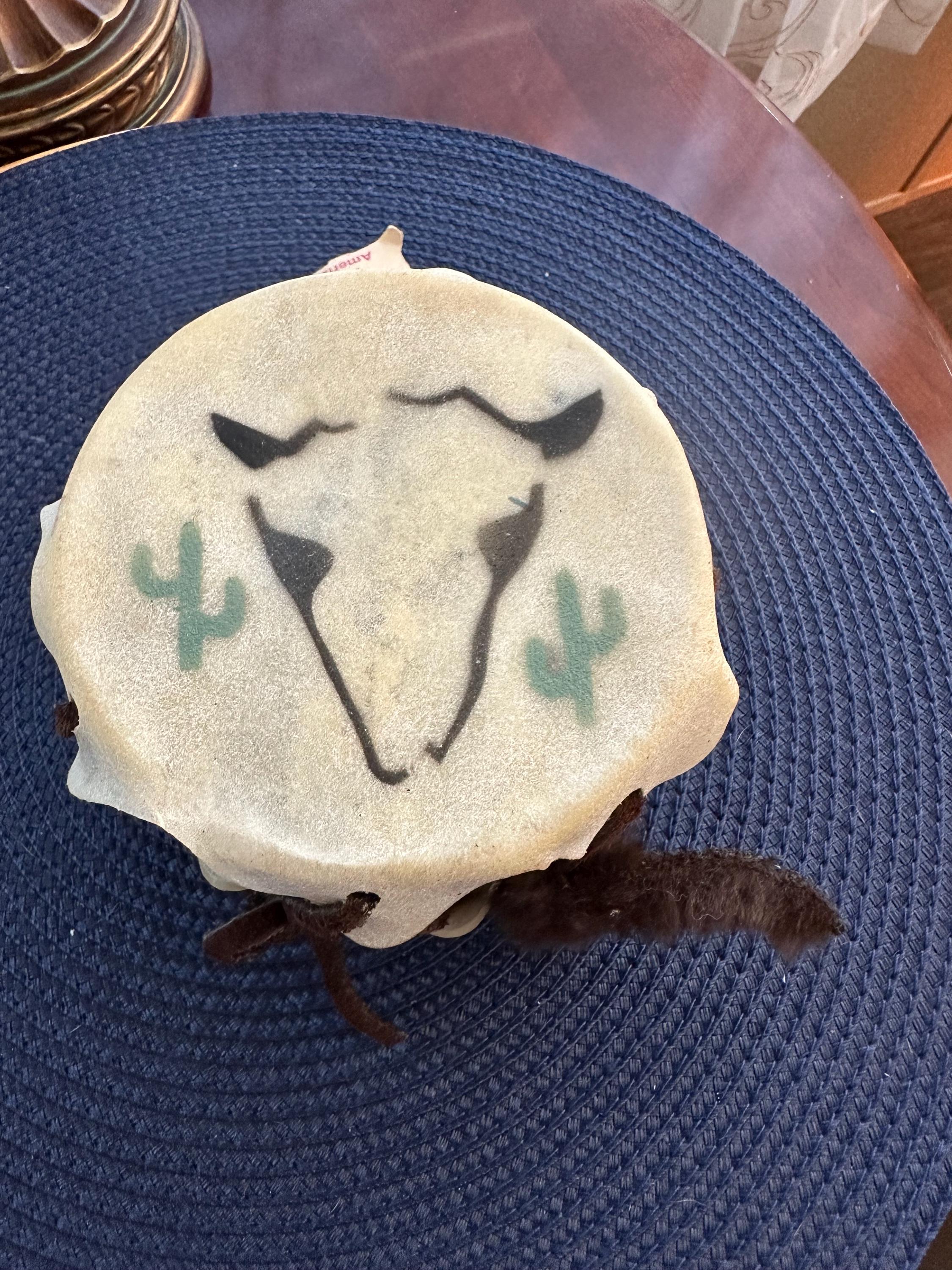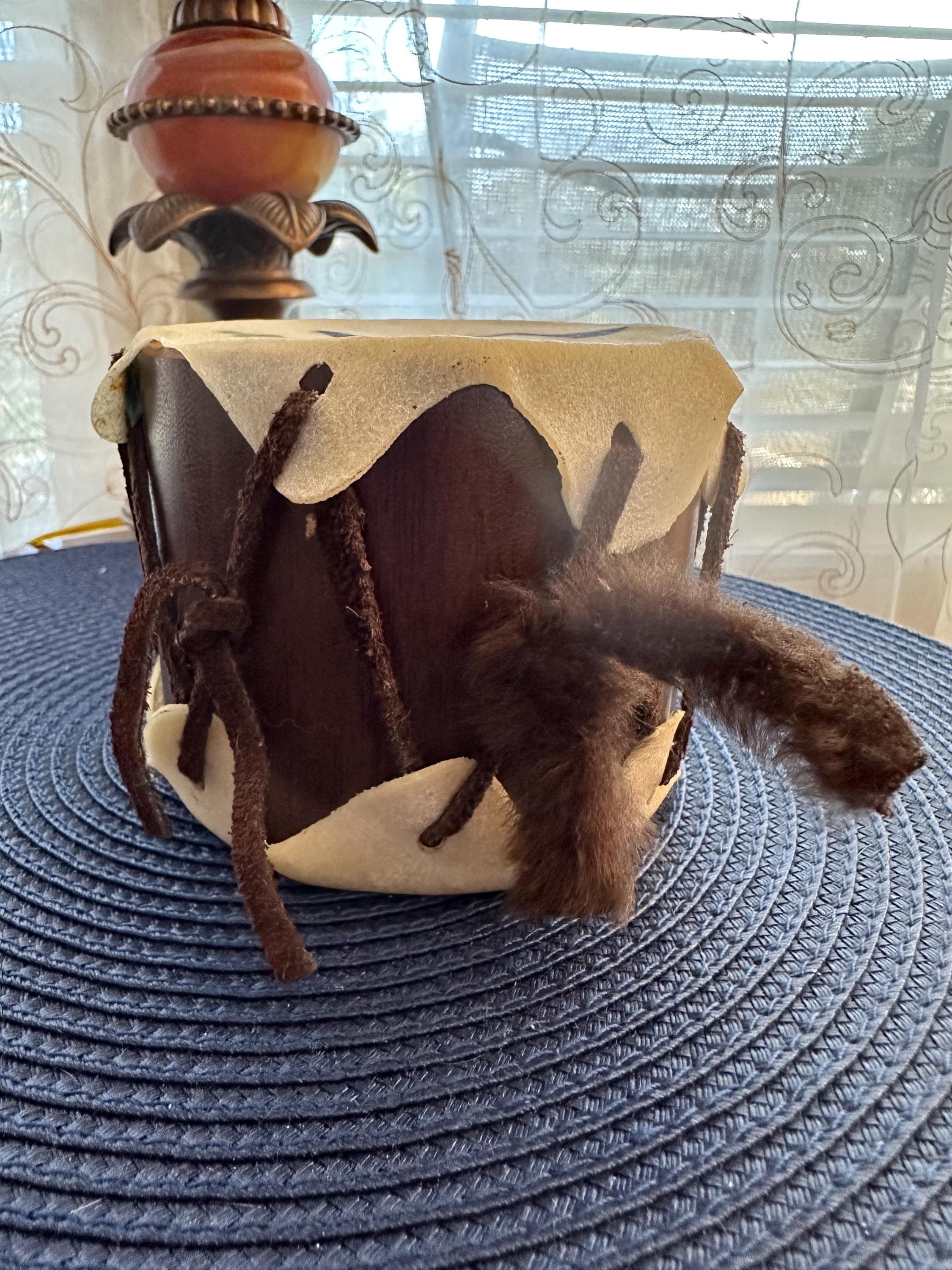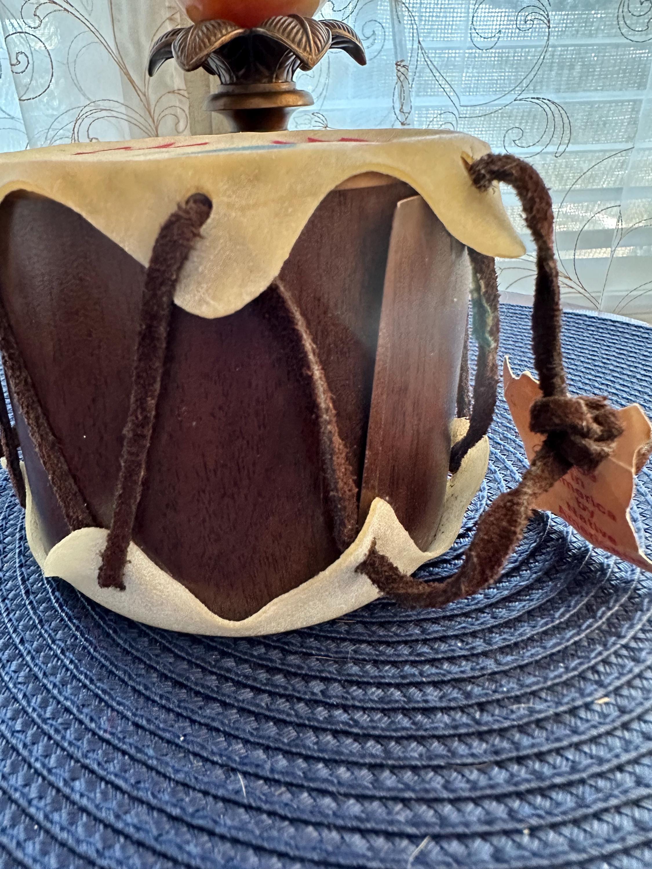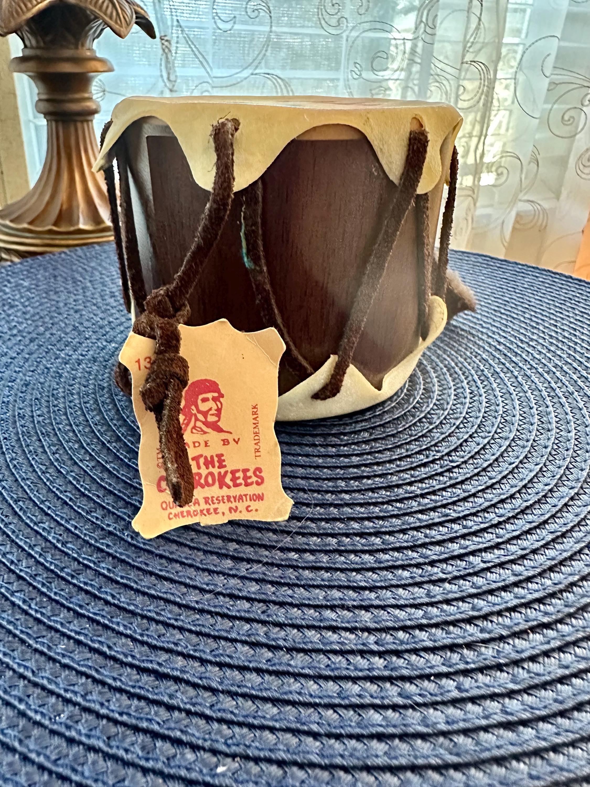 This is an authentic Native American Indian toy drum. This is in great condition. There is a portion of the drum wrapping that is not glued down completely. This is an easy fix if you would like to. I did not repair it because I did not want to use something that was not "authentic" for fear of changing the authenticity of this item. This drum is 4 inches wide and 3.5 inches tall. The color may be different due to the lighting or the camera. If you would like additional pictures or if you have any questions, please contact us. Though we try to reduce and reuse items to keep our planet healthy, the cost of additional shipping materials are included in the price.