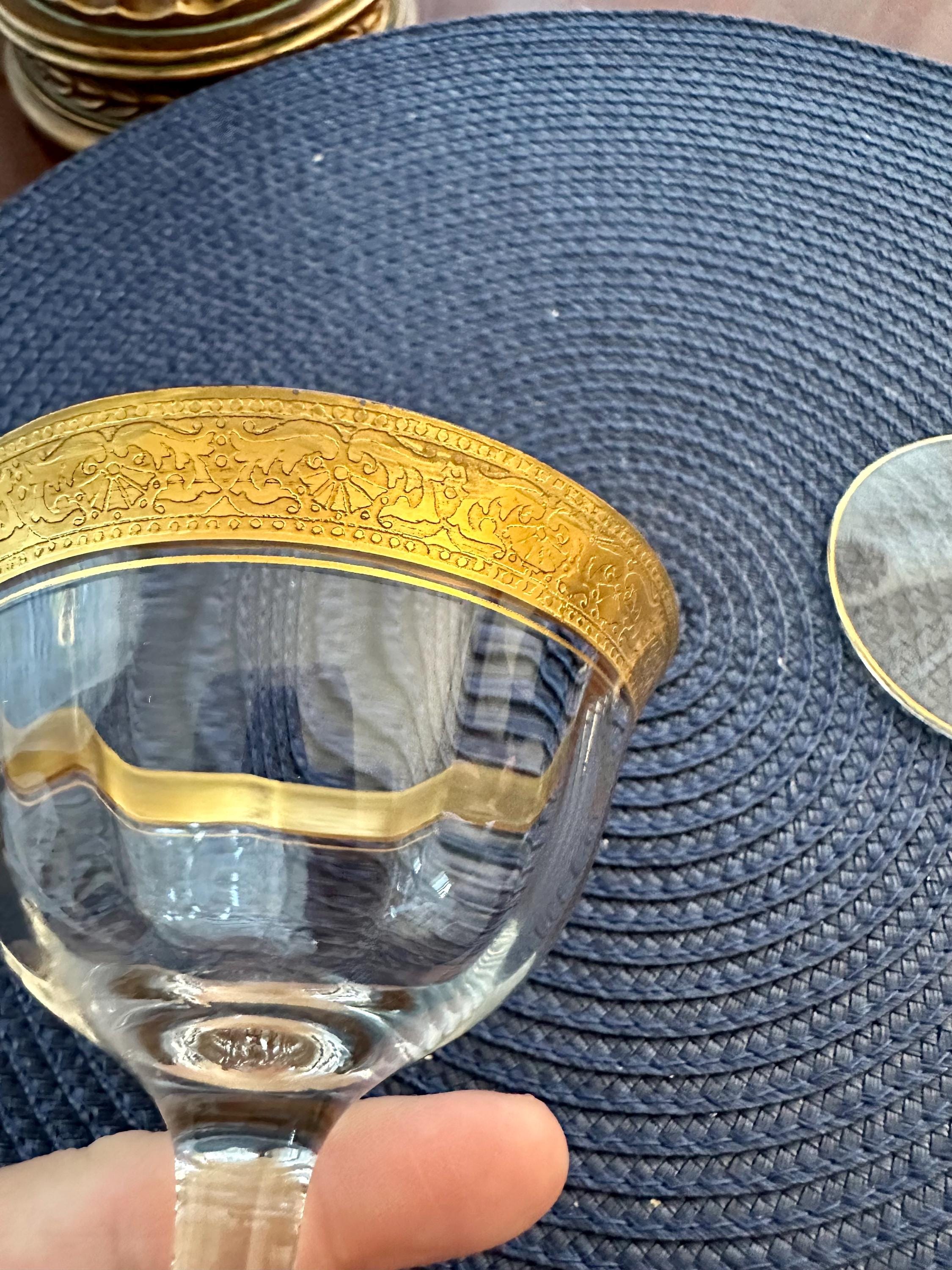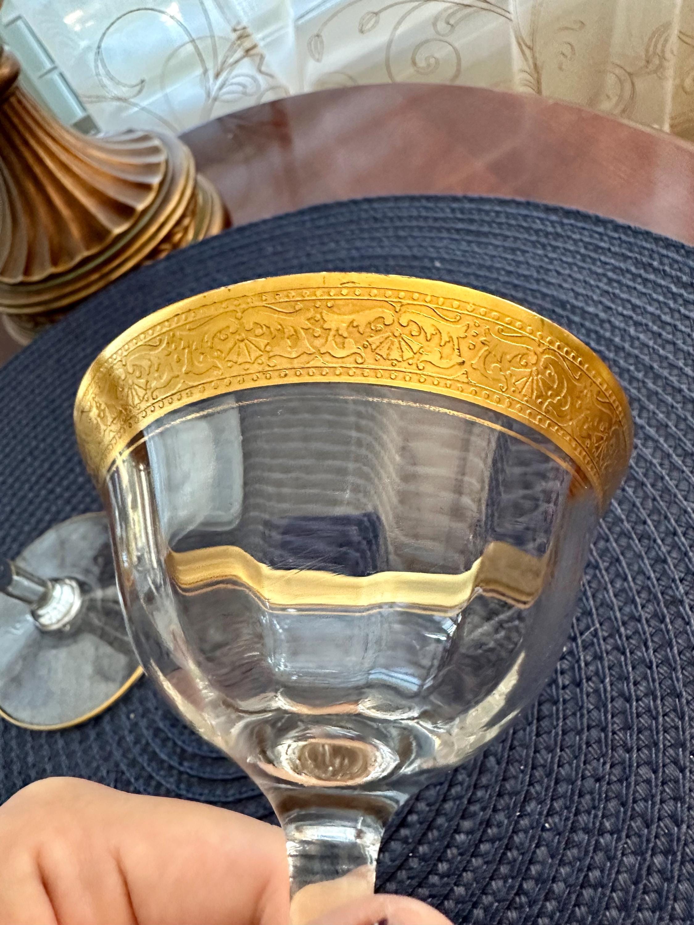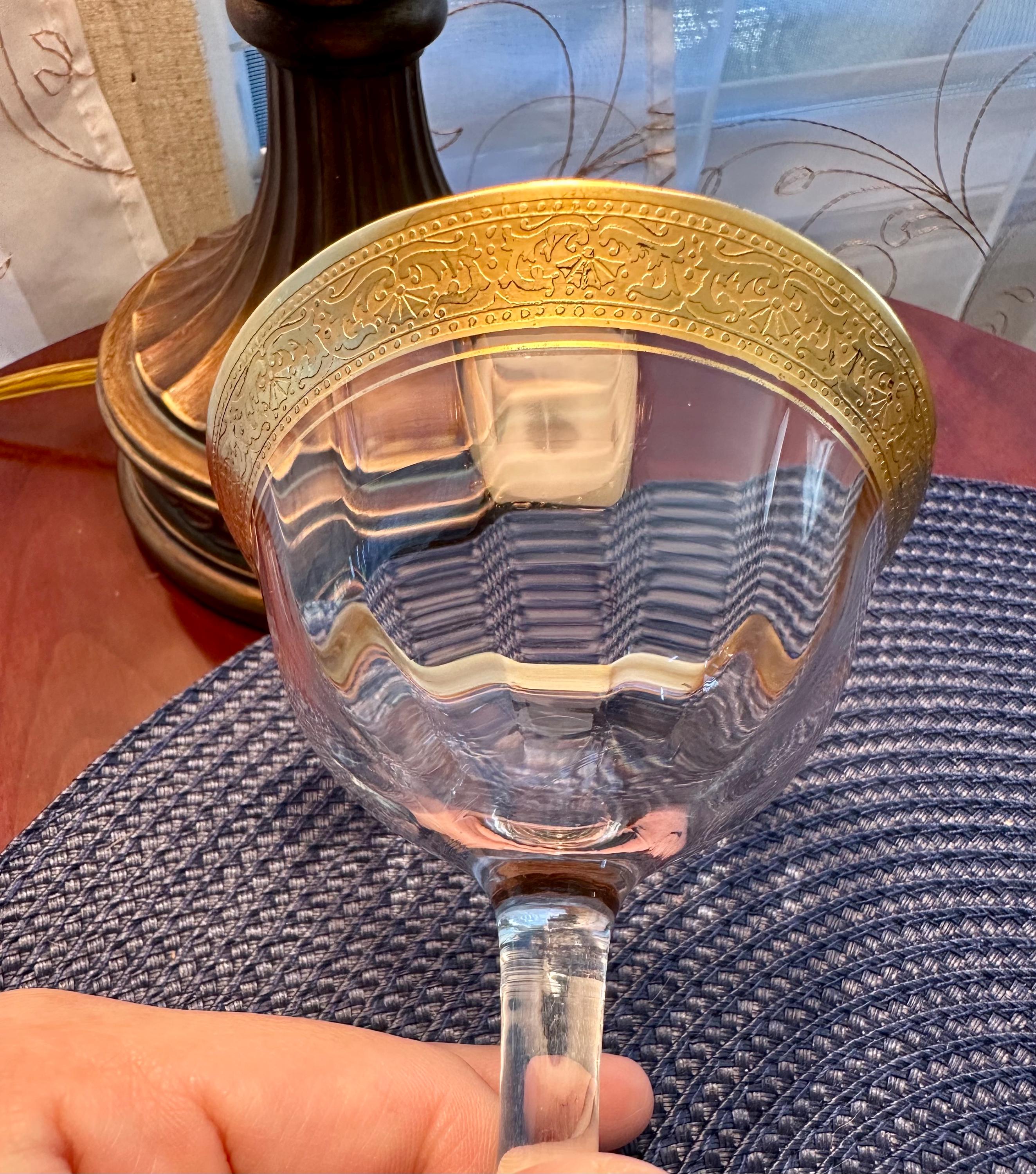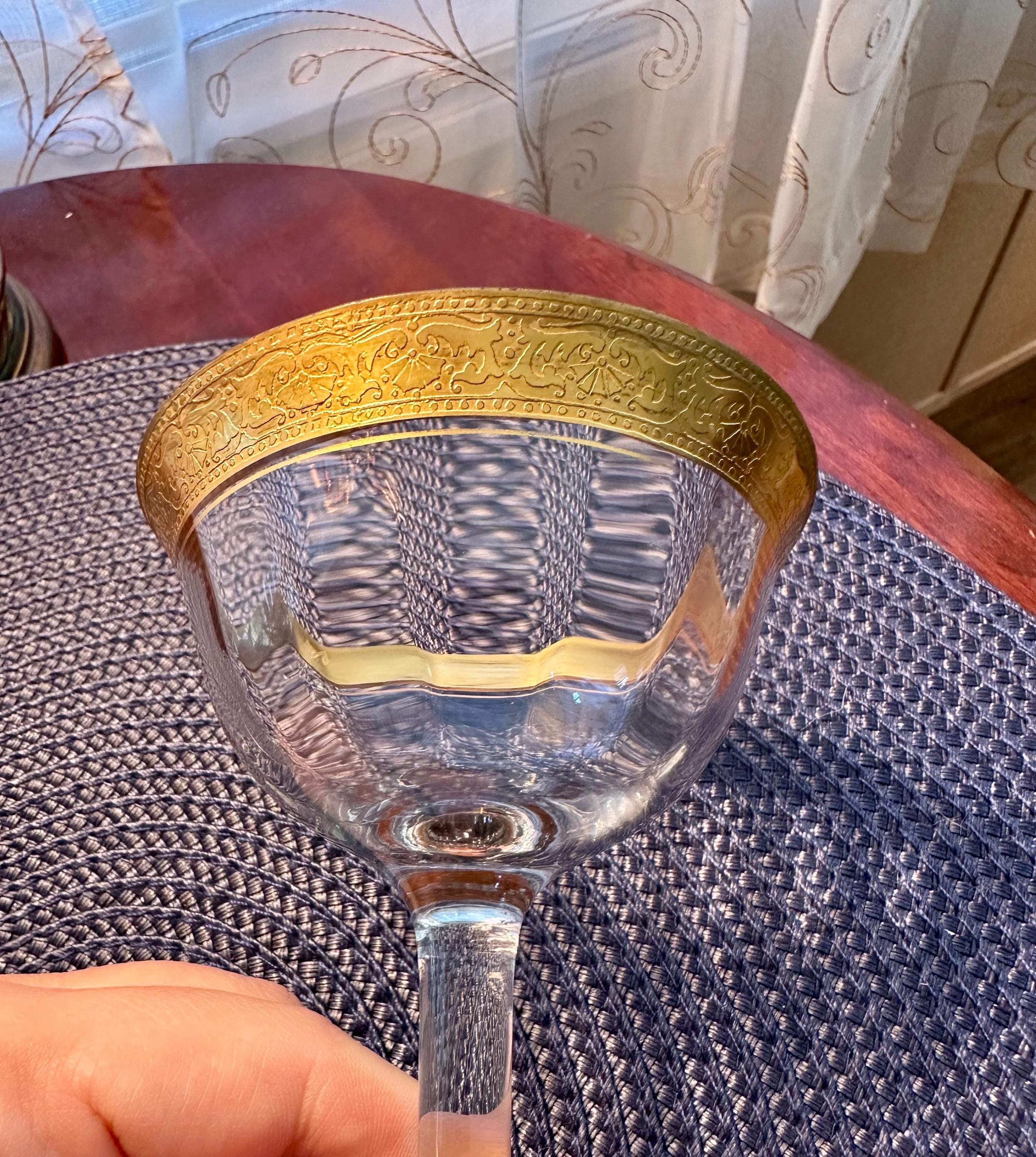 This is a rare find. This is a pair of Vintage Tiffin-Franciscan "Minton" pattern glasses for either champagne or sherbet. These glass have the signature gold trim along with an intricate pattern. These glasses will be sold as a pair and will not be separated. There is a few minor spots where the gold is missing, the pictures are included. There are no cracks or chips in the glass.
