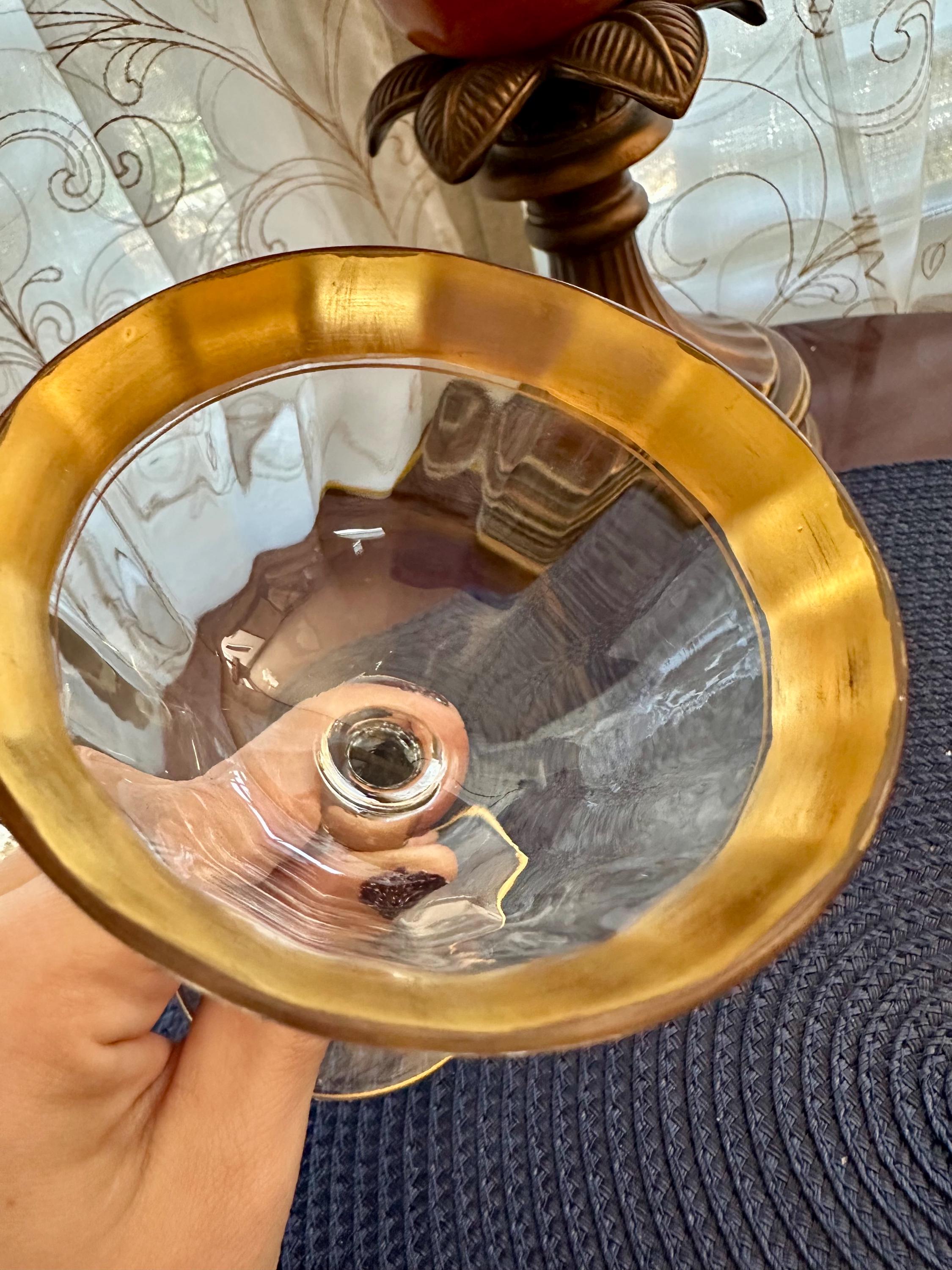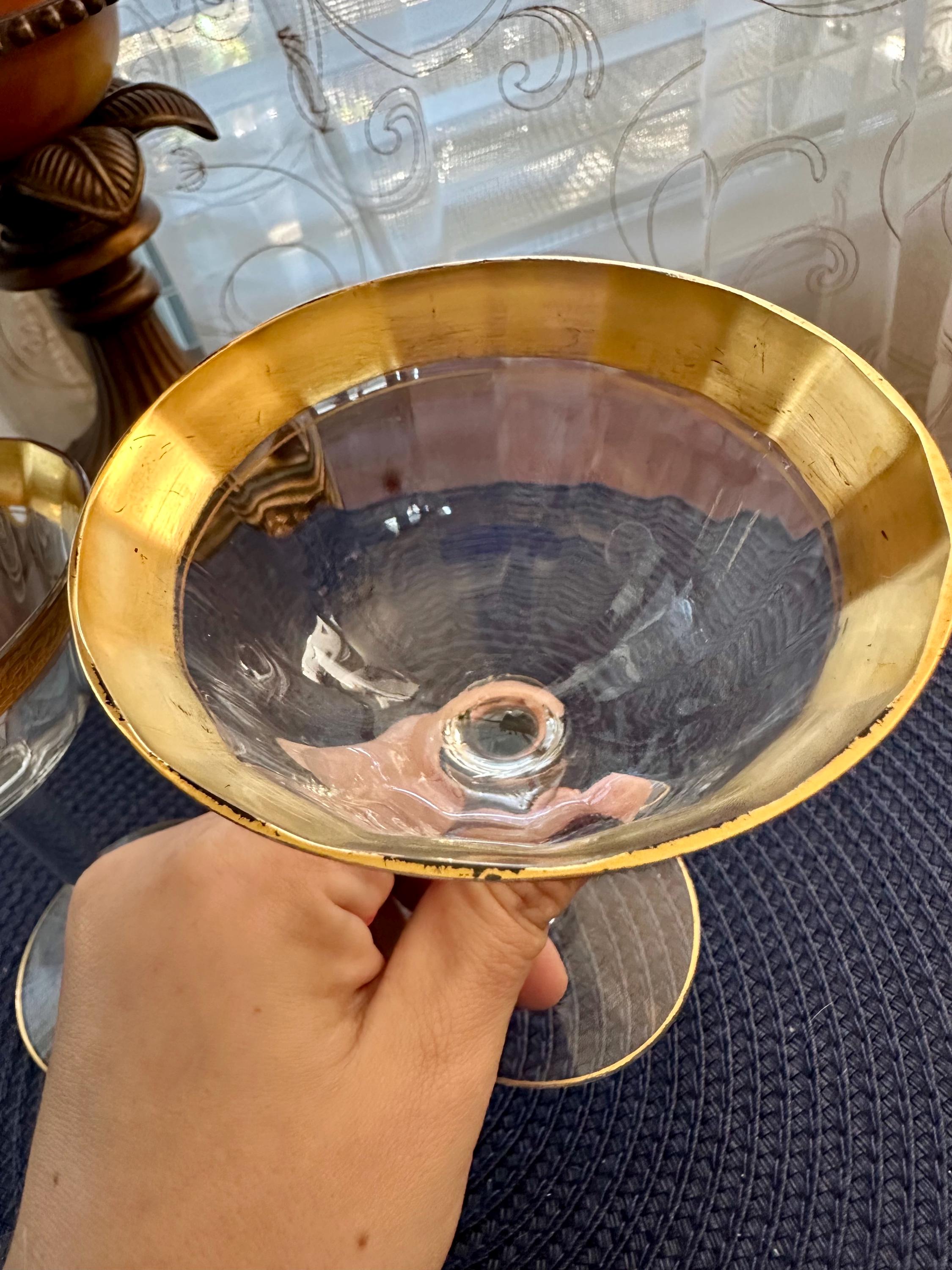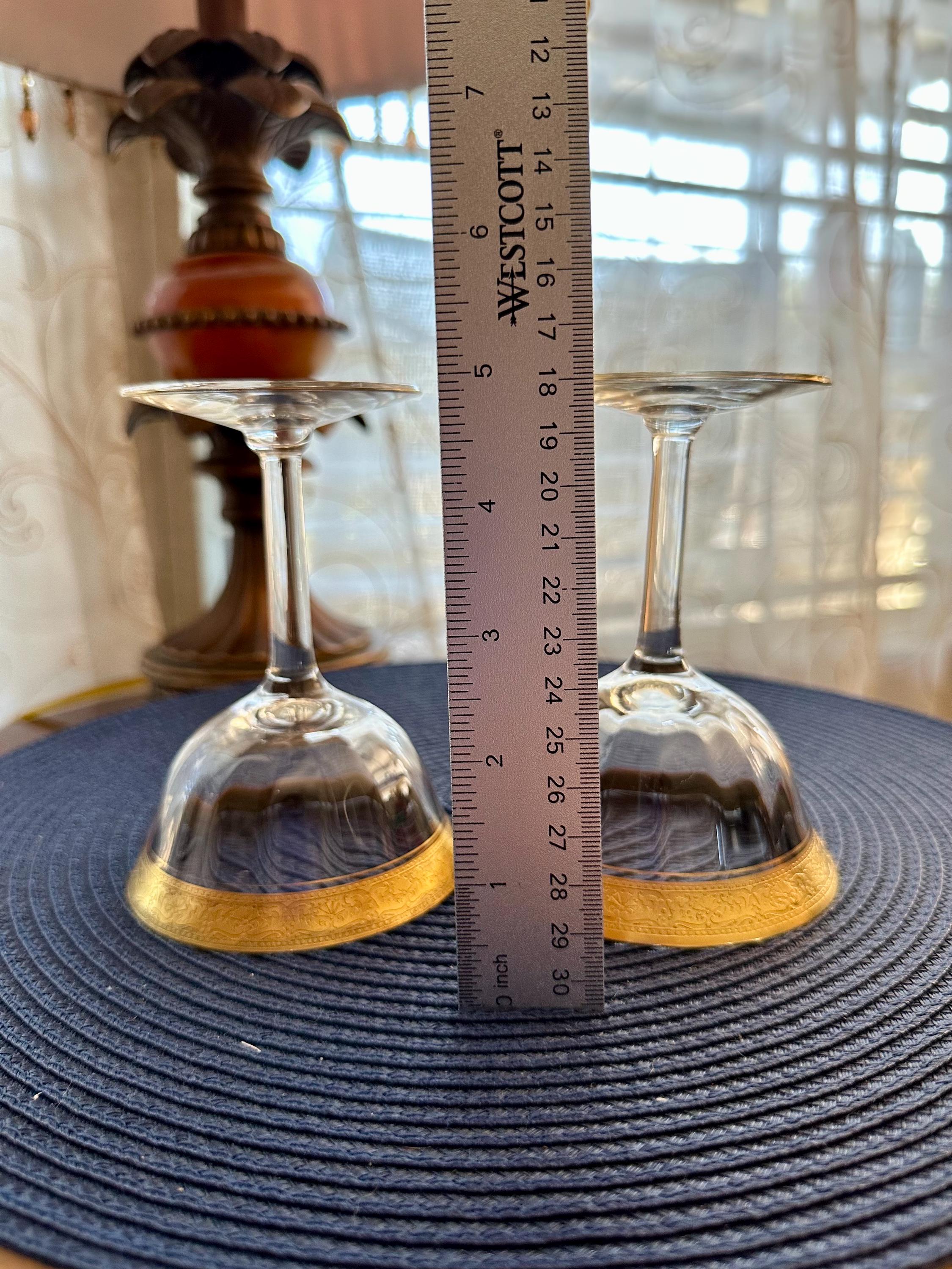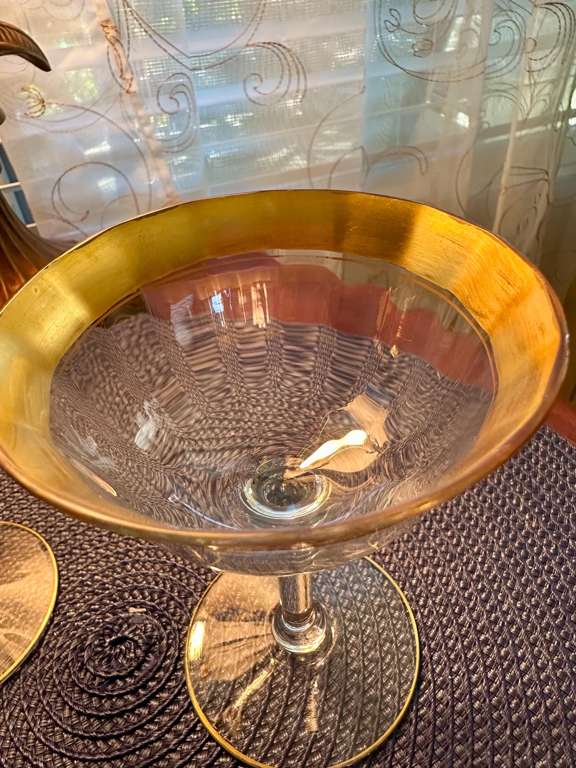 This is a rare find. This is a pair of Vintage Tiffin-Franciscan "Minton" pattern glasses for either champagne or sherbet. These glass have the signature gold trim along with an intricate pattern. These glasses will be sold as a pair and will not be separated. There is a few minor spots where the gold is missing, the pictures are included. There are no cracks or chips in the glass.