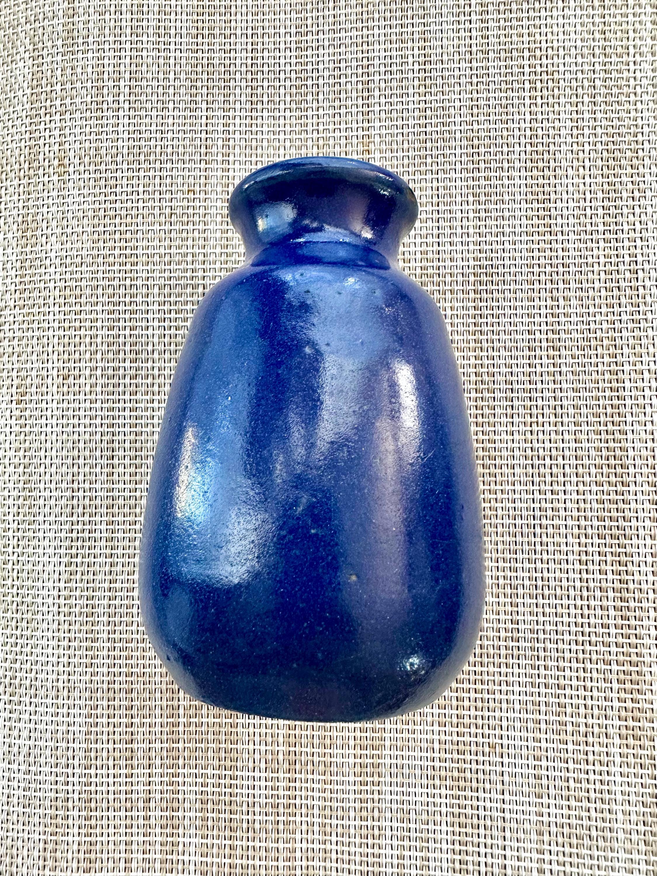 This is a Ronuk blue ceramic stoneware bottle. This is a nice bottle to add to your collection. There is a dimple on the side (picture included), most likely made that way. The bottom is dirty from where it was placed.