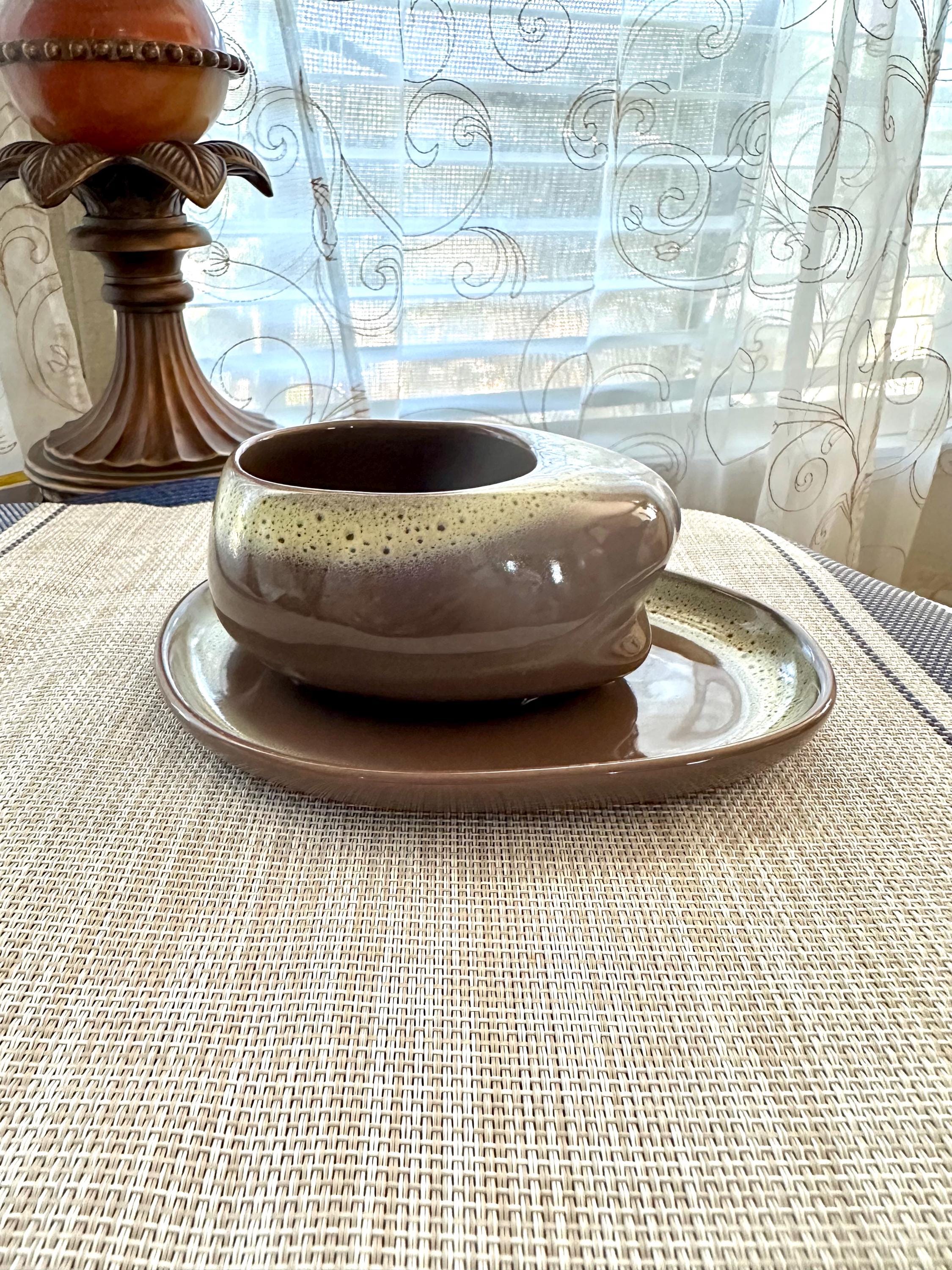 This is a fun item to add to your collection, and here's why: this is a vintage TAMAC pottery saucer and cup set! TAMAC Pottery made in Perry, OK, was a line of ceramic glazed dinnerware that had unique lines and colors. This is the set's color is "Frosty Fudge"; it is brown and tan, oval-shaped. There is no crazing, cracks, or blemishes. At the bottom of the plate, you can see there are 3 spots where this has been placed. This is normal for the age of the item.