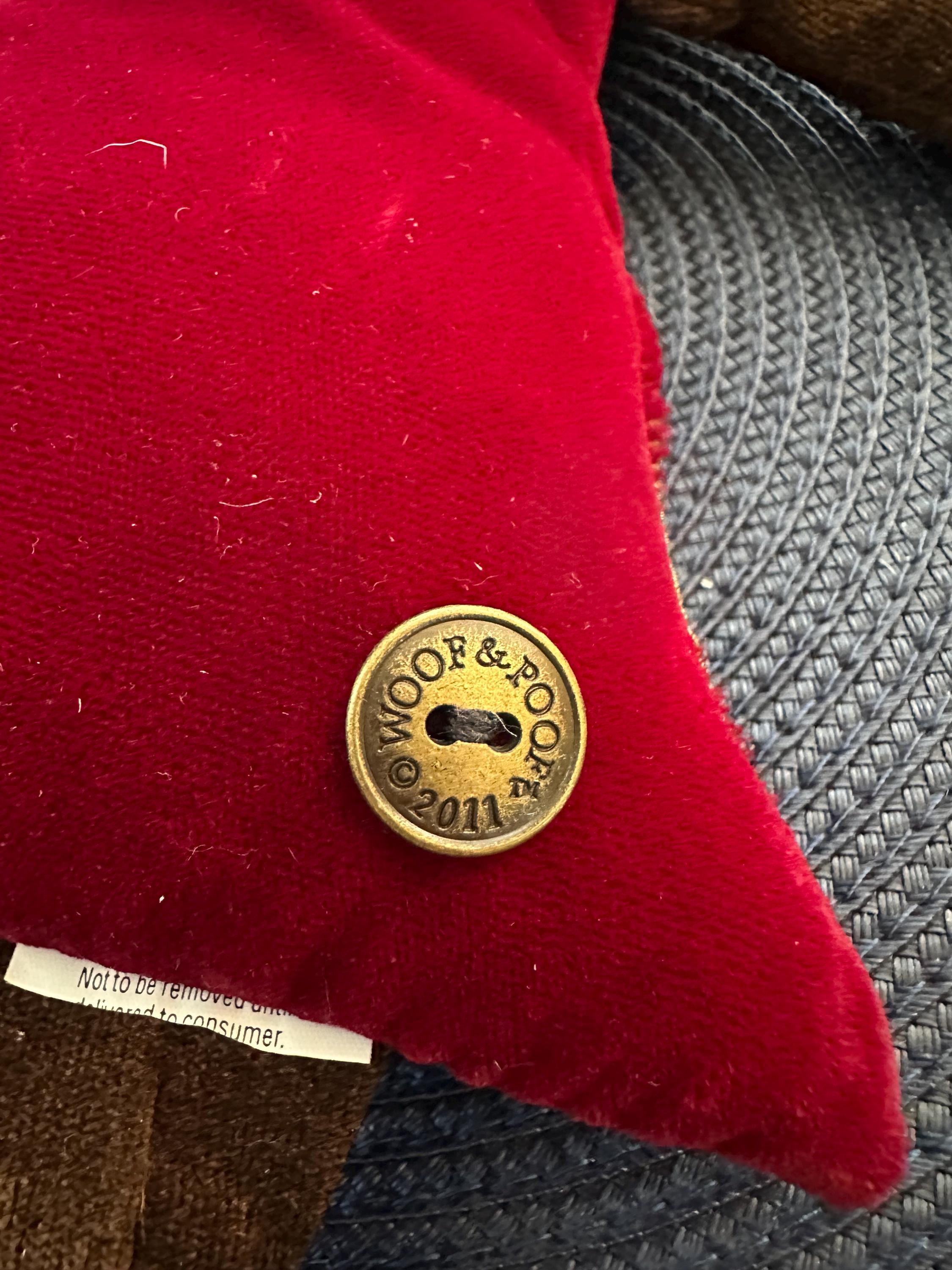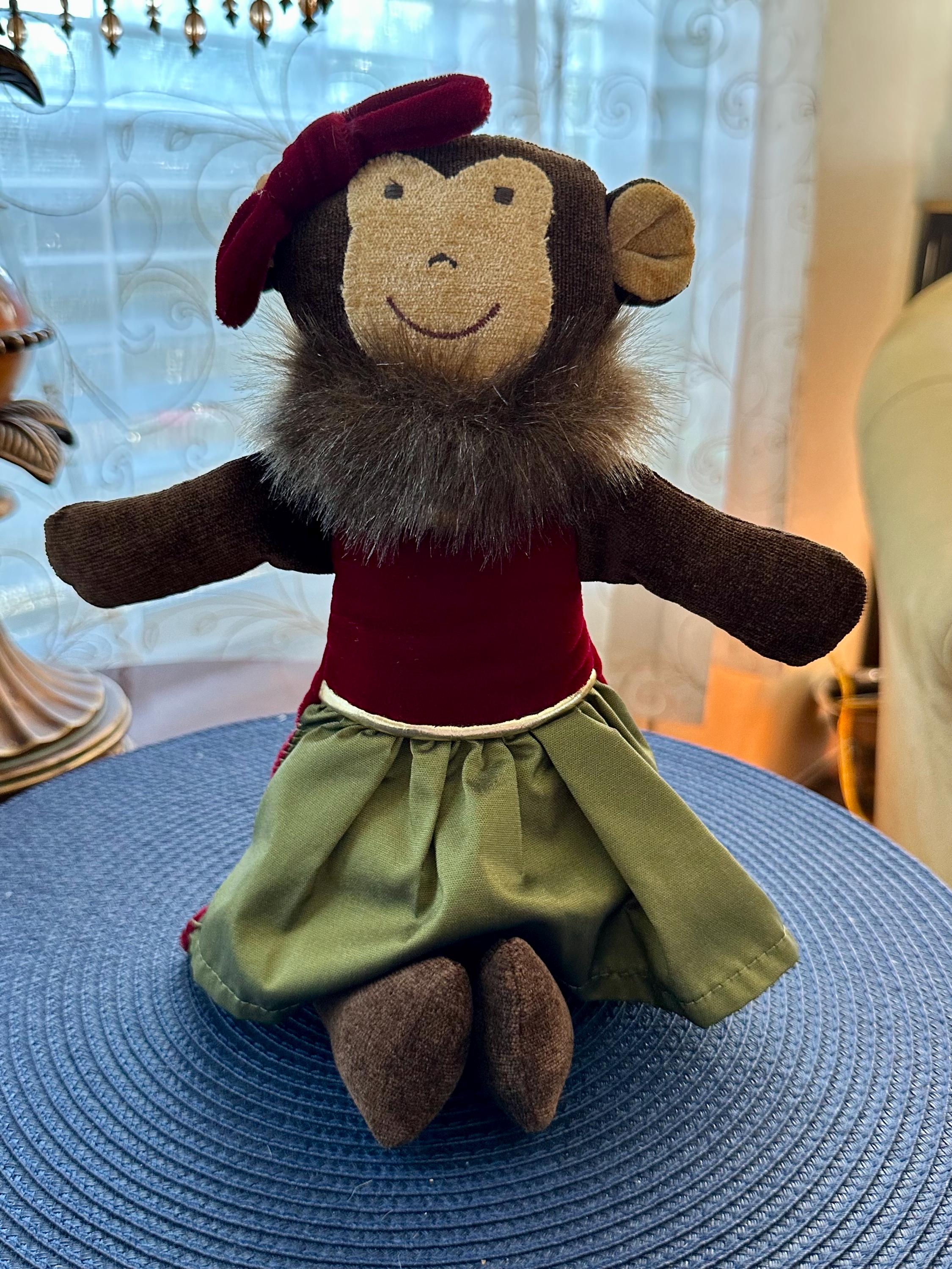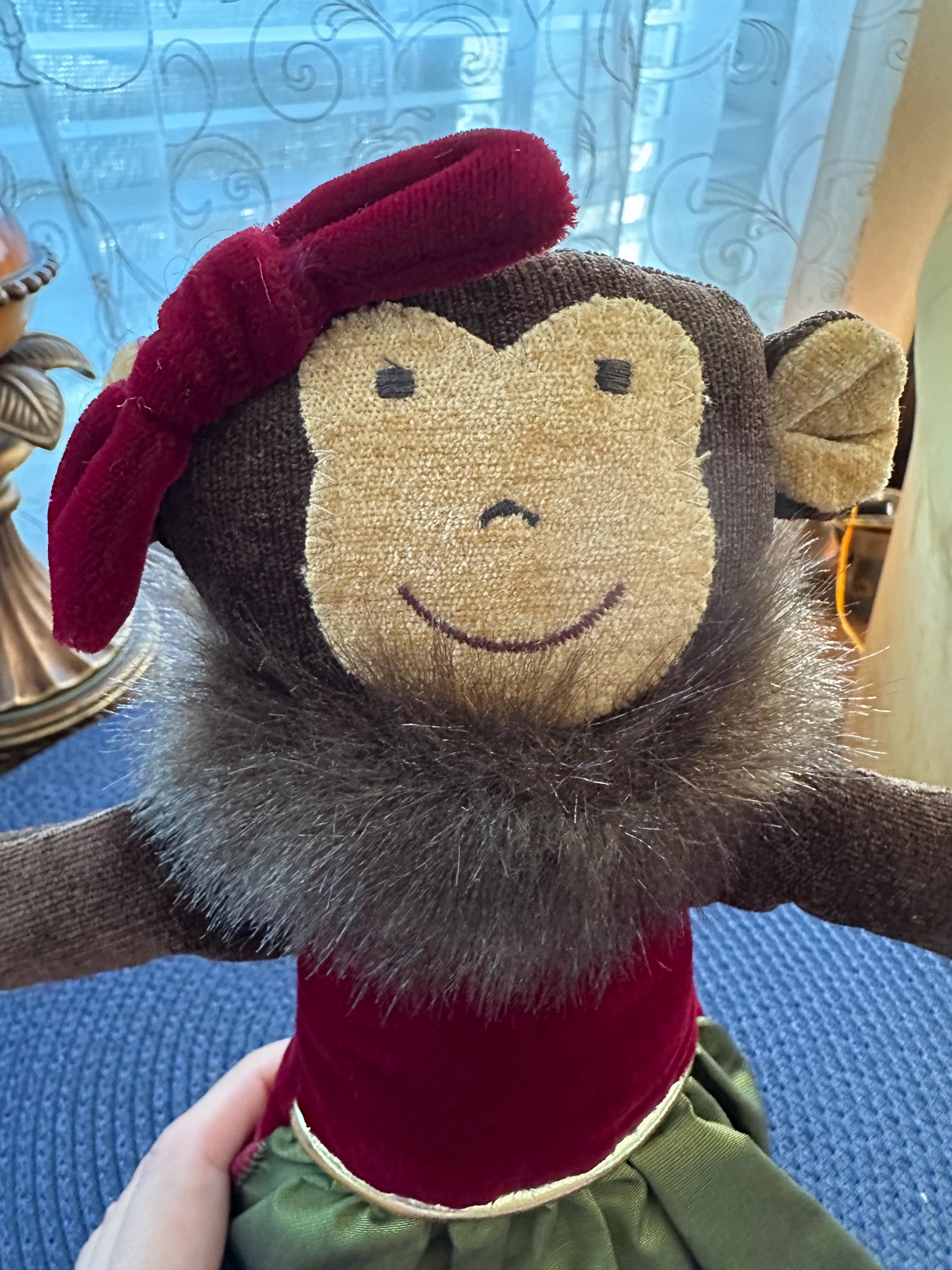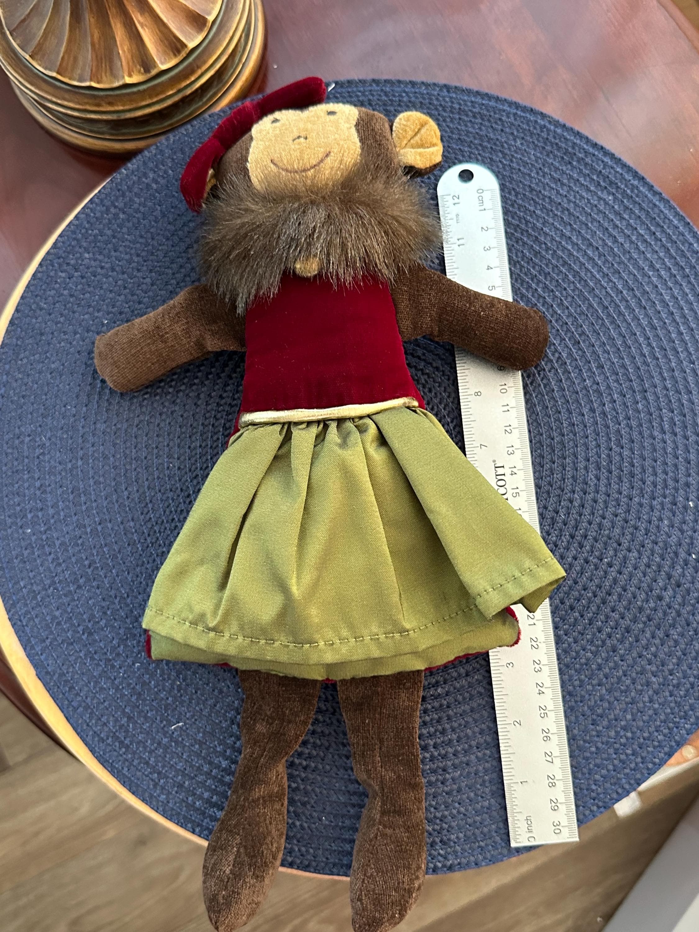 Do you want a new friend to sit in your collection of monkeys or is it time to get your furry friend a new toy? Stop looking because this monkey wants to go home to your family. This is a "Woof and Pooch" monkey. This monkey is over 12 inches long. The information tag (you know the one that says don't remove) is removed so I do not have more information about her. This monkey does not have any smell and is fur/hair free. There are no tears or rips. This item is not eligible for returns.