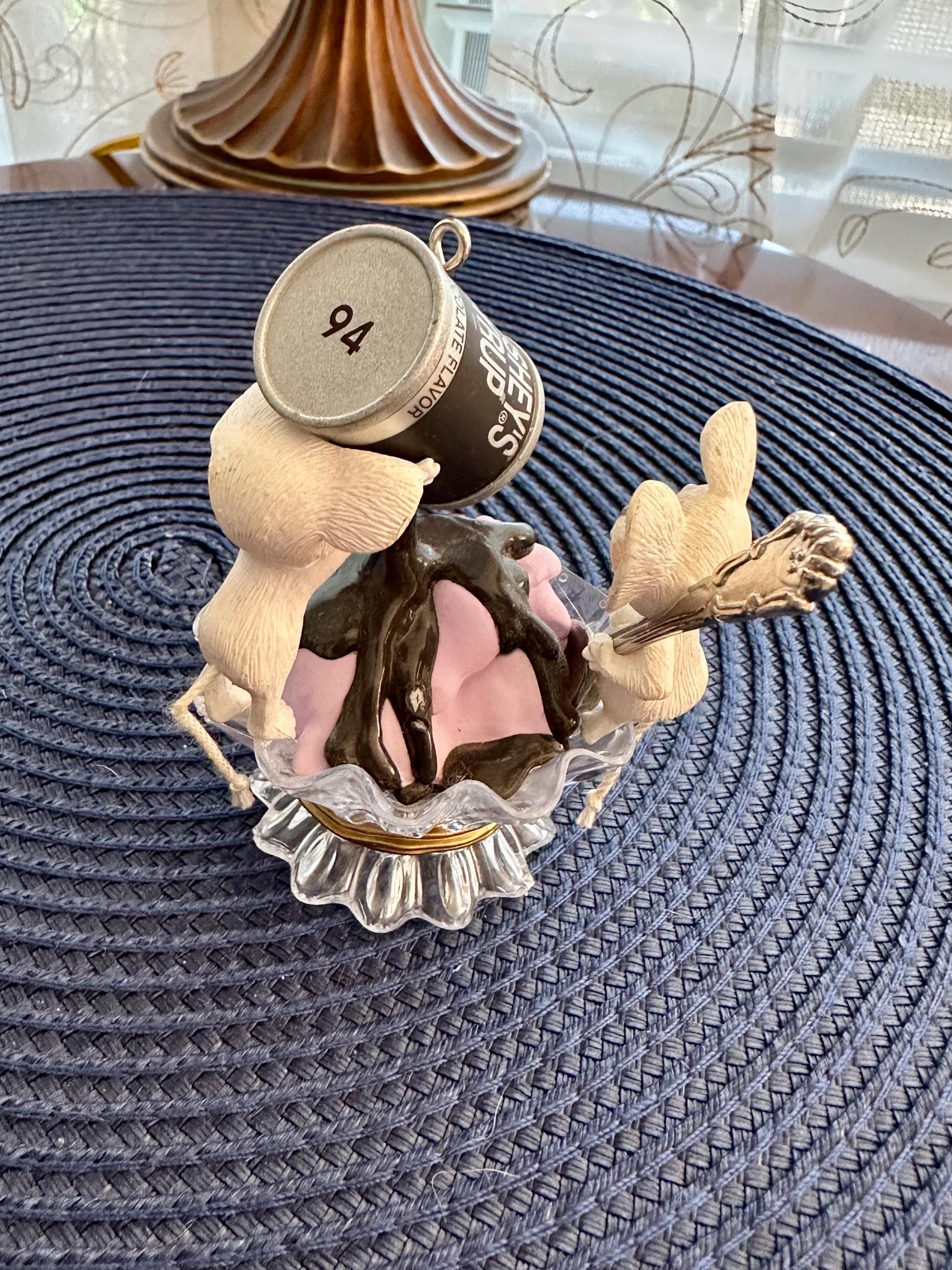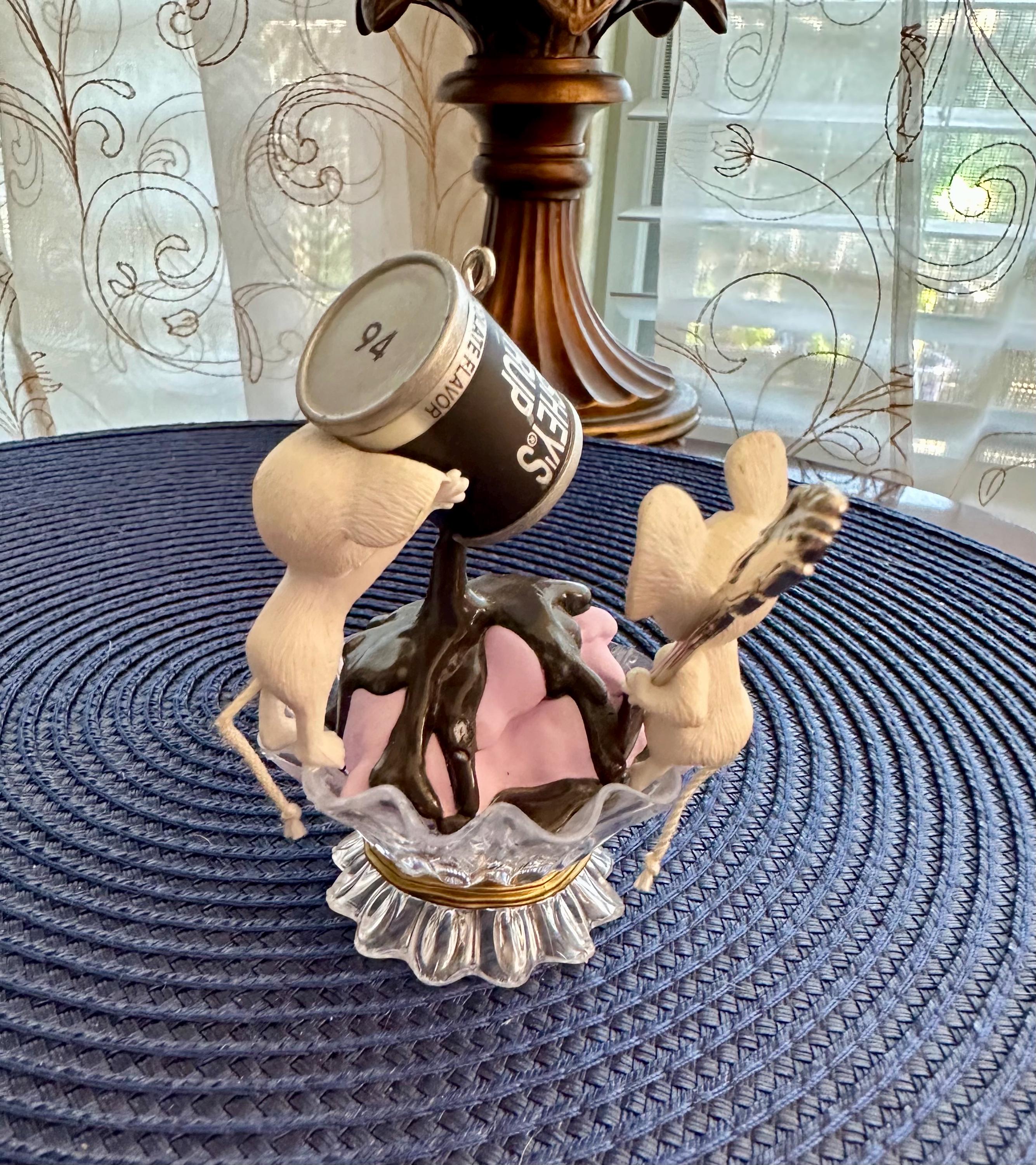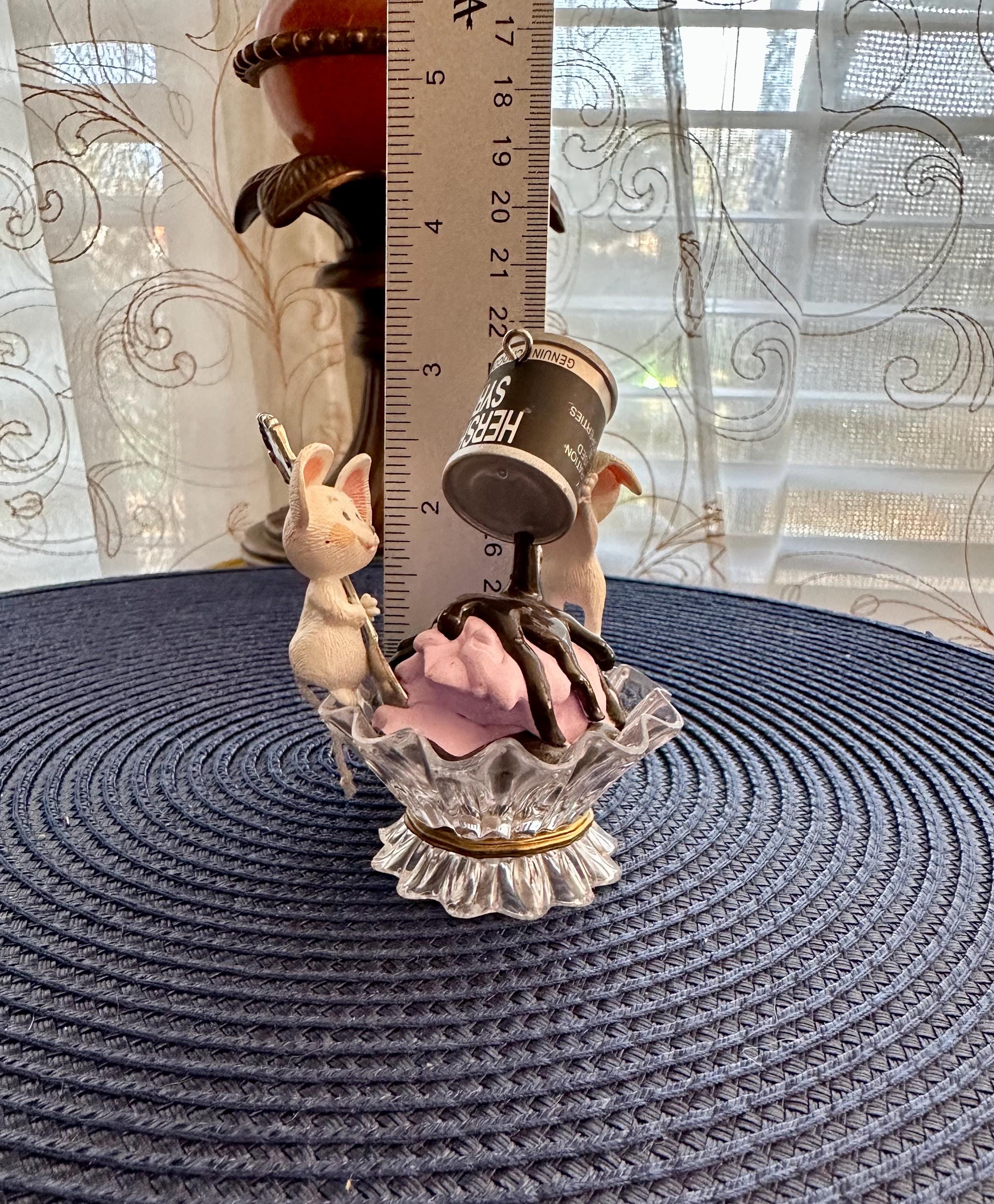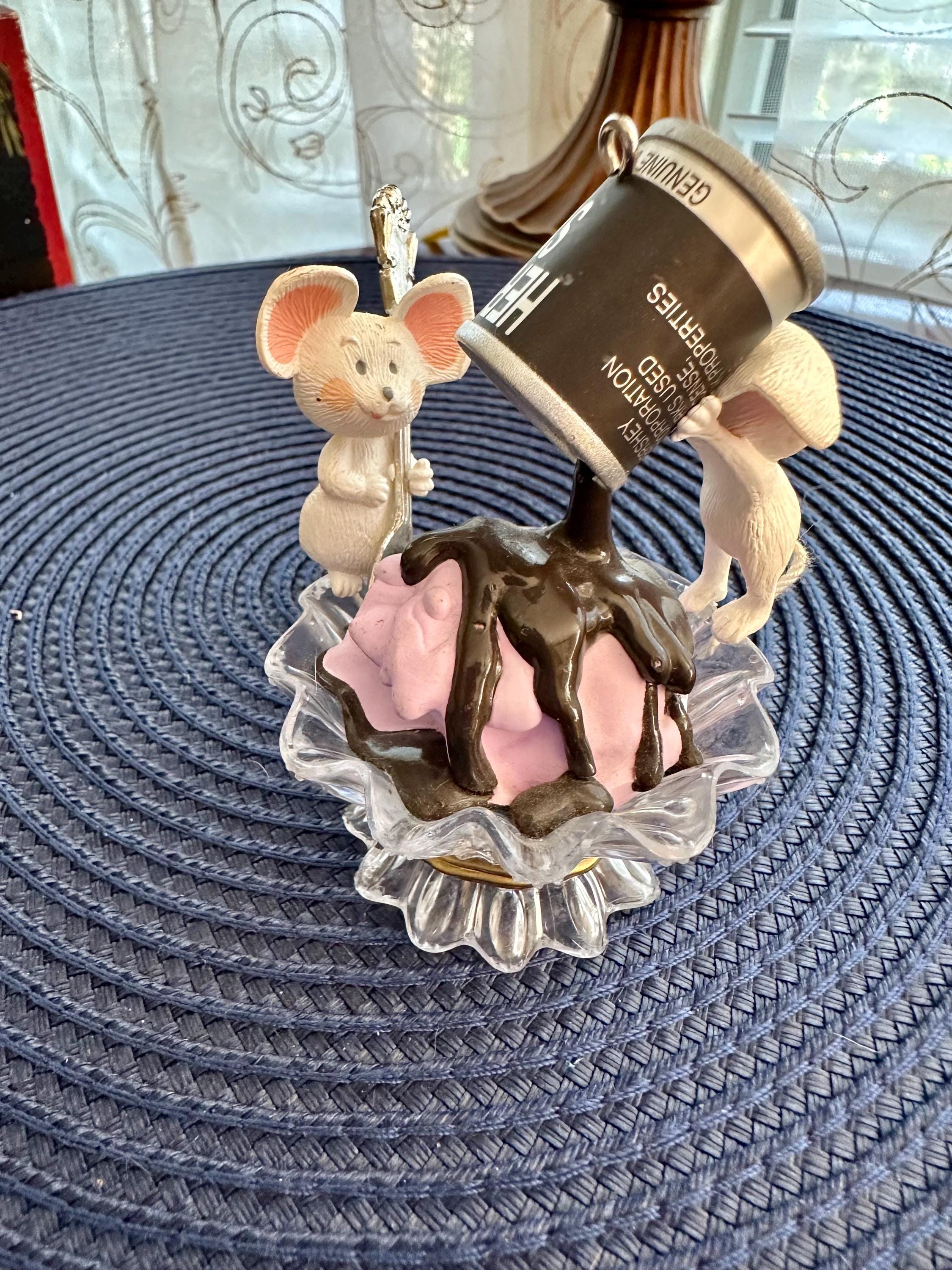 This is a vintage Hallmark Keepsake Ornament "Friendship Sundae". This has two little mice making an ice cream sundae with Hershey Syrup. The back of the box says: Handcrafted- Dated 1994 Happy moments become sweet memories when shared with special friends This come with the original box from 1994. There is one spot where the Christmas light touched the ornament for too long and the box does have some questionable marks on it. Pictures are included. This duo is 3 inches tall and 3 inches wide. We do have more Hallmark Keepsake ornaments. If you would like to purchase more than one please contact us and we will give you a discount. We also offer complimentary gift wrapping if you are interested contact us. Disclaimer: The color maybe different due to the lighting or camera. Though we try to reduce and reuse, the cost of additional shipping materials are included in the price. We are not responsible for damages incurred during shipping. As always please contact us if you would like additional pictures or if you have any questions.