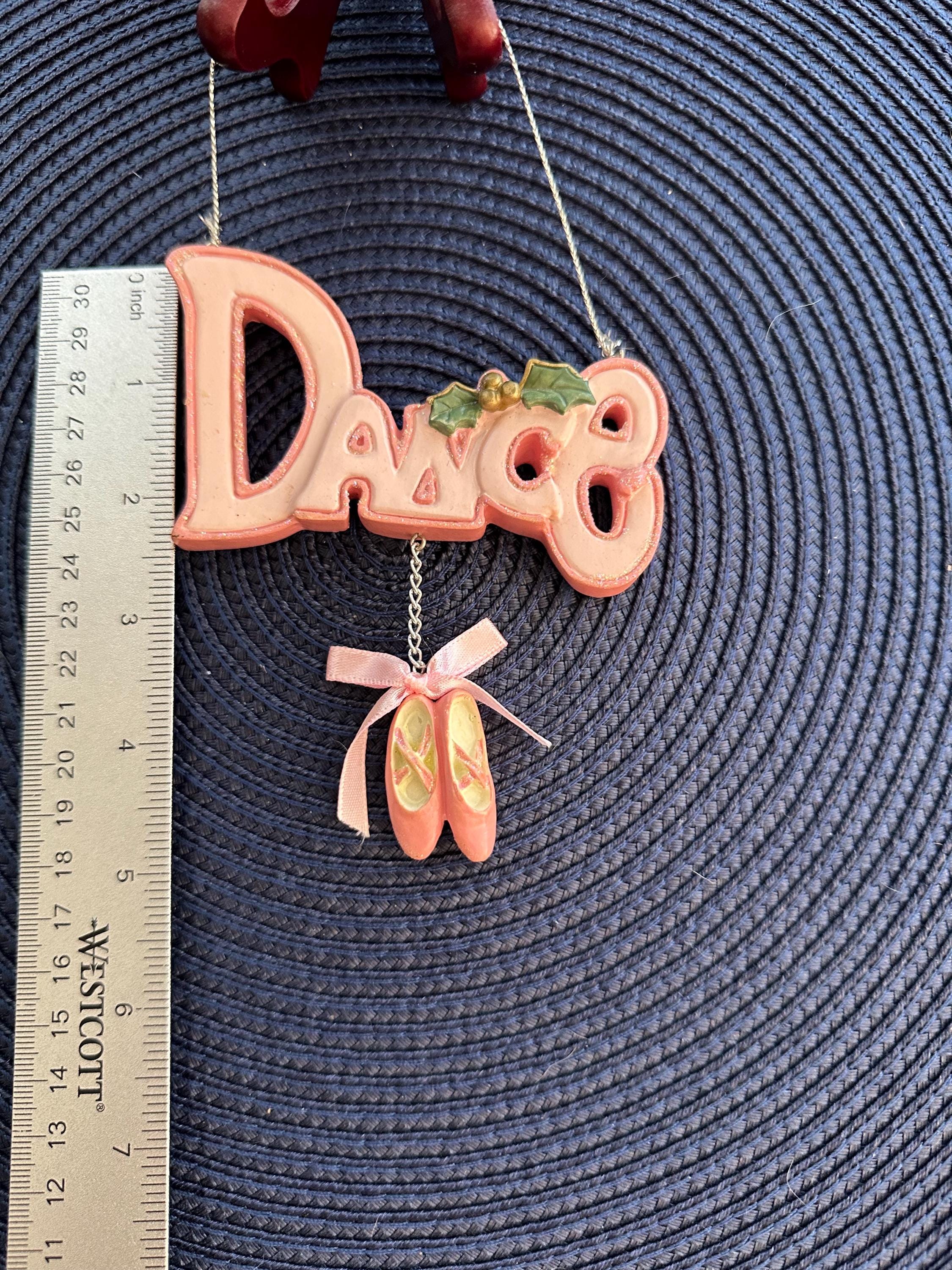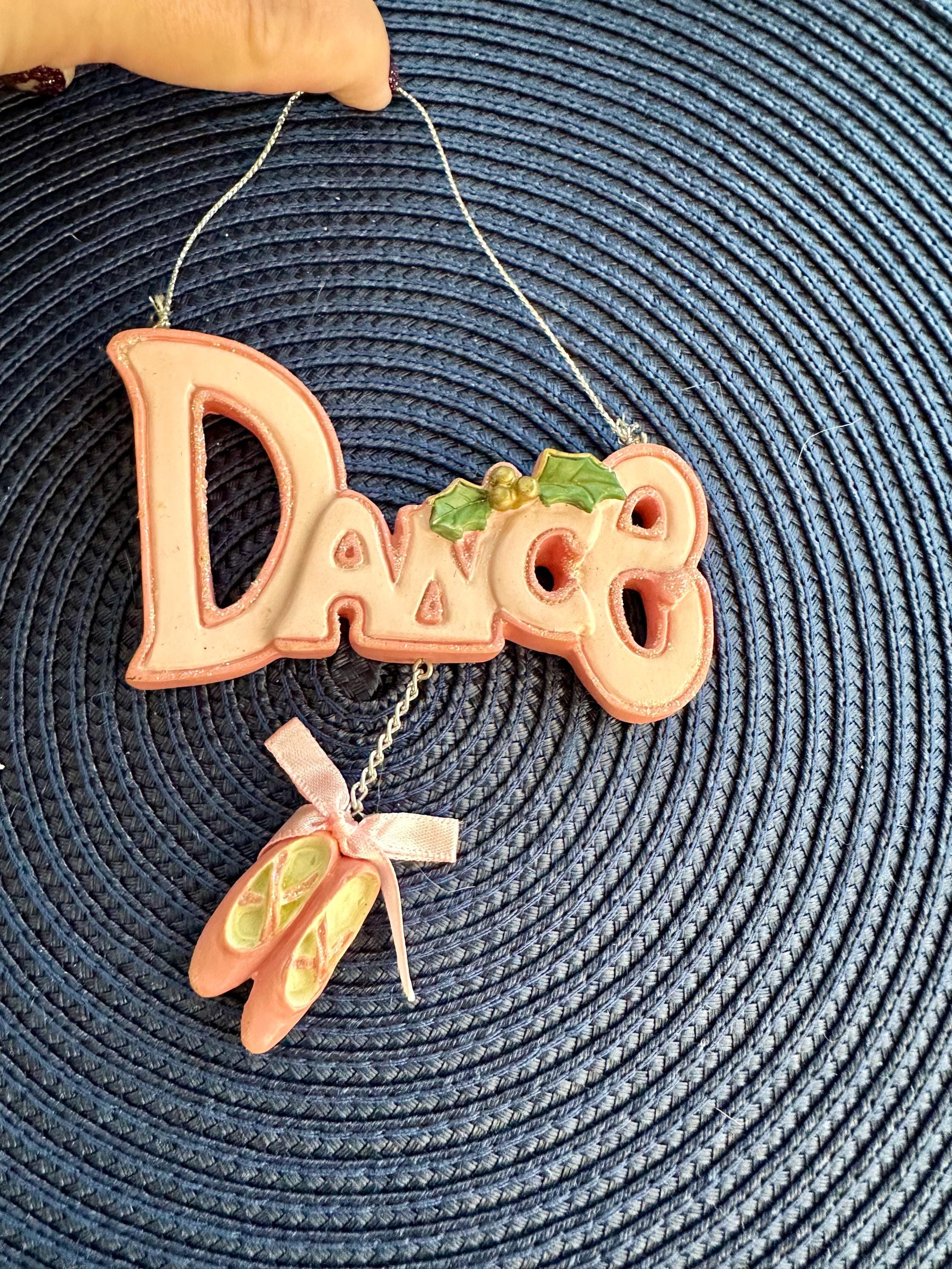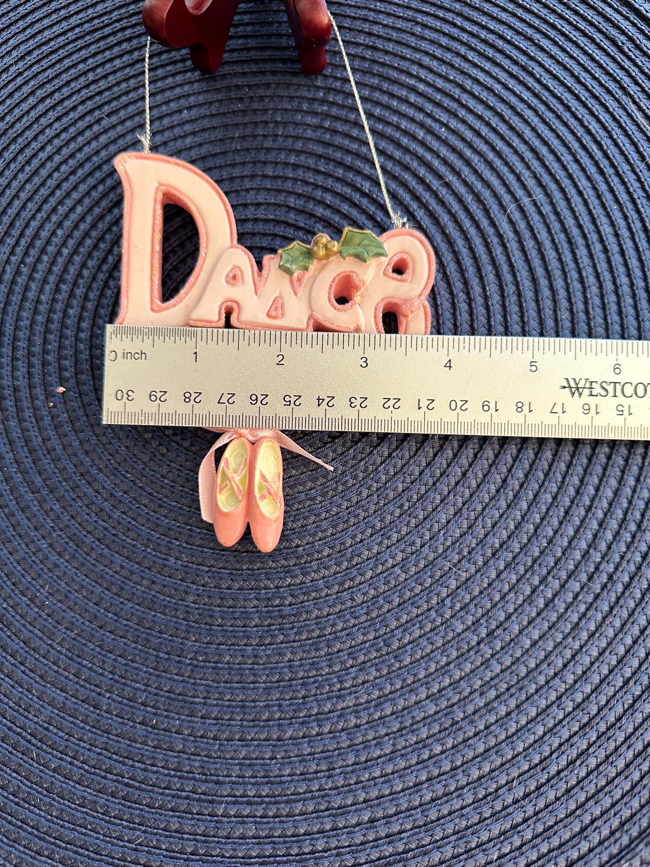This is a Christmas ornament that says "Dance" in pink with ballet slippers. There is a small spot on the back of the ornament.