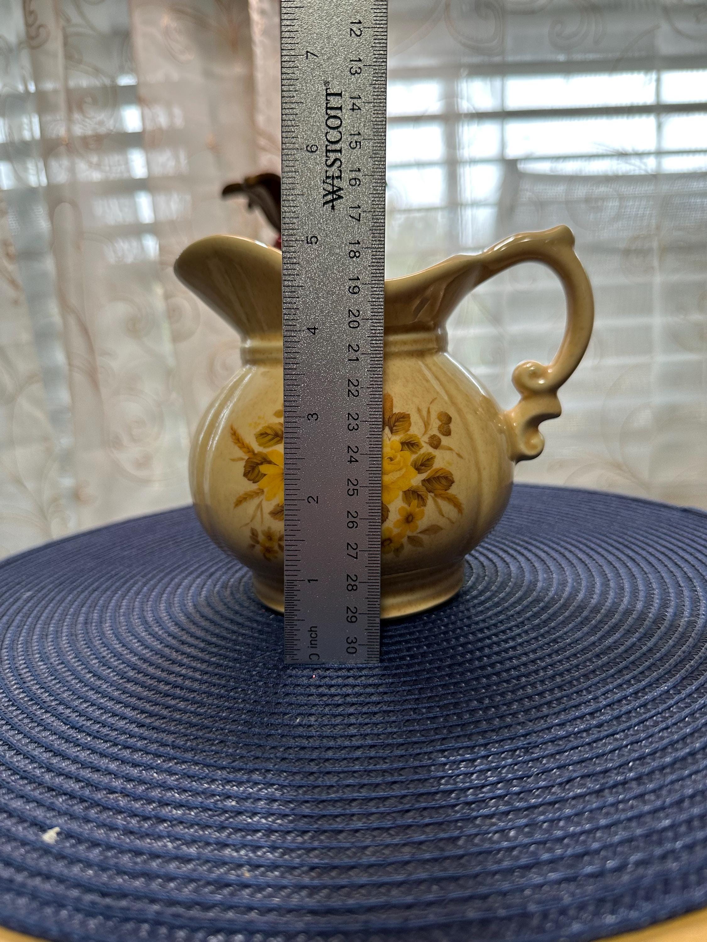 This is a McCoy Pottery Floral Pitcher #7528. This is 5 inches tall and 6.5 inches wide. It is yellow and brown with a flower pattern. There are no chips, cracks, crazing or blemishes.This does not come with matching bowl only the pitcher. But this would be lovely to use as a creamer. This will be perfect for your pitcher collection. It is not recommended for the dishwasher or the microwave. This is a hand wash only item.