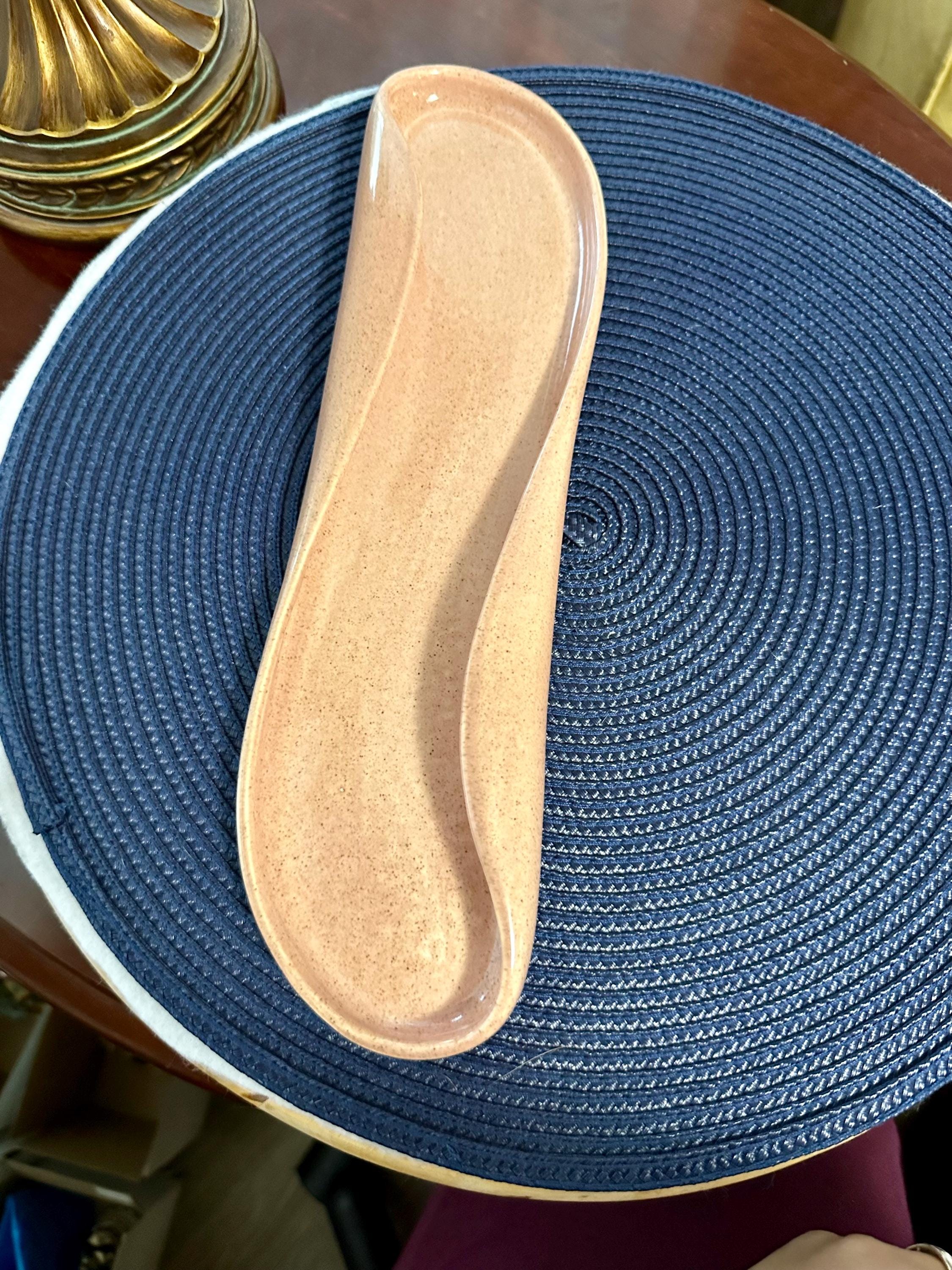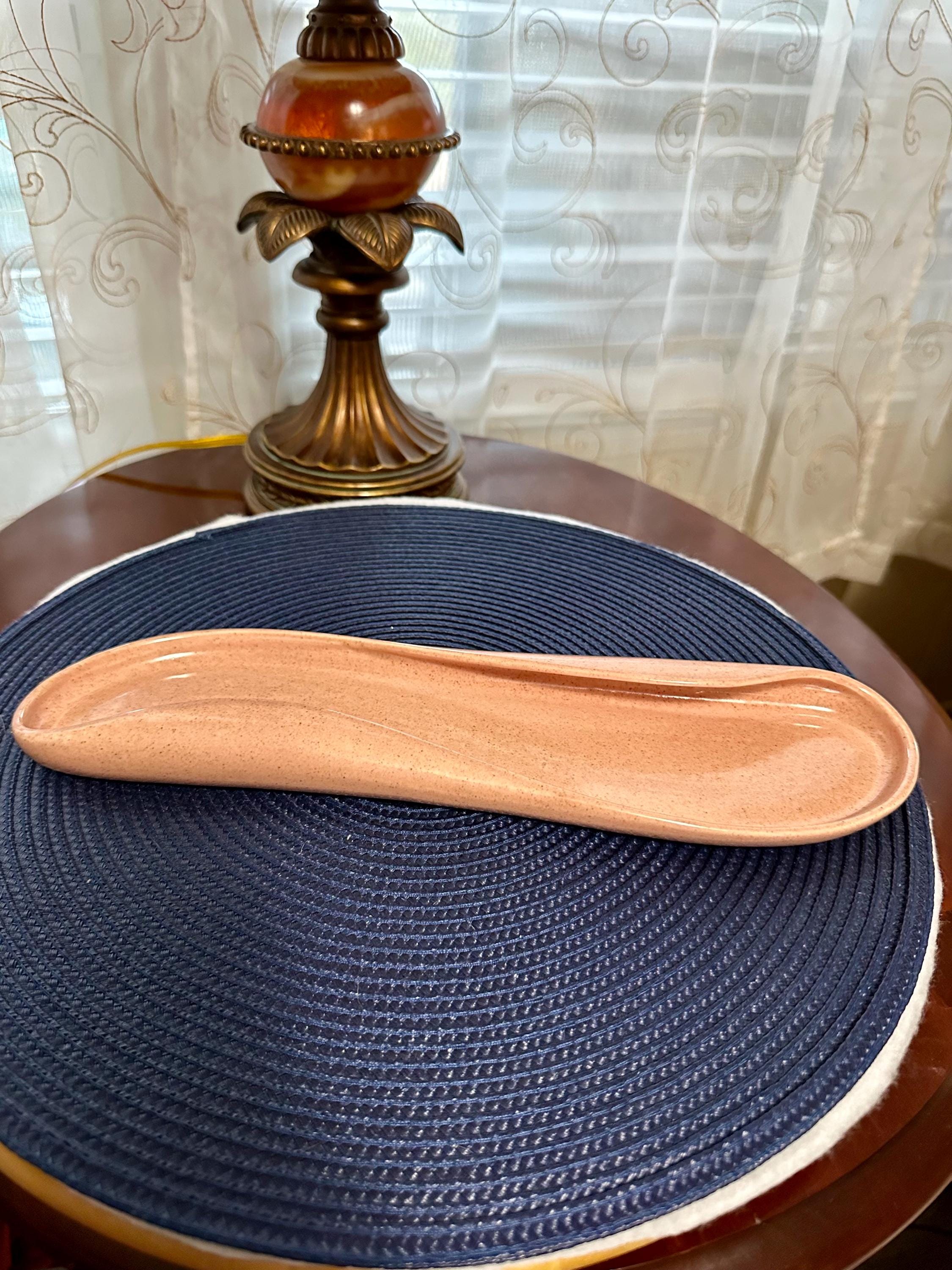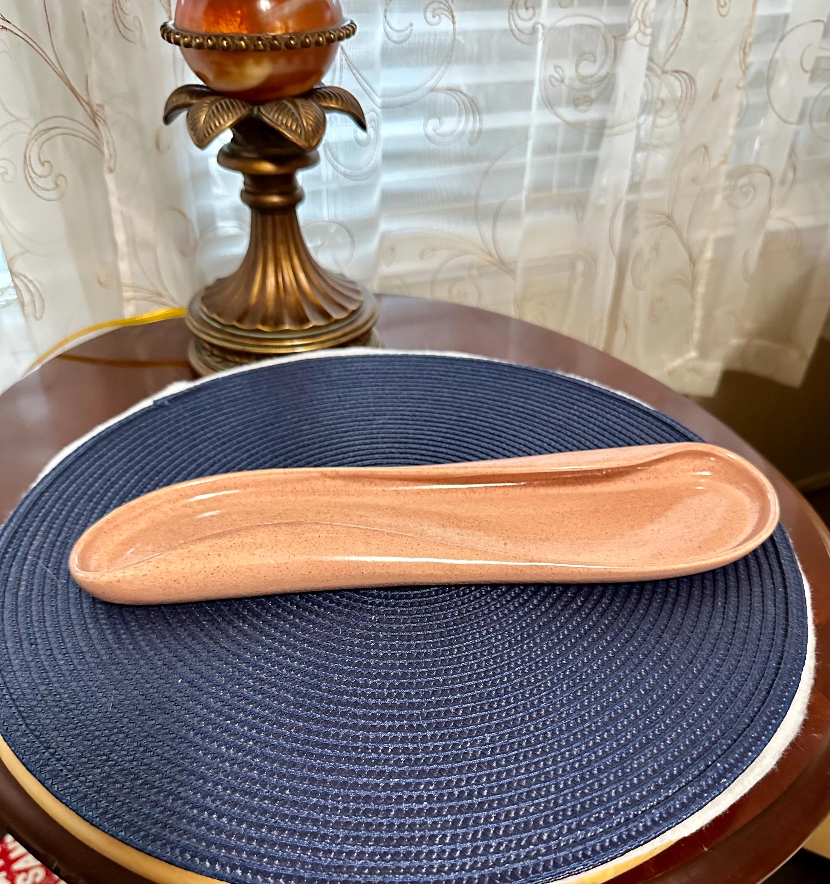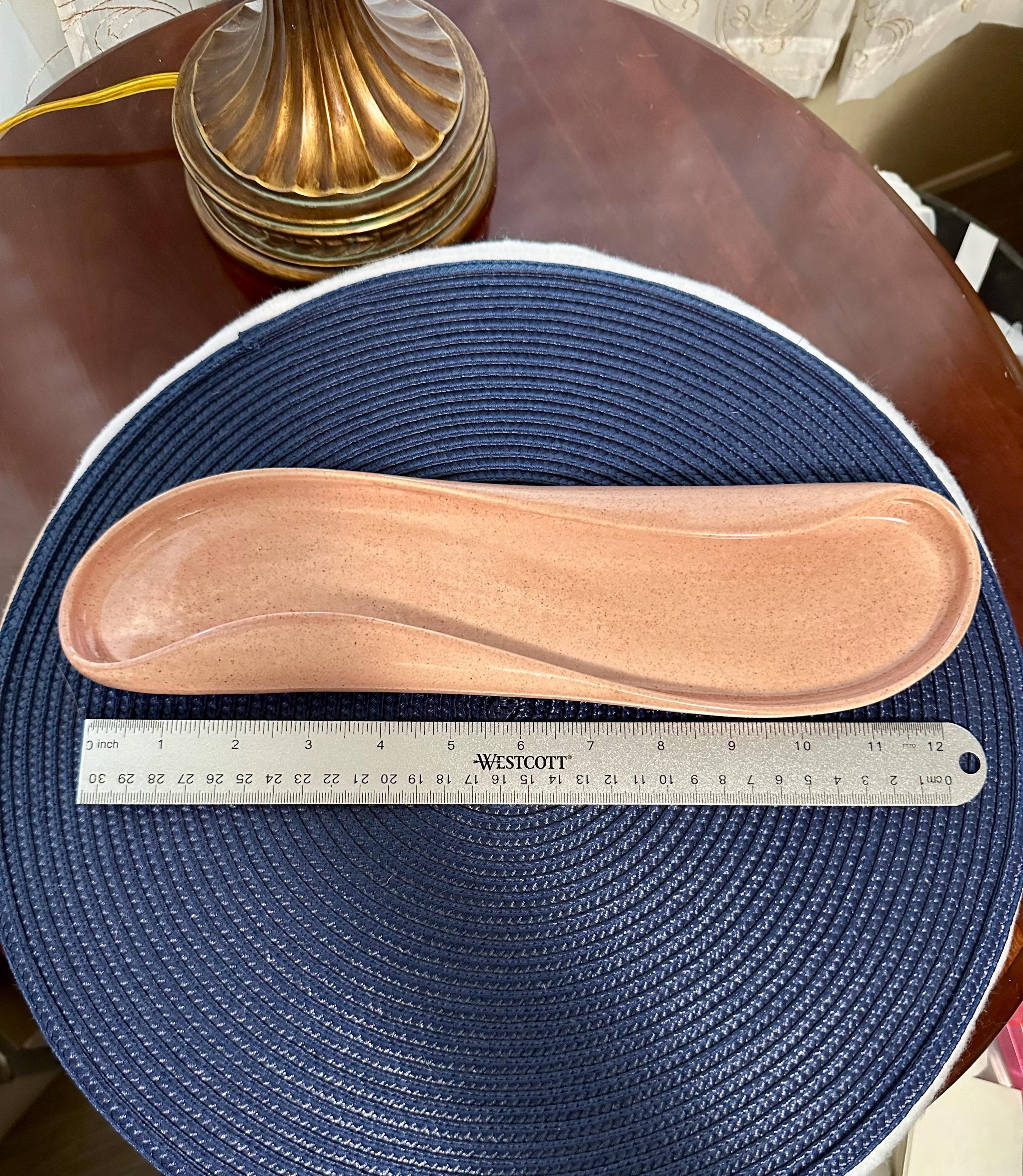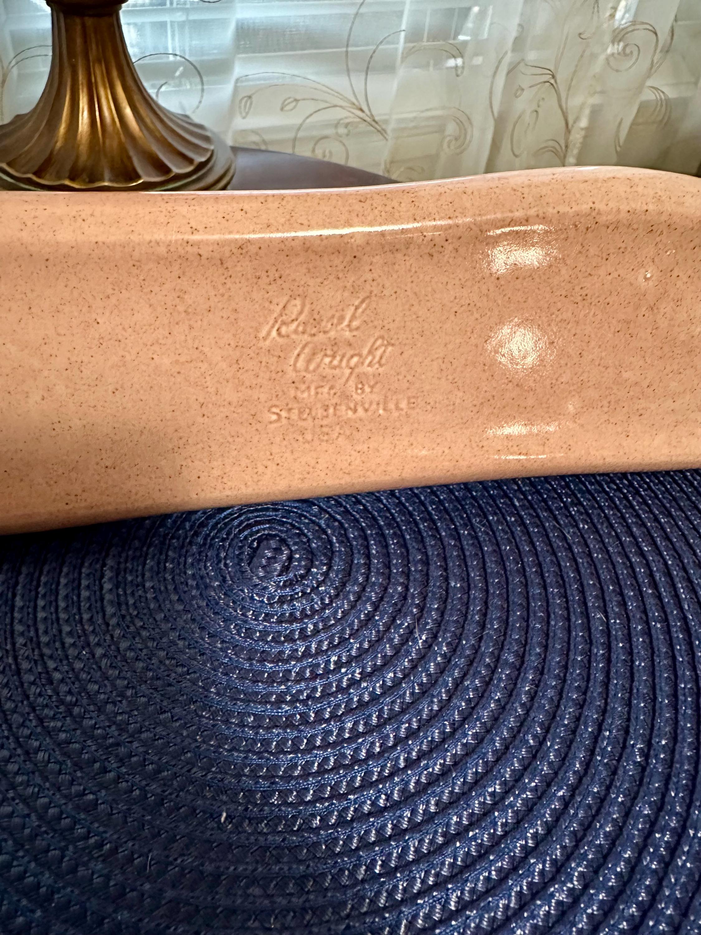 This is a VERY UNIQUE mid-century coral pink plate made by Russel Wright. The back of the plate is is written: Russel Wright MFG BY Steubenville There are no cracks, crazing or blemishes. This is 12 inches long and 3 inches wide. We do not recommend that you use this plate in the microwave or in the dishwasher.