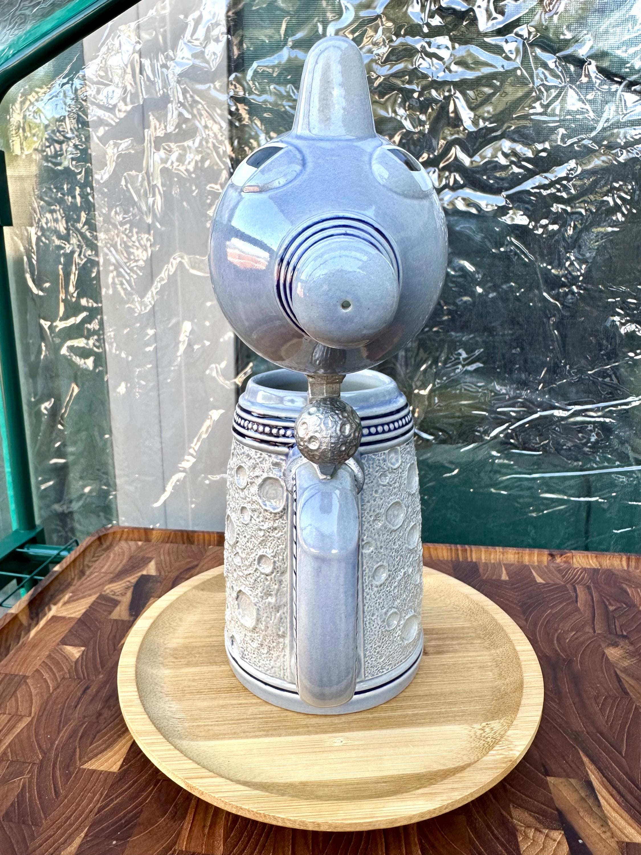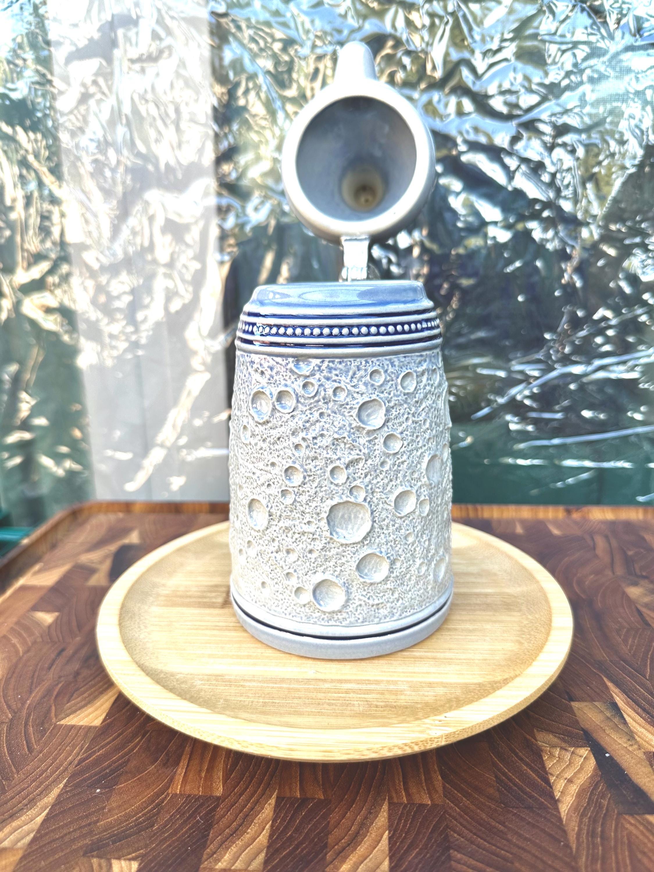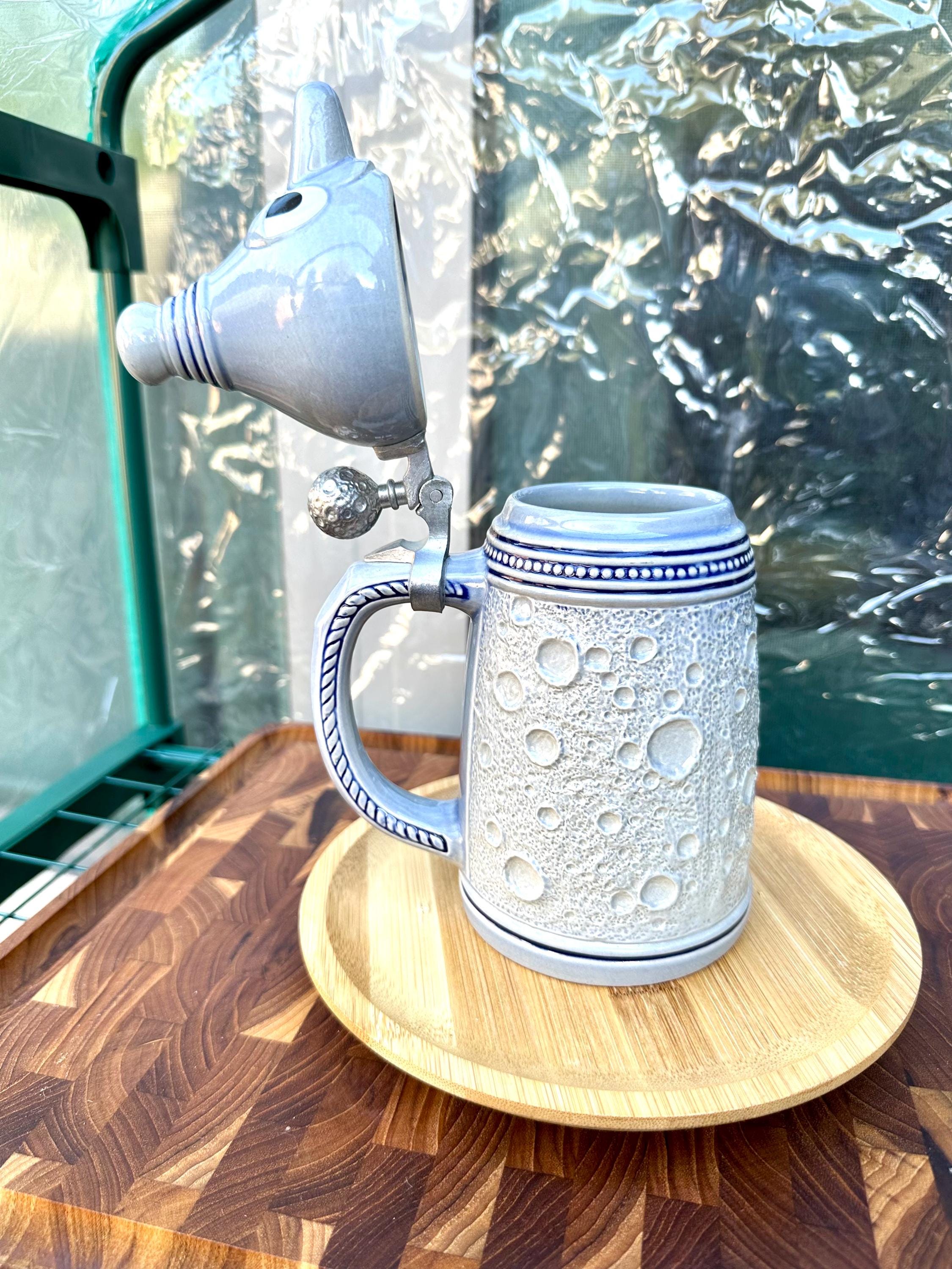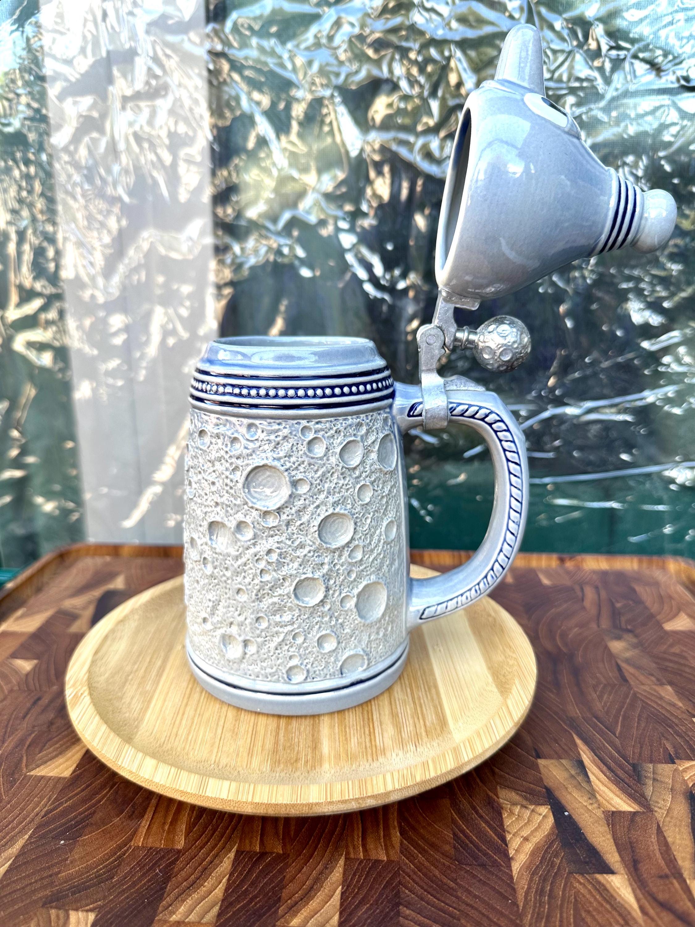 This is the "Moon Man", from the Schultz & Dooley Utica Club Beer Stein Family. This is a unique beer stein. The tumblift is shaped like the moon. The thumblift, strap, hinge and shank are in great working condition. The Moon Man does not have any crazing, cracks, chips, or blemishes. He does not have the silver antenna, however you can add a silver pipe cleaner I did not want to alter this mug in any way. The bottom of this stein reads: First Edition WEBCO Made in Germany for FX Matt Brewing Co. Utica NY This mug was made between 1993 and 1995. This mug is not microwave or dishwasher safe. This is a hand wash only item. Disclaimer The color maybe different due to the lighting or camera. Though we try to reduce and reuse, the cost of additional shipping materials are included in the price. We are not responsible for damages incurred during shipping. As always please contact us if you would like additional pictures or if you have any questions.