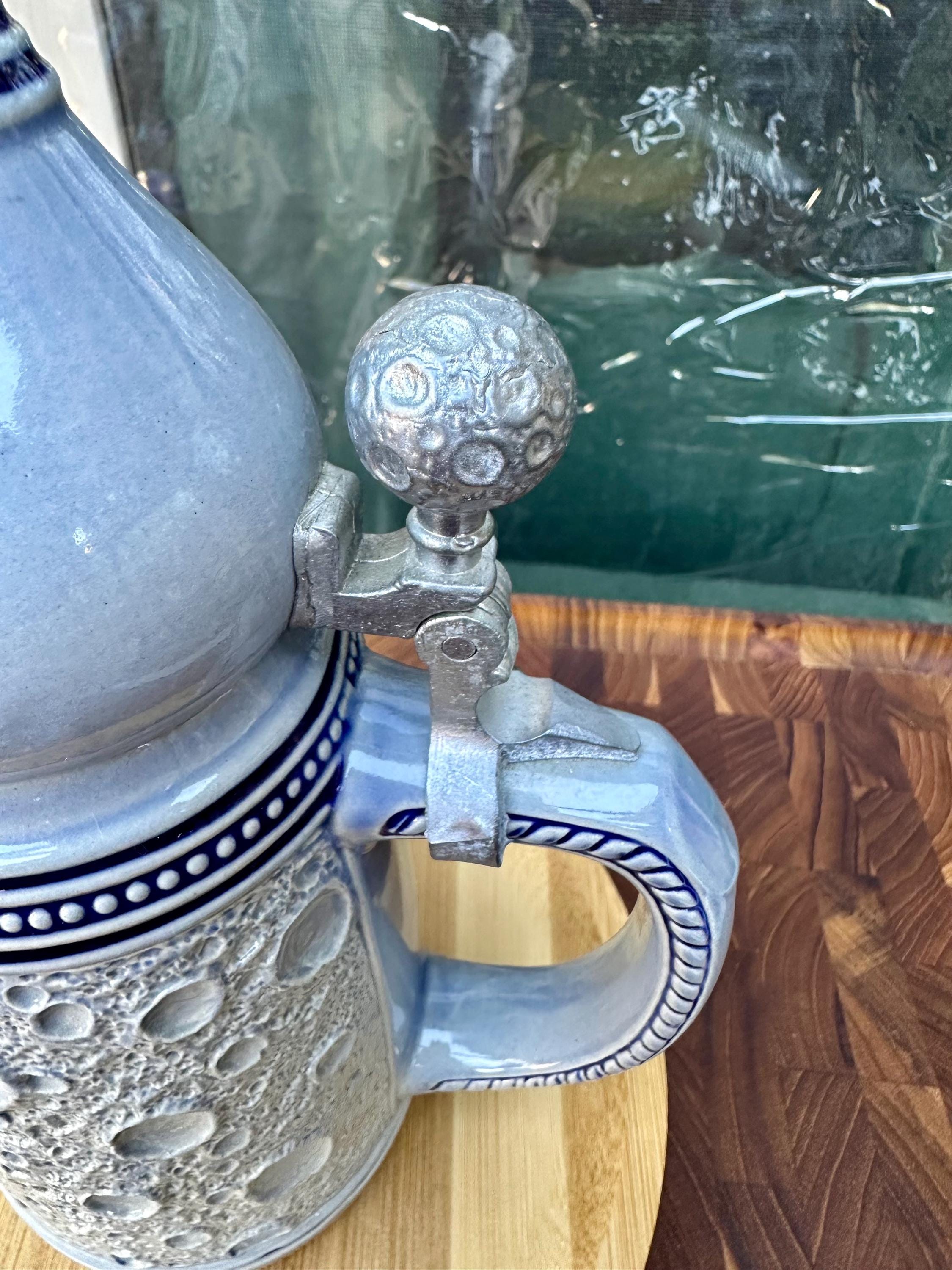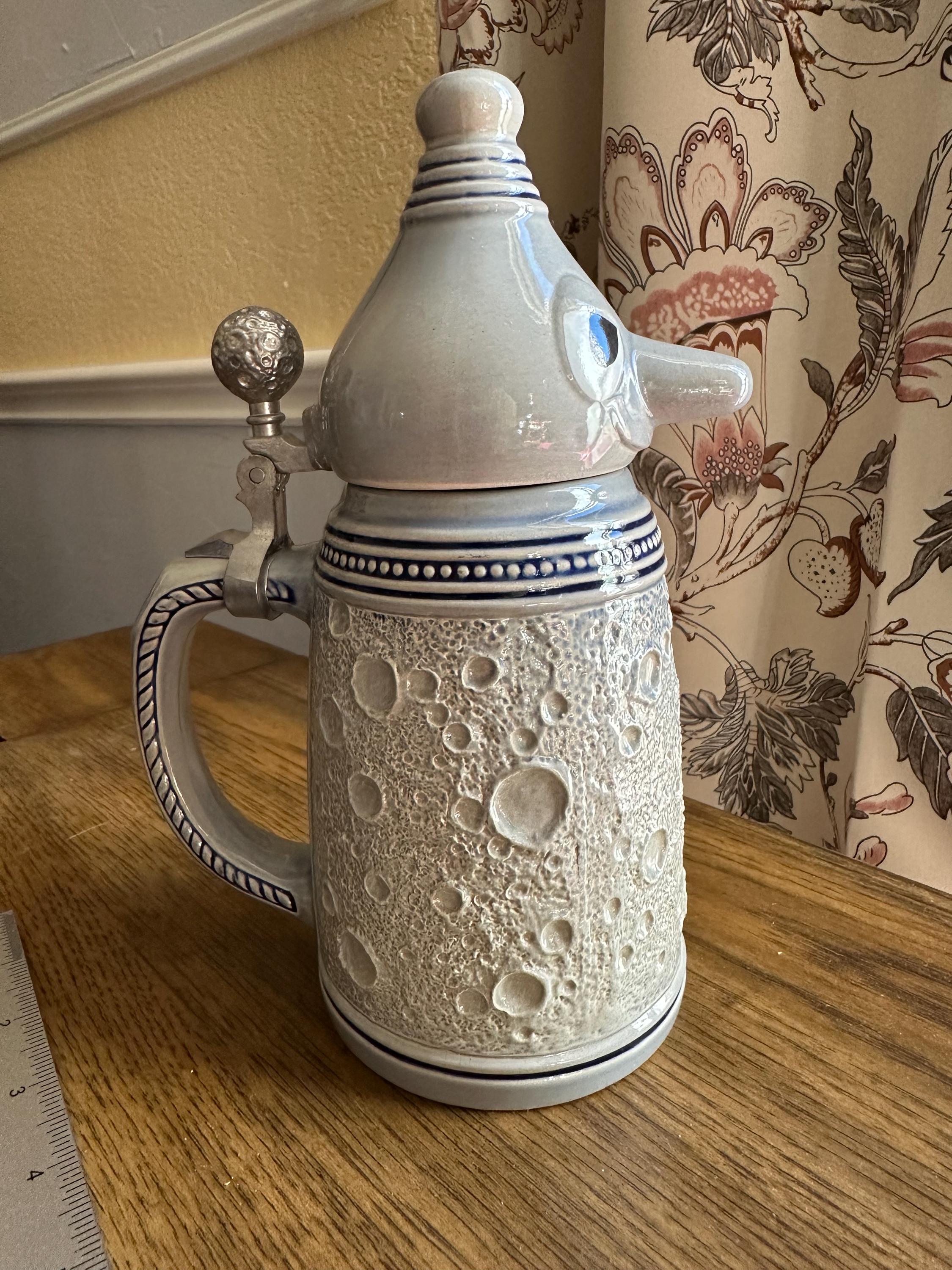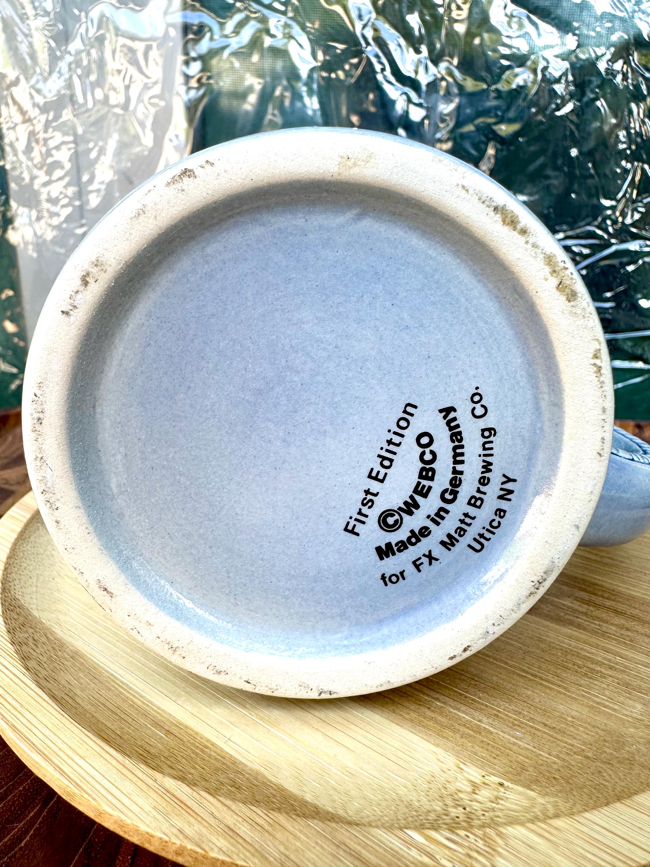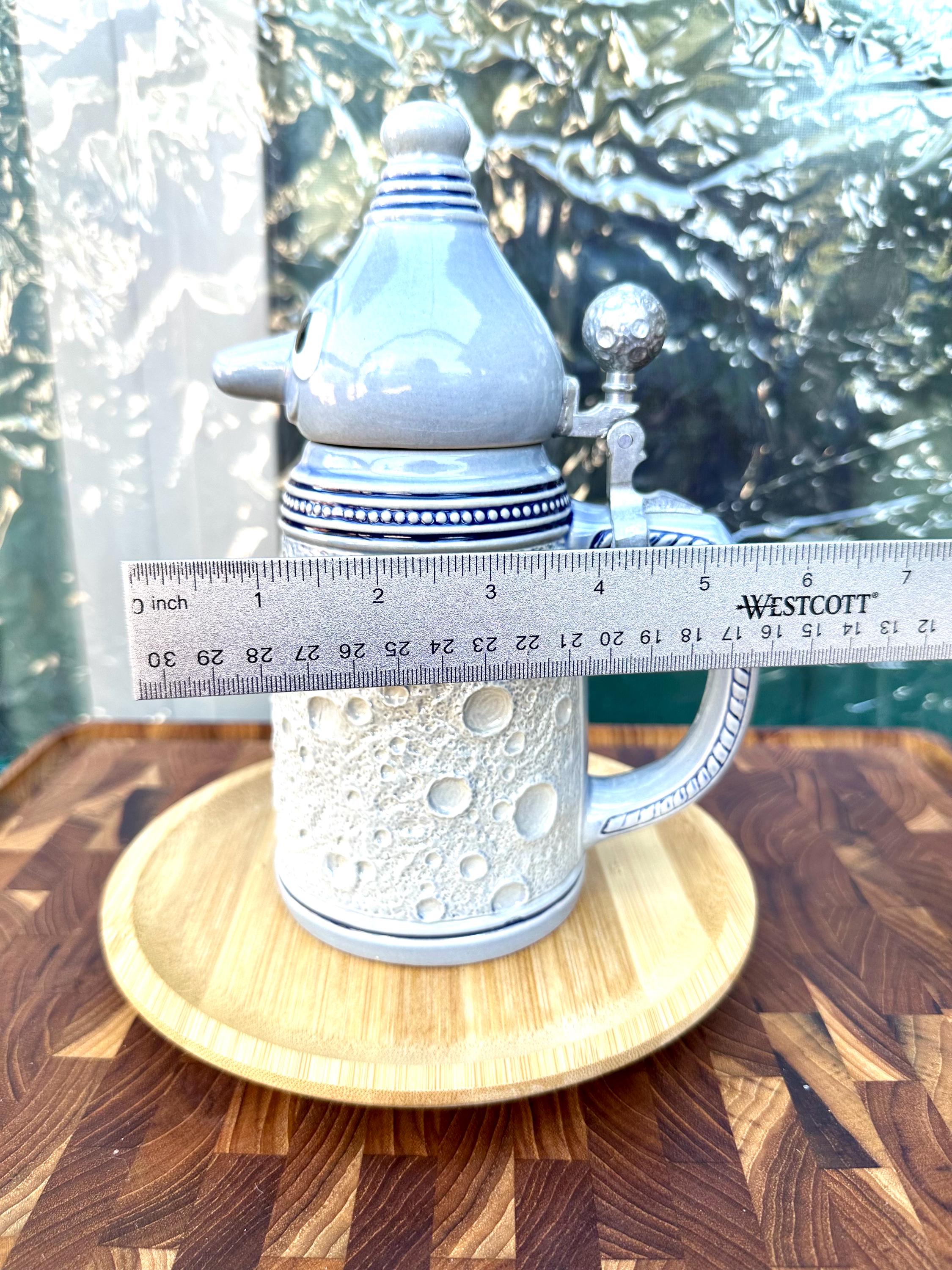 This is the "Moon Man", from the Schultz & Dooley Utica Club Beer Stein Family. This is a unique beer stein. The tumblift is shaped like the moon. The thumblift, strap, hinge and shank are in great working condition. The Moon Man does not have any crazing, cracks, chips, or blemishes. He does not have the silver antenna, however you can add a silver pipe cleaner I did not want to alter this mug in any way. The bottom of this stein reads: First Edition WEBCO Made in Germany for FX Matt Brewing Co. Utica NY This mug was made between 1993 and 1995. This mug is not microwave or dishwasher safe. This is a hand wash only item. Disclaimer The color maybe different due to the lighting or camera. Though we try to reduce and reuse, the cost of additional shipping materials are included in the price. We are not responsible for damages incurred during shipping. As always please contact us if you would like additional pictures or if you have any questions.