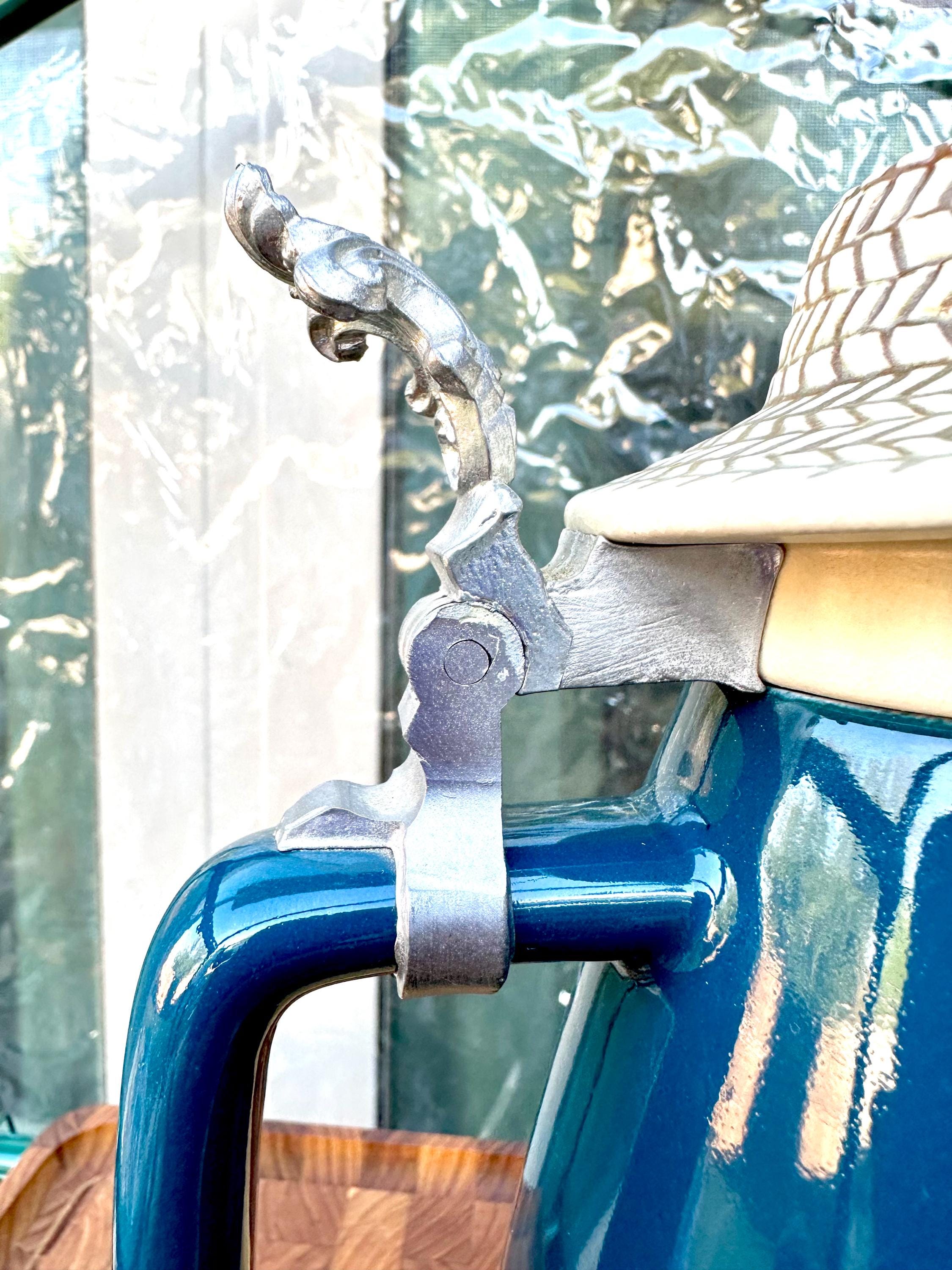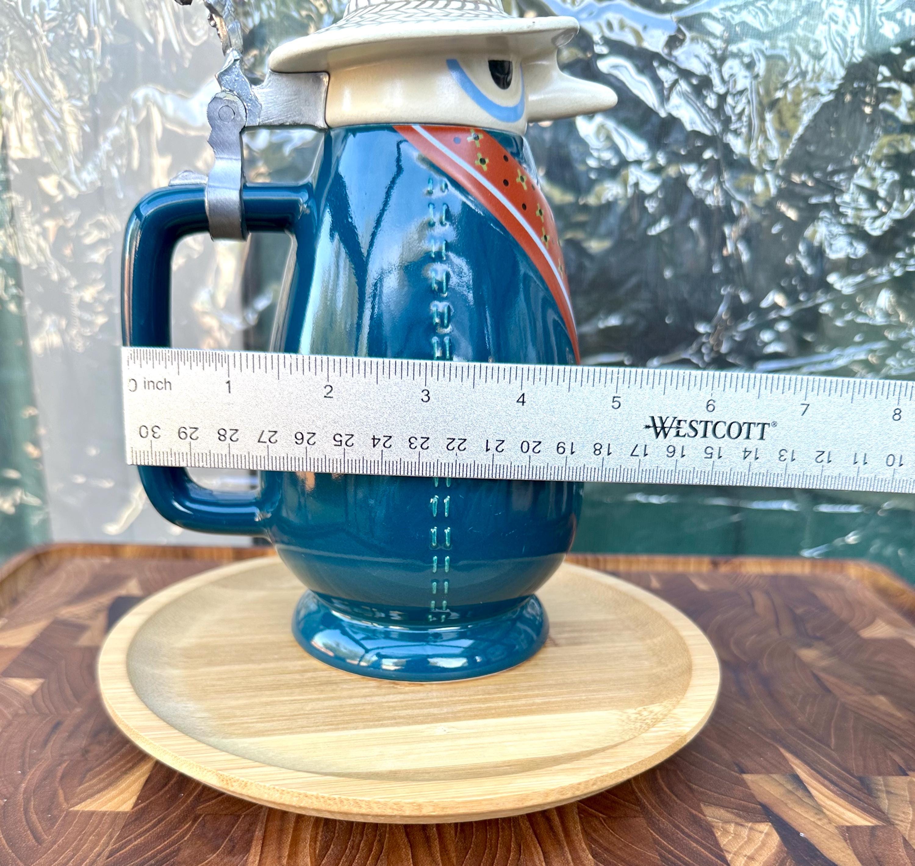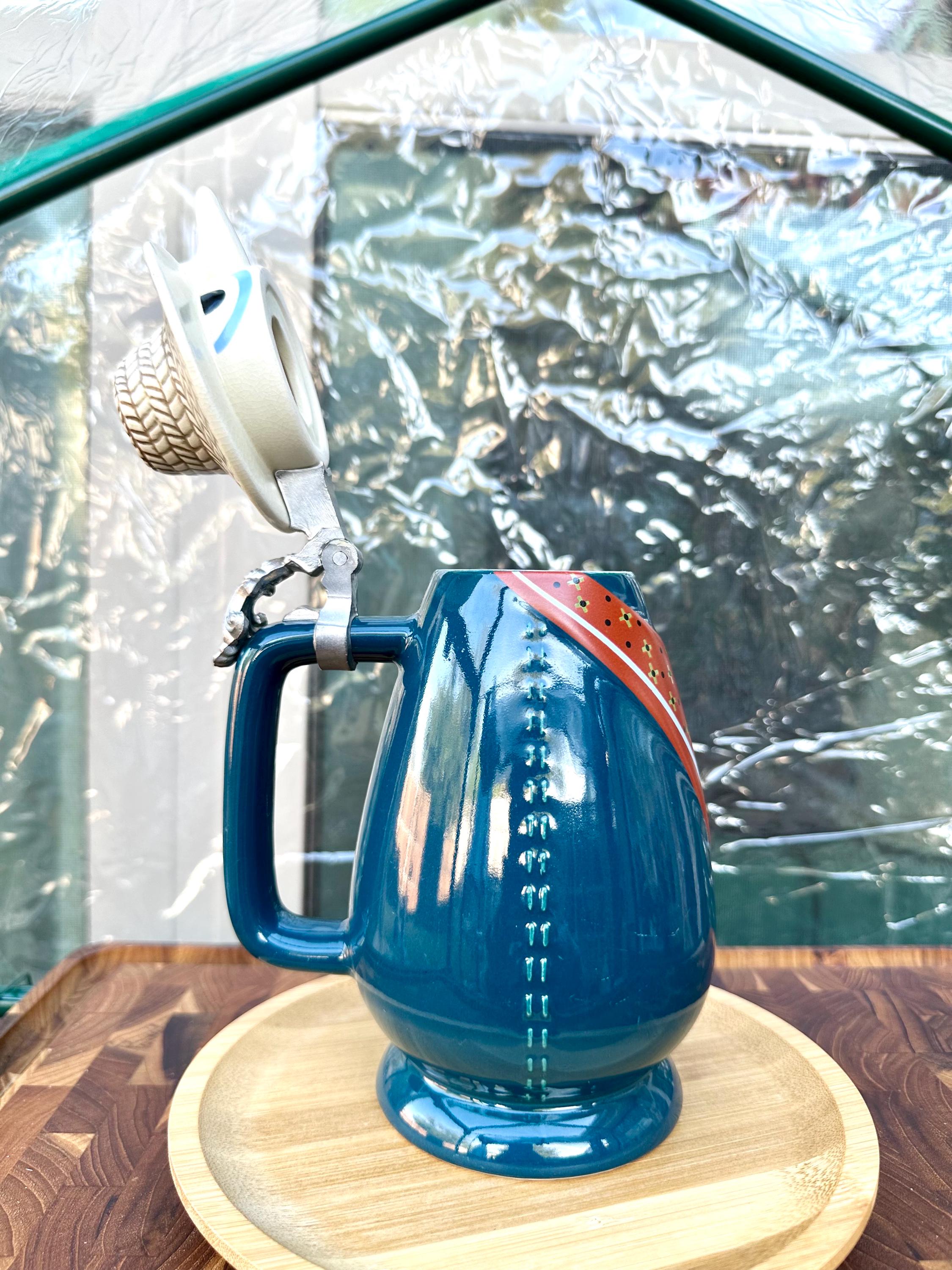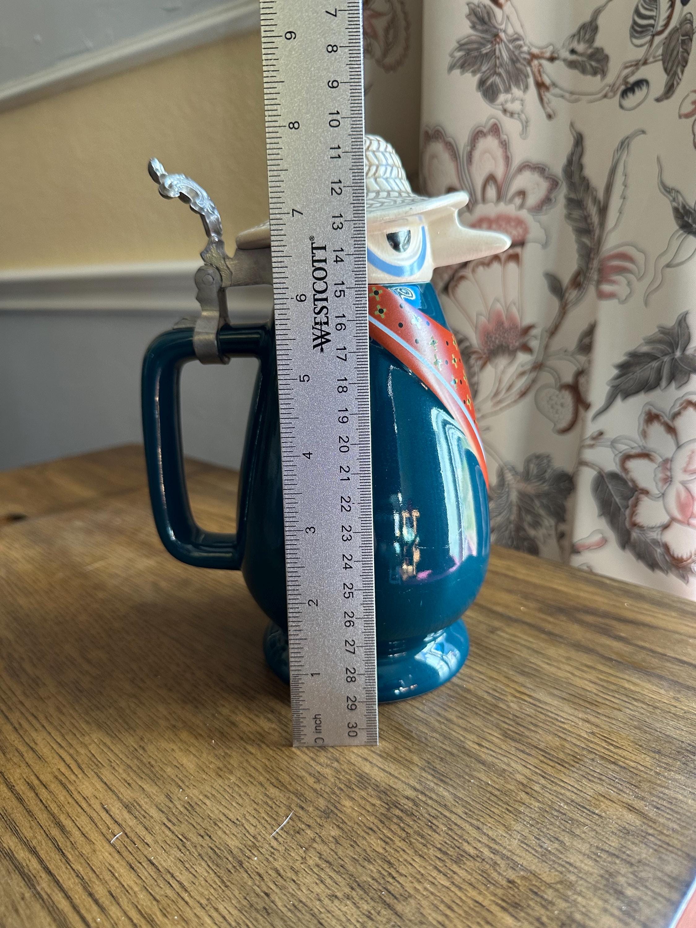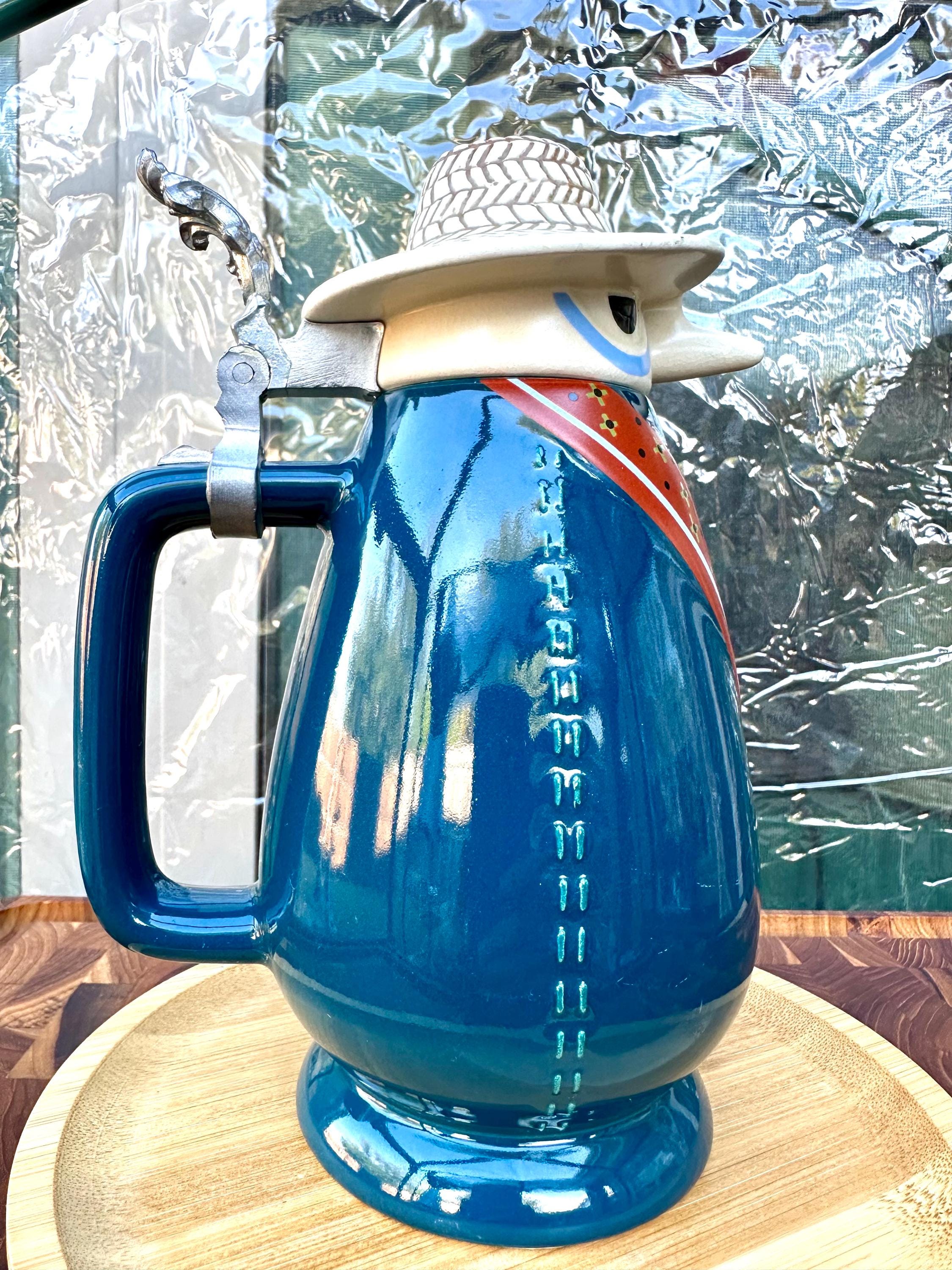 Beer Stein made by Schultz & Dooley named "Farmer Mugee". This stein was retired in 1999 and was first introduced 1982. He stands about 8 inches tall and is 4.5 inches wide. He is in great shape, there are no cracks, crazing or chips. There is a spot on his hat that does not have the full glossy shine. Also, a white line on his lower body and a red line on the bottom of the mug. There are pictures included. The bottom of the mug reads : WEBCO Made in Germany This was produced between 1986 to 1993. We do not recommend that this item get put in the microwave and dishwasher. Hand wash only.
