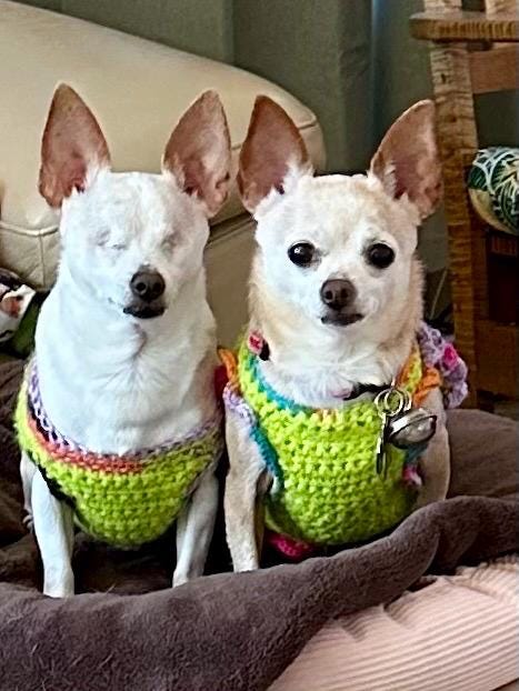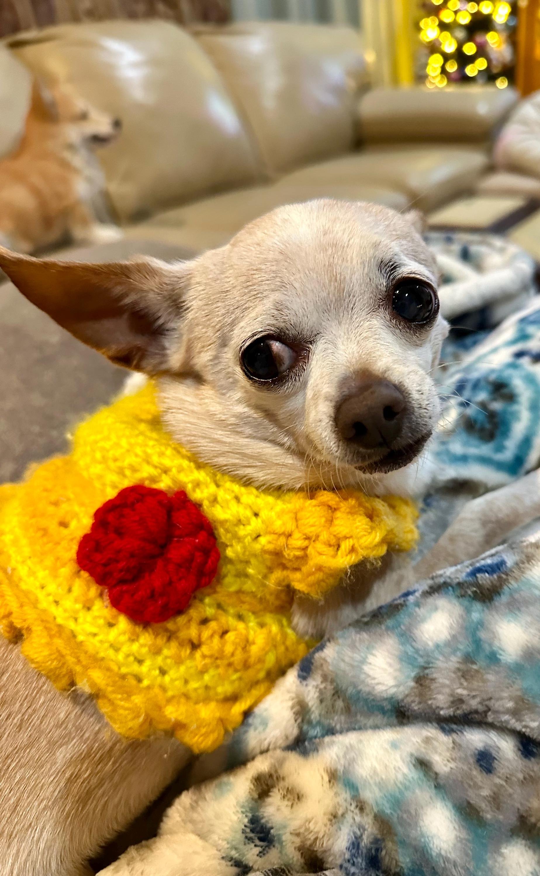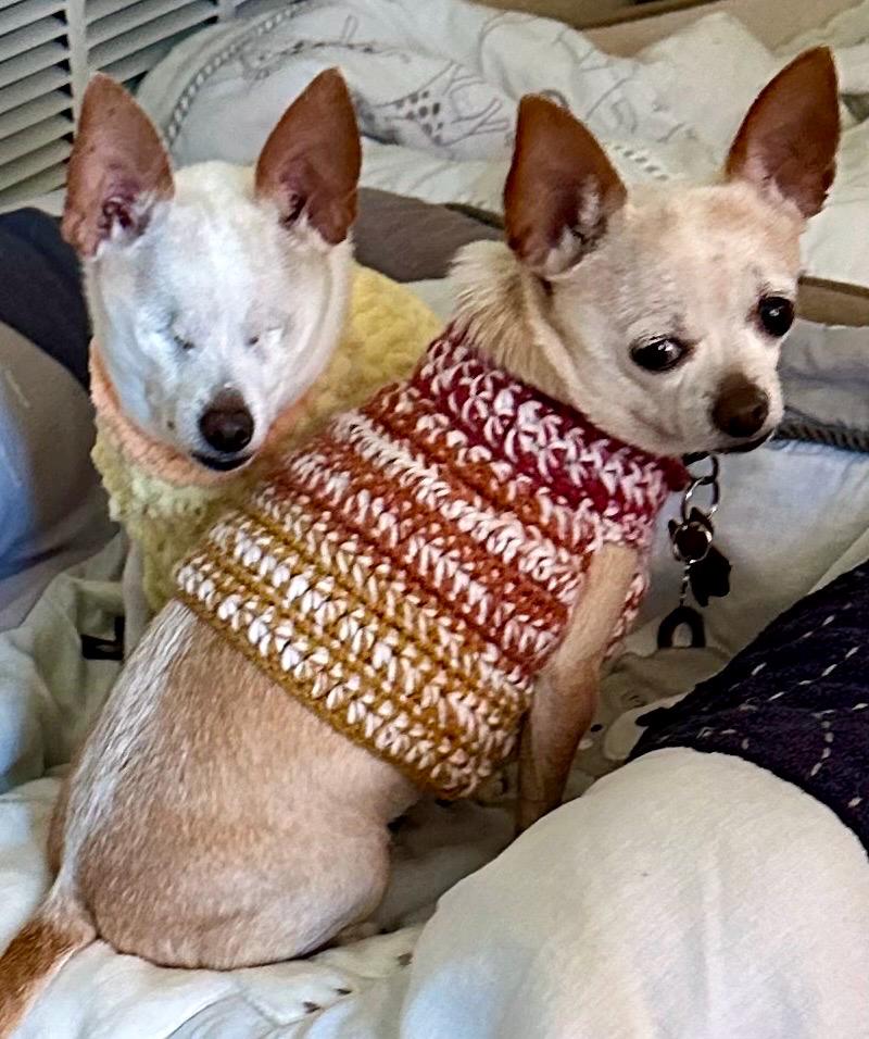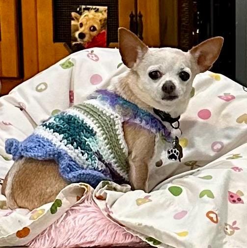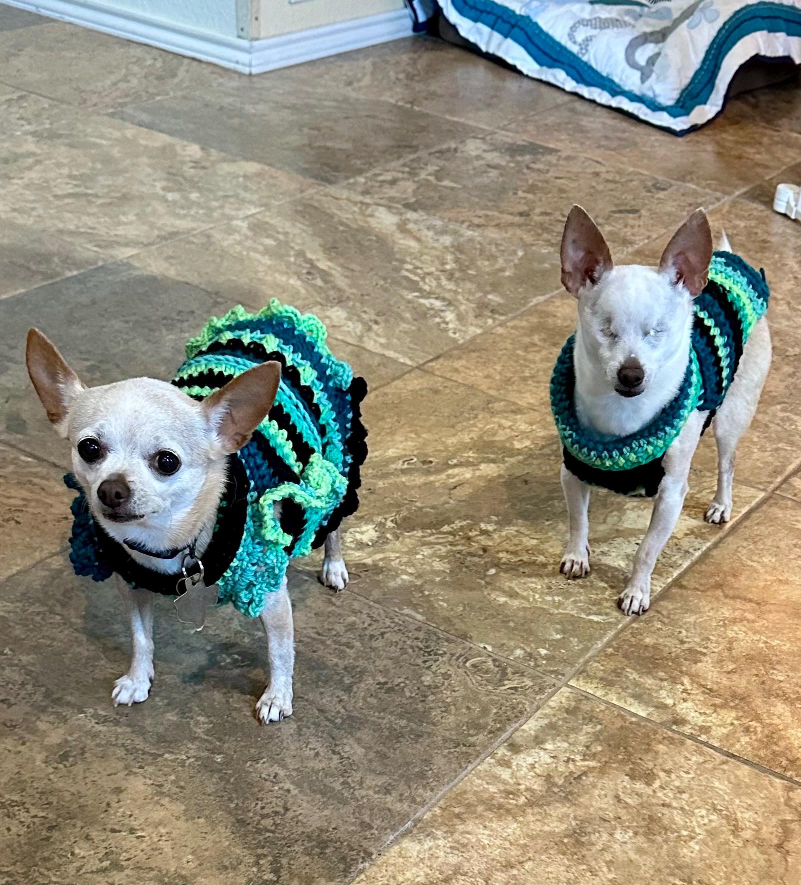 I also offer sweaters which range from $30-$45. See my note below regarding dog size and costs. These sweaters will also have the capped ruffled sleeves, your choice. You will choose the type of yarn: acrylic, wool, cotton and if you would like double or triple stranded yarn. These sweaters will have additional bling, such as sequins, and add ons like the basic sweater.