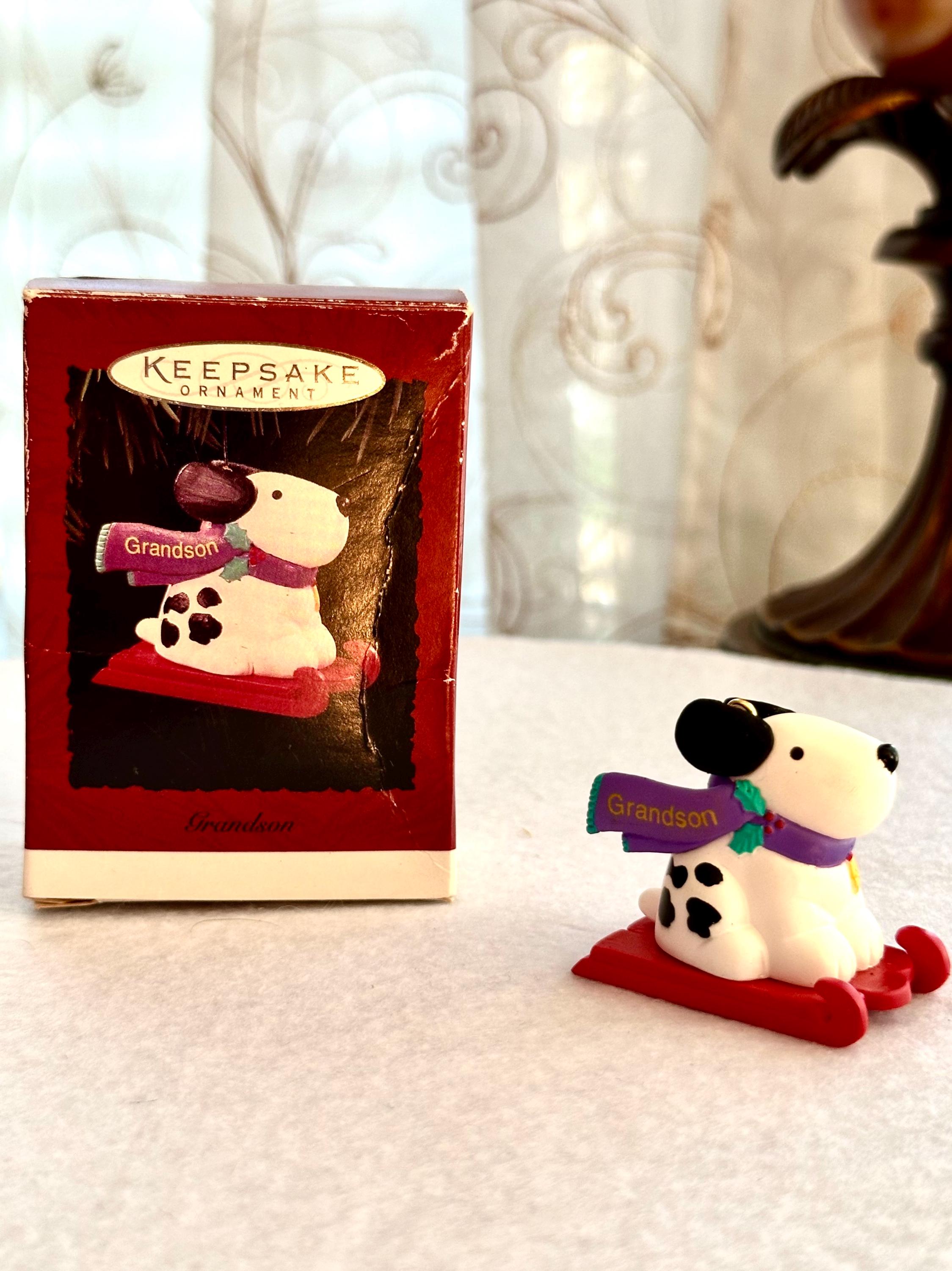 This is from the 1996 Hallmark Keepsake Ornament Collection named "Grandson". This is an adorable ornament of a dog on a sled with a purple scarf that has "Grandson" on it. This comes with the original box; there are no blemishes on this ornament.