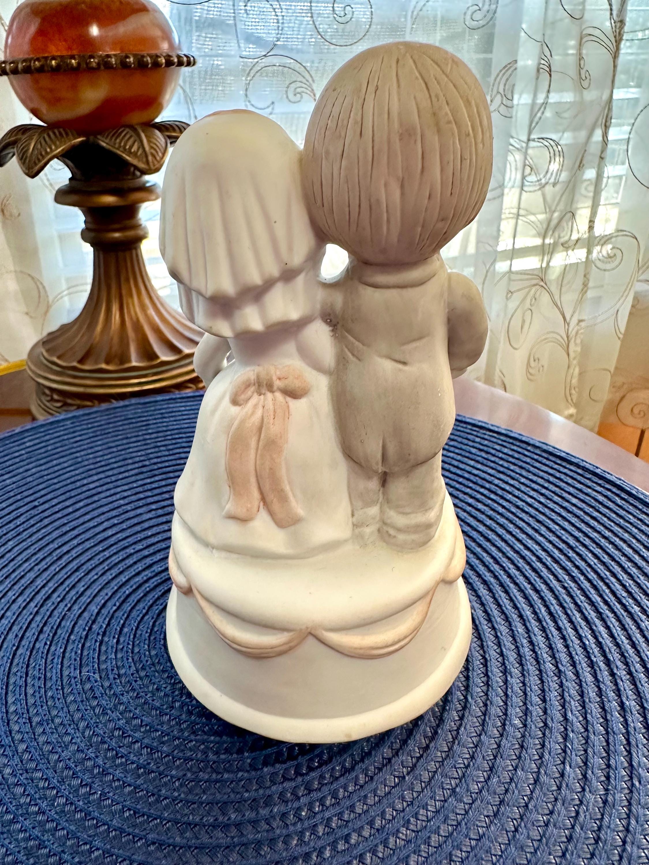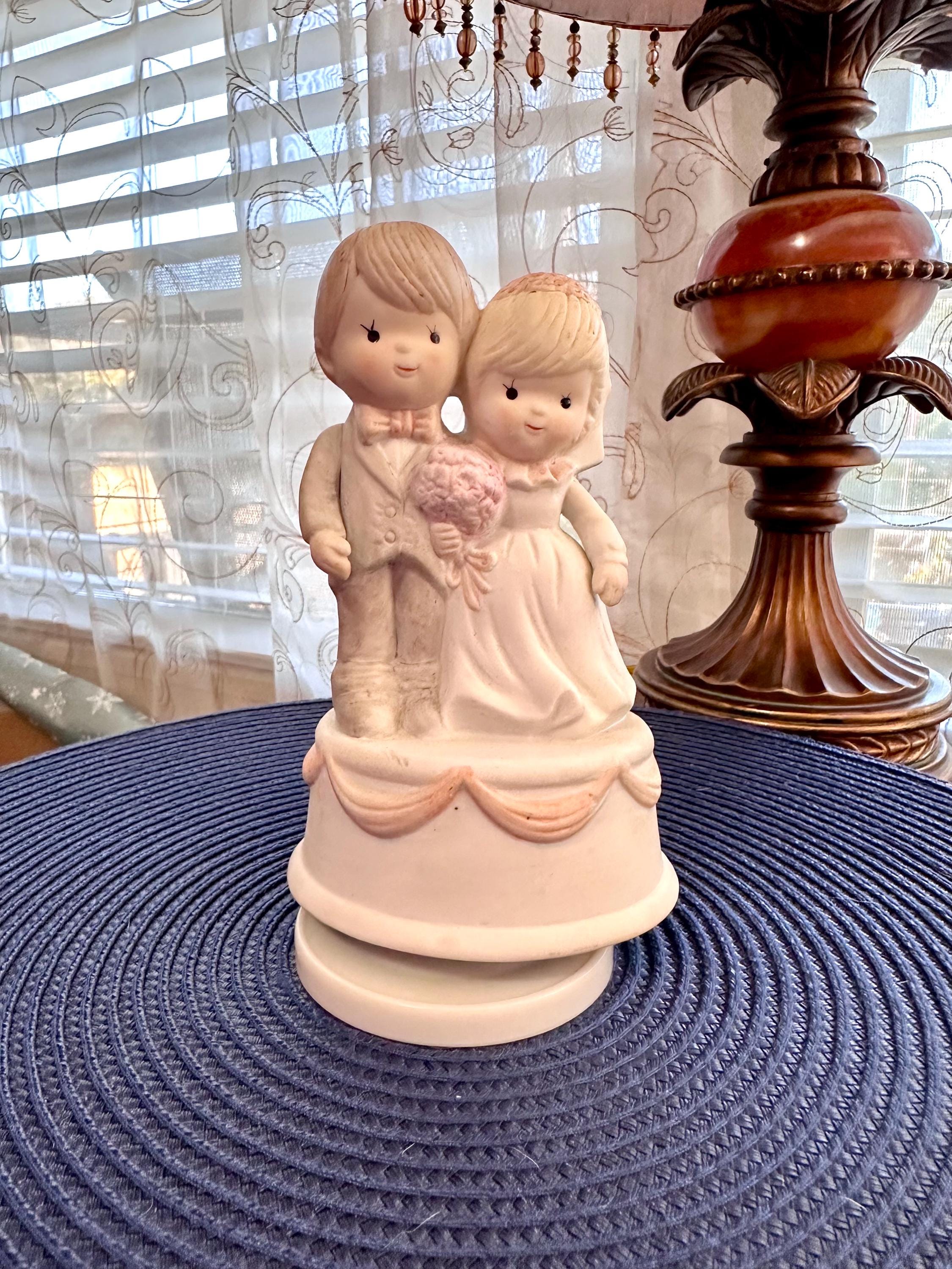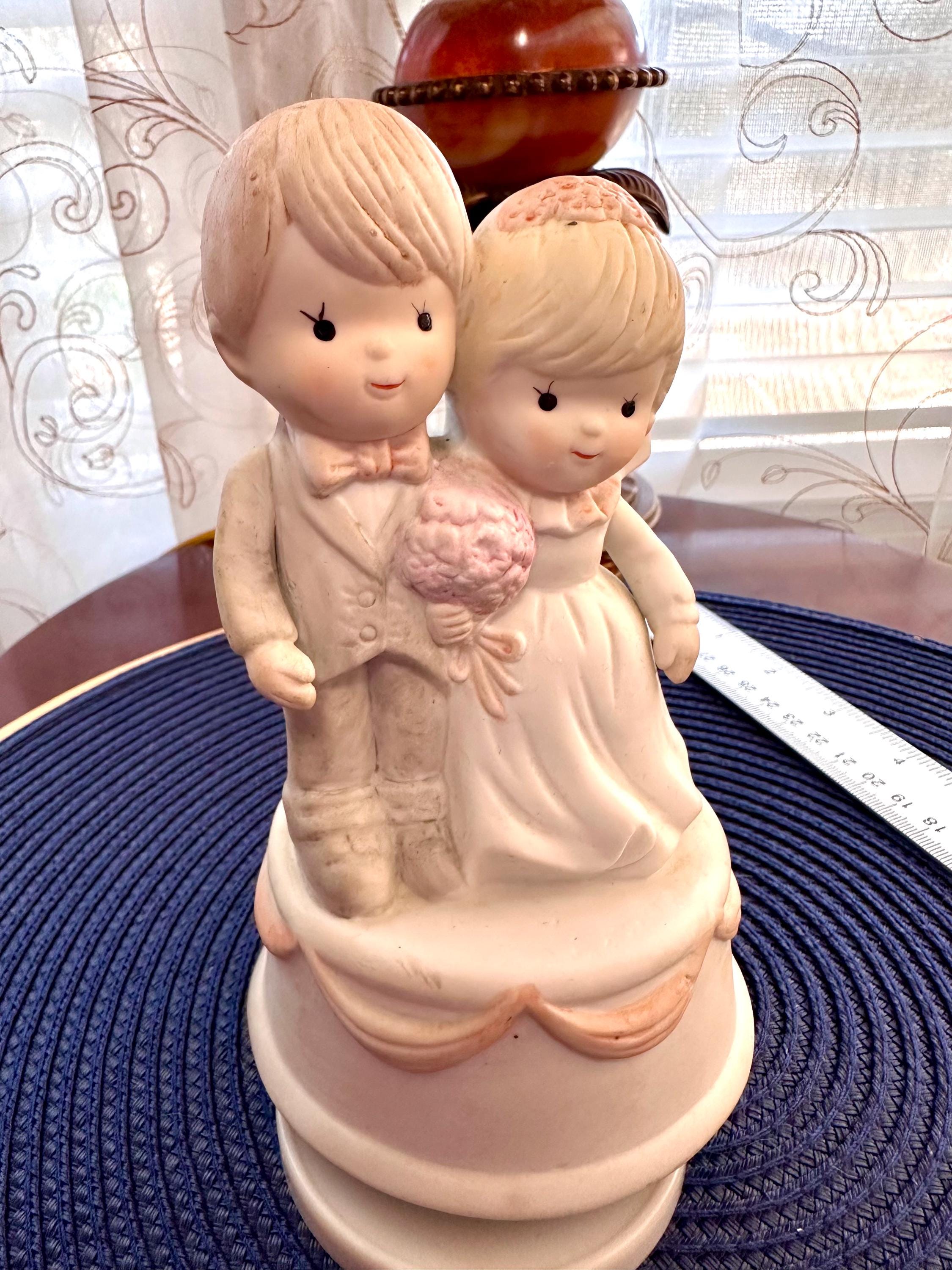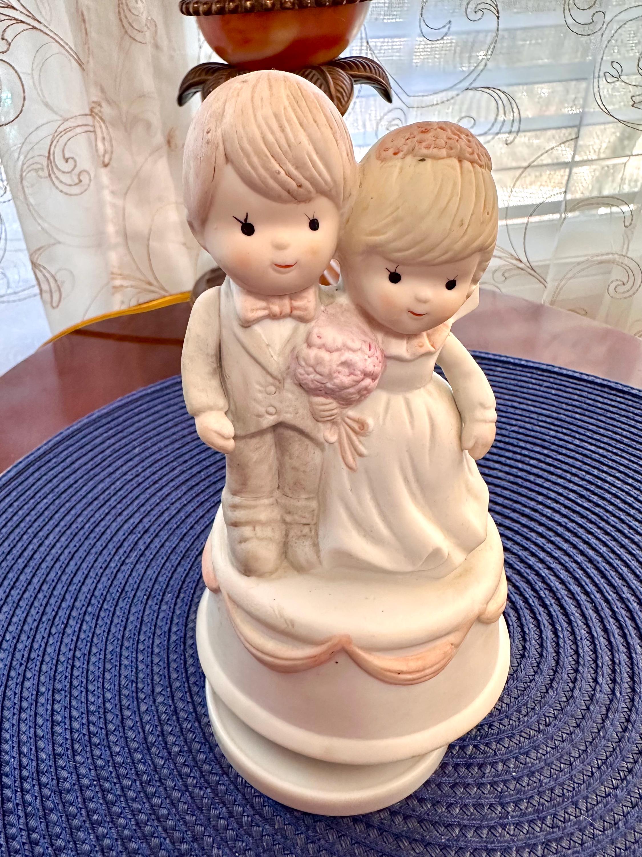 This is a Vintage Porcelain Husband and Wife Music Box. This is a working music box, I do not know the song but I am willing to send you video of this working. There are no cracks or chips. There is one spot on the groom's head, there is a picture included. Our inventory changes often so come back and visit.