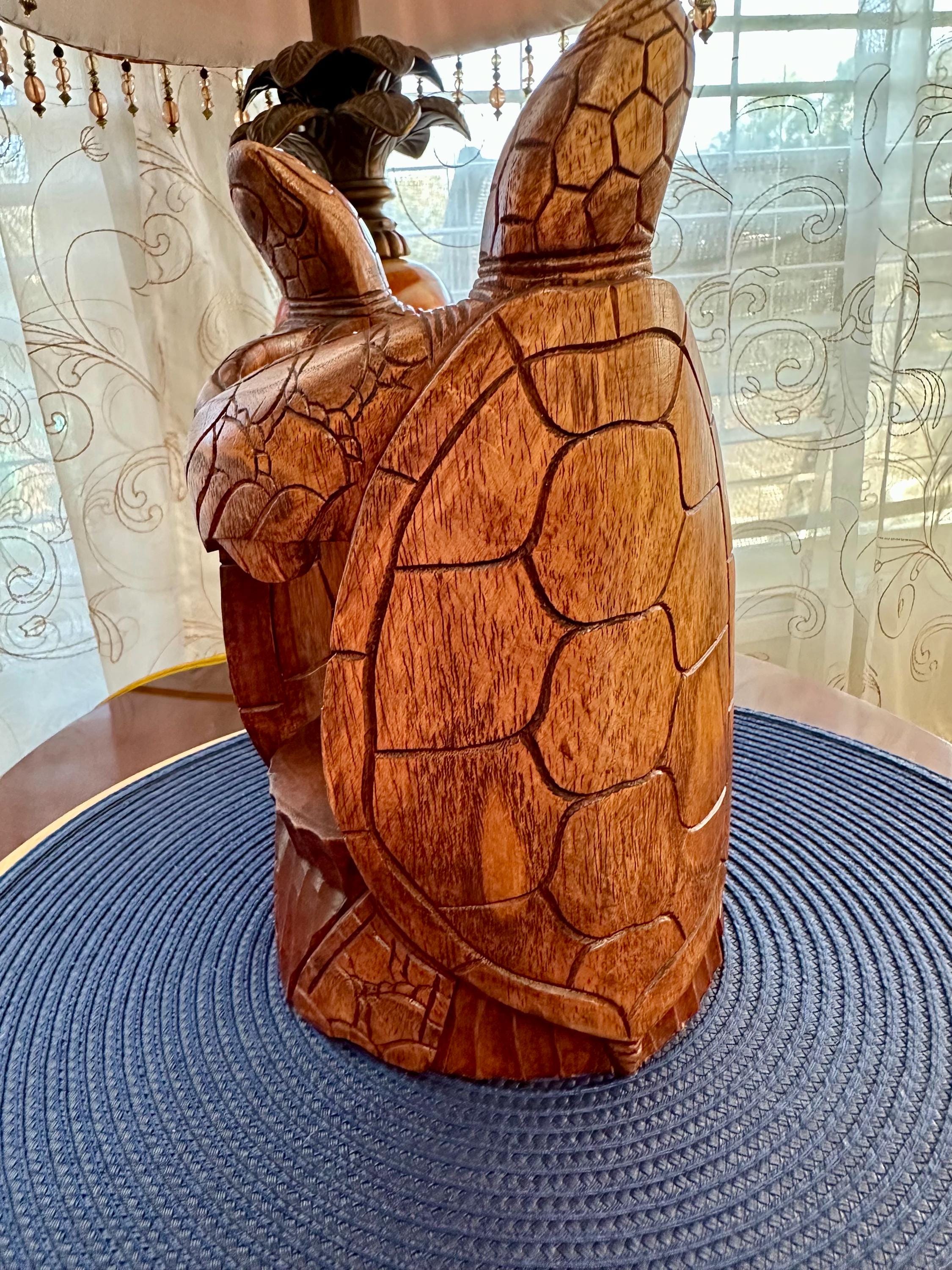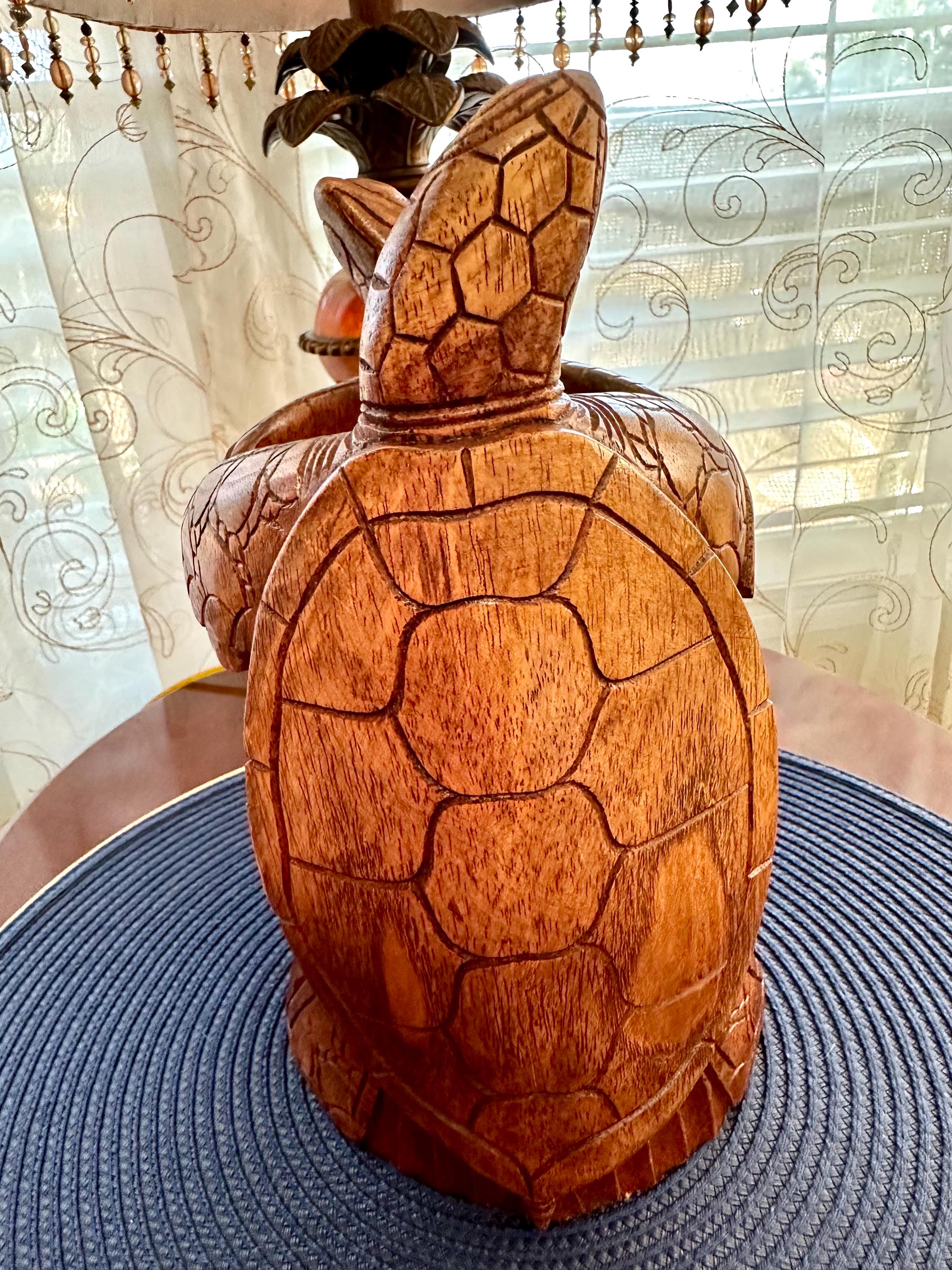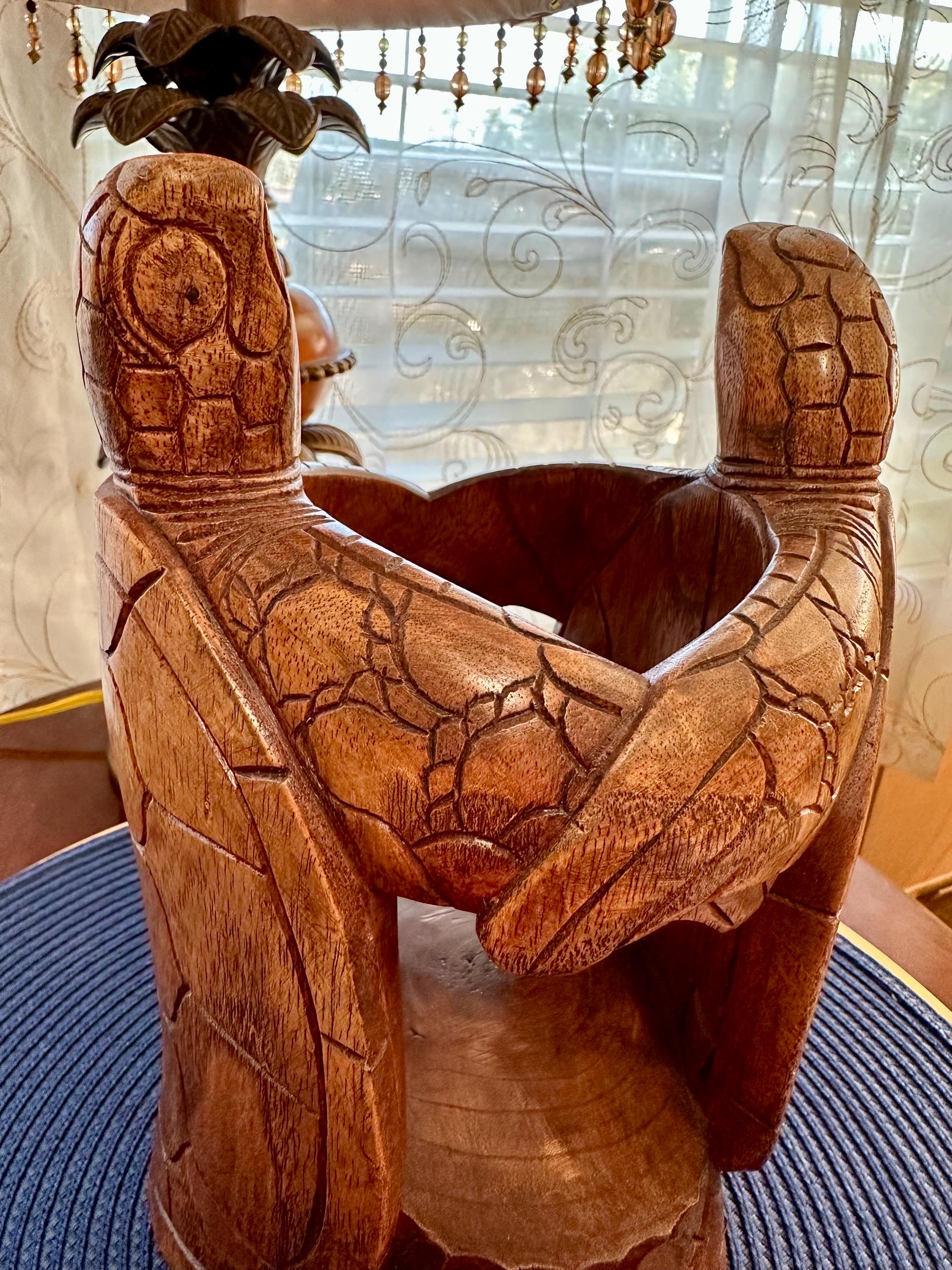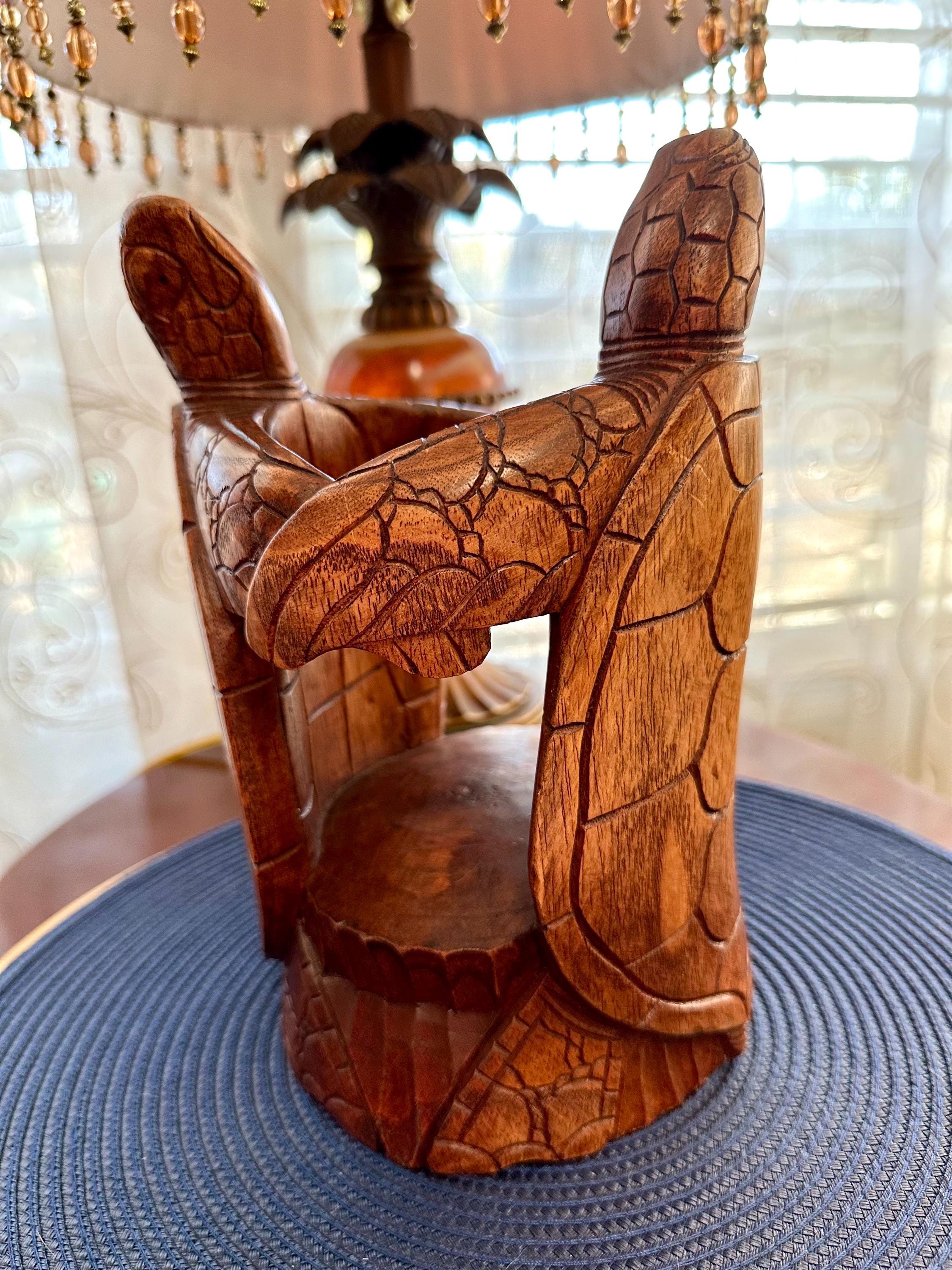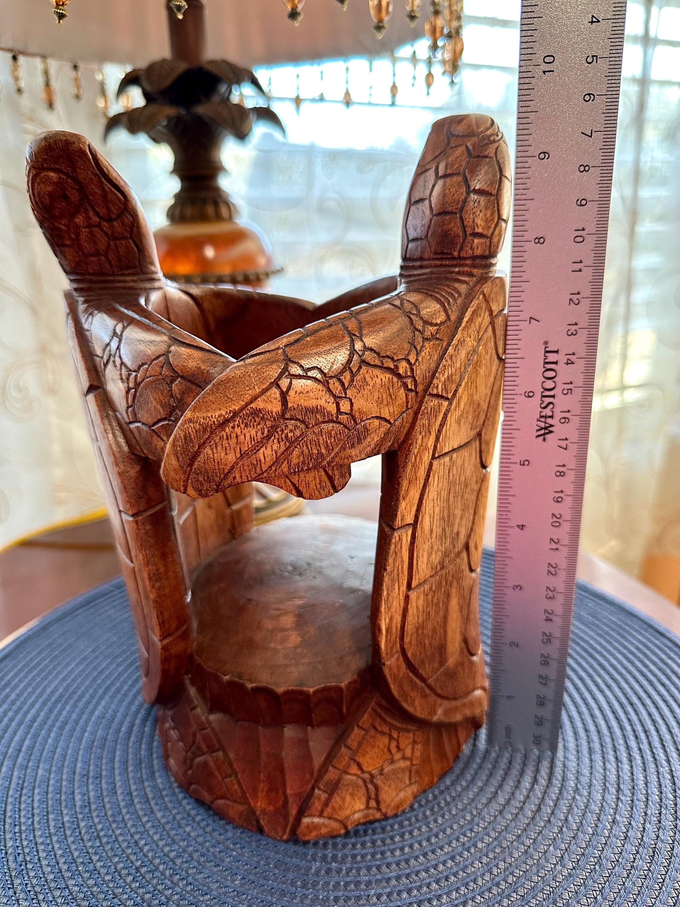 This is a hand carved wooden turtle bottle holder. This is definitely a rare find. This turtle stands at 9.5 inches tall and is 5.5 inches wide. There are no cracks in this bottle holder.