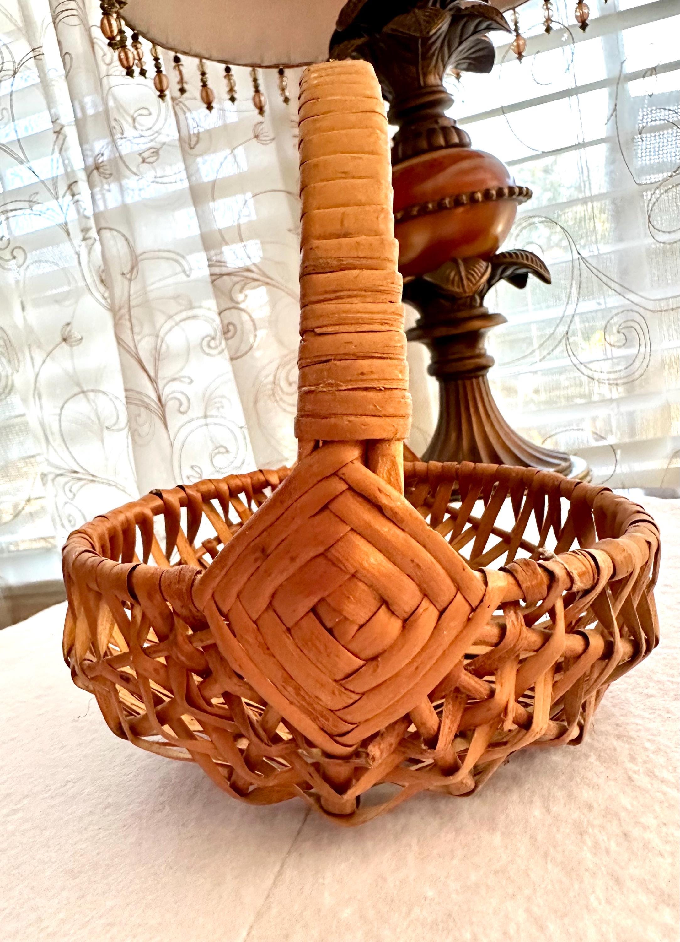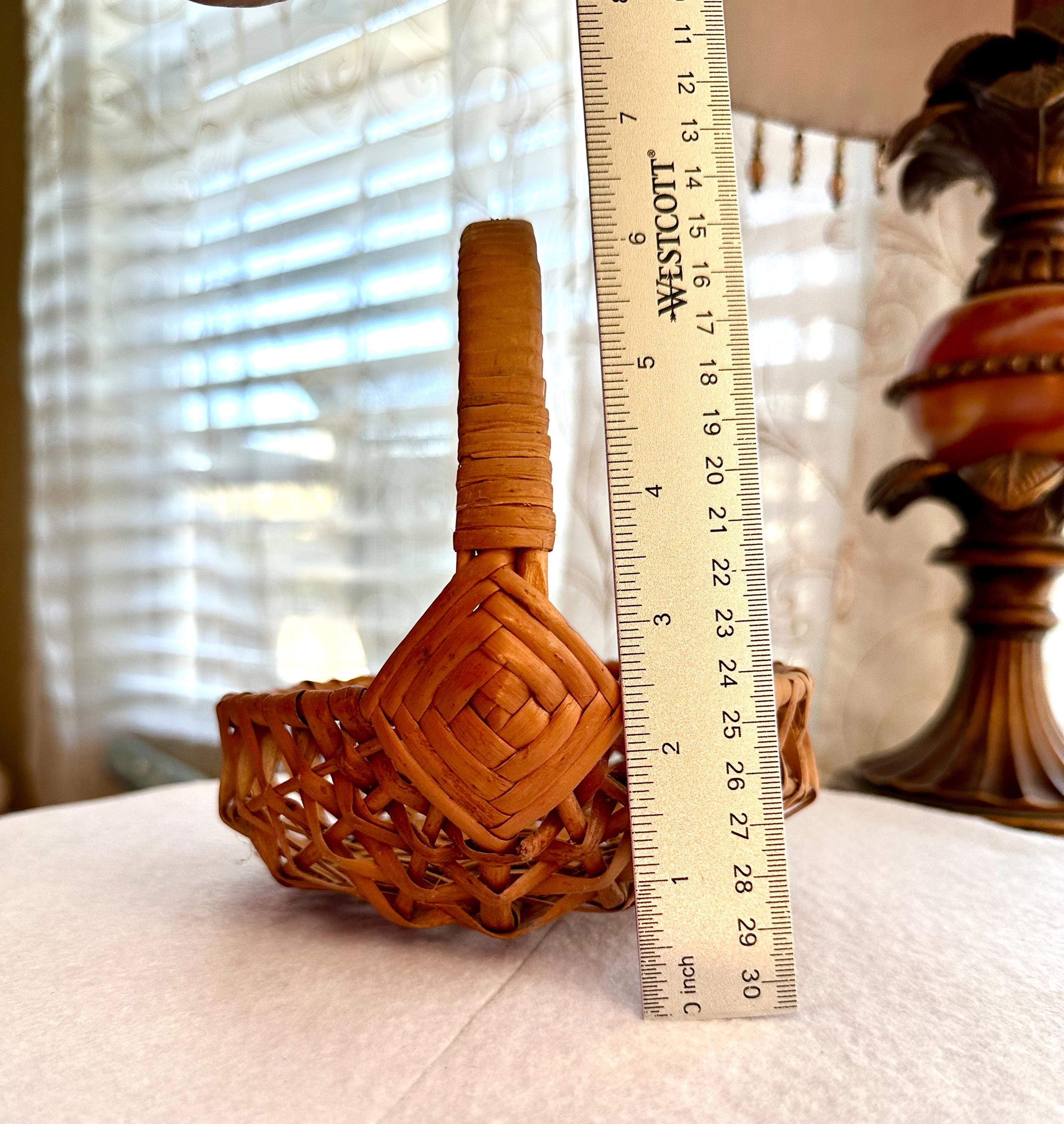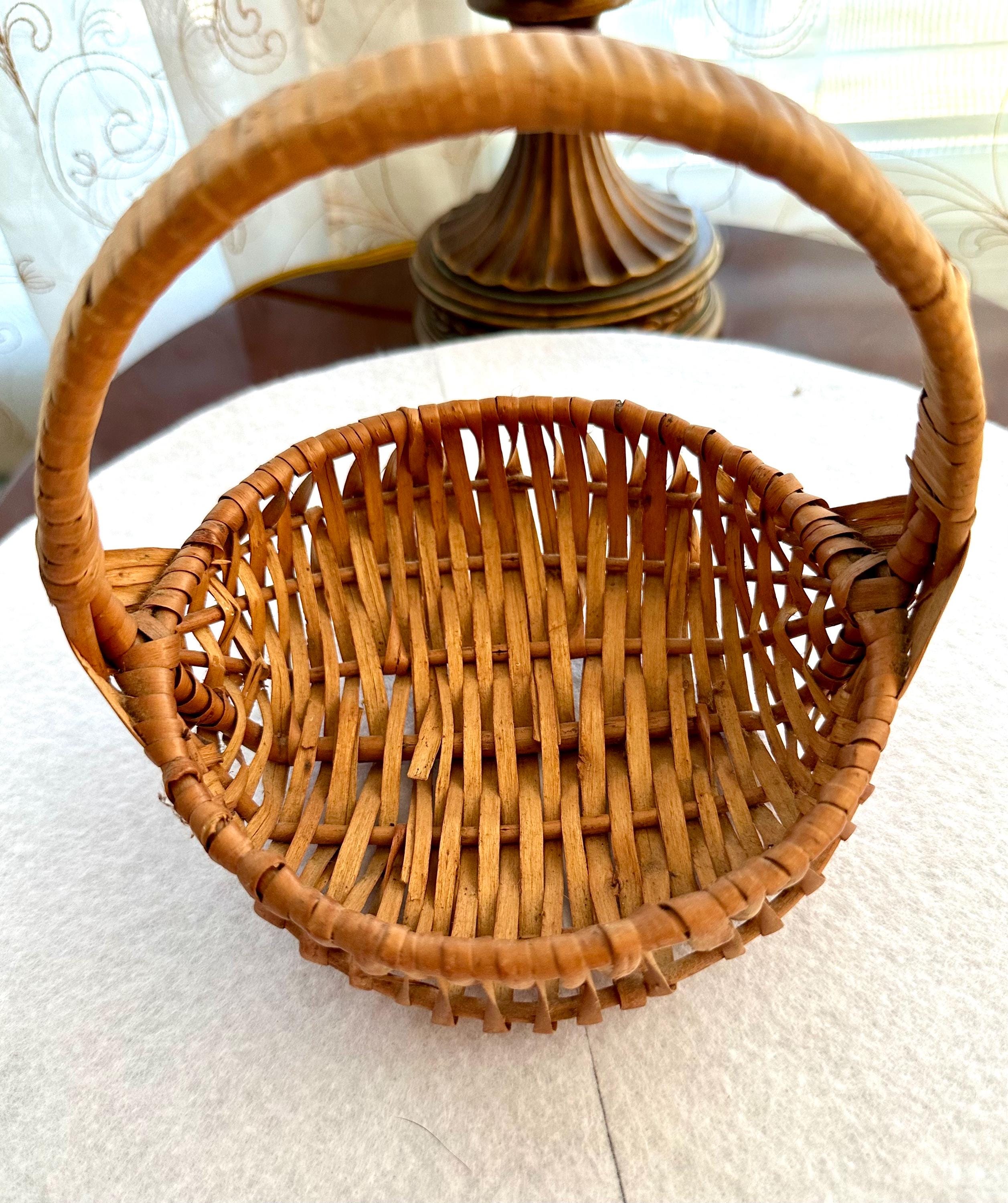 This is a small round rattan basket. This basket is not flat on the bottom. It is approximately 6.5 inches tall and 5.5 inches wide. This basket has a tight weave. This would be great for any of you home decor needs.