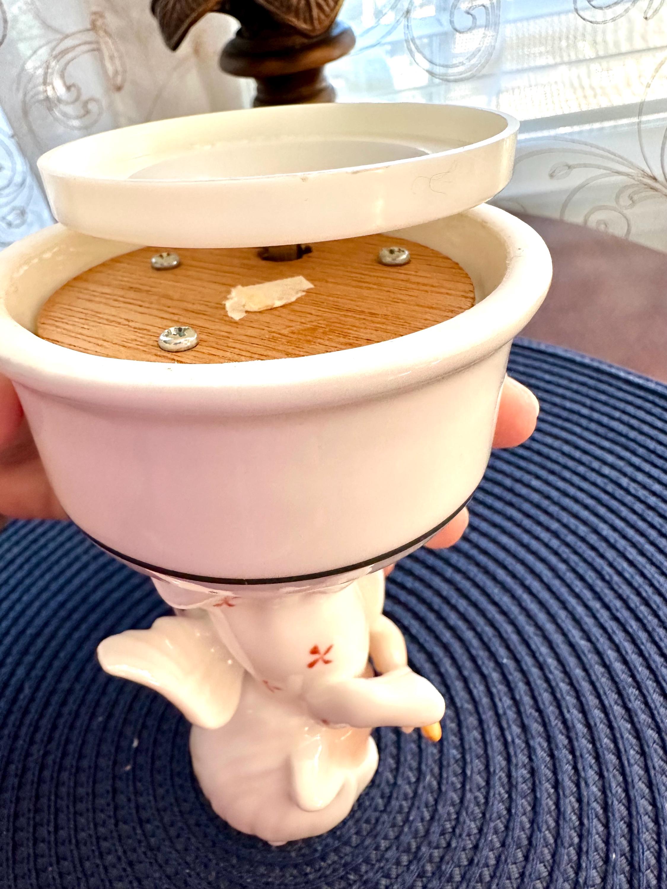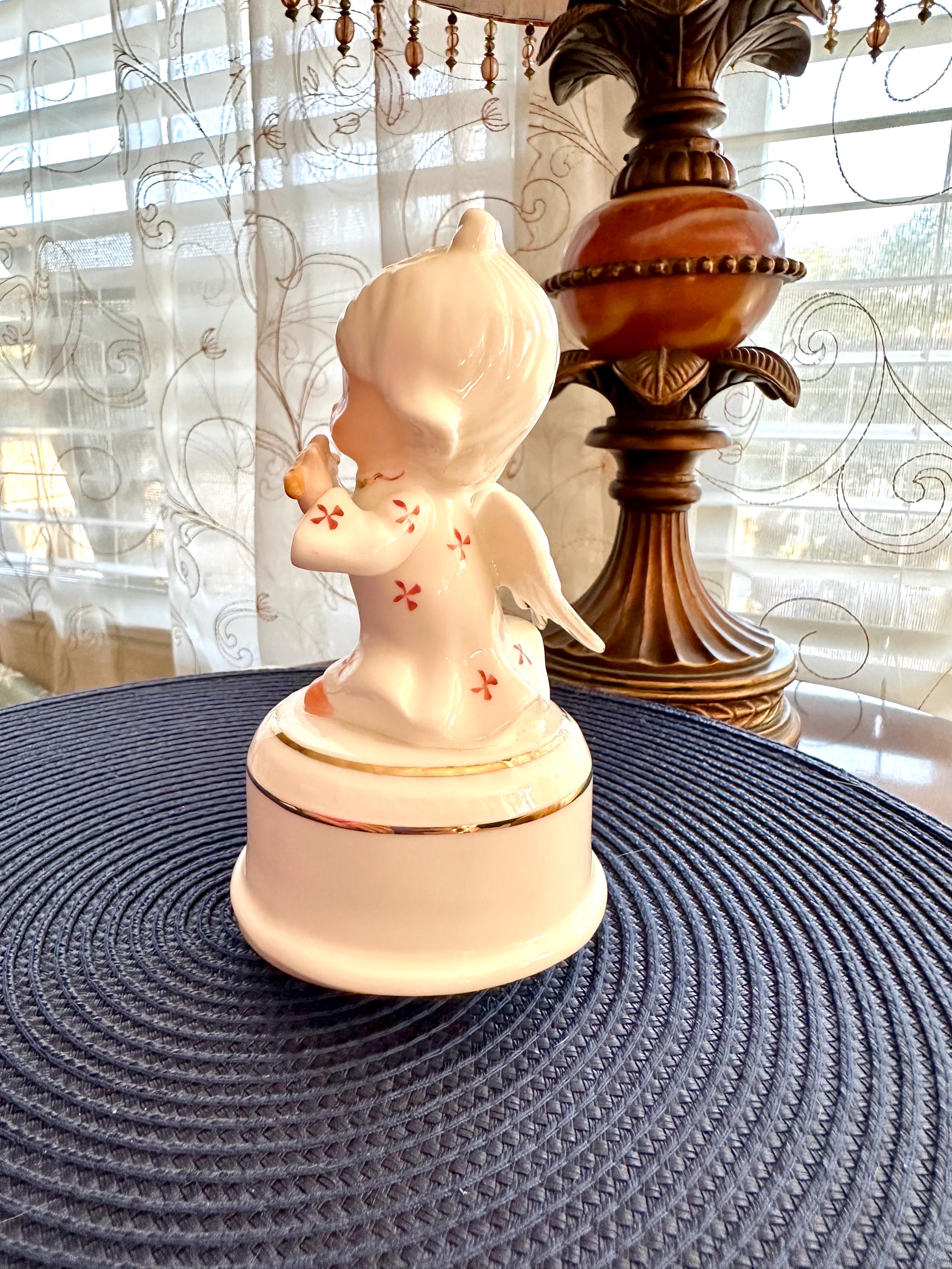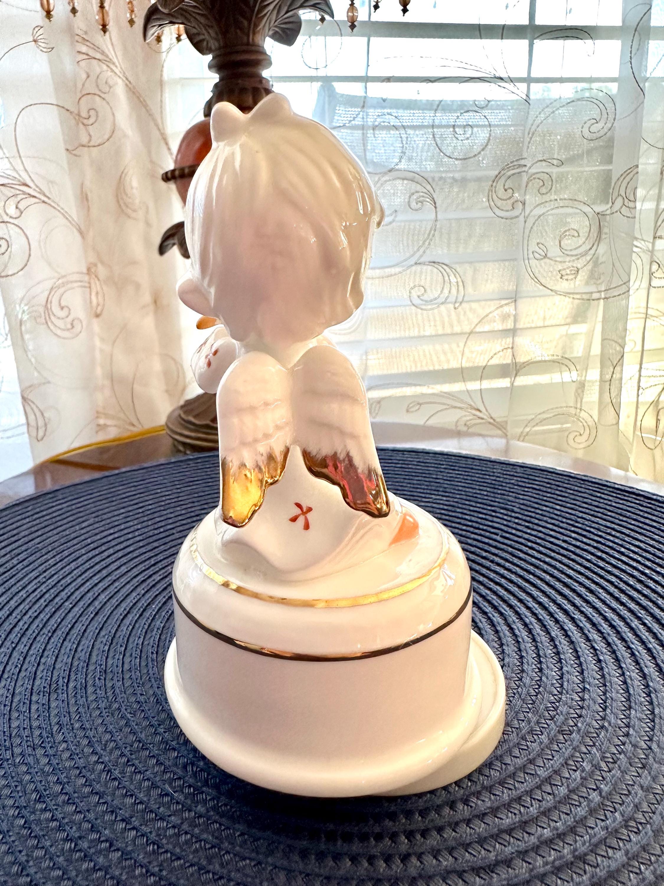 This is a beautiful Christmas angel with the flute music box. I am not familiar with the song she plays but the music box does work. She has delicate wings that are tipped in gold. There is a gold trim on the bottom of the statue. She does not come with the original box. However, we will send her to you with love and care. There are no chips, cracks, crazing or blemishes. Disclaimer The color maybe different due to the lighting or camera. Though we try to reduce and reuse, the cost of additional shipping materials are included in the price. We are not responsible for damages incurred during shipping. As always please contact us if you would like additional pictures or if you have any questions.