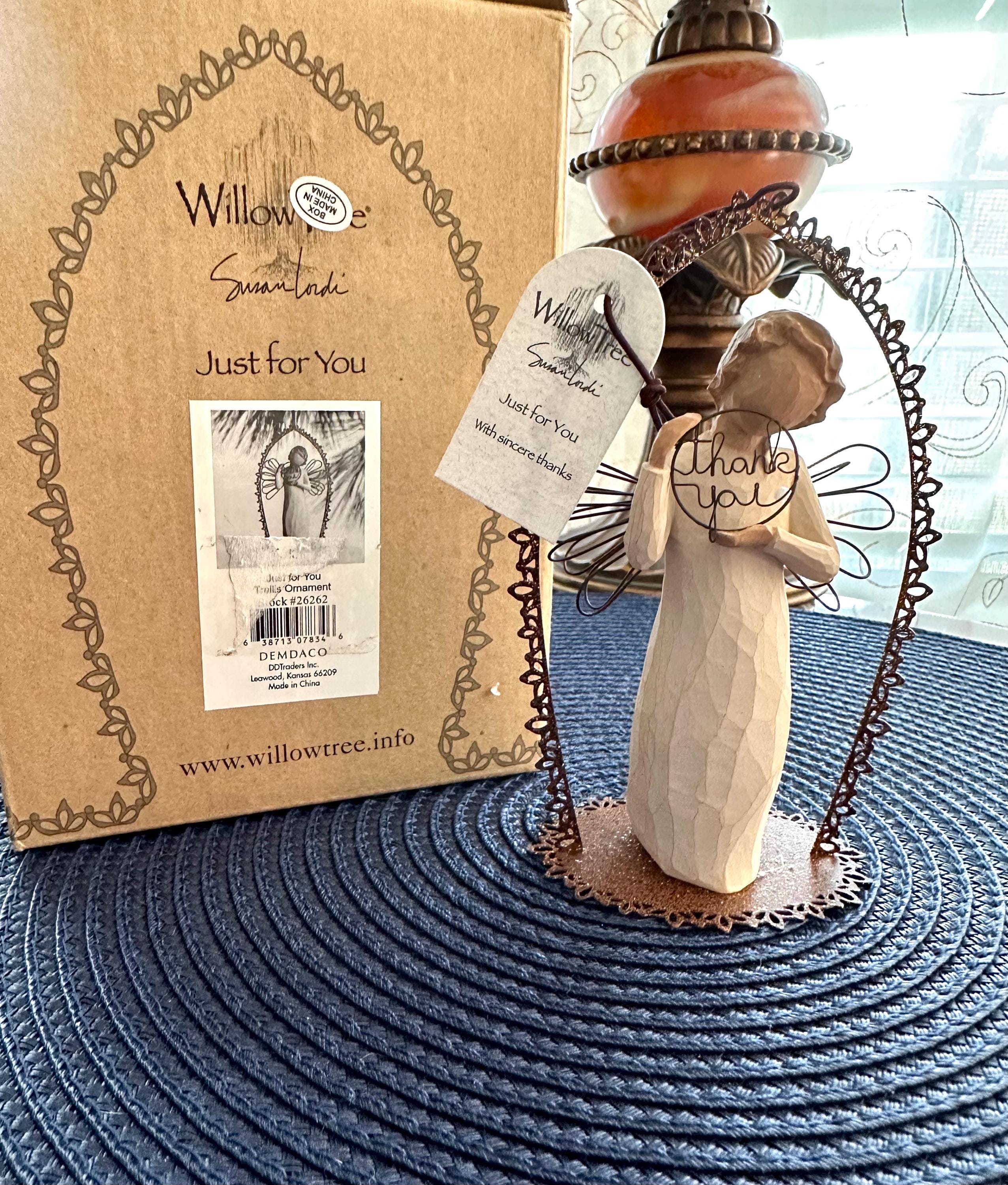The bottom of this says: Willow Tree Just for You DEMDACO 2010 Susan Lordi This angel is under a trellis holding a sign saying "Thank you". This is perfect for any collector, a teacher, an easy gift for a loved one, or for someone who loves angel decor.