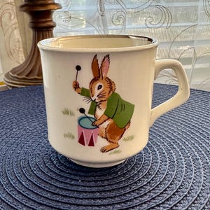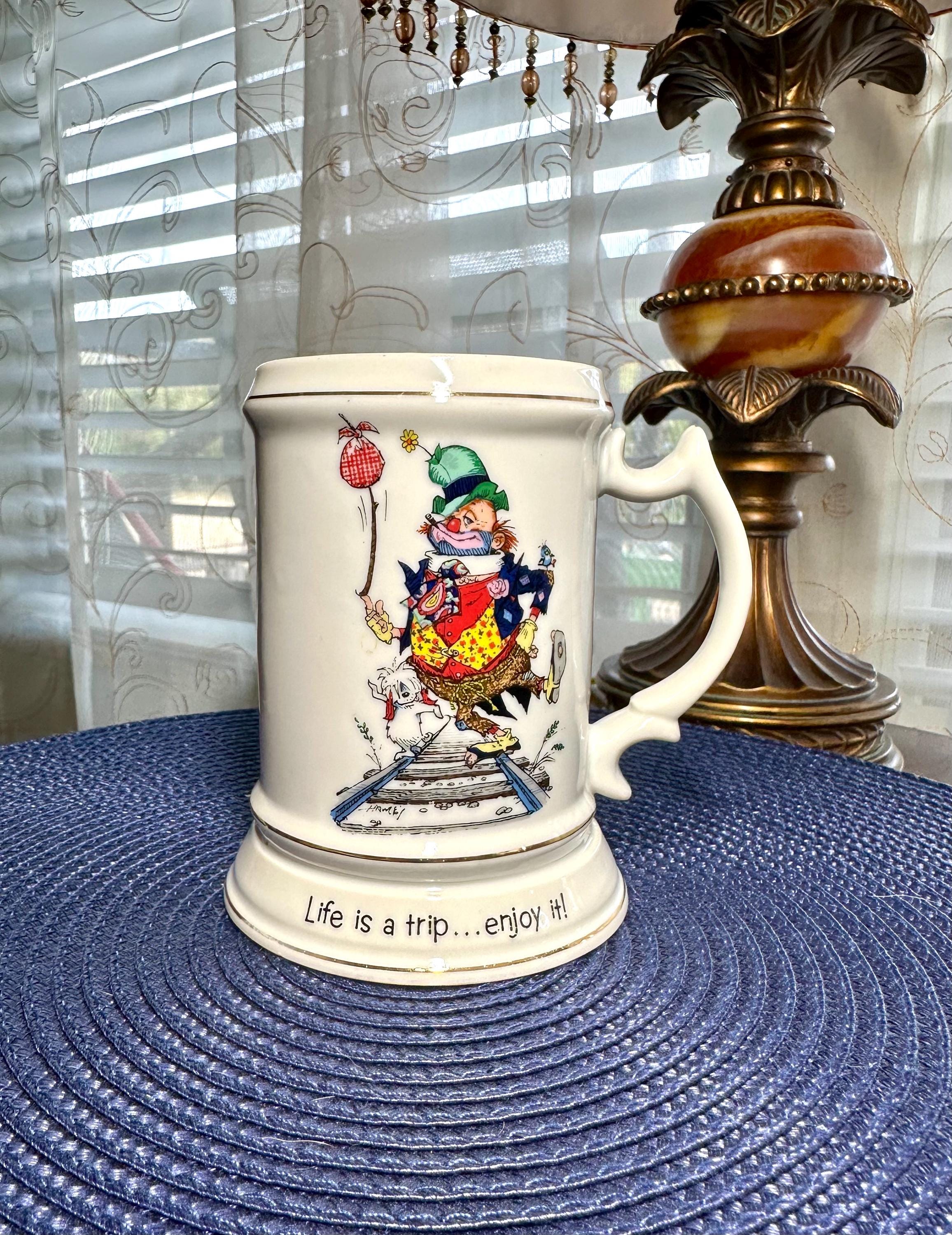 This is a vintage 1973 "Happy Hoboes" porcelain mug. This is a fun mug that was made in Japan by World Wide Art Inc. It is 5 inches tall and 5 inches wide, including the handle. There are no cracks or crazing. There are a few spots where the silver trim is faded, due to age. This mug is not dishwasher or microwave-safe.