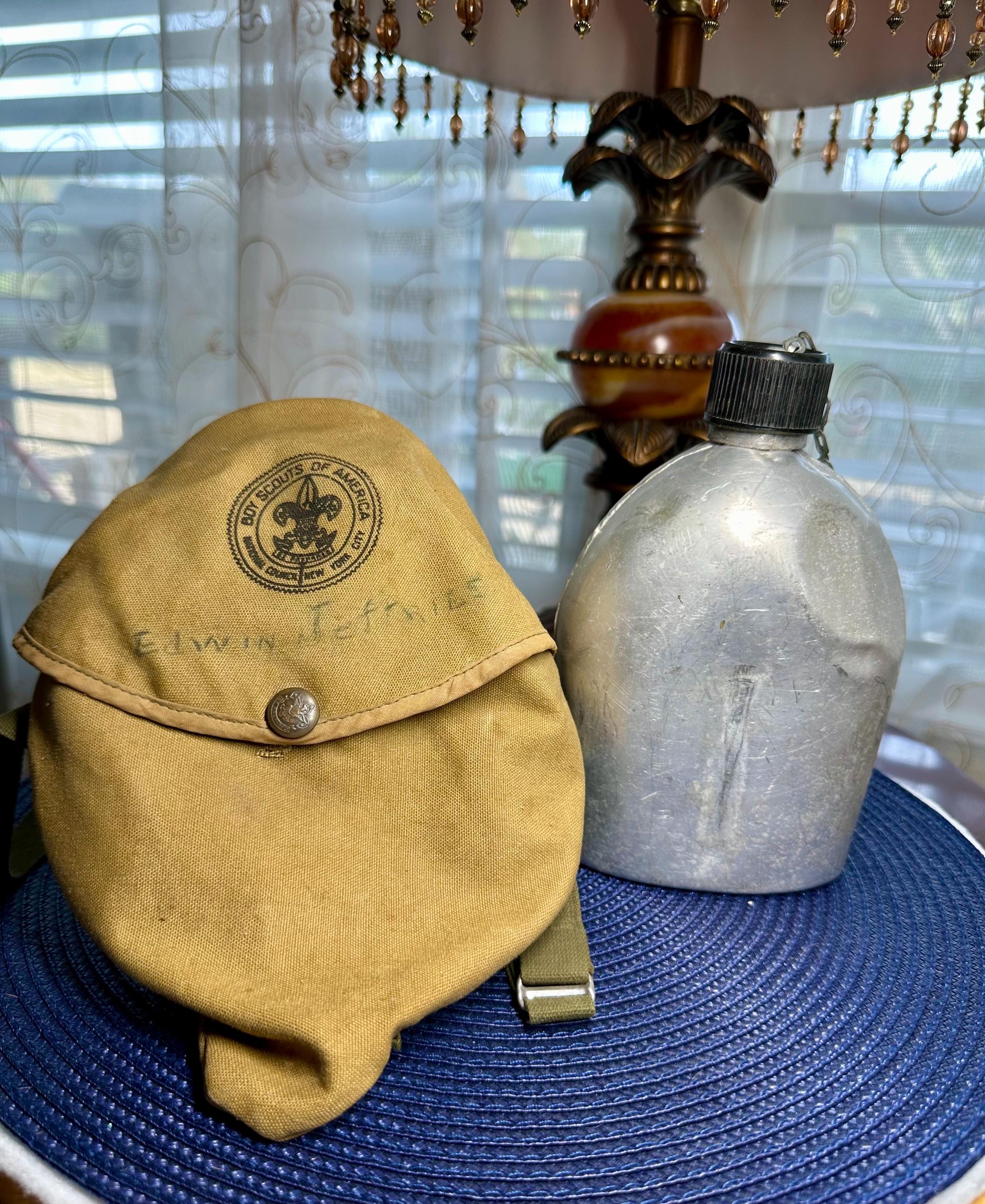 This is a 1960s vintage Boy Scouts of America canvas pouch with an aluminum canteen. If you are a collector of vintage camping gear, Boy Scout Memorabilia, or just want to take a walk down memory lane, this item is for you! This has been used and loved by "Edwin Jefferies" (his name is written on the front of the pouch. It appears that this item has been on many adventures over the years. The button no longer clasps; however, it is still attached. There are dents in the canteen, and the chain that attaches the lid to the canteen is no longer attached. The canvas does have some stains on it due to being on many adventures. There are pictures included, and the price does reflect the condition of this item.