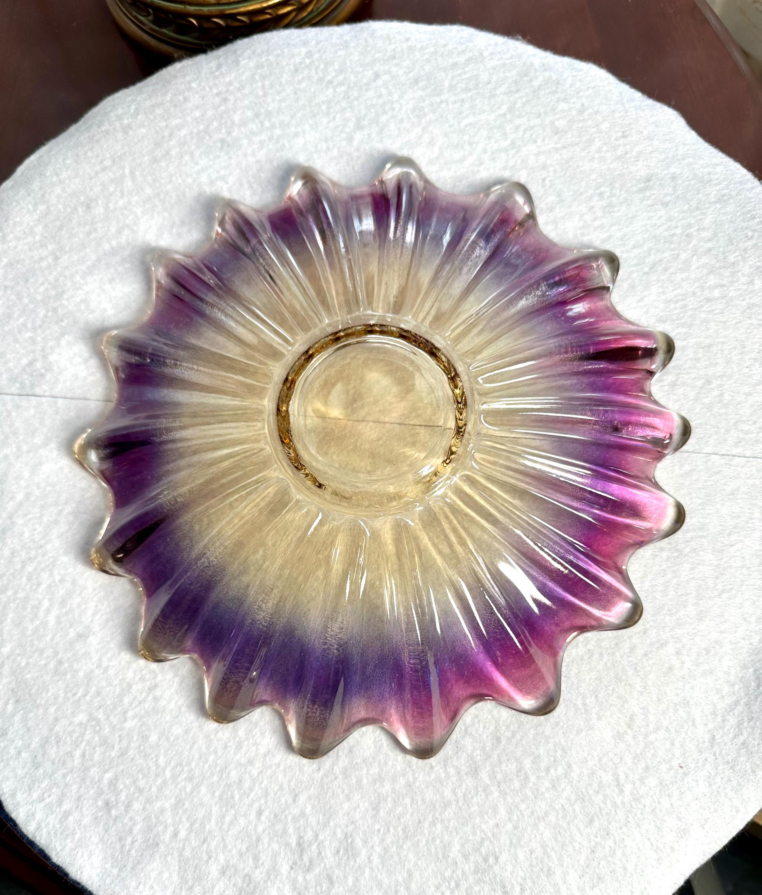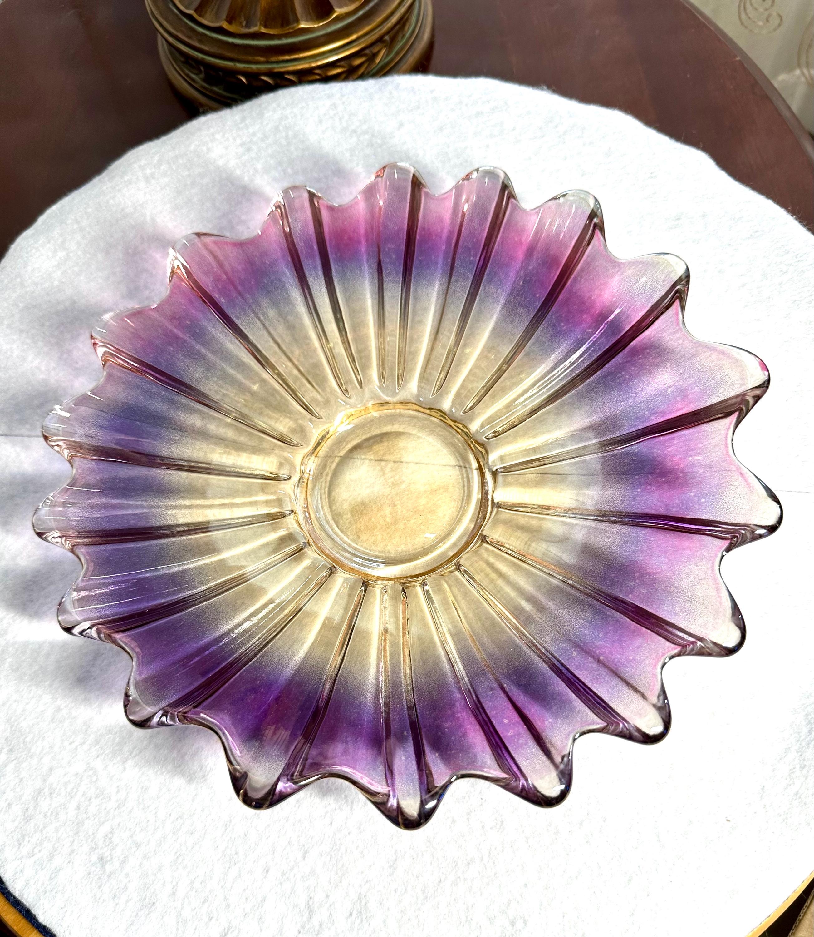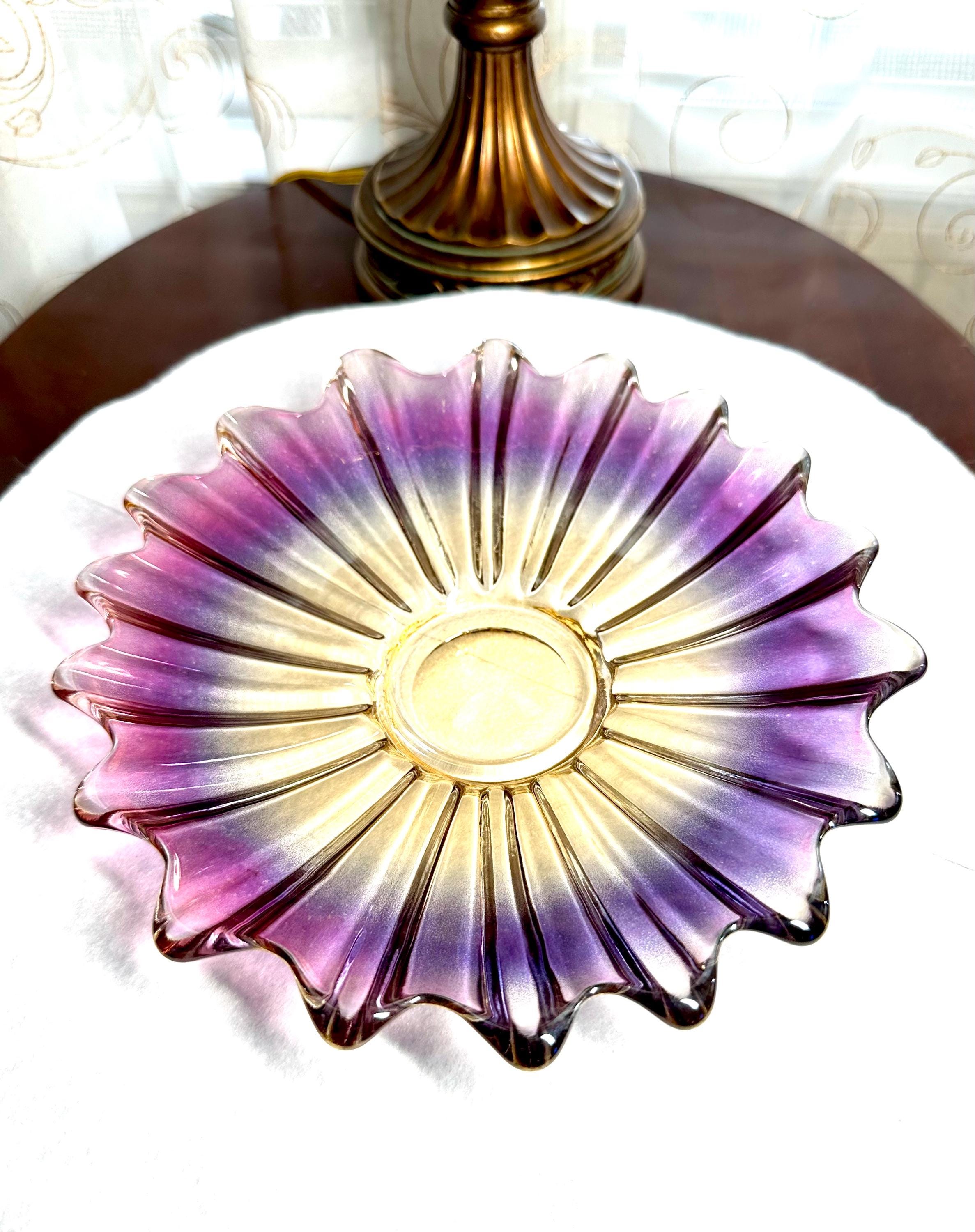 This is a gorgeous iridescent plate, the colors are shades of purple in a starburst pattern. This plate is 9 inches wide. There are no cracks, scratches, chips or faded areas on this plate. This plate is not microwave or dishwasher safe. You need to wash this plate by hand with mild soap or you will loose the sheen. We have other carnival and Indiana glass items in our shop. We add new items weekly so please come back and visit. Disclaimer: The color maybe different due to the lighting or camera. Though we try to reduce and reuse, the cost of additional shipping materials are included in the price. We are not responsible for damages incurred during shipping. As always please contact us if you would like additional pictures or if you have any questions.