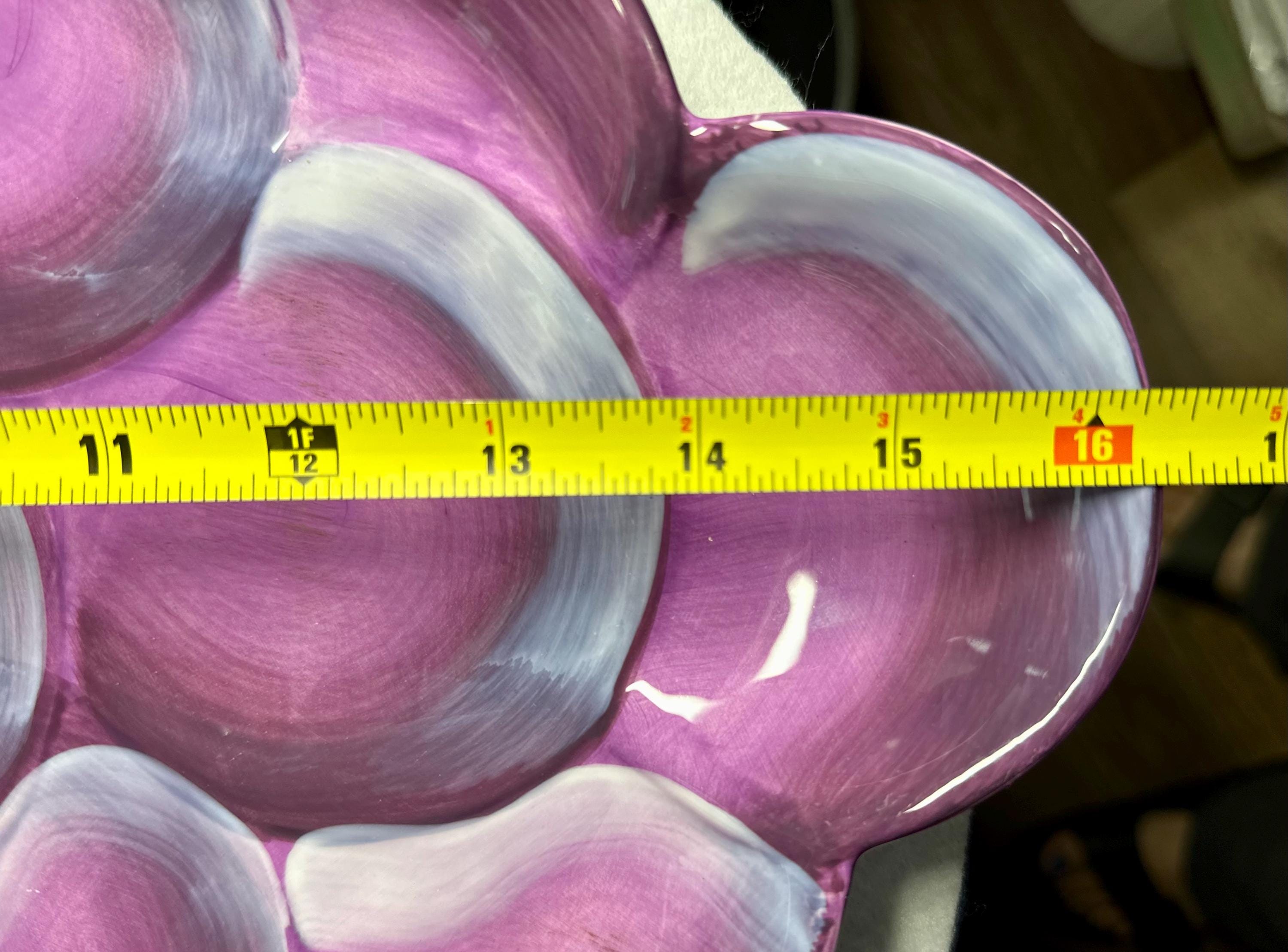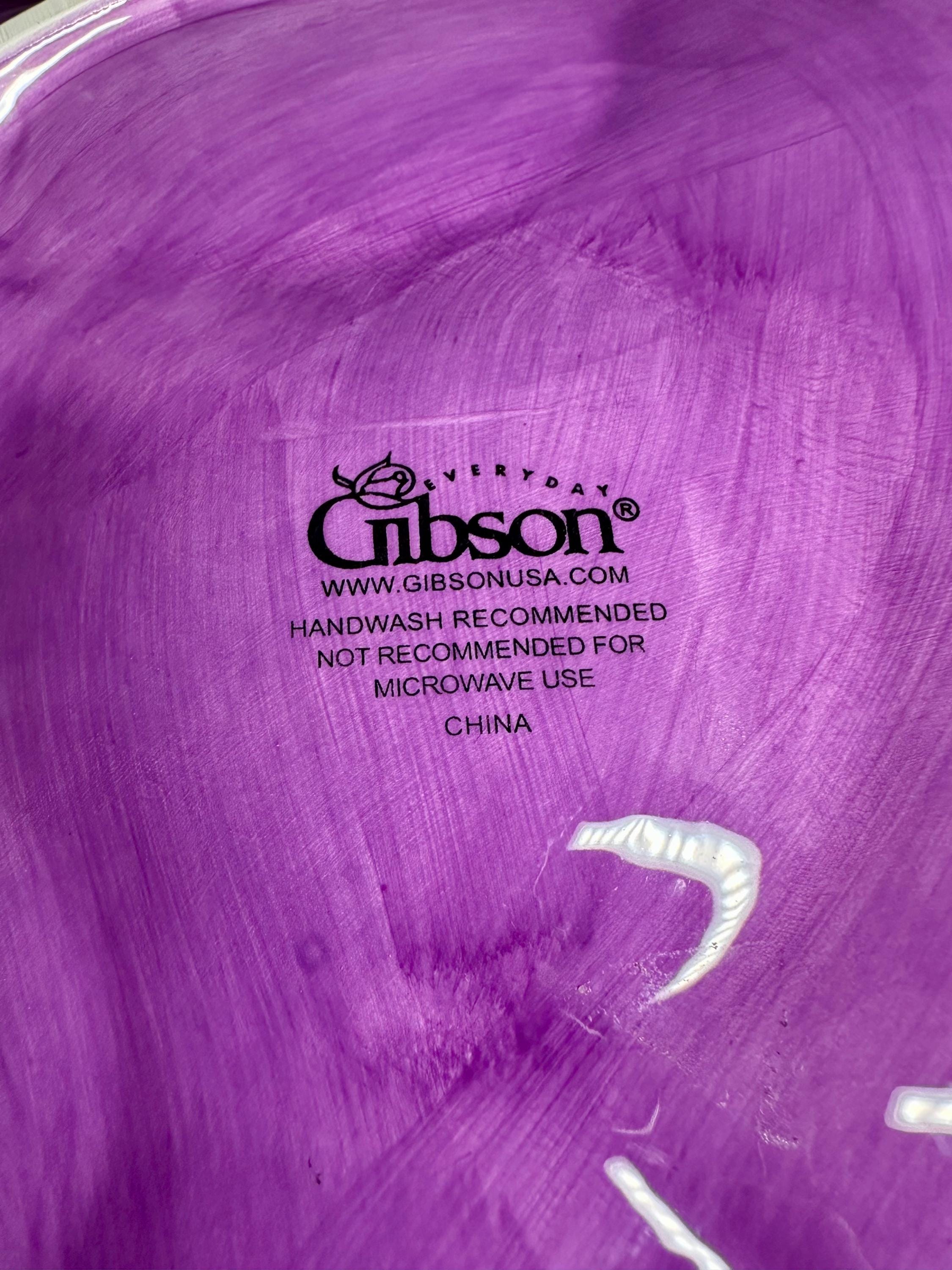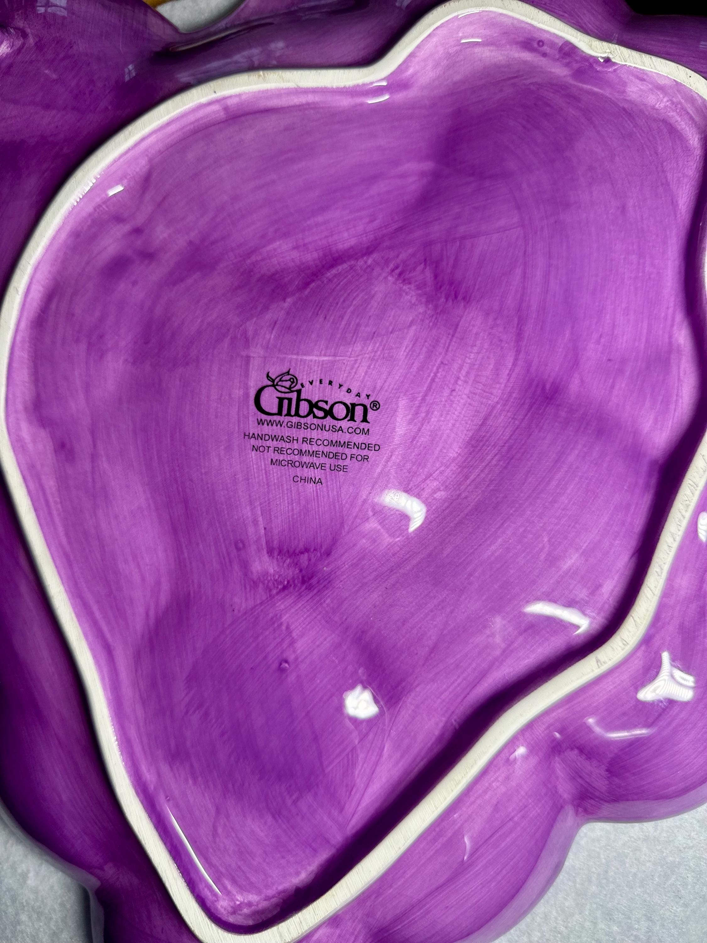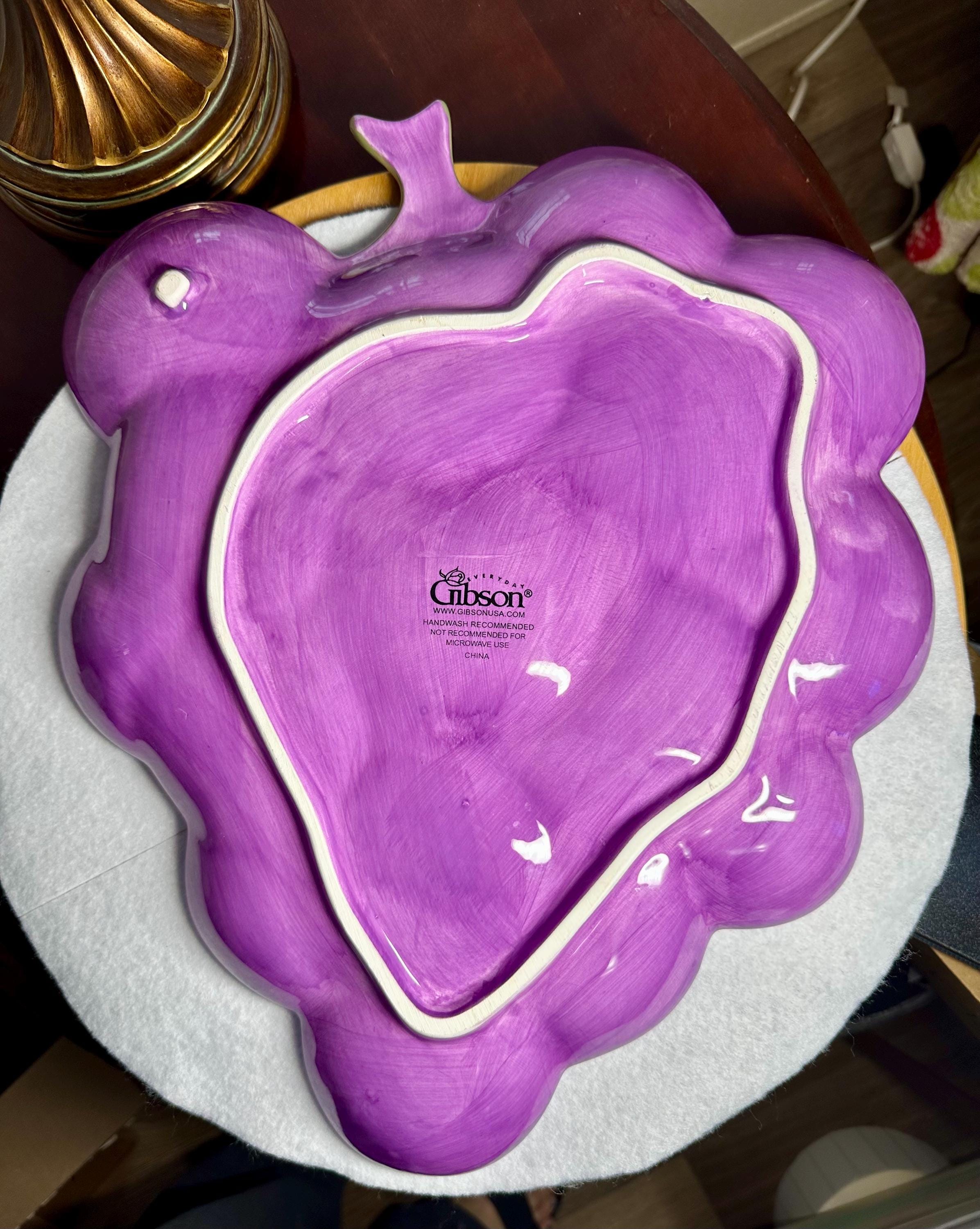 This is a beautiful large purple grape plate made by Gibson. This plate is 13 inches wide and 16 inches long. This plate has no chips, scratches, crazing or any other blemishes. There is a spot on the bottom of the plate where is sits that is not glazed, however I believe that this how it was made. This plate is not microwave or dishwasher safe. This is perfect for any friend or family gathering all year long. Please take a moment to look at our other kitchen items. We add items weekly so please come back and visit us. Disclaimer: The color maybe different due to the lighting or camera. Though we try to reduce and reuse, the cost of additional shipping materials are included in the price. We are not responsible for damages incurred during shipping. As always please contact us if you would like additional pictures or if you have any questions.