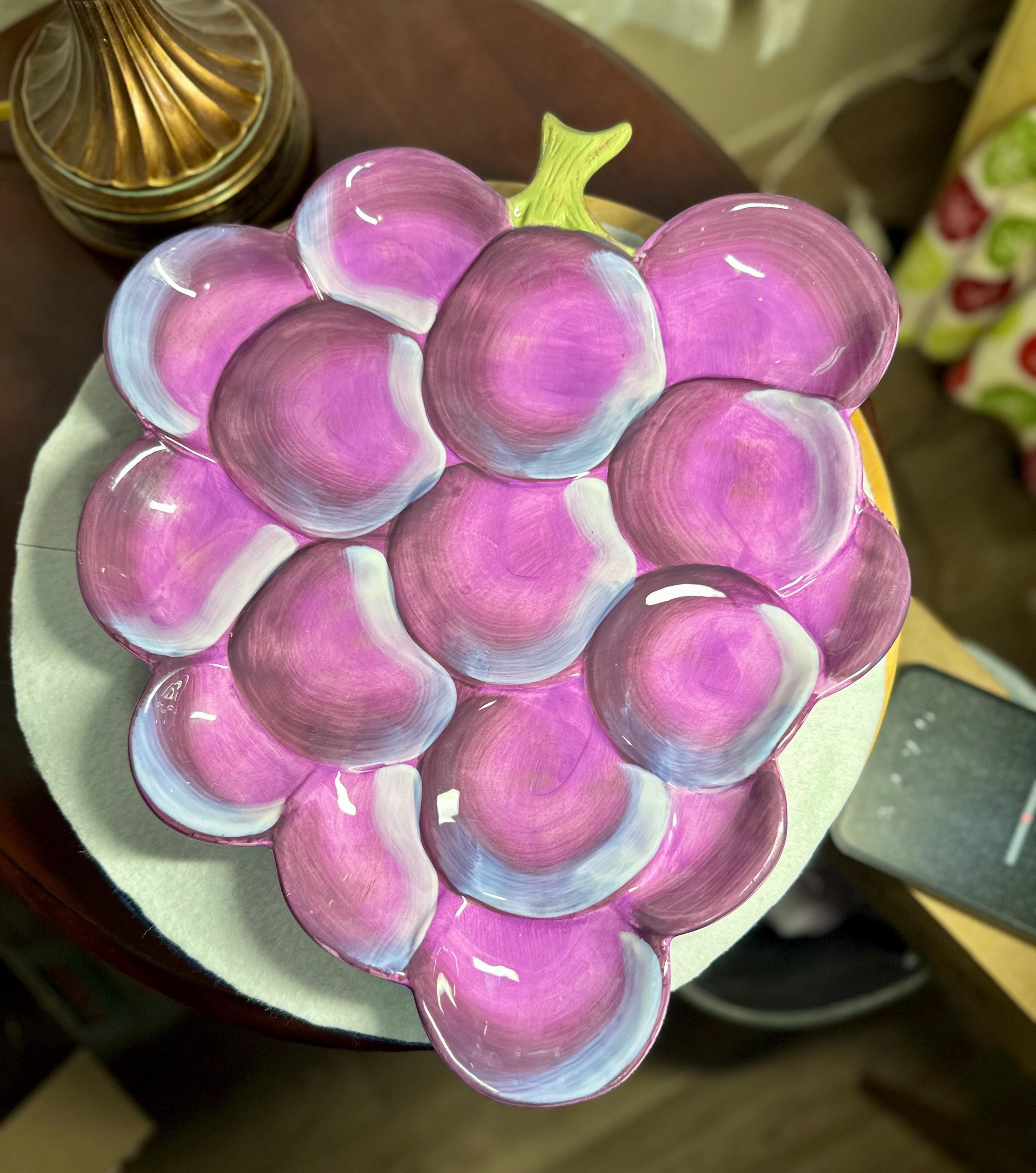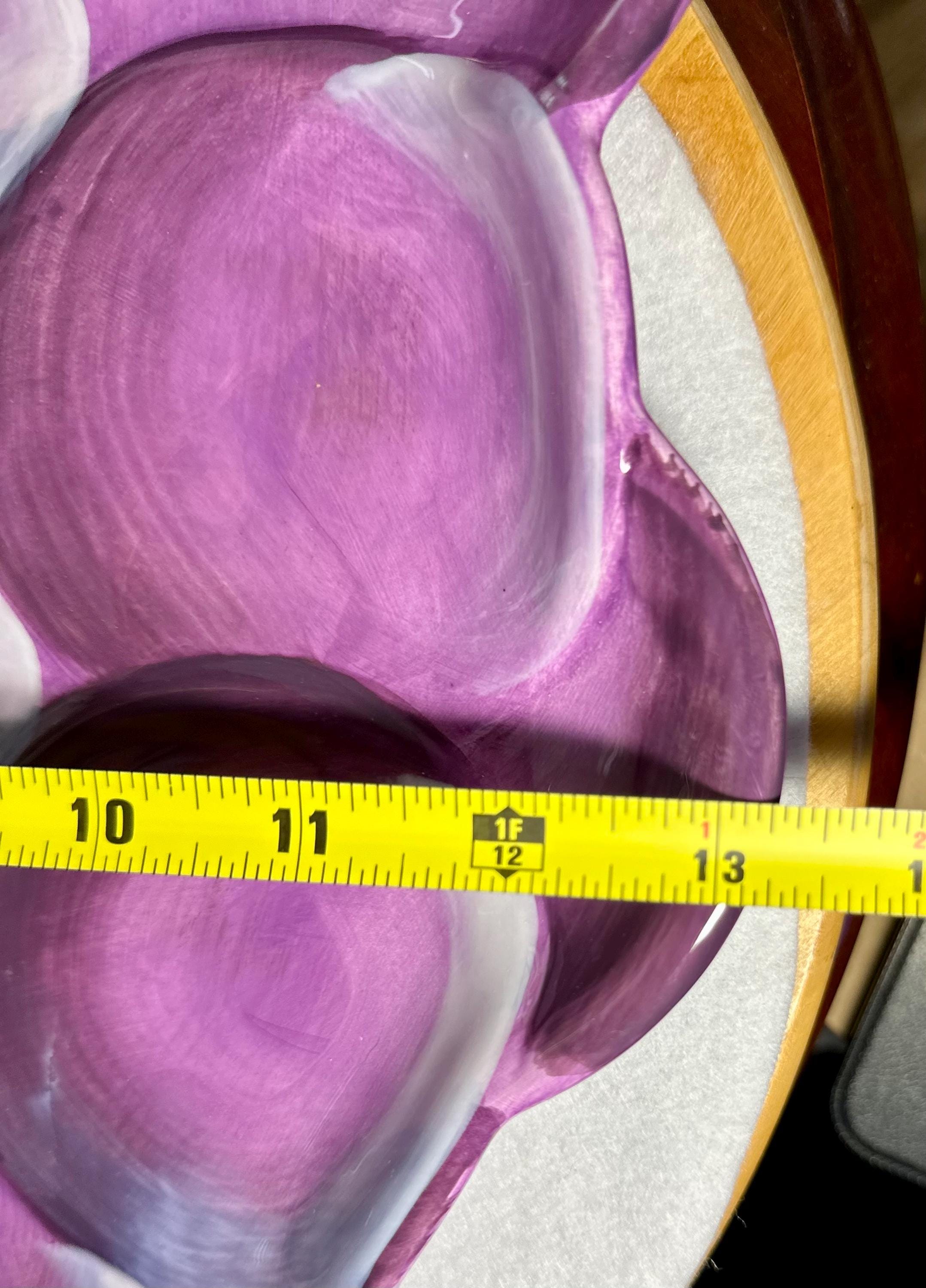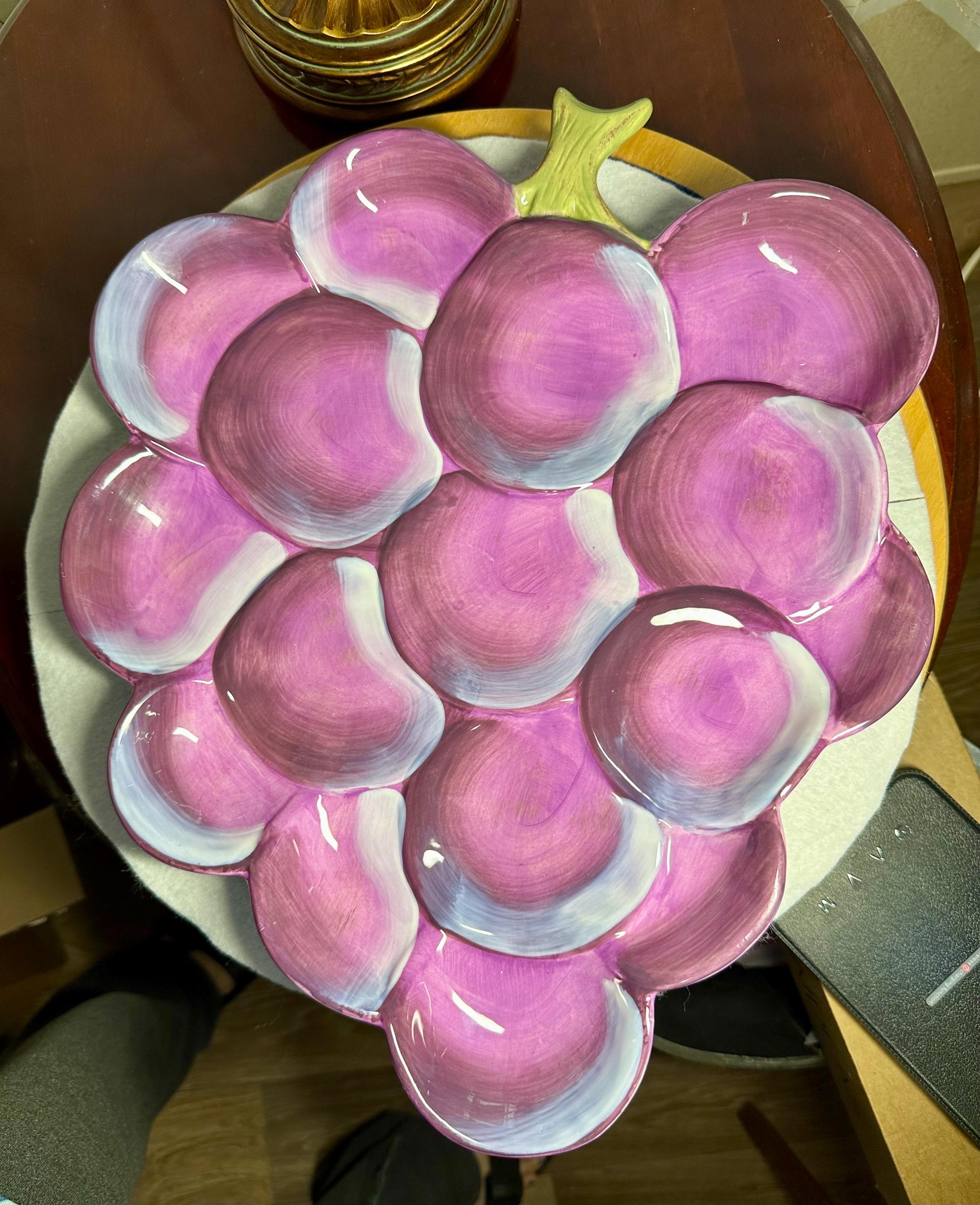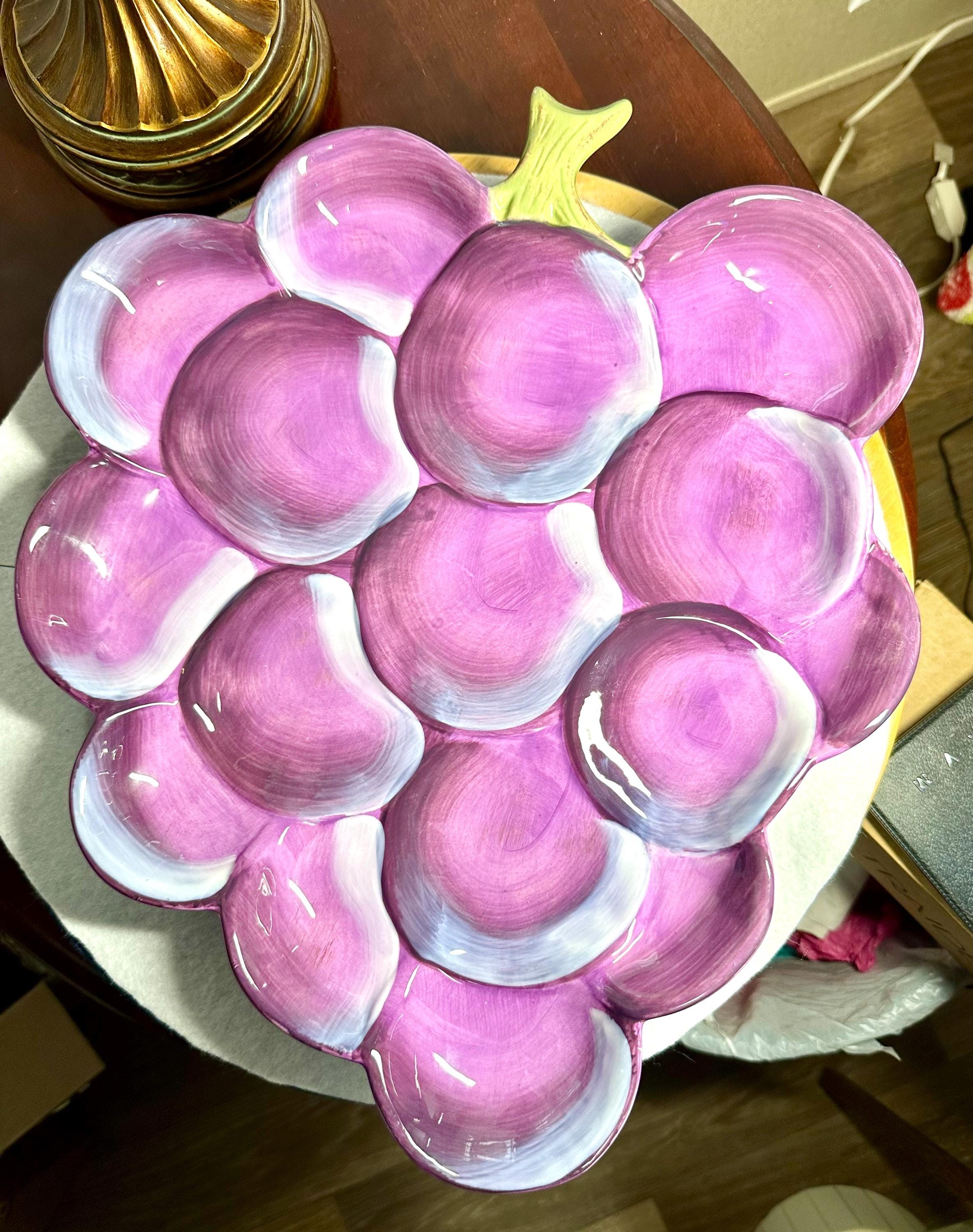 This is a beautiful large purple grape plate made by Gibson. This plate is 13 inches wide and 16 inches long. This plate has no chips, scratches, crazing or any other blemishes. There is a spot on the bottom of the plate where is sits that is not glazed, however I believe that this how it was made. This plate is not microwave or dishwasher safe. This is perfect for any friend or family gathering all year long. Please take a moment to look at our other kitchen items. We add items weekly so please come back and visit us. Disclaimer: The color maybe different due to the lighting or camera. Though we try to reduce and reuse, the cost of additional shipping materials are included in the price. We are not responsible for damages incurred during shipping. As always please contact us if you would like additional pictures or if you have any questions.