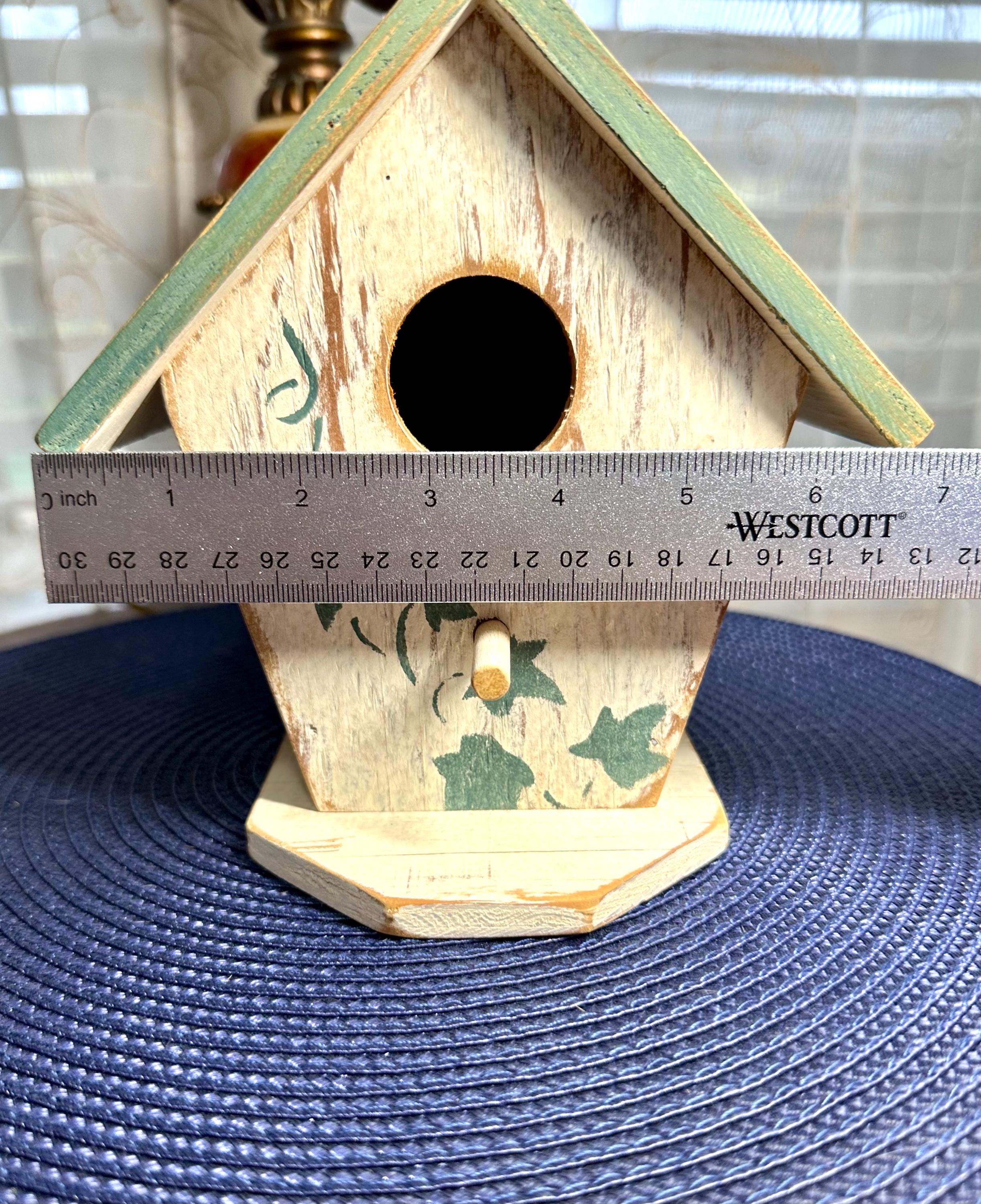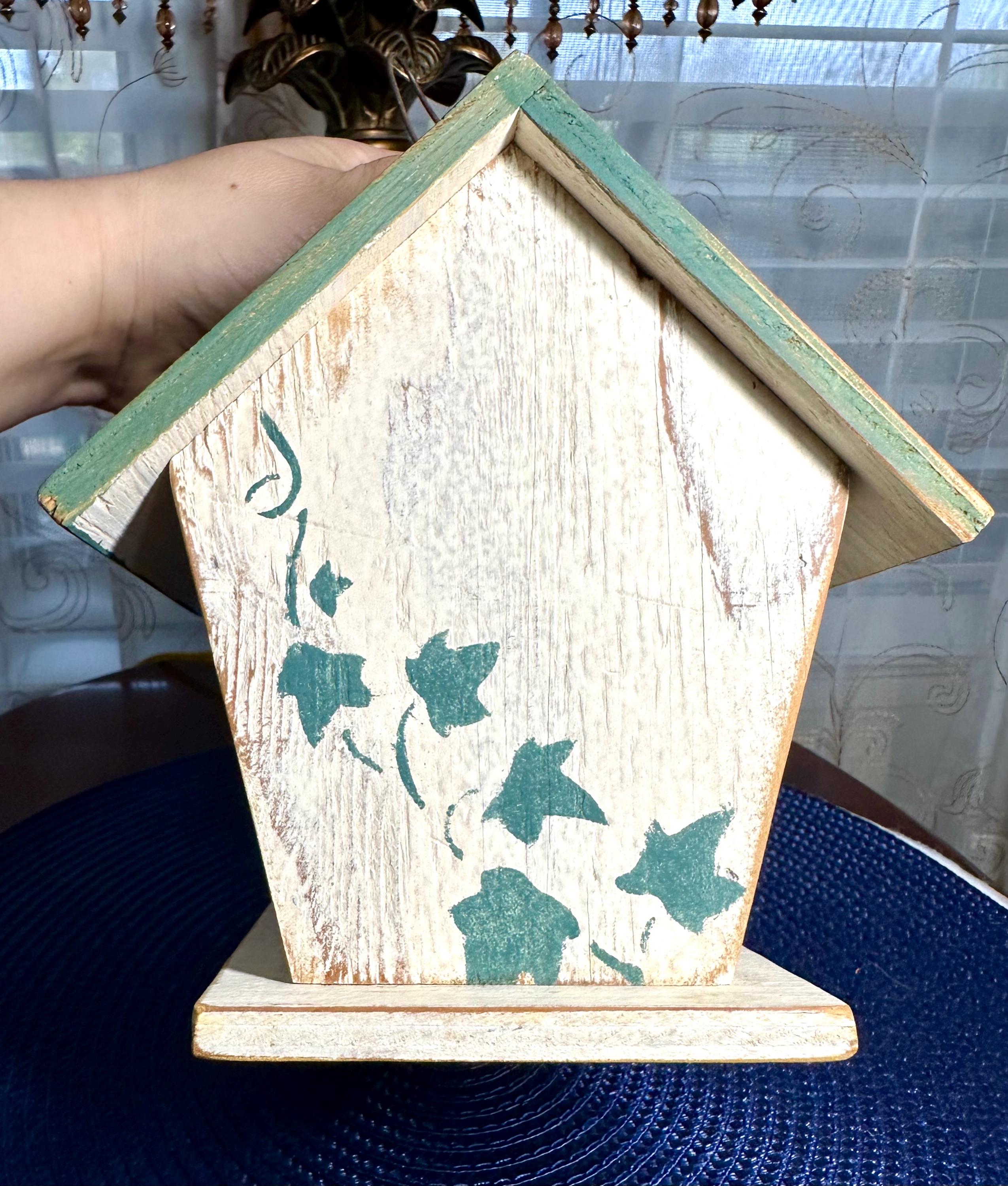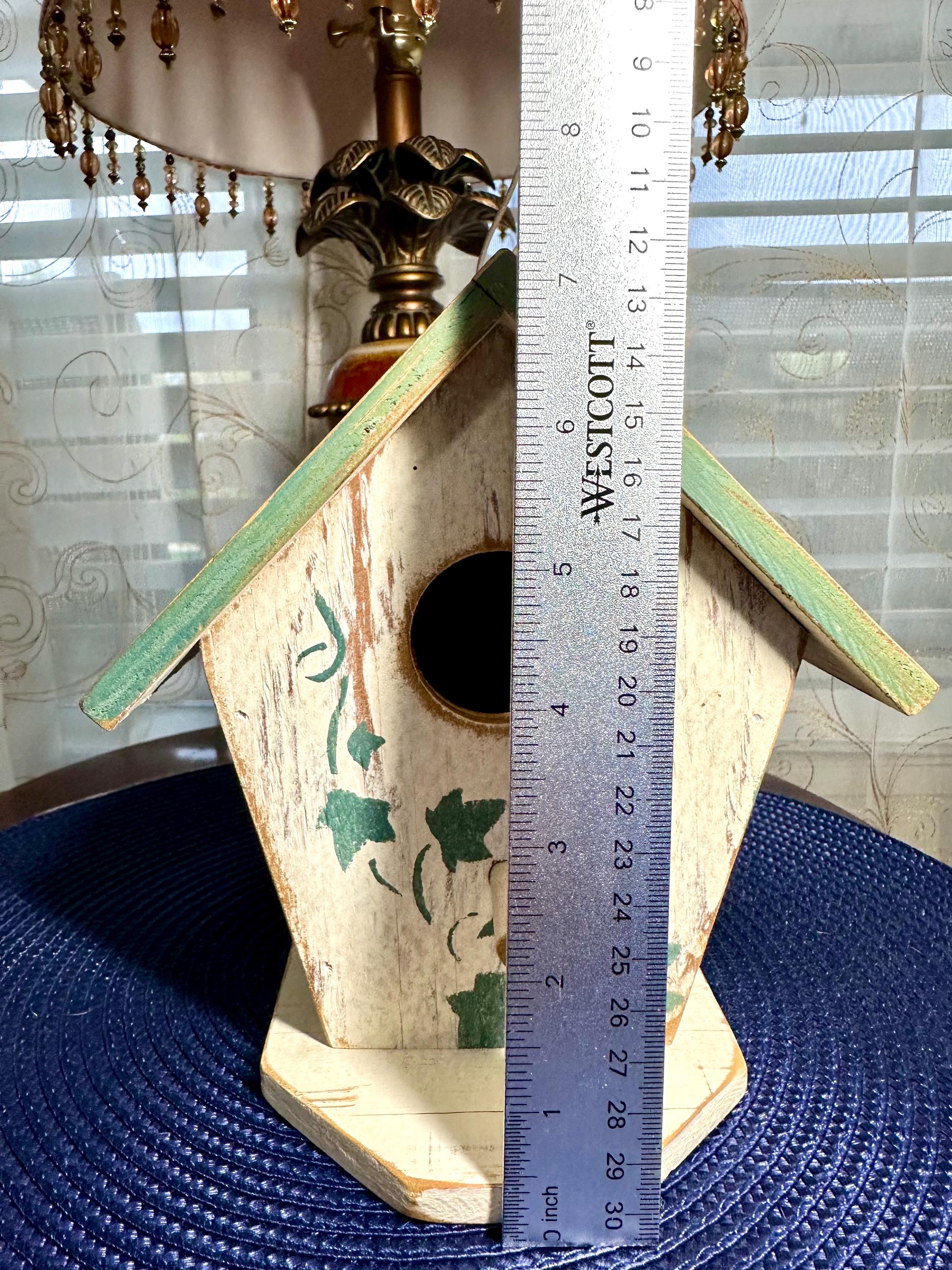This is a must have decoration for anyone's backyard. This is a handmade birdhouse in a shabby cottage chic design. This birdhouse is 7.5 inches tall and 7 inches wide at the largest part of this house. The bottom of this house says: Country At Heart Crafters Guild Space #680 2645 PCH Torrance, CA 9050 Patti Strawn (310) 540-4169 To hang the birdhouse there is a metal loop. There are no returns on this item. If you have any questions please contact us. Disclaimer: The color maybe different due to the lighting or camera. Though we try to reduce and reuse, the cost of additional shipping materials are included in the price. We are not responsible for damages incurred during shipping. As always please contact us if you would like additional pictures or if you have any questions.