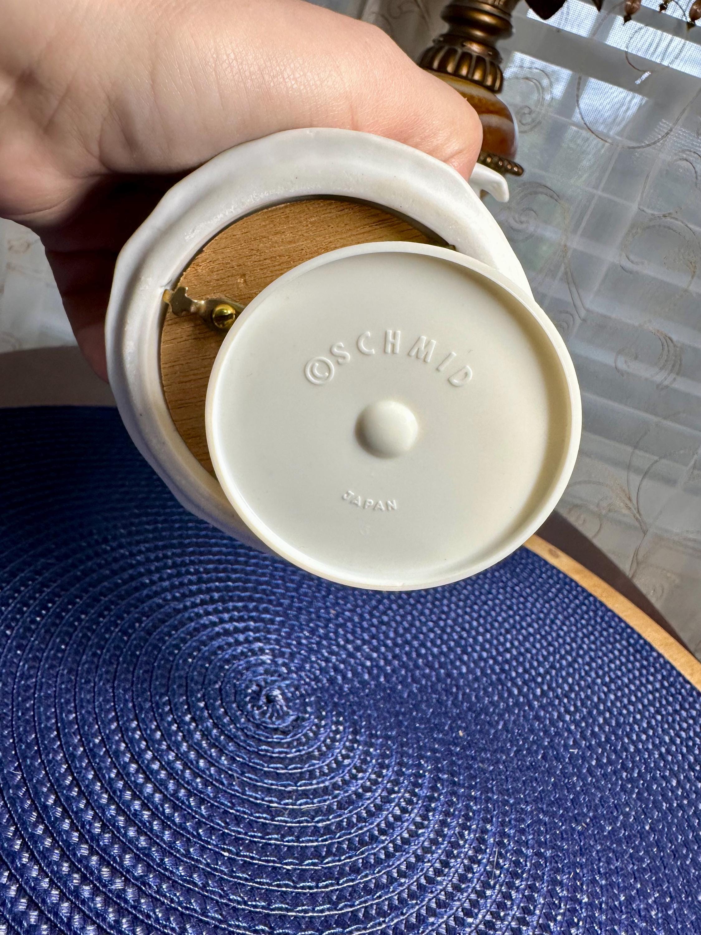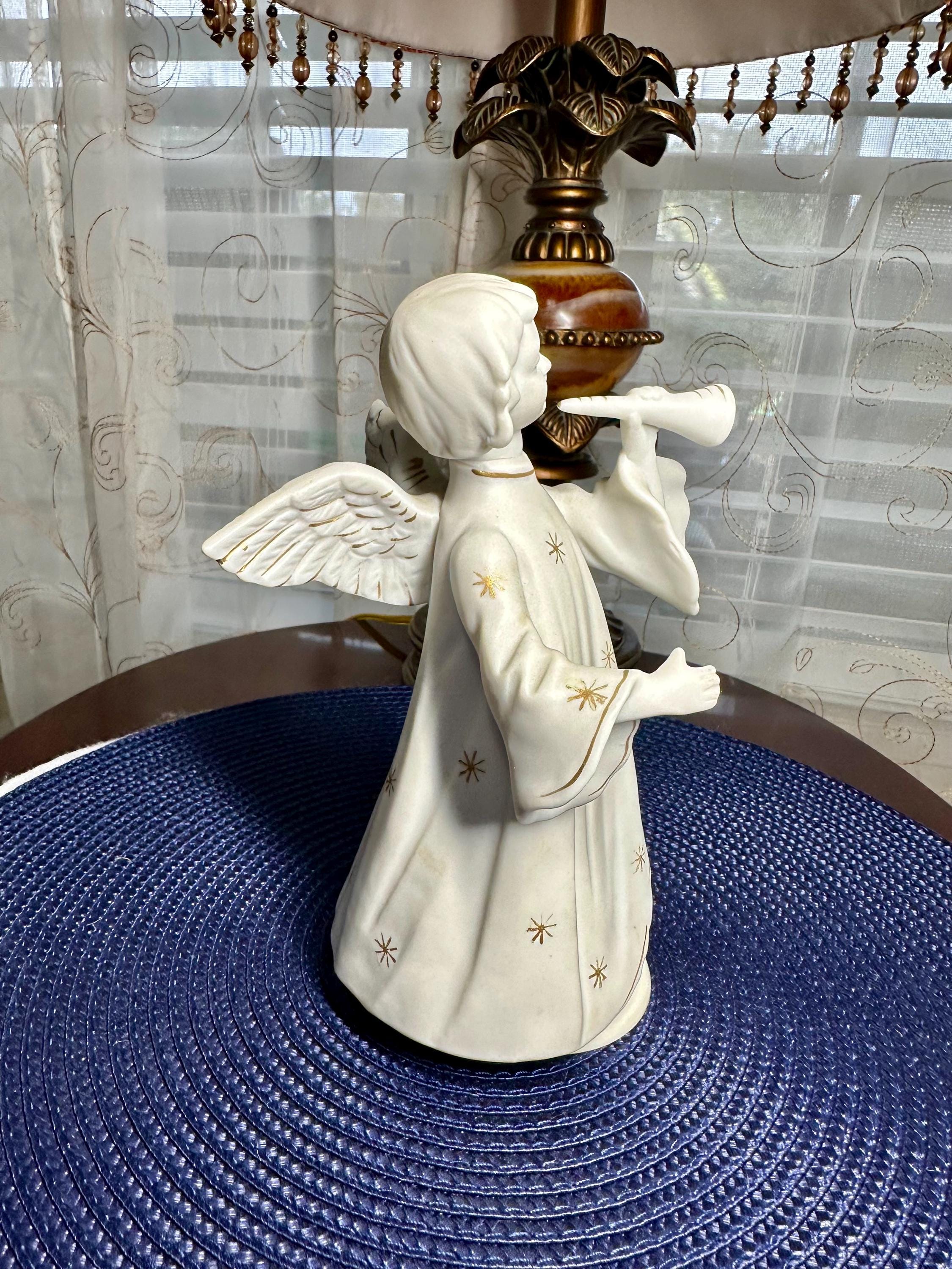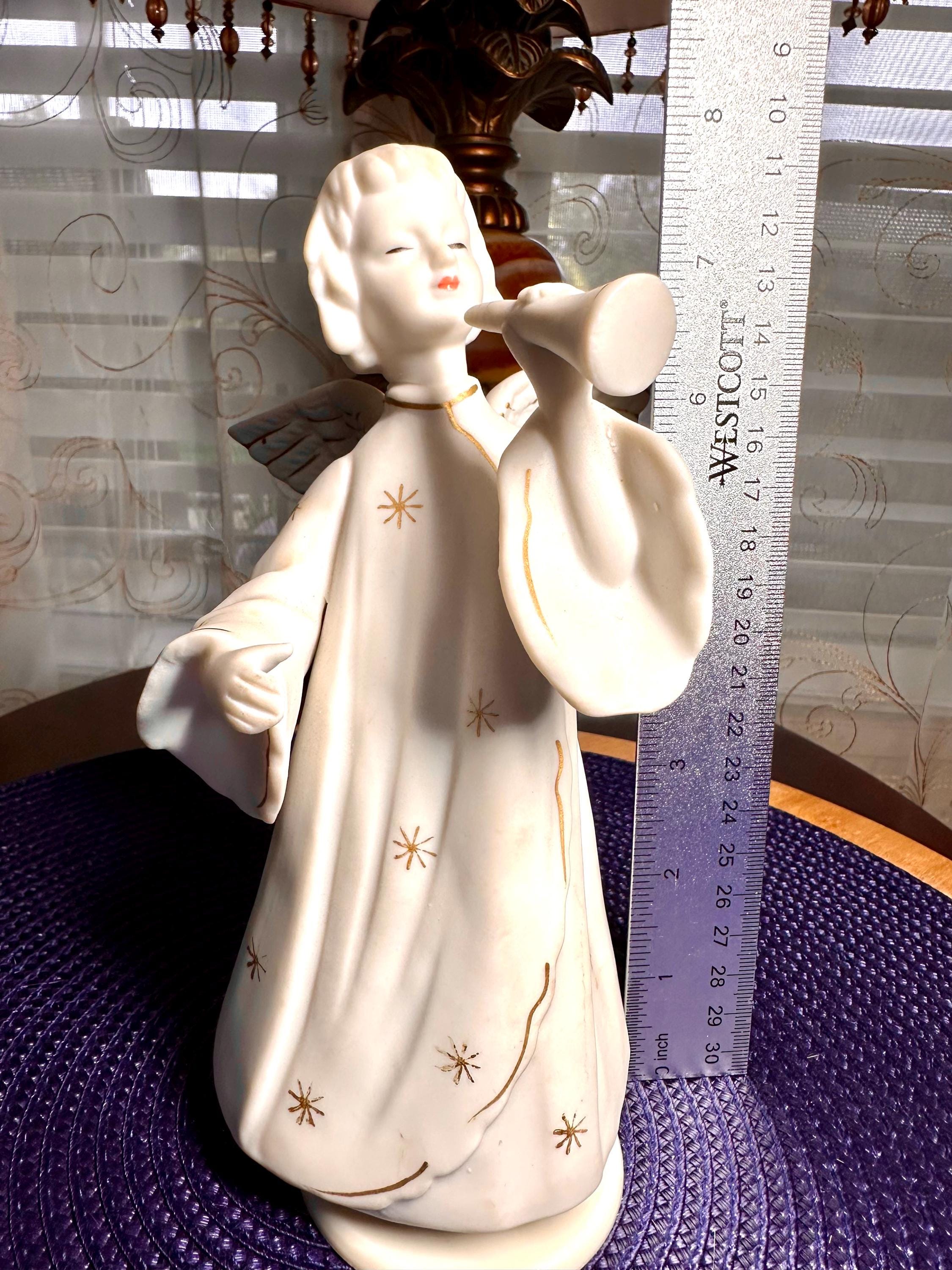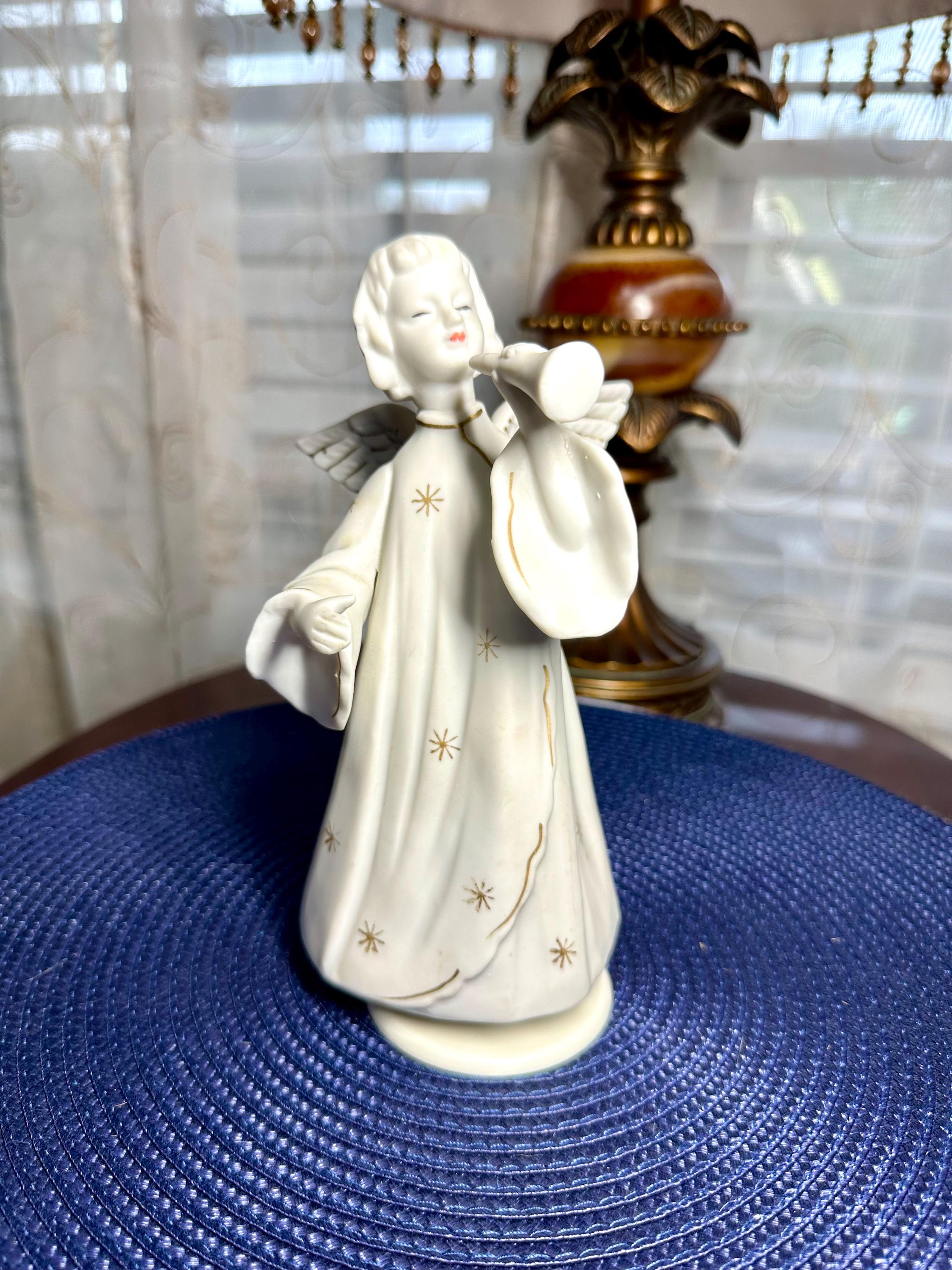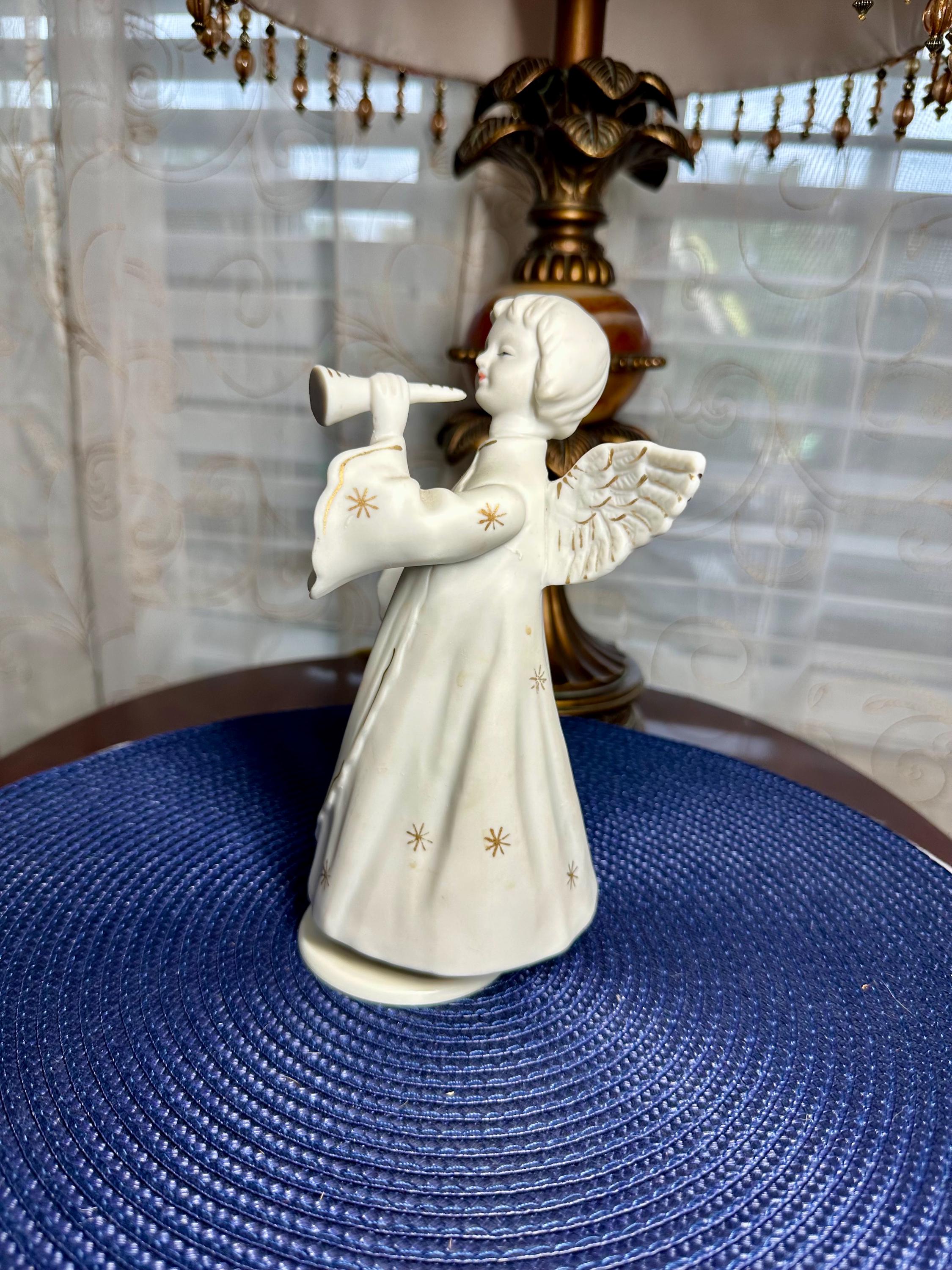 This pretty little Porcelain Angel is make by Schmid. She is is from the 1960s and rotates while playing "Silent Night". She has gold accents on her gown, wings and horn. She is 8 inches tall and has no visible blemishes such as crazing, chips or cracks. Please take a moment and look at our other inventory, we always have new items being listed weekly. Disclaimer: The color maybe different due to the lighting or camera. Though we try to reduce and reuse, the cost of additional shipping materials are included in the price. We are not responsible for damages incurred during shipping. As always please contact us if you would like additional pictures or if you have any questions.