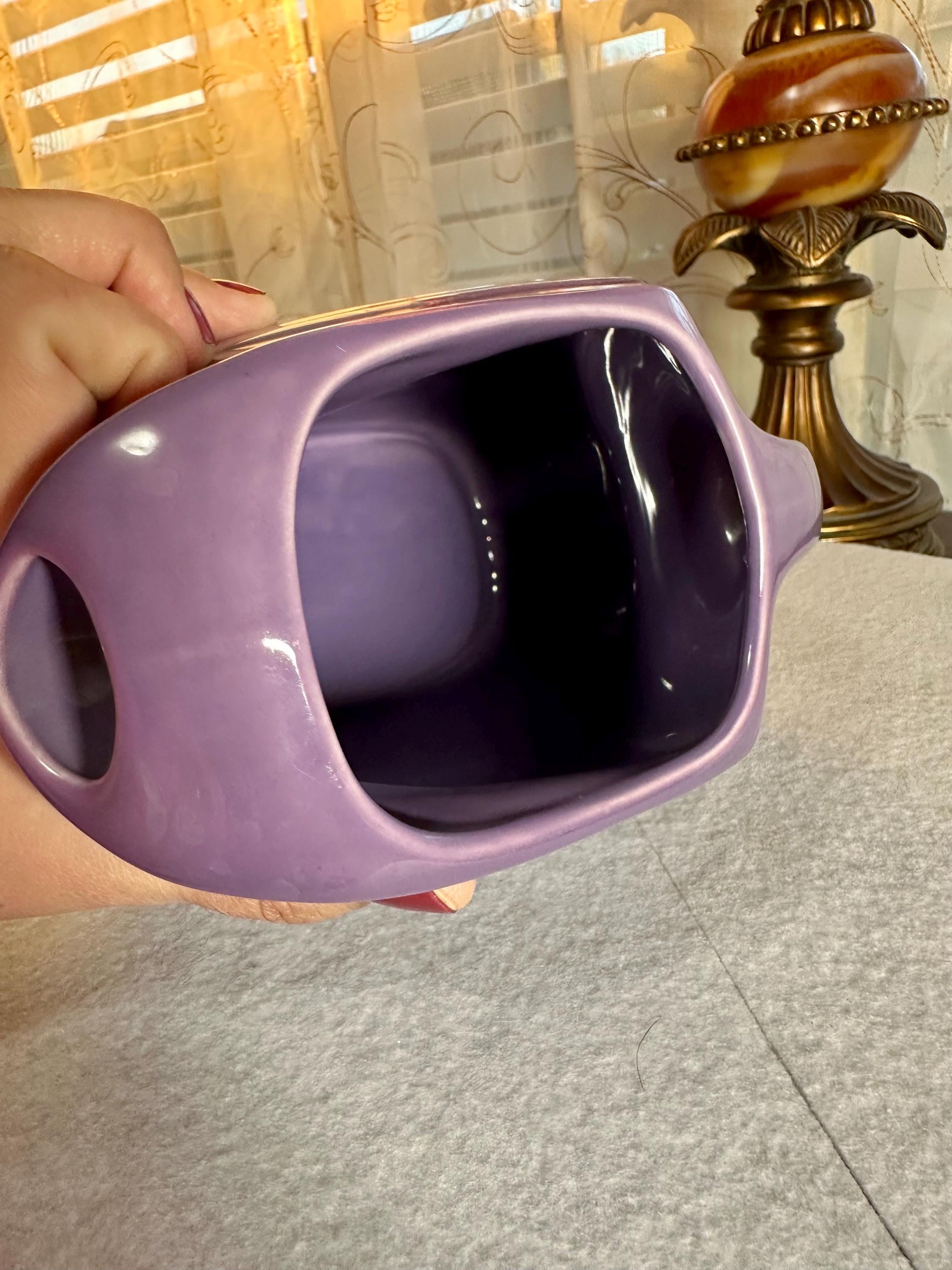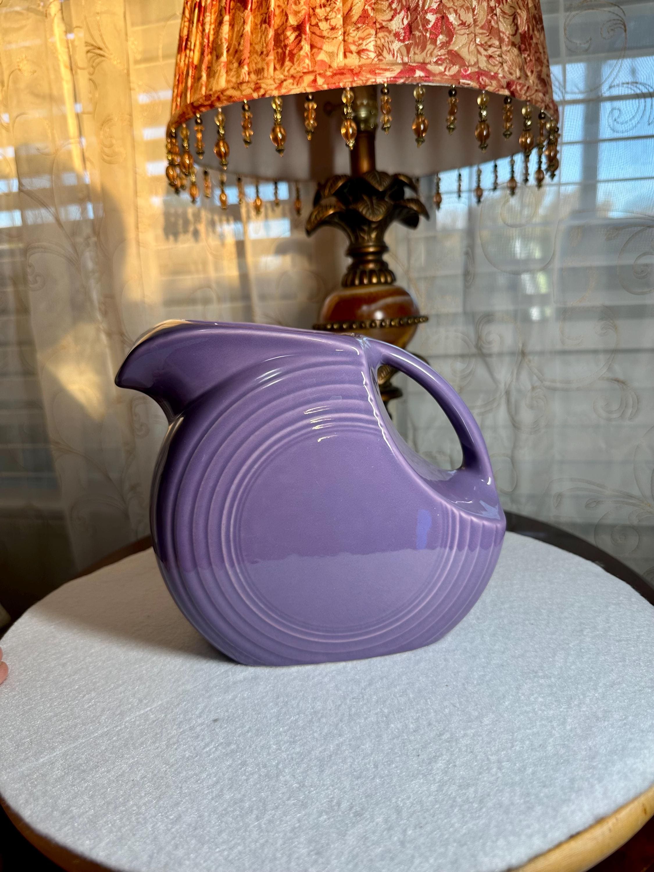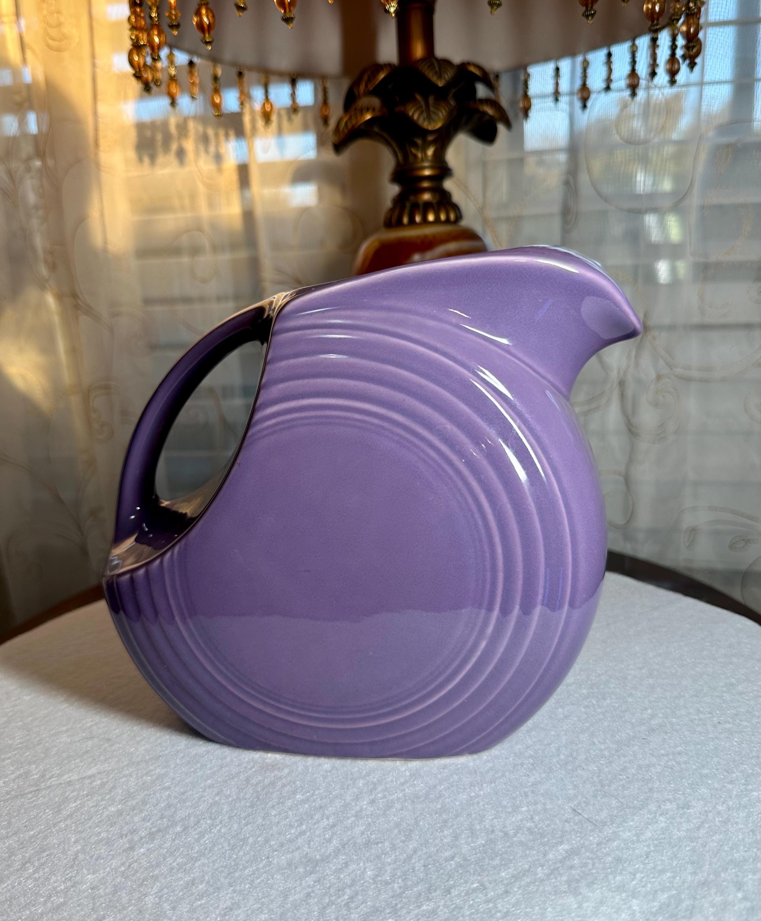 This is a Fiesta Large Disc Pitcher in Lilac. This will hold around 2 liters (67 ounces) and is 7 inches tall, 7.5 inches long and 3.5 inches wide. This lilac pitcher was made between 1993 to 1995. This can be used since it is lead-free ceramic made in China. I do not recommend putting this in the dishwasher or the microwave. There is a spot on the bottom that looks like it was made when this was produced, picture is included. There are no cracks or crazing. This is a beautiful lilac color and the camera did not do it justice. This does not have the original box but we will ship it to you in biodegradable packing peanuts and with love.
