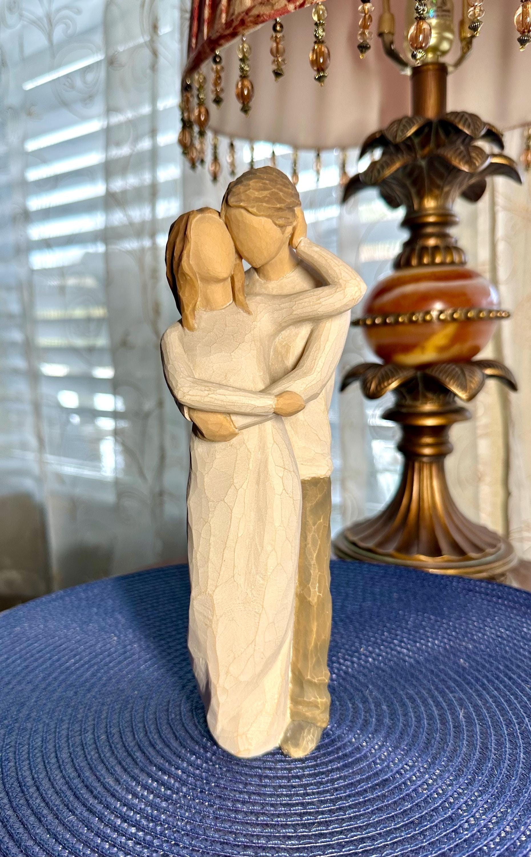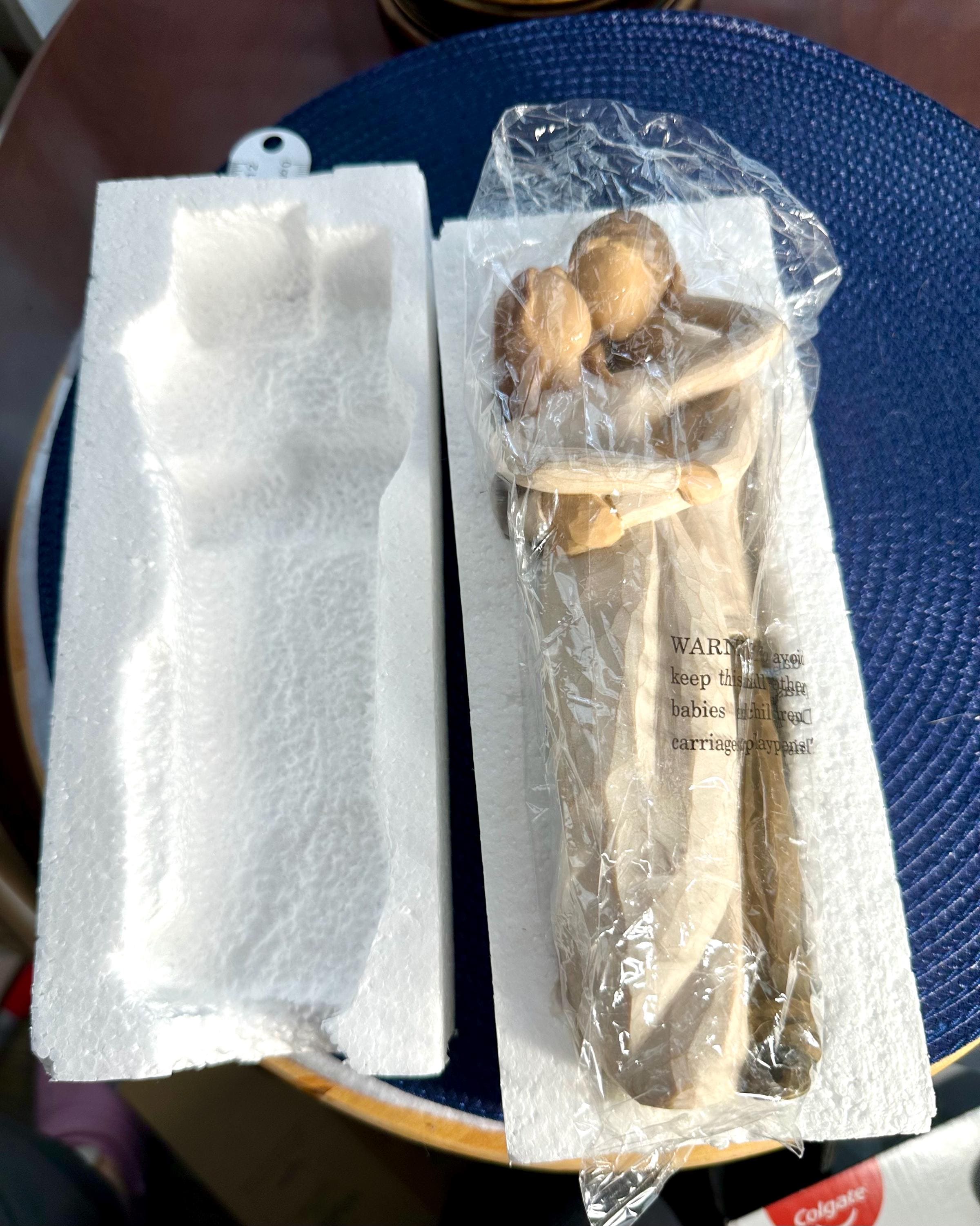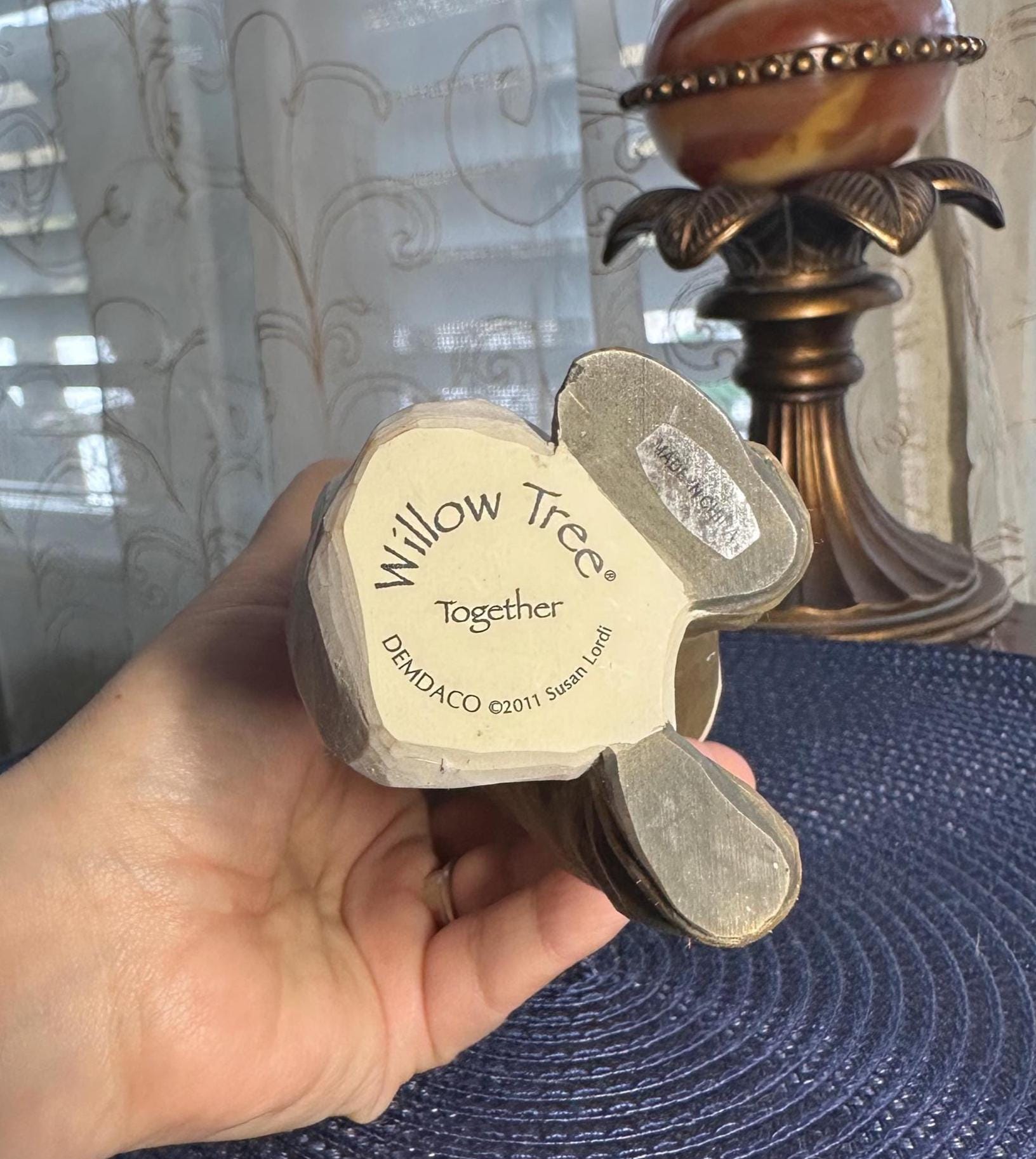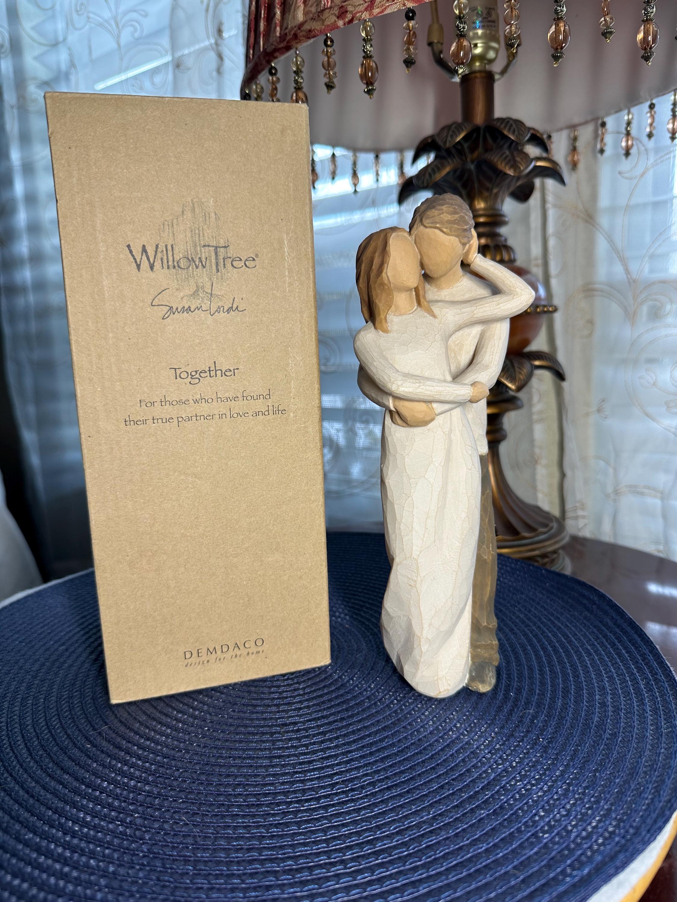 This is a Willow Tree Figurine by Susan Lordi named "Together". This comes with the original box and styrofoam. The styrofoam is not in perfect condition; pictures are included. The original tag is not included. This statue is almost 8 inches tall. There are no chips, cracks or discoloration. On the bottom of the figurine the 'made in China' sticker is worn. Sticker can be removed easily; however, I am not sure if there would be discoloration in the resin. This figurine is in great condition and is priced to sell.