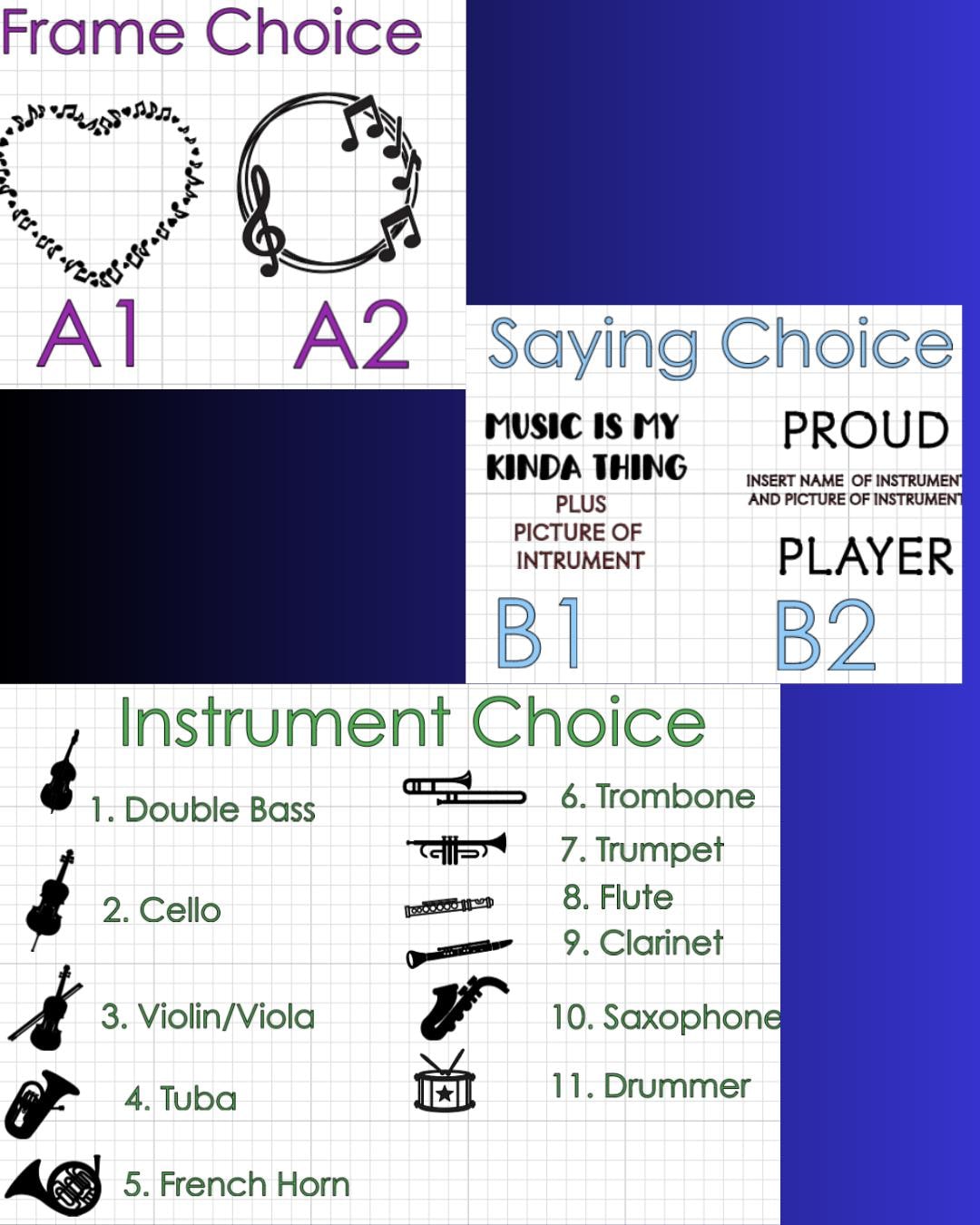 Ever wanna show some musician pride? Now you can! You can create a custom music decal and choose your frame, saying, and instrument! If you would like another saying on your decal, please put it in the instructions; however, it will be an additional cost.