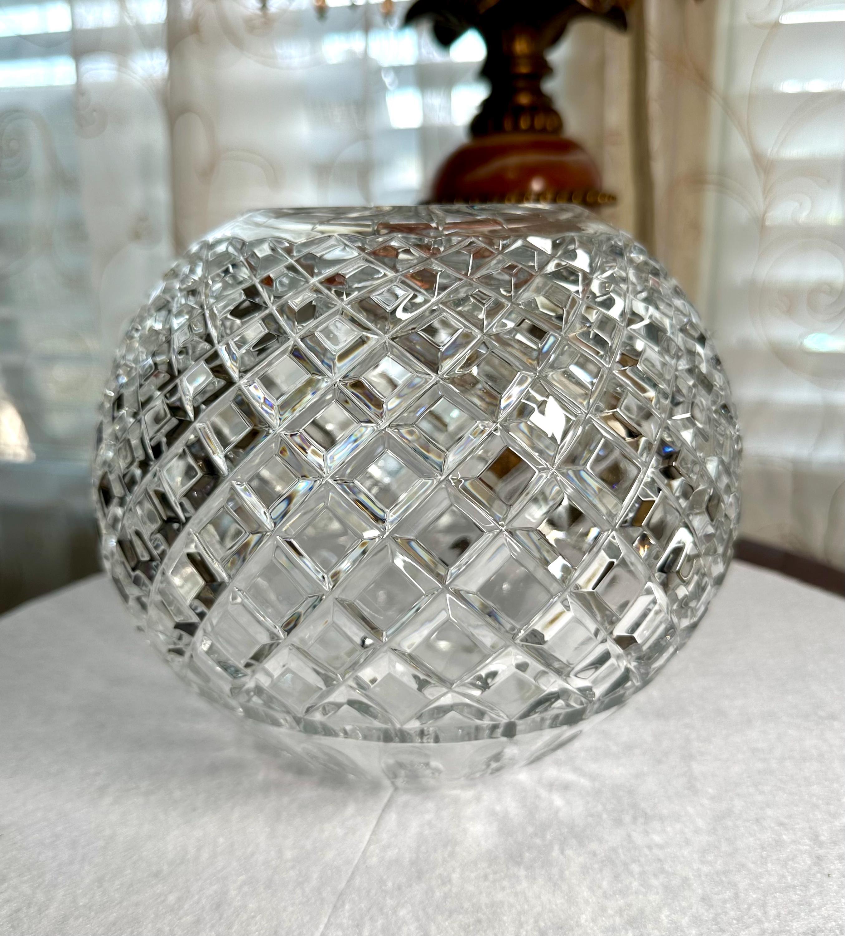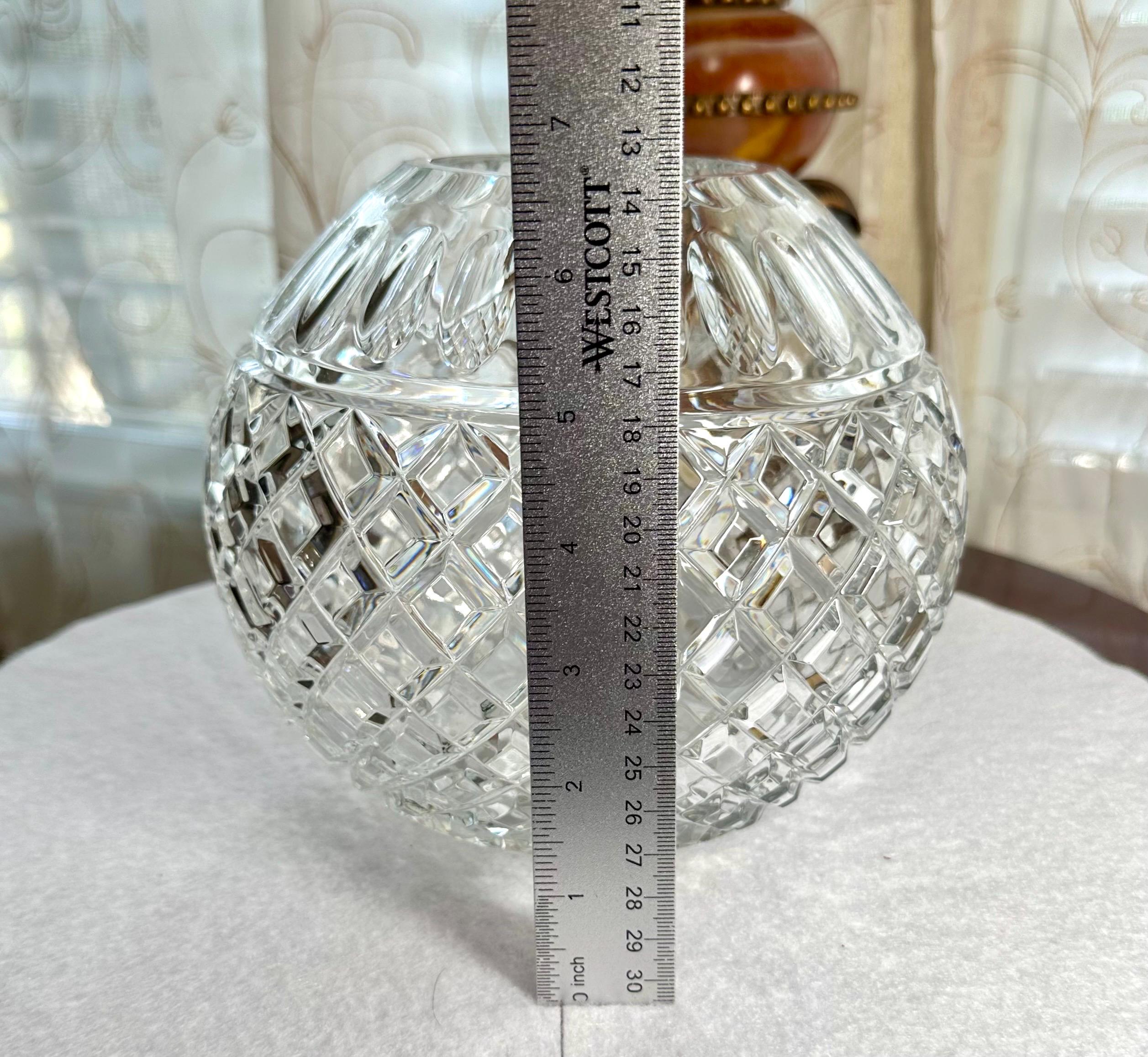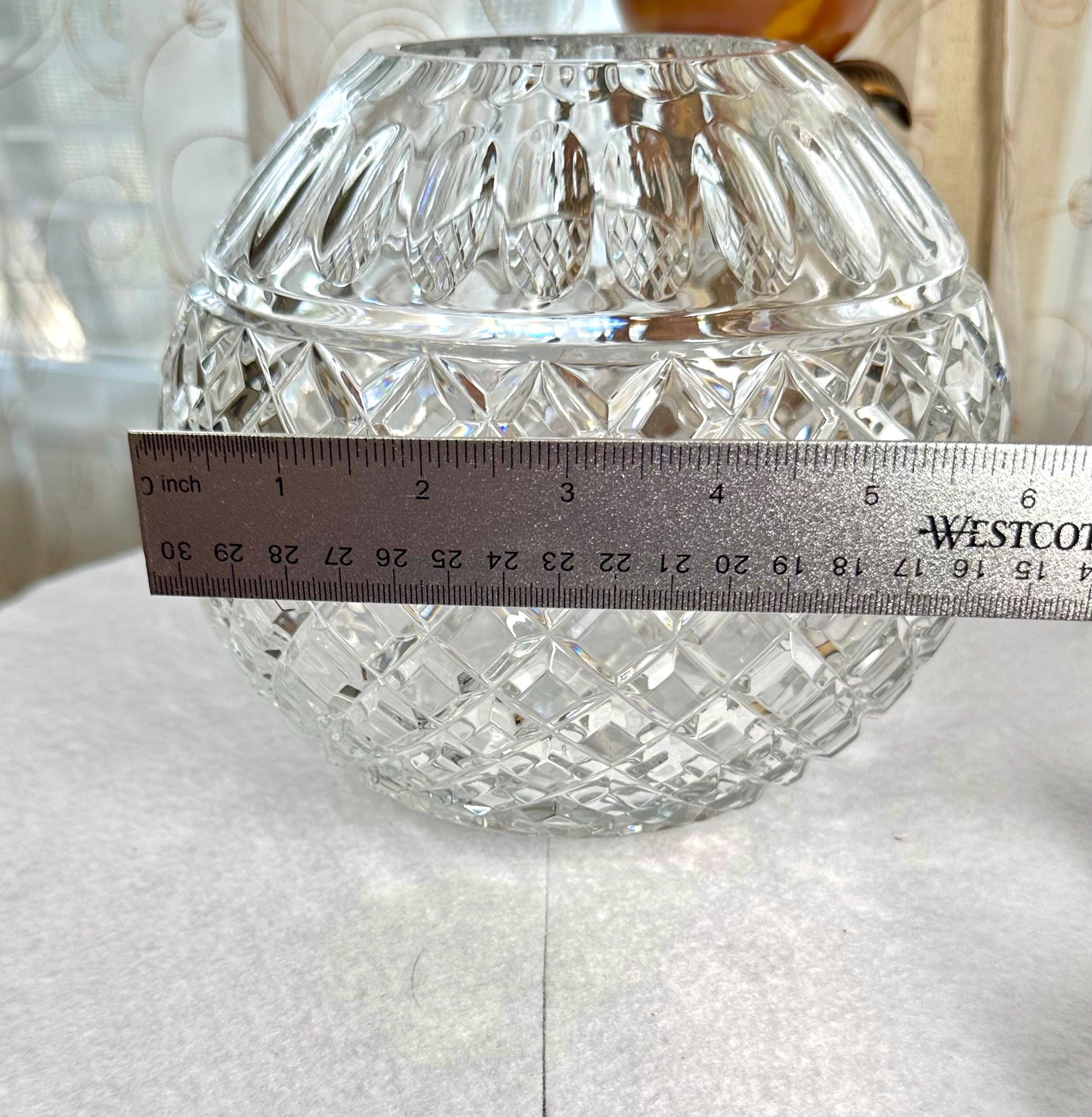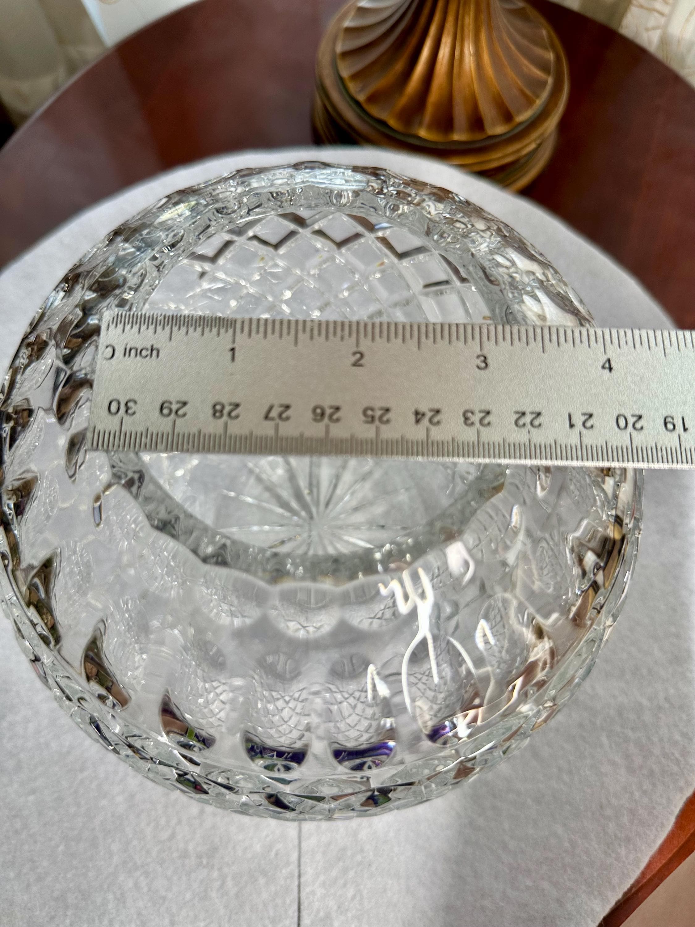 This is a Vintage Crystal Rose Bowl. This is in great shape and is definitely a piece that would make anyone smile. This is VERY heavy. It is 6 1/2 inches tall, 5 inches wide, and 3 inches across at the opening at the top. There is a small scuff in the glass, a rough edge on the rim, and a natural air bubble in the glass. If you have any questions, please contact us before purchasing this item.