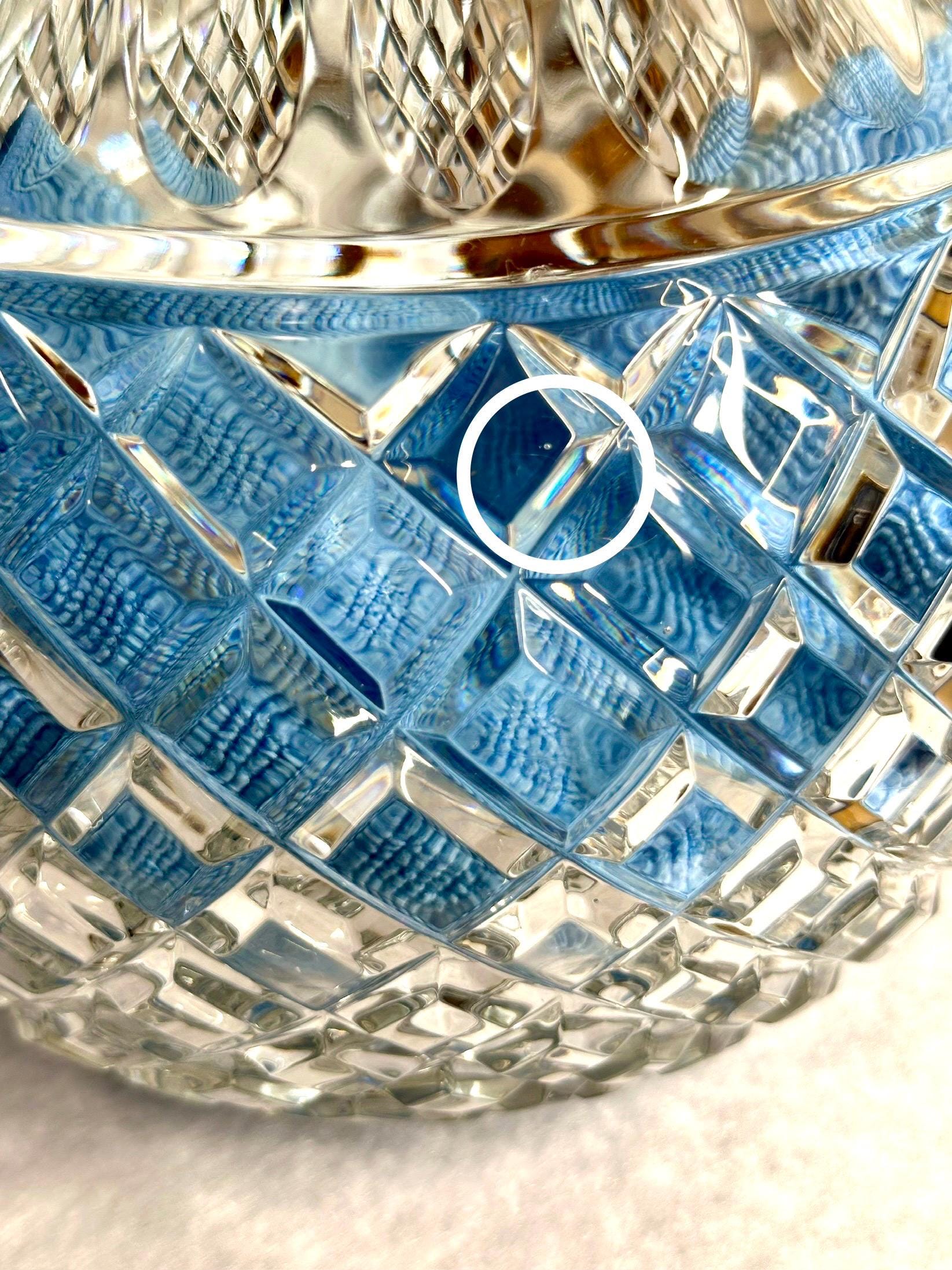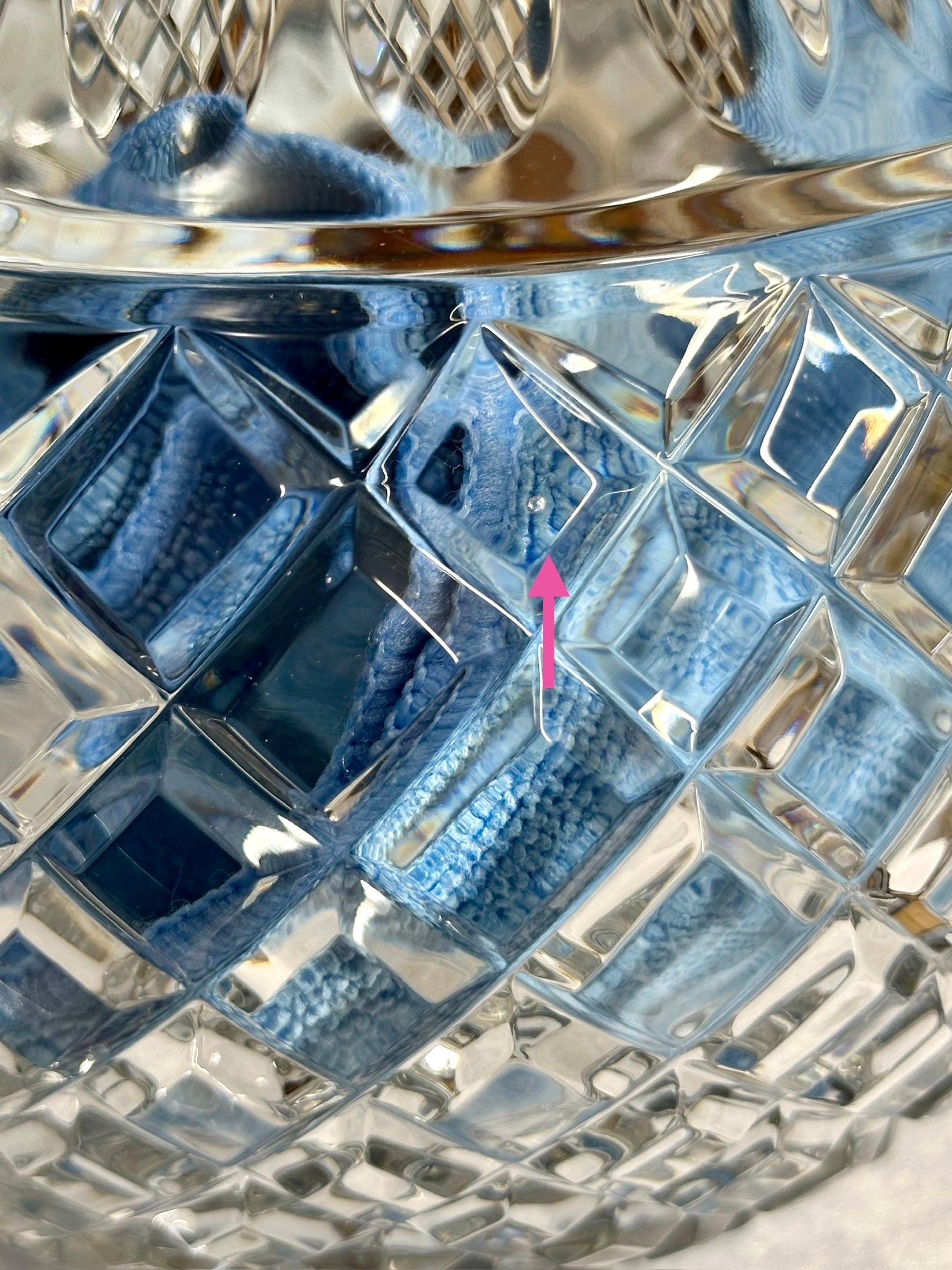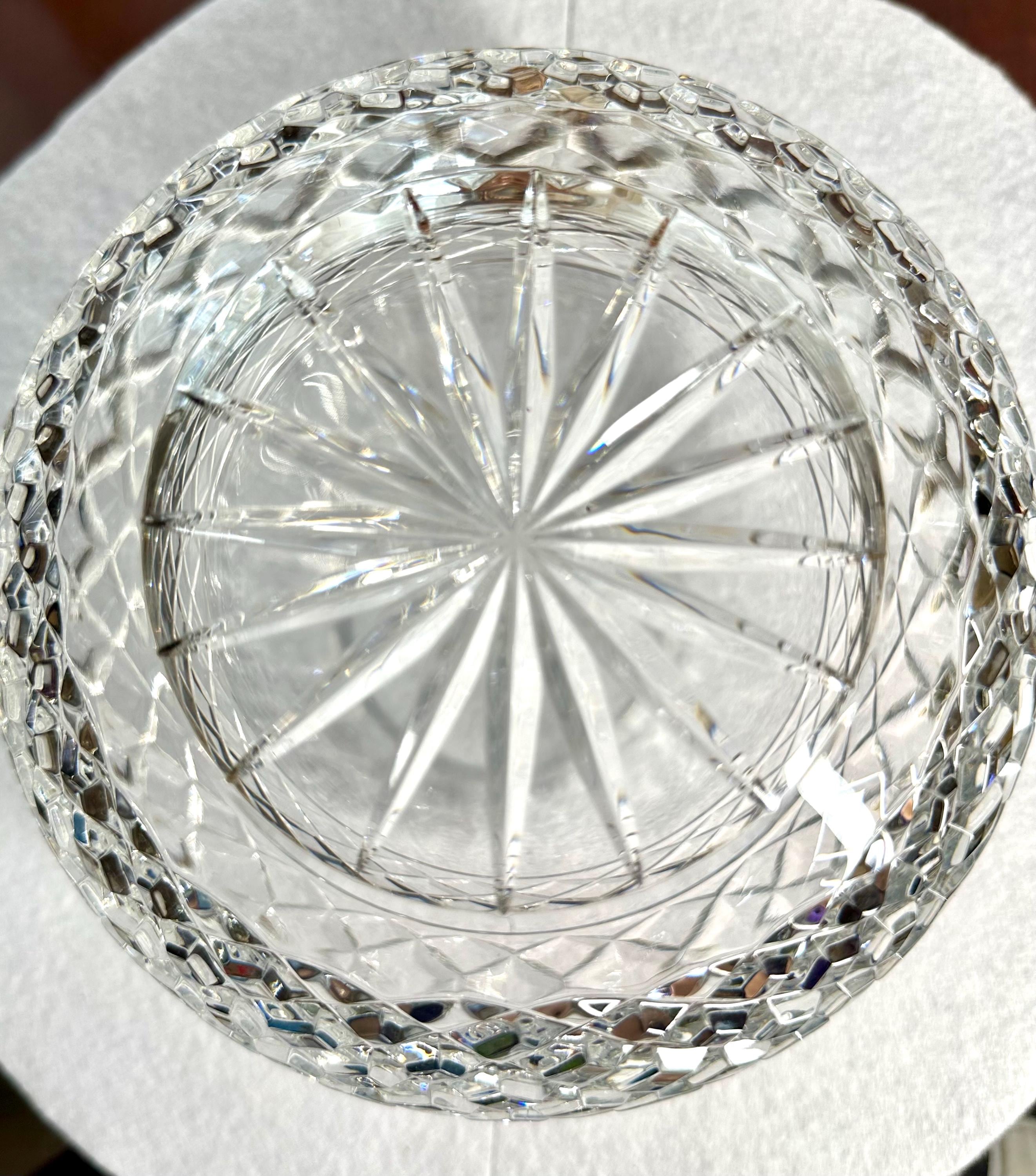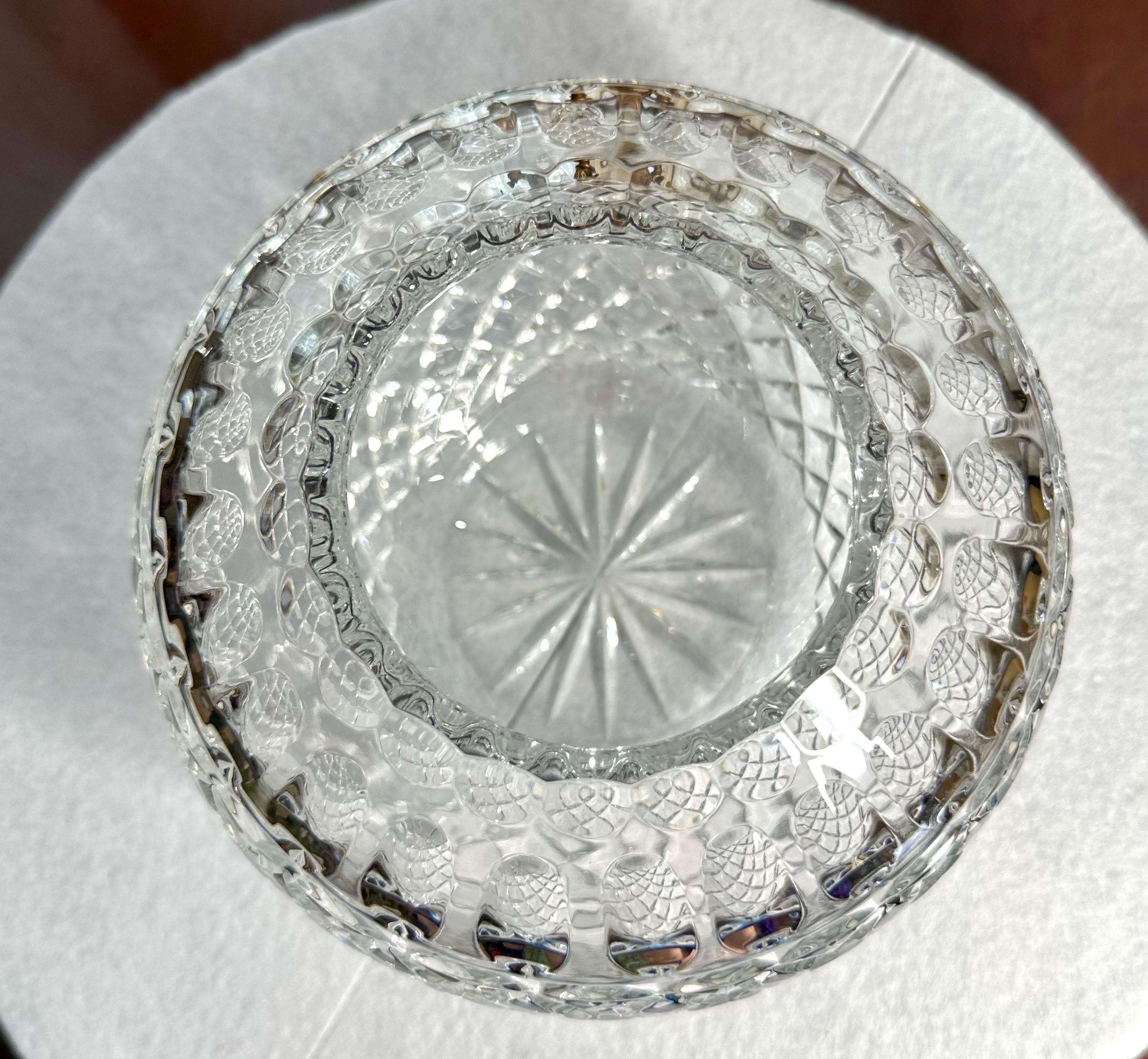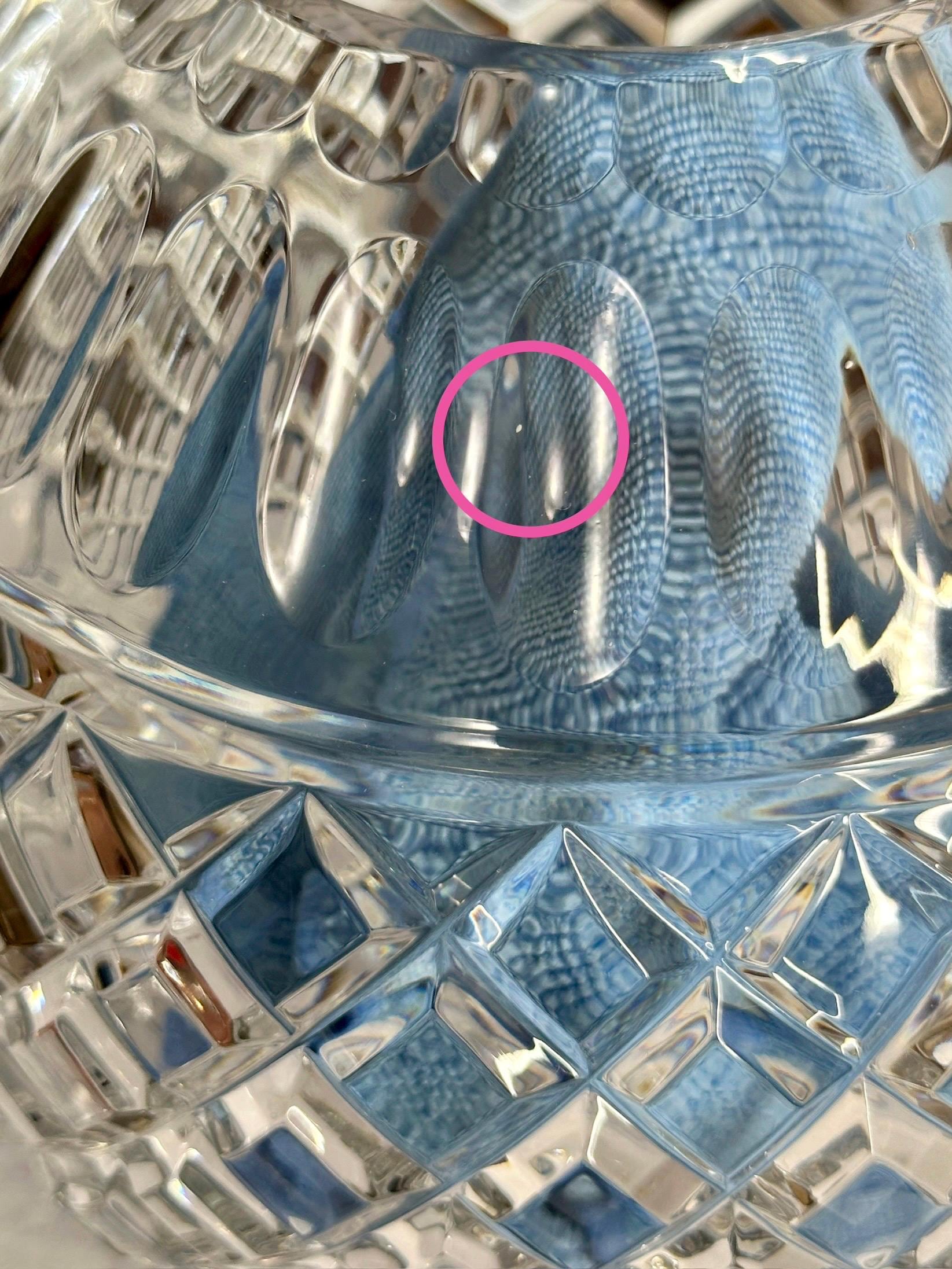 This is a Vintage Crystal Rose Bowl. This is in great shape and is definitely a piece that would make anyone smile. This is VERY heavy. It is 6 1/2 inches tall, 5 inches wide, and 3 inches across at the opening at the top. There is a small scuff in the glass, a rough edge on the rim, and a natural air bubble in the glass. If you have any questions, please contact us before purchasing this item.