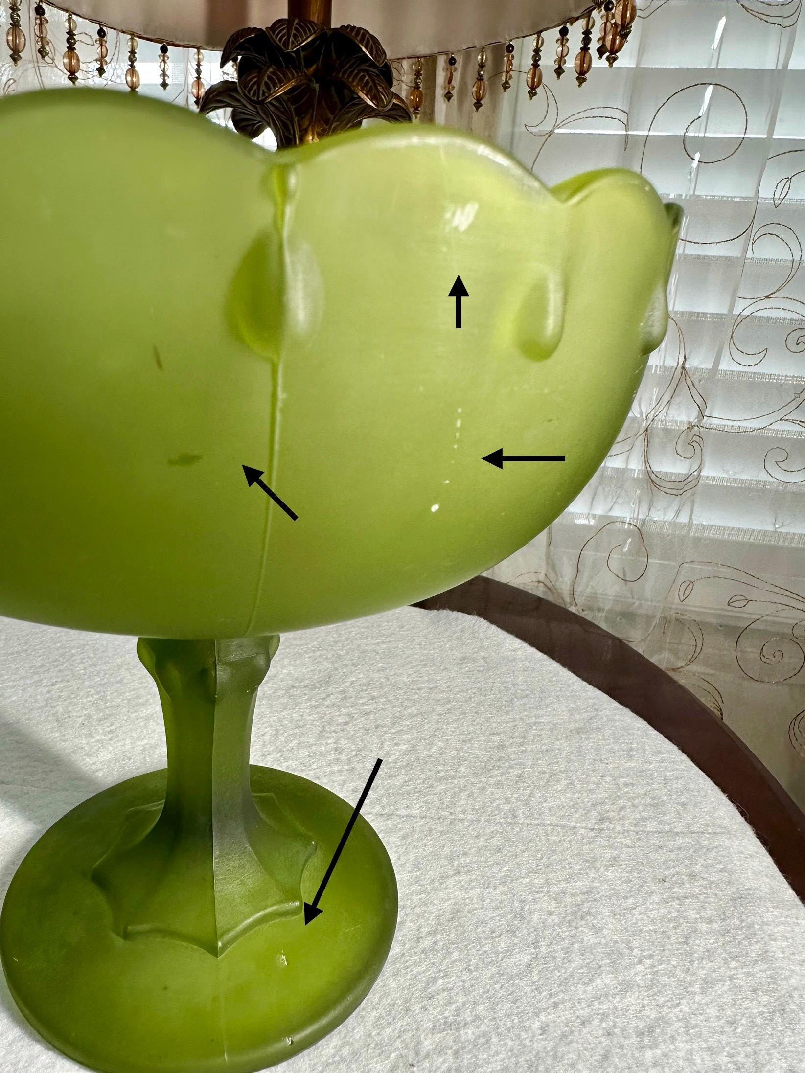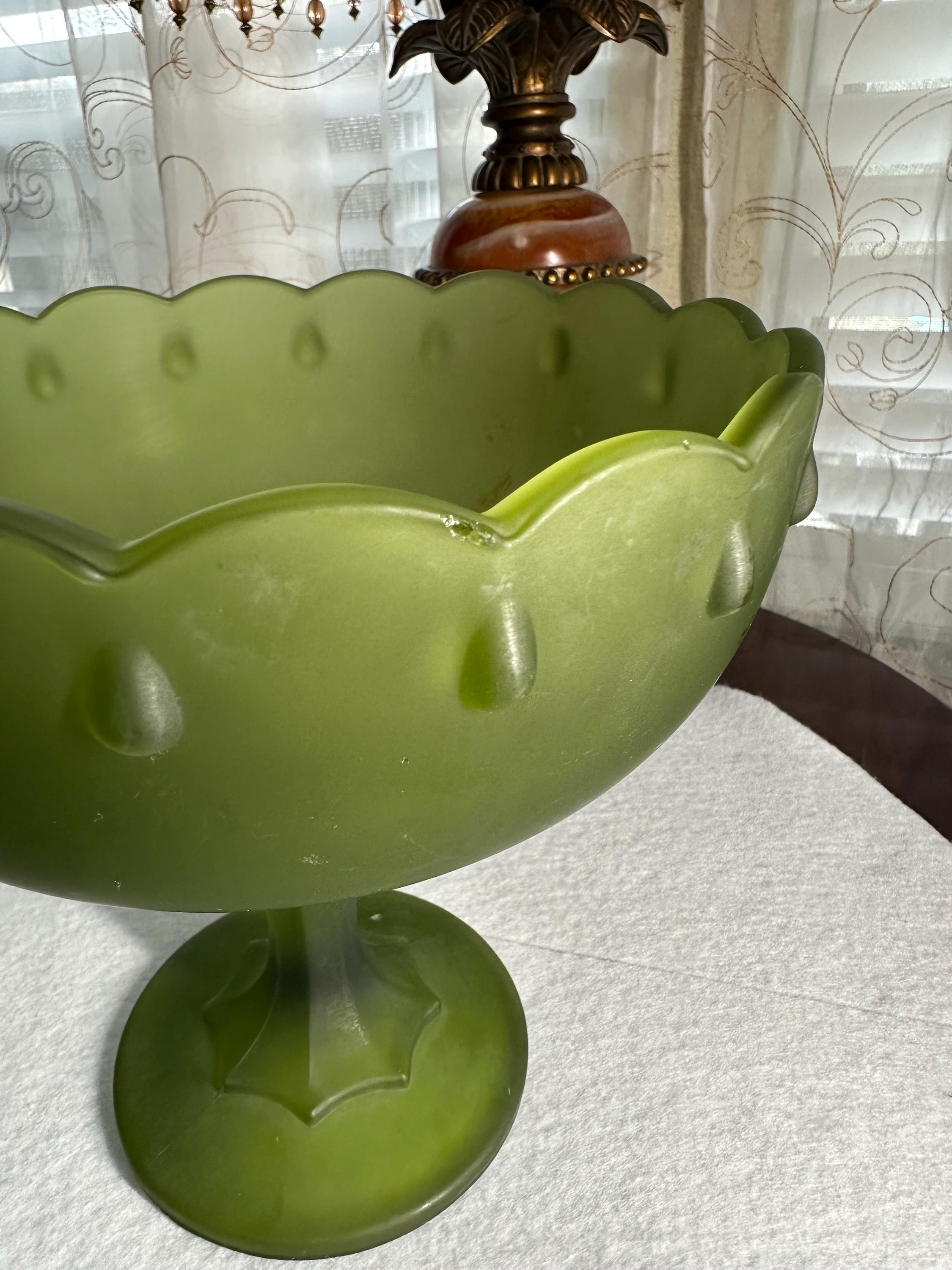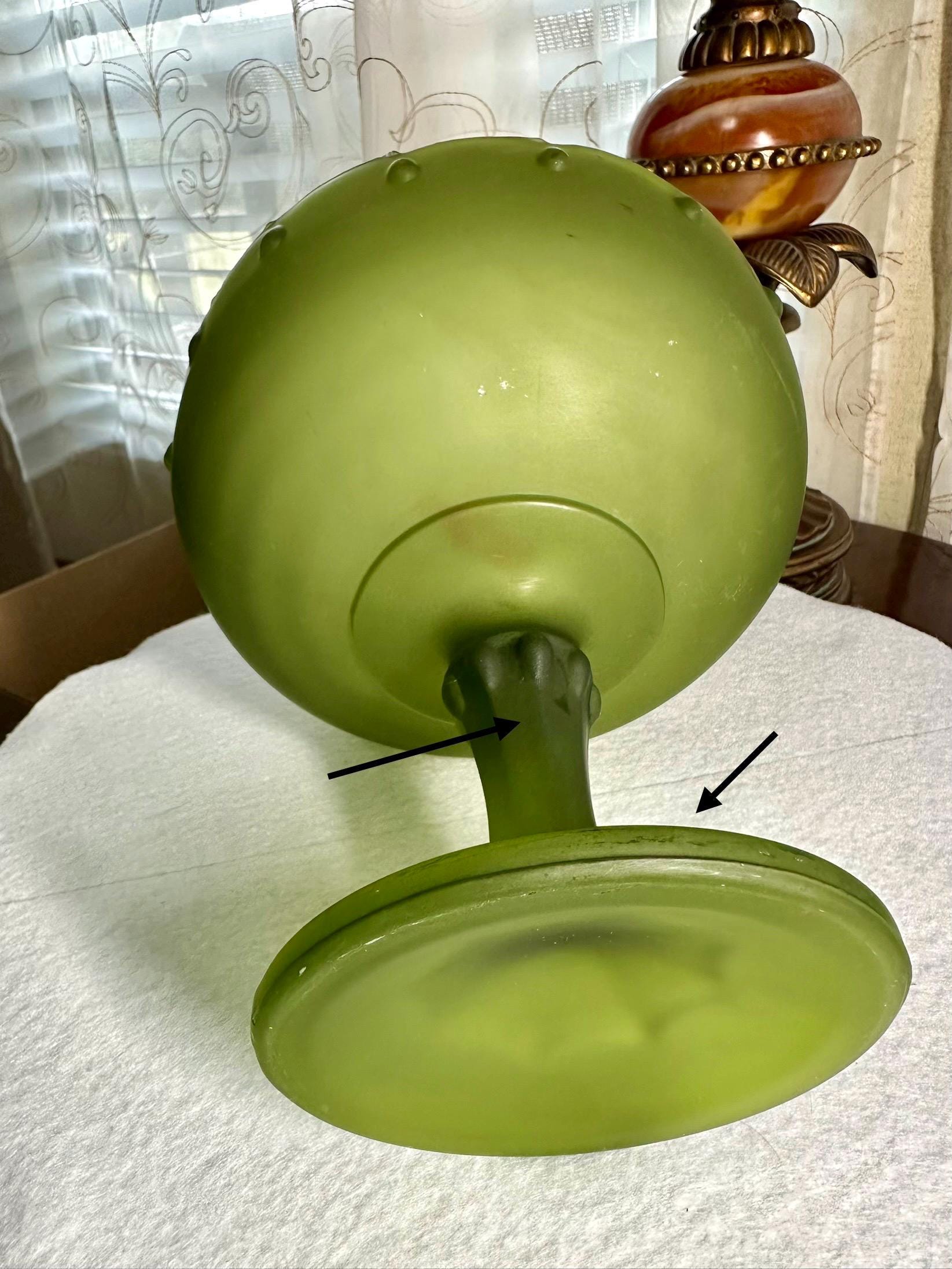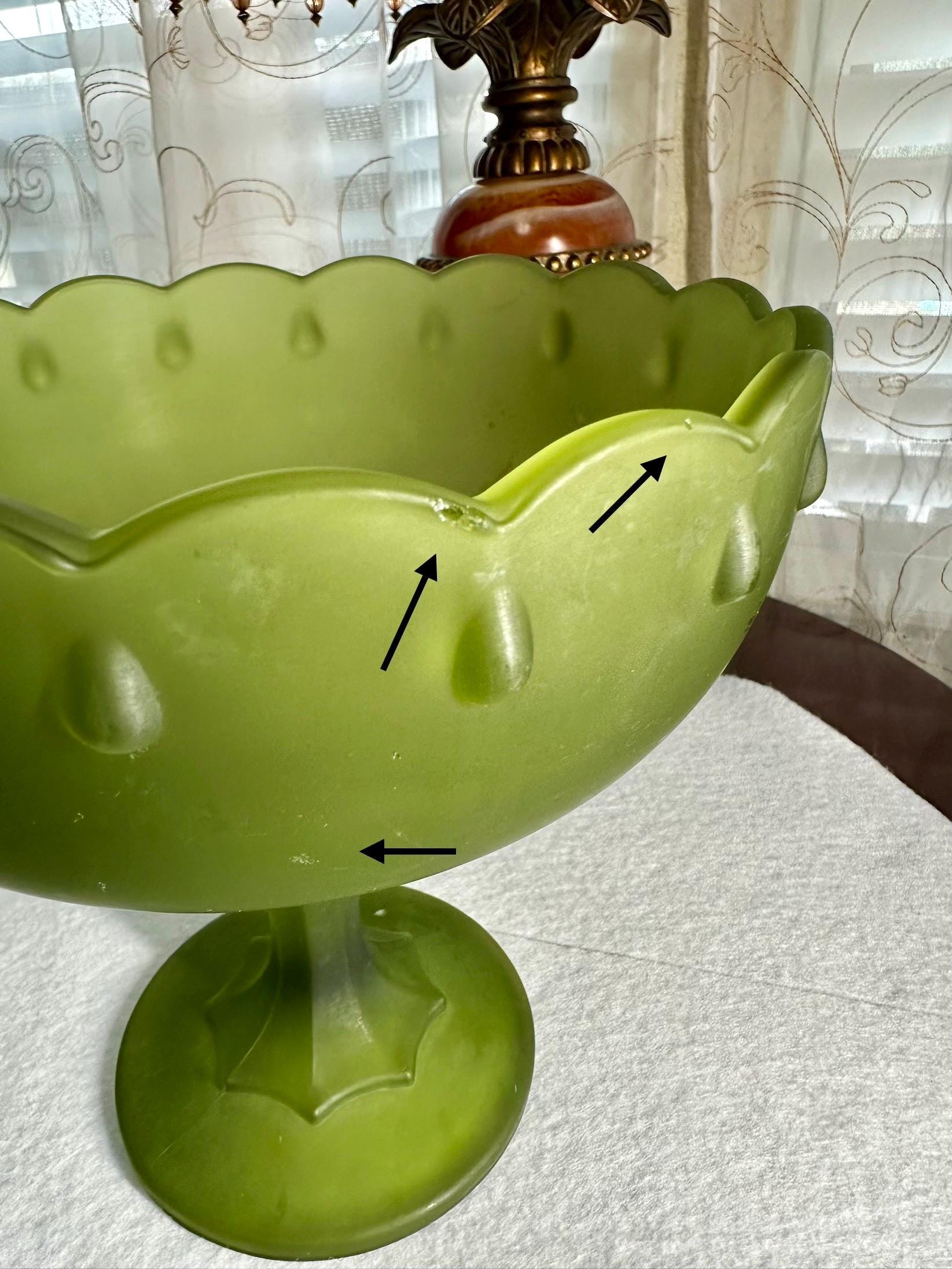 This is a frosted green wedding bowl. This item is a beautiful piece to add to your collection. This item has some blemishes; pictures are all included. There are a few scuffs on this bowl where you can see the frosted areas are no longer frosted. Inside the bowl, there is a stain that I could not get out after washing it. There is a small chip around the rim and on the base of the bowl.