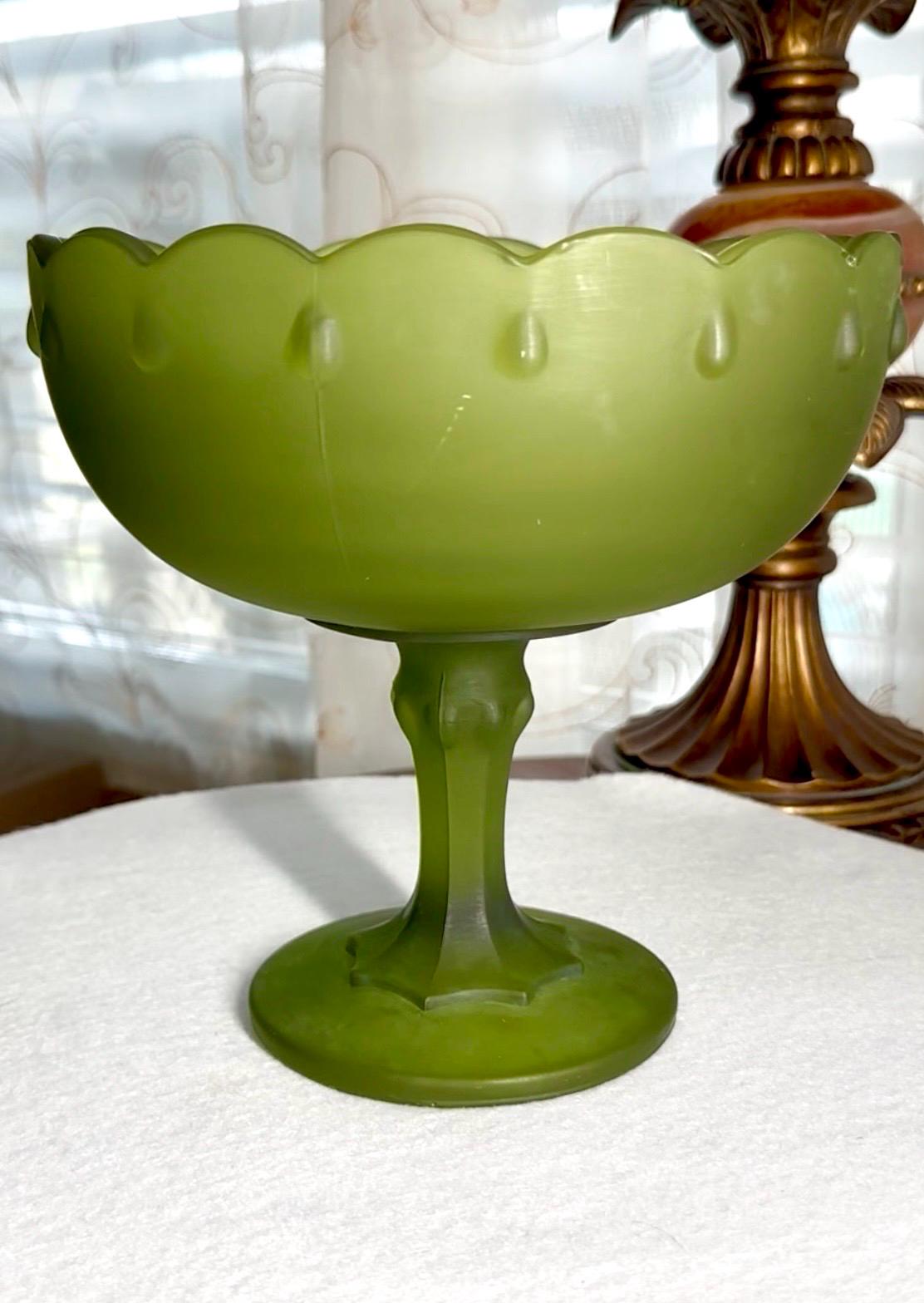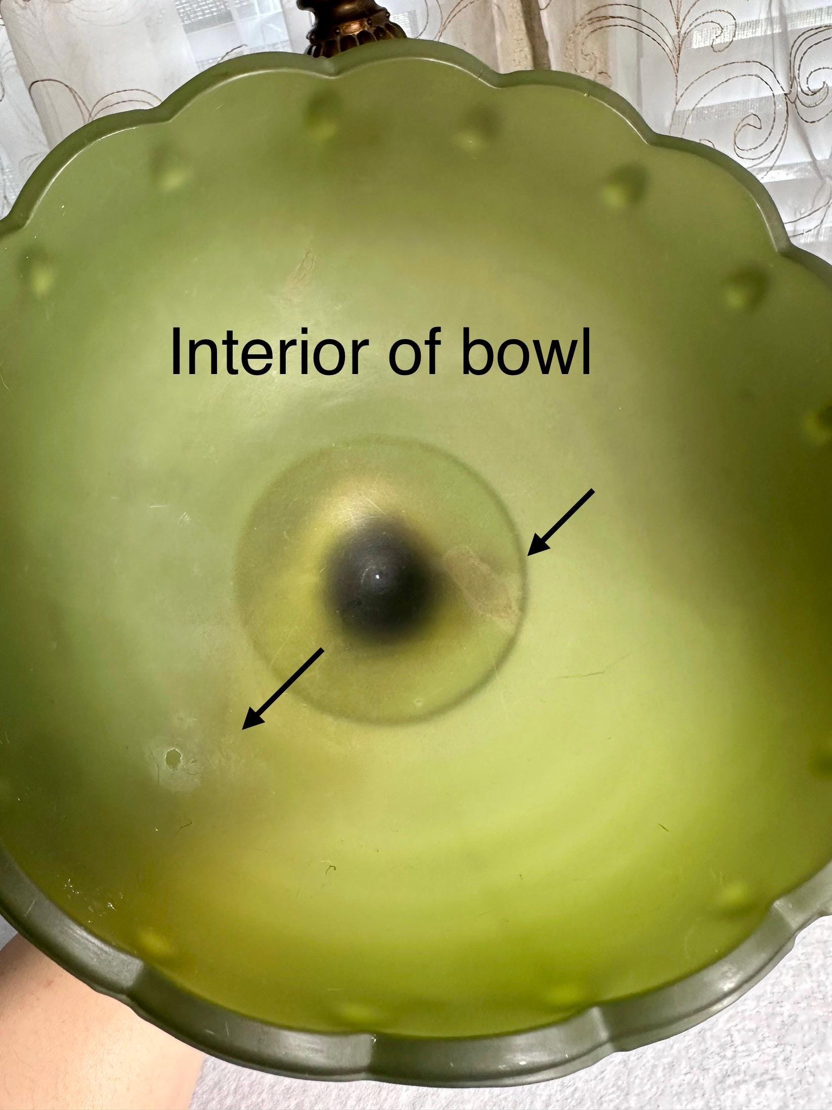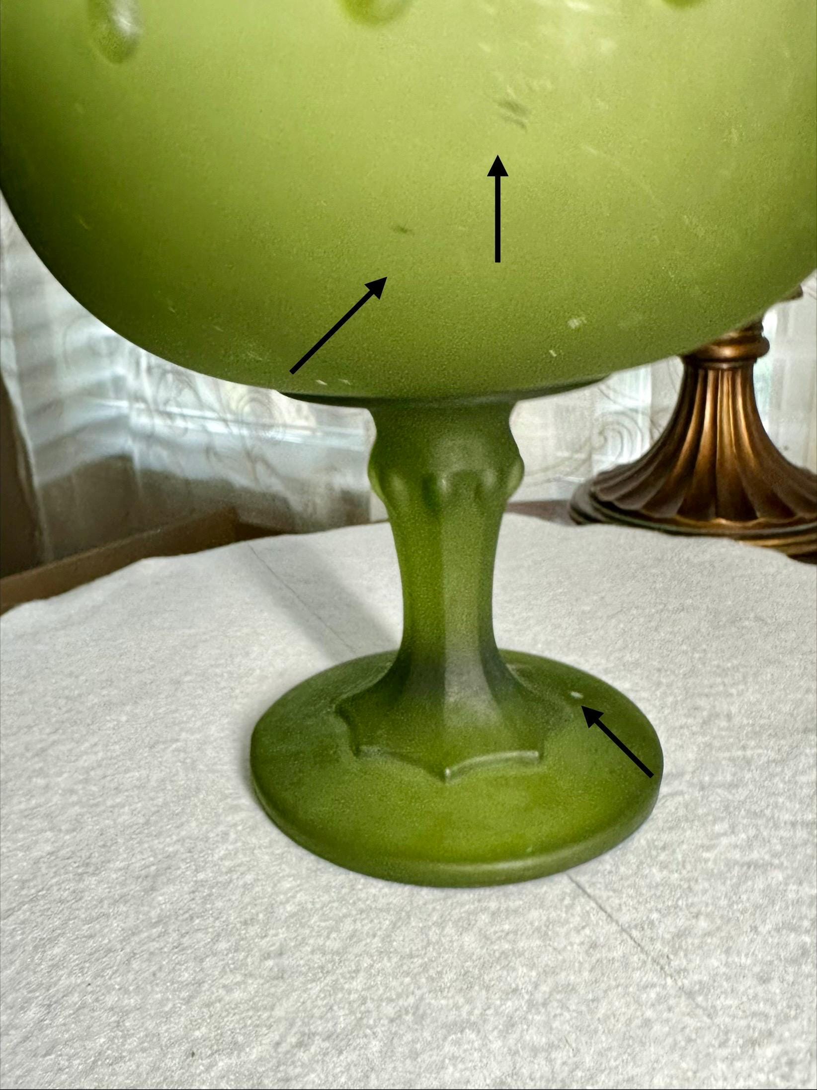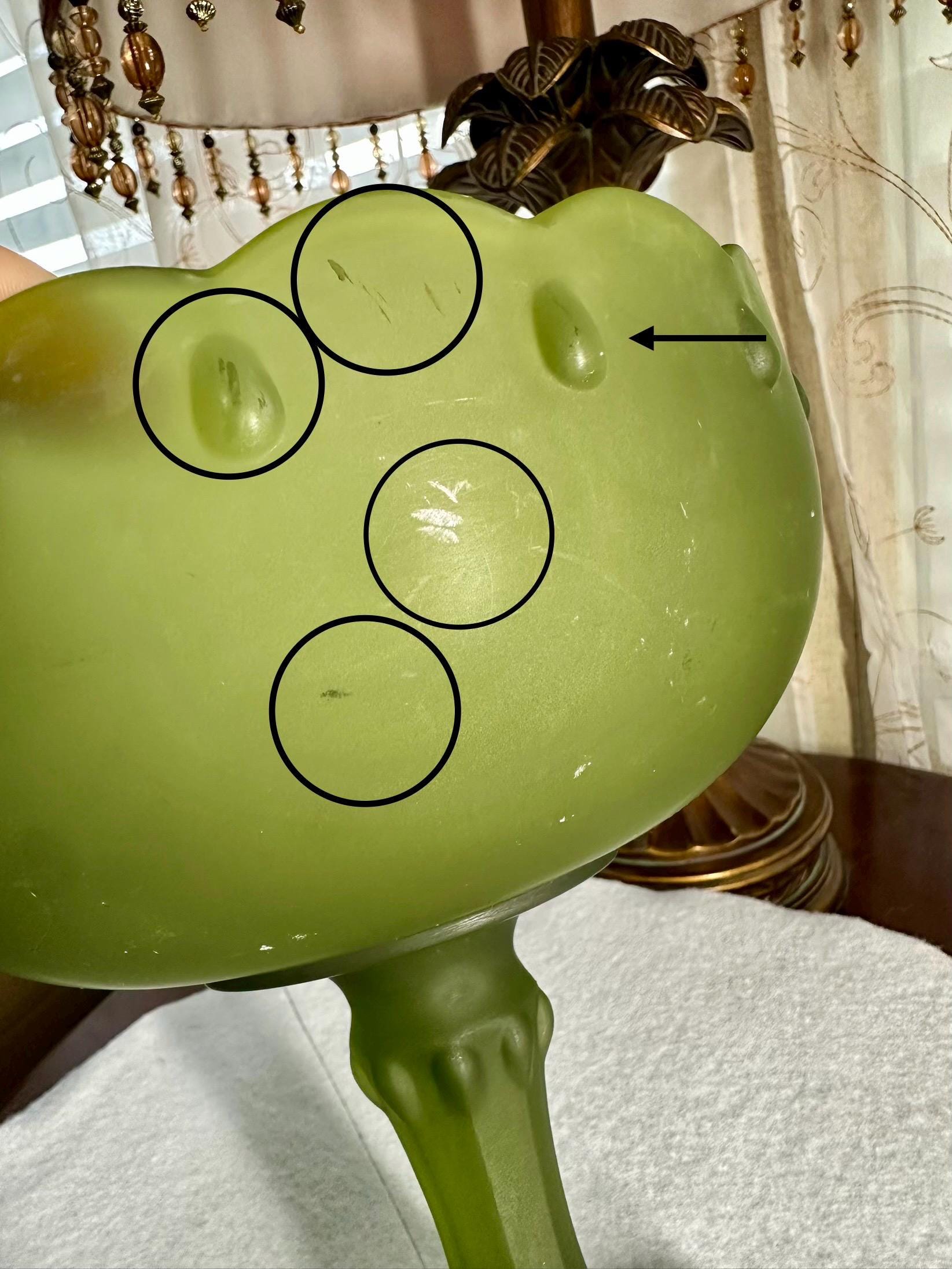 This is a frosted green wedding bowl. This item is a beautiful piece to add to your collection. This item has some blemishes; pictures are all included. There are a few scuffs on this bowl where you can see the frosted areas are no longer frosted. Inside the bowl, there is a stain that I could not get out after washing it. There is a small chip around the rim and on the base of the bowl.