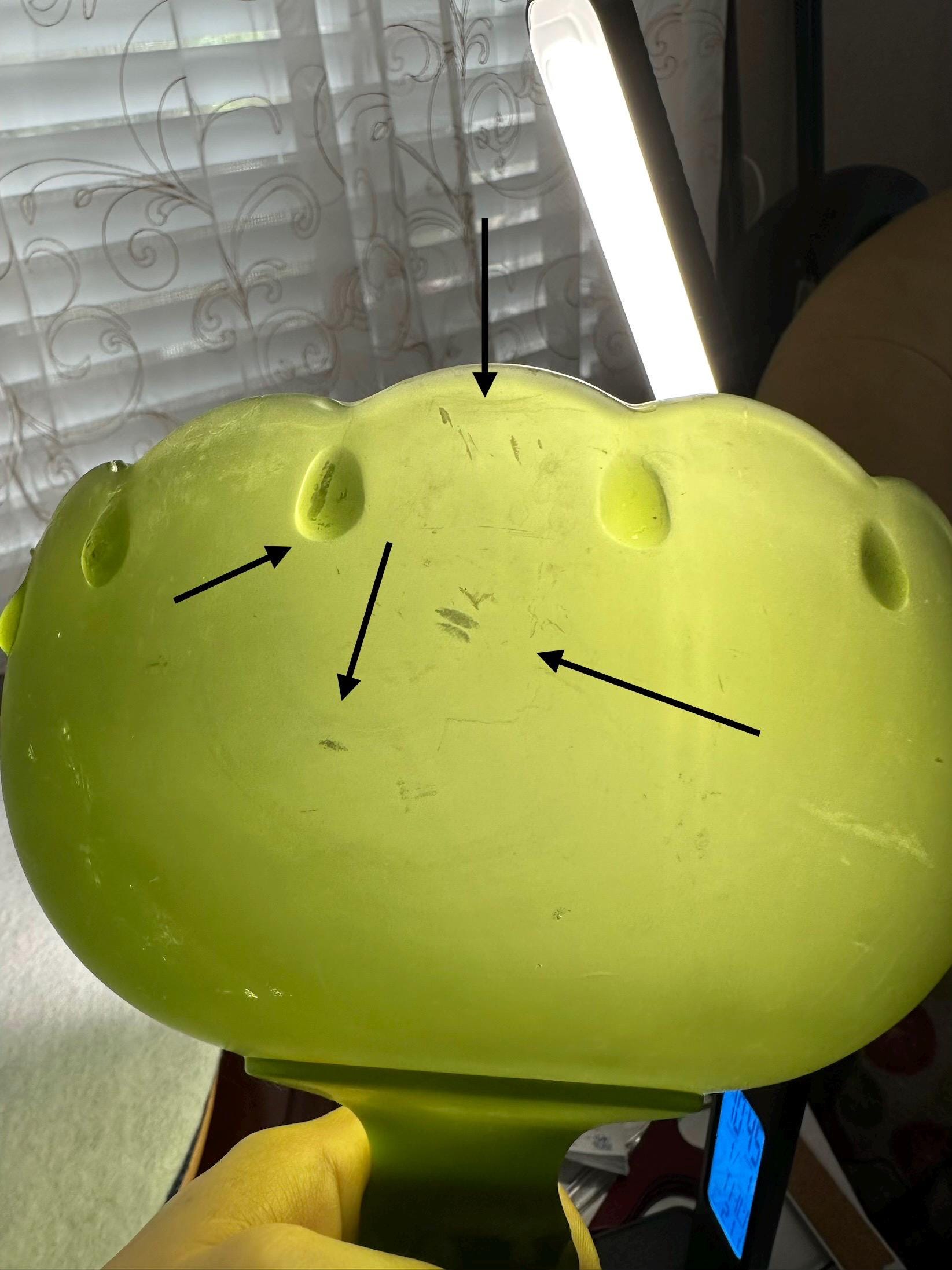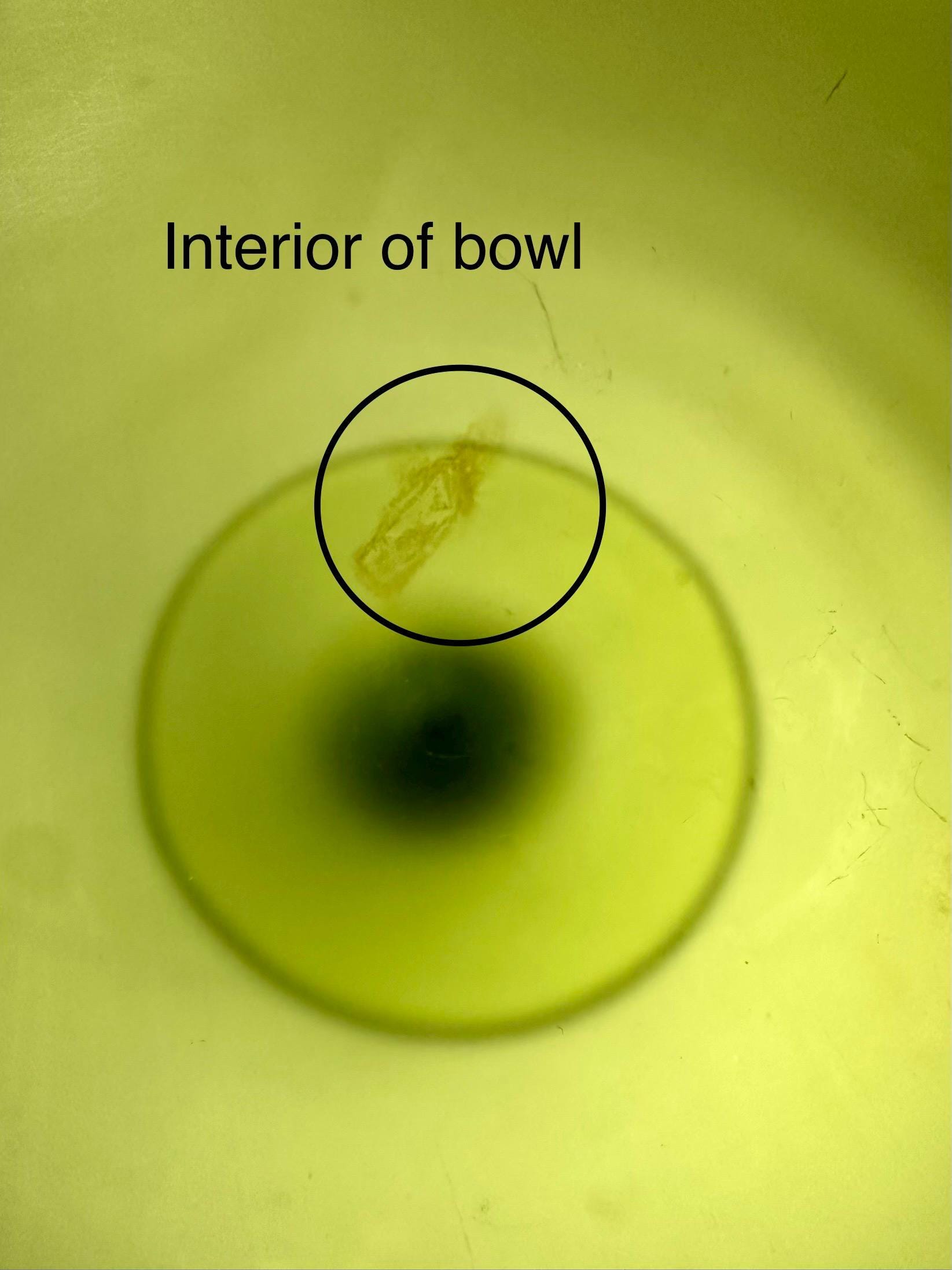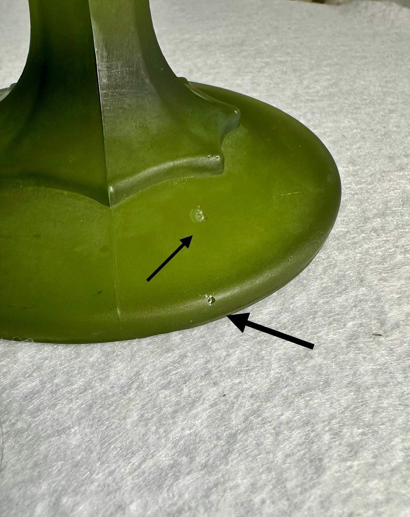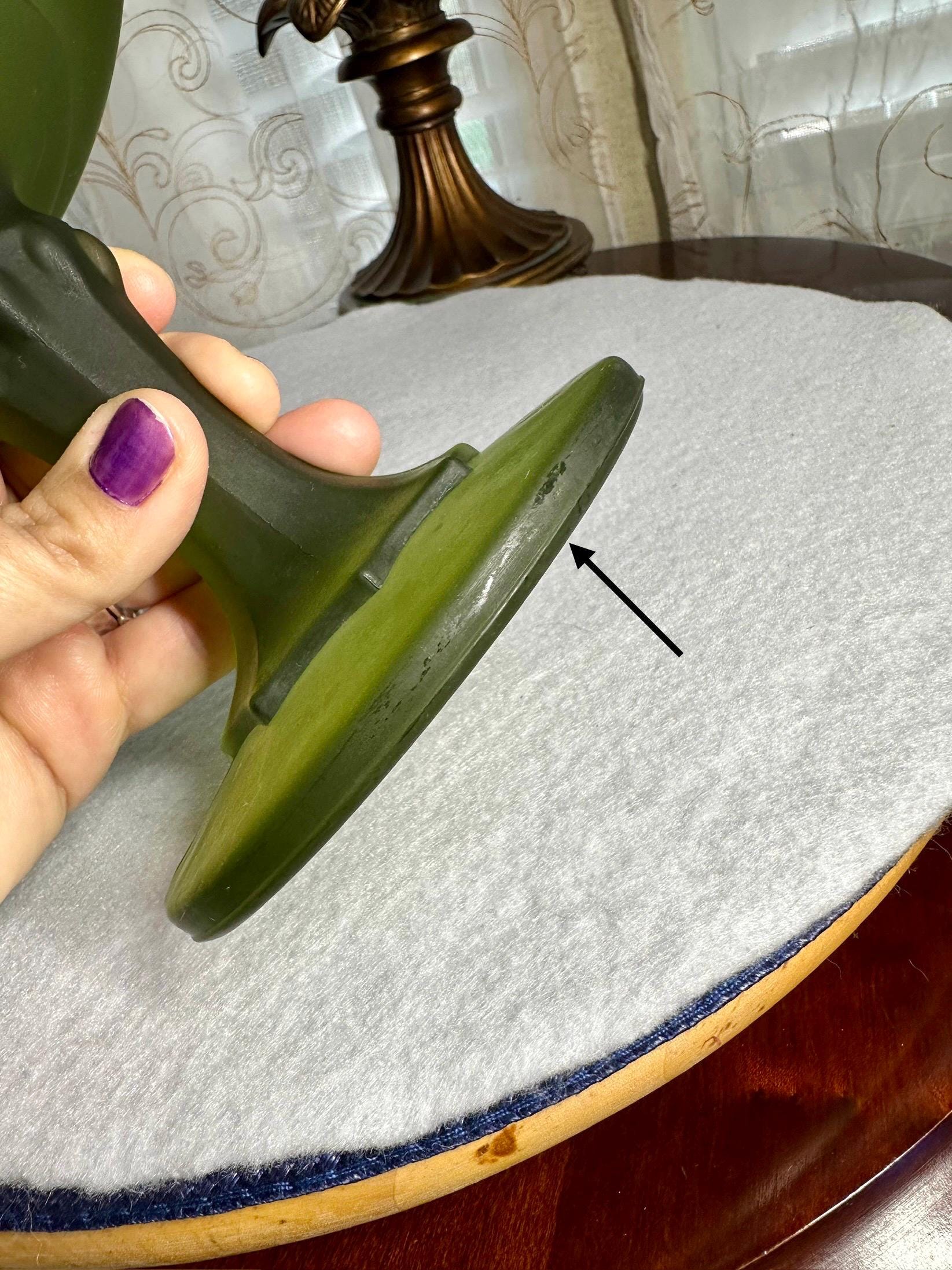 This is a frosted green wedding bowl. This item is a beautiful piece to add to your collection. This item has some blemishes; pictures are all included. There are a few scuffs on this bowl where you can see the frosted areas are no longer frosted. Inside the bowl, there is a stain that I could not get out after washing it. There is a small chip around the rim and on the base of the bowl.