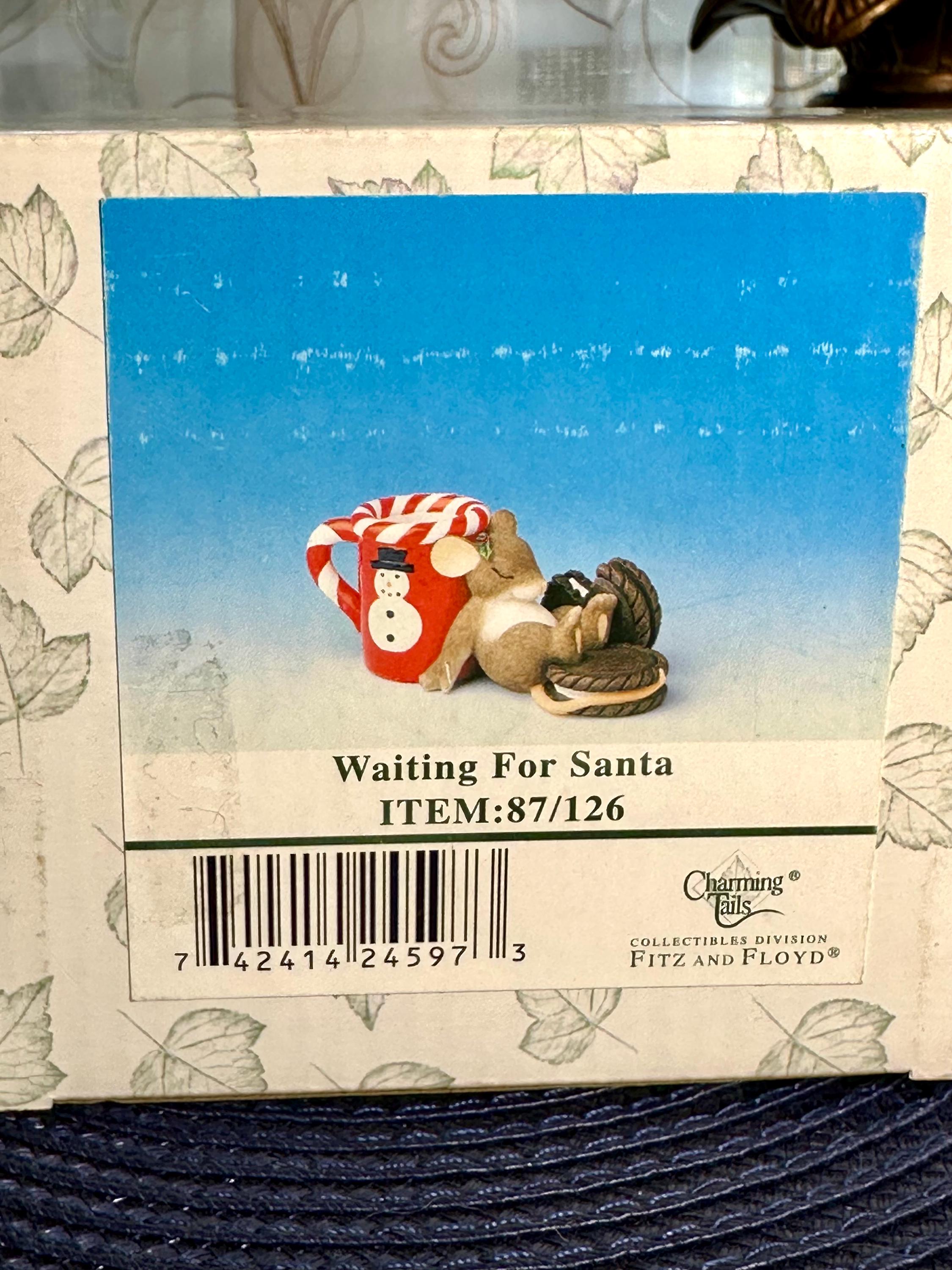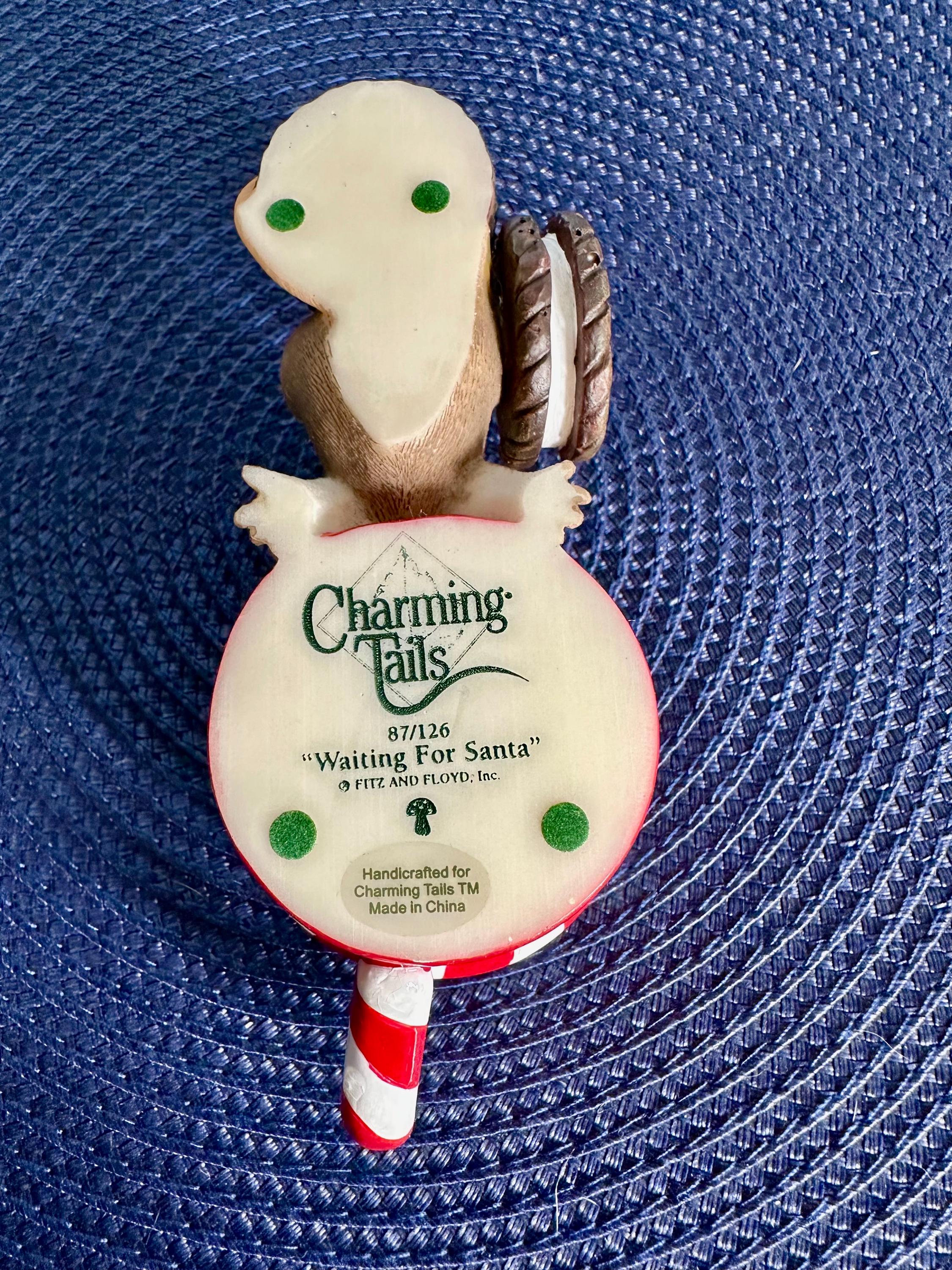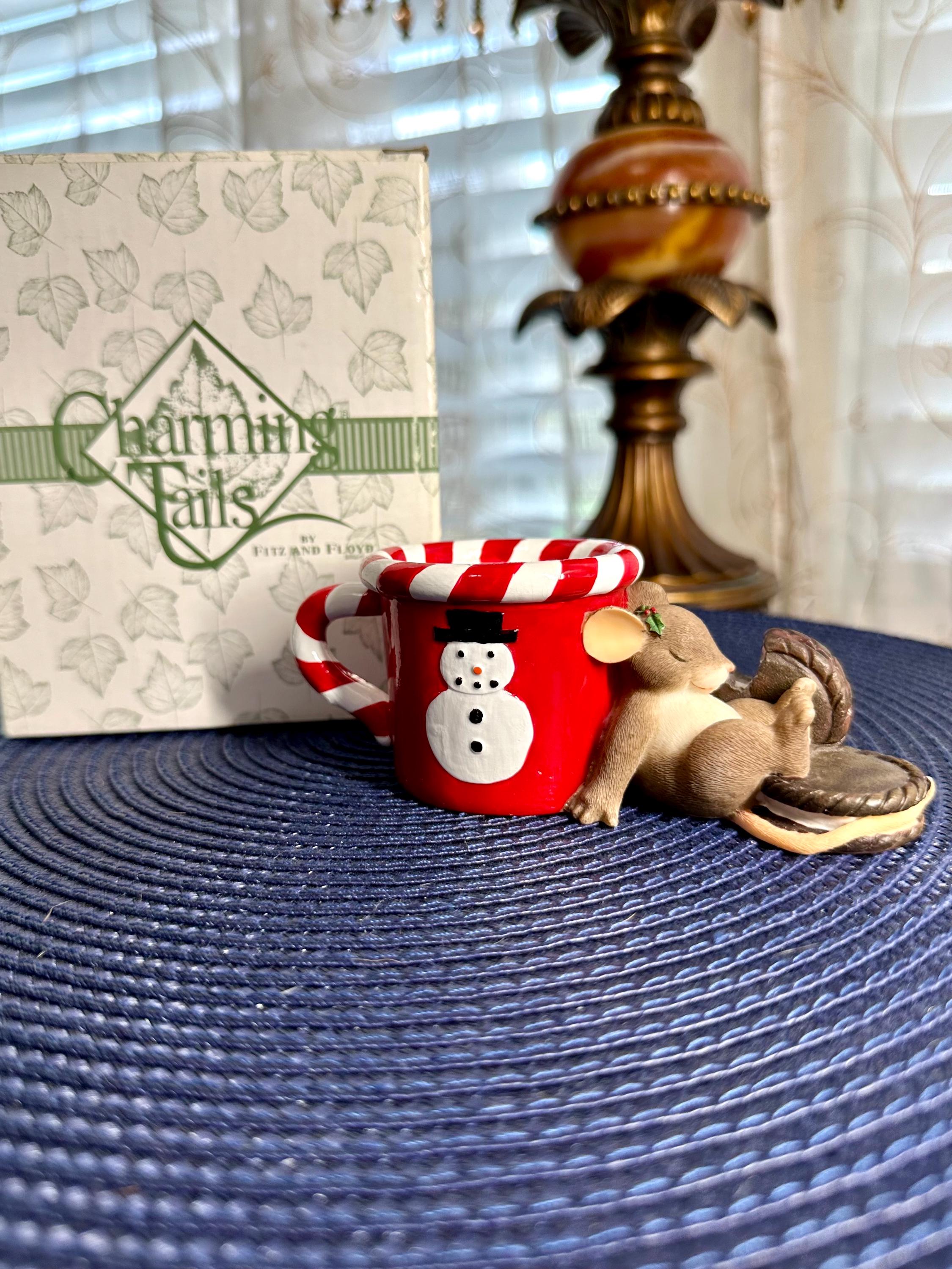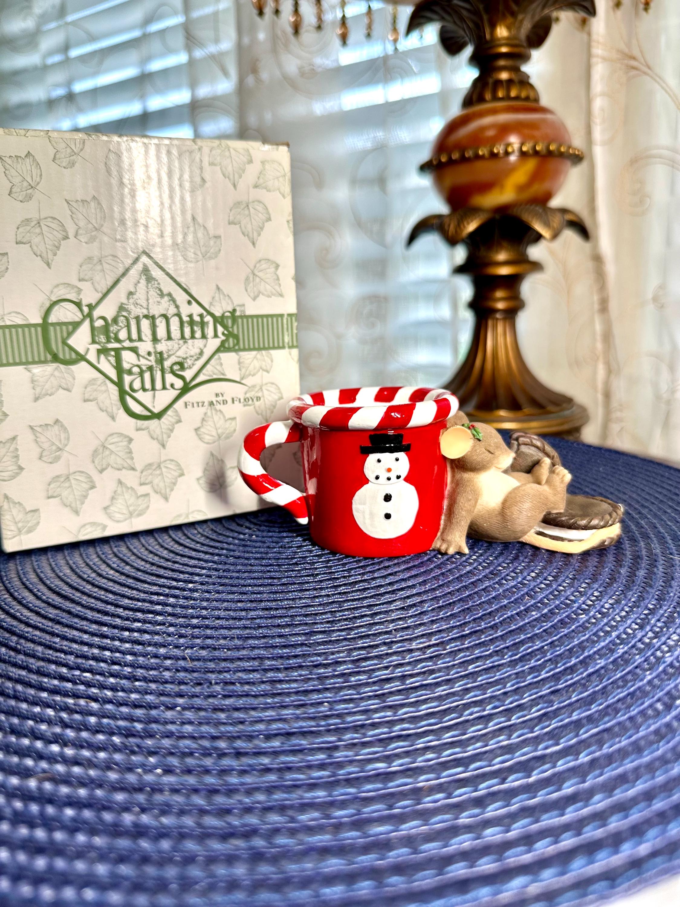 This is from the Charming Tails line by Fitz & Floyd named "Waiting for Santa. This comes with its original box and is in great condition, except for age appropriate crazing on the inside of the mug. There are pictures inclued. This is a porcelain and resign figurine designed by Dean Griff. This cute little mouse resting on a red mug stands at 2 inches tall and 5 inches wide. If you have any questions please contact us prior to purchasing.