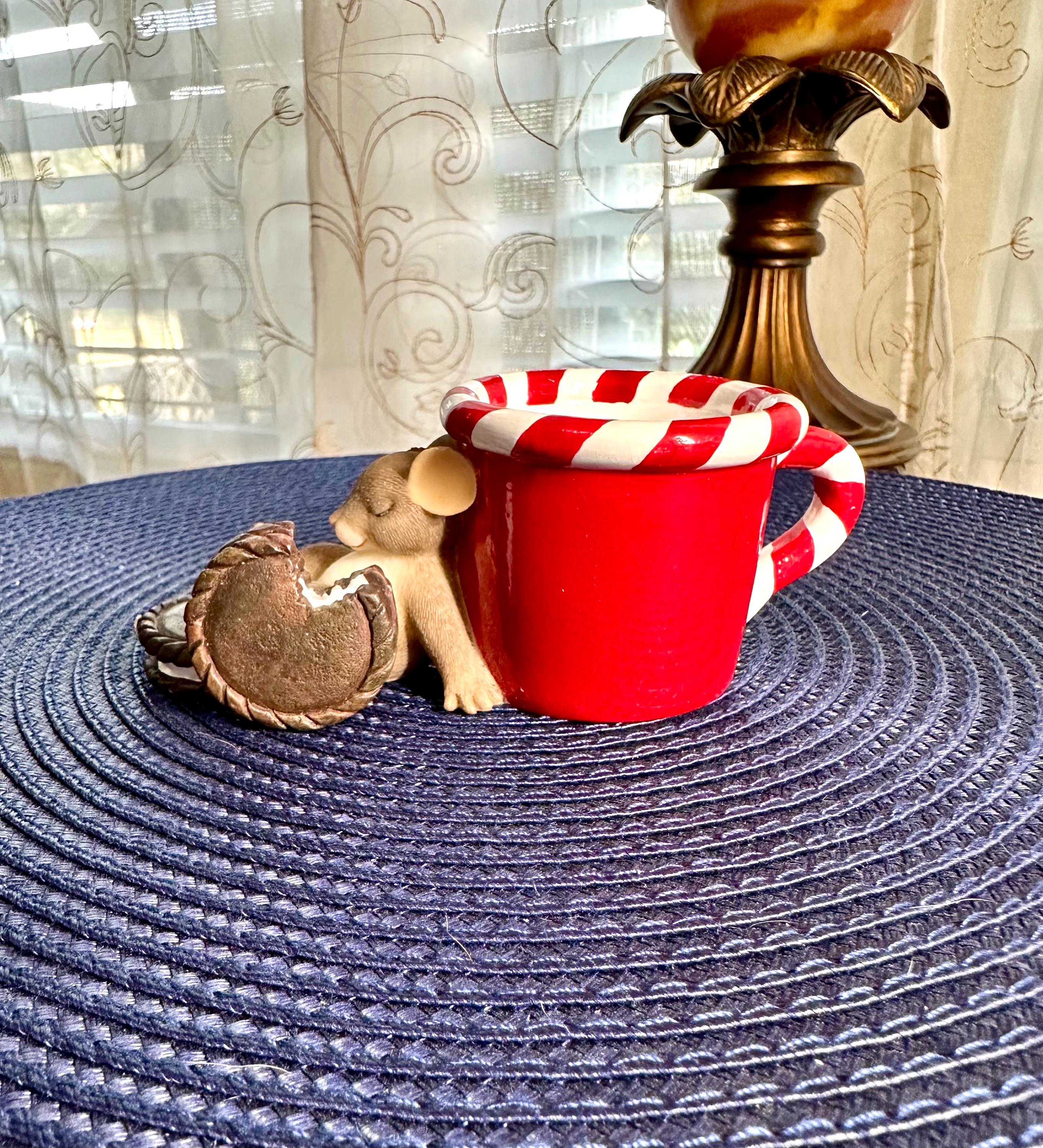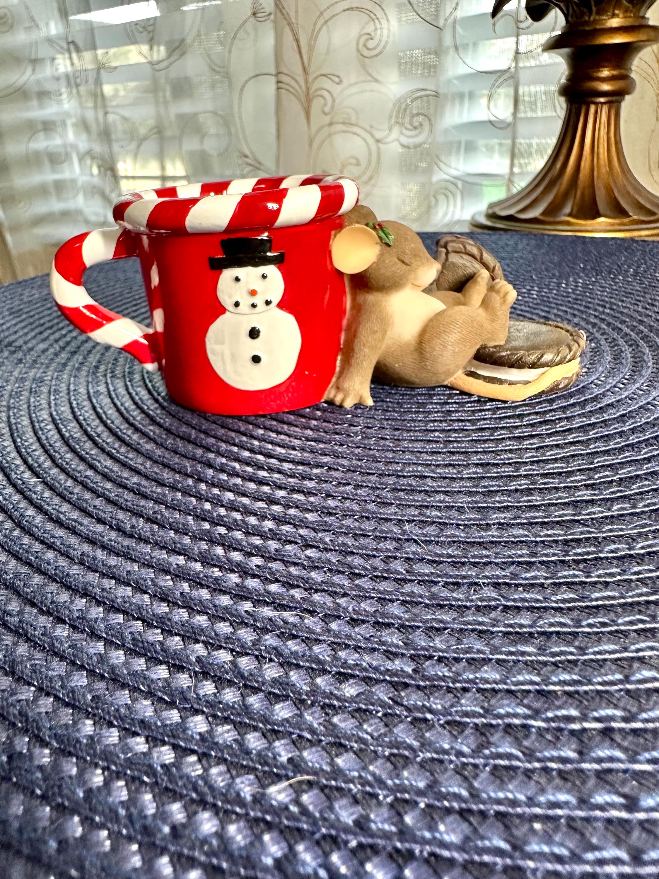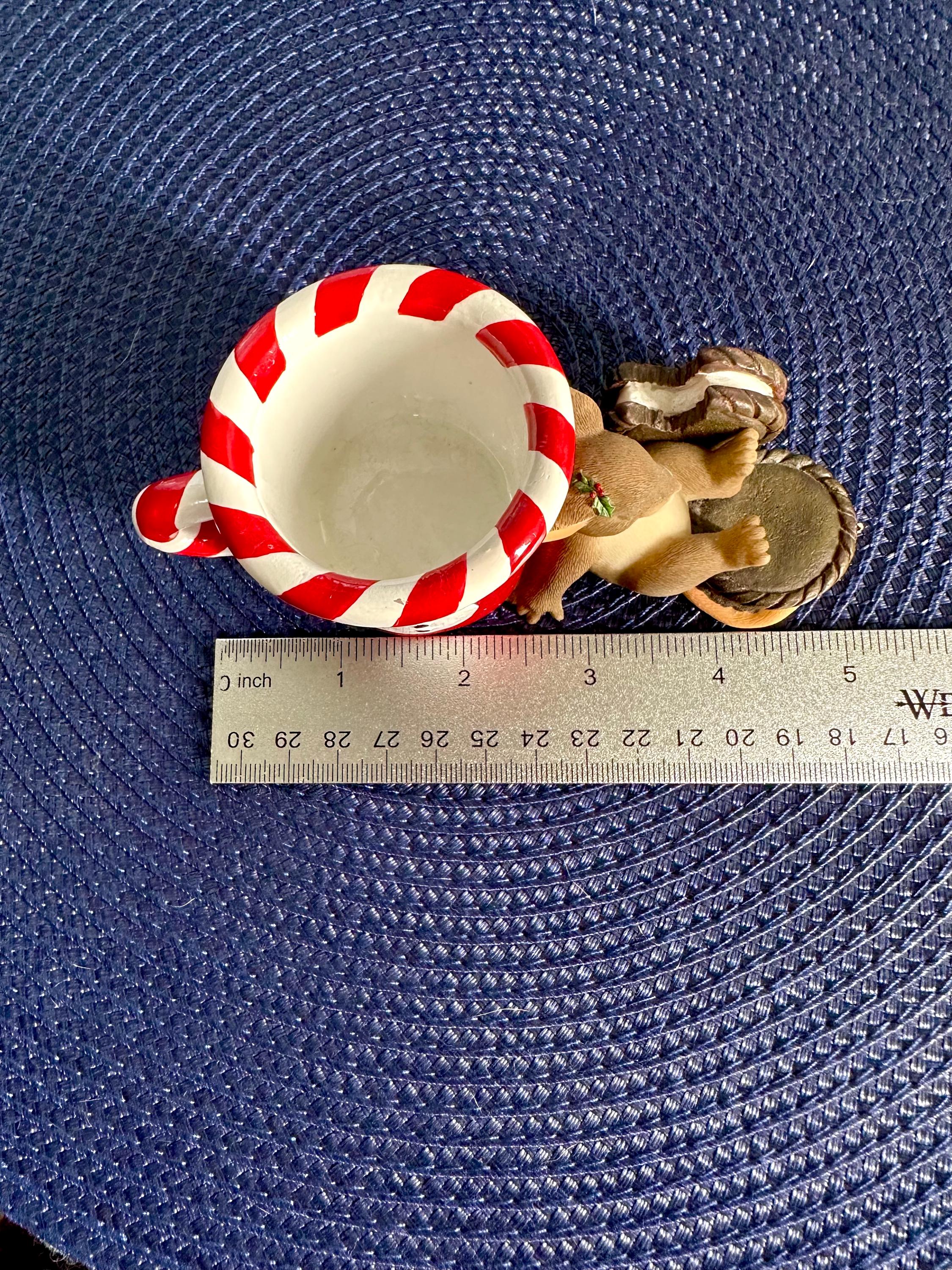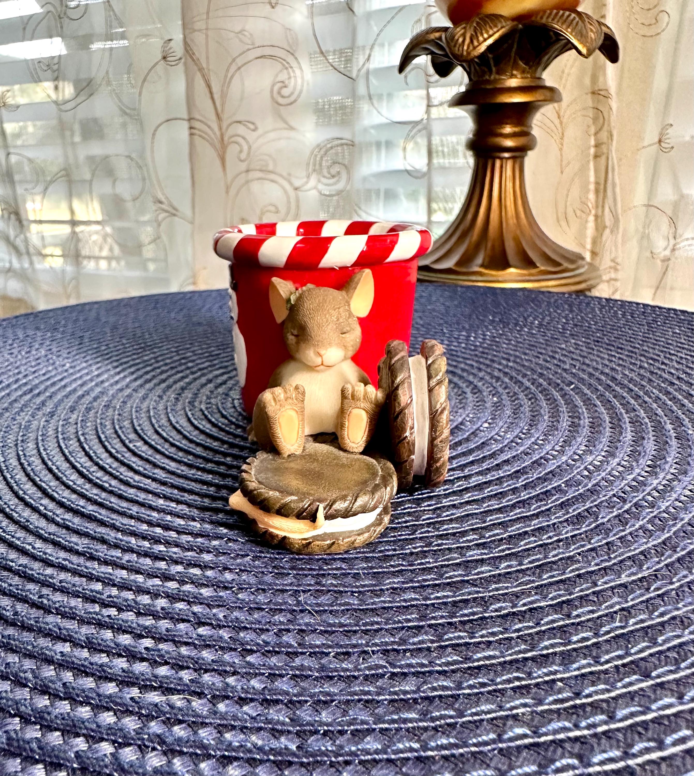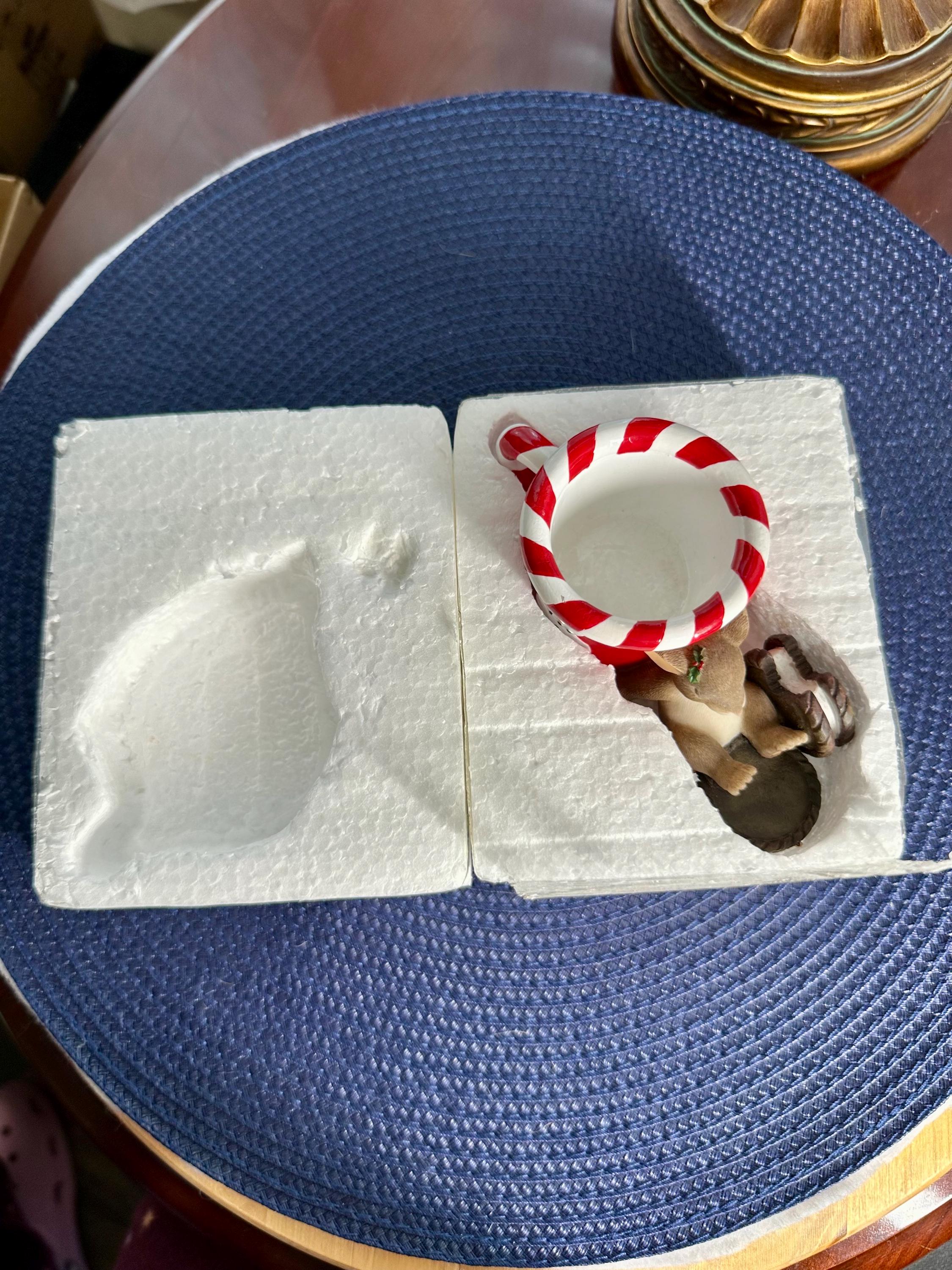 This is from the Charming Tails line by Fitz & Floyd named "Waiting for Santa. This comes with its original box and is in great condition, except for age appropriate crazing on the inside of the mug. There are pictures inclued. This is a porcelain and resign figurine designed by Dean Griff. This cute little mouse resting on a red mug stands at 2 inches tall and 5 inches wide. If you have any questions please contact us prior to purchasing.