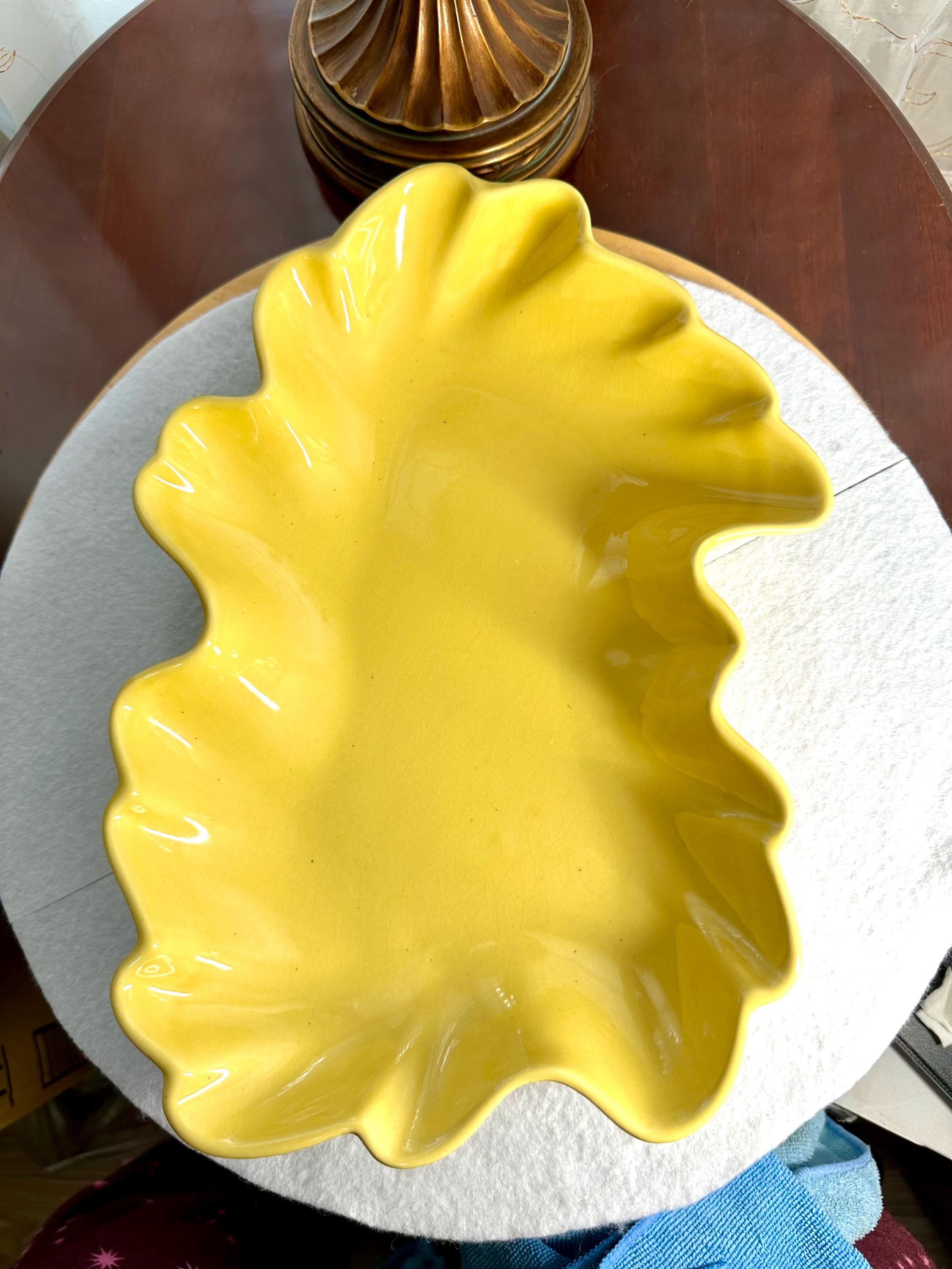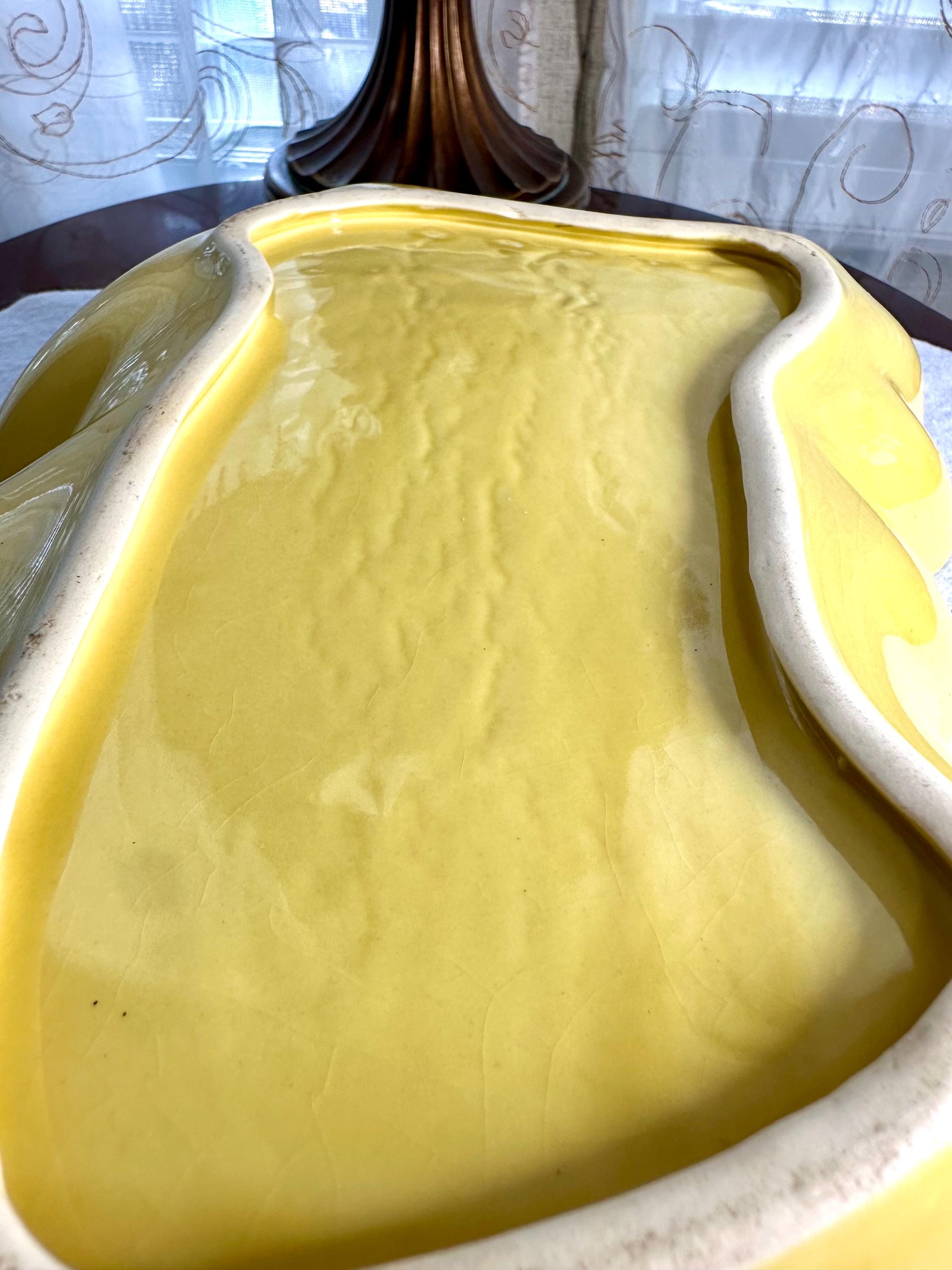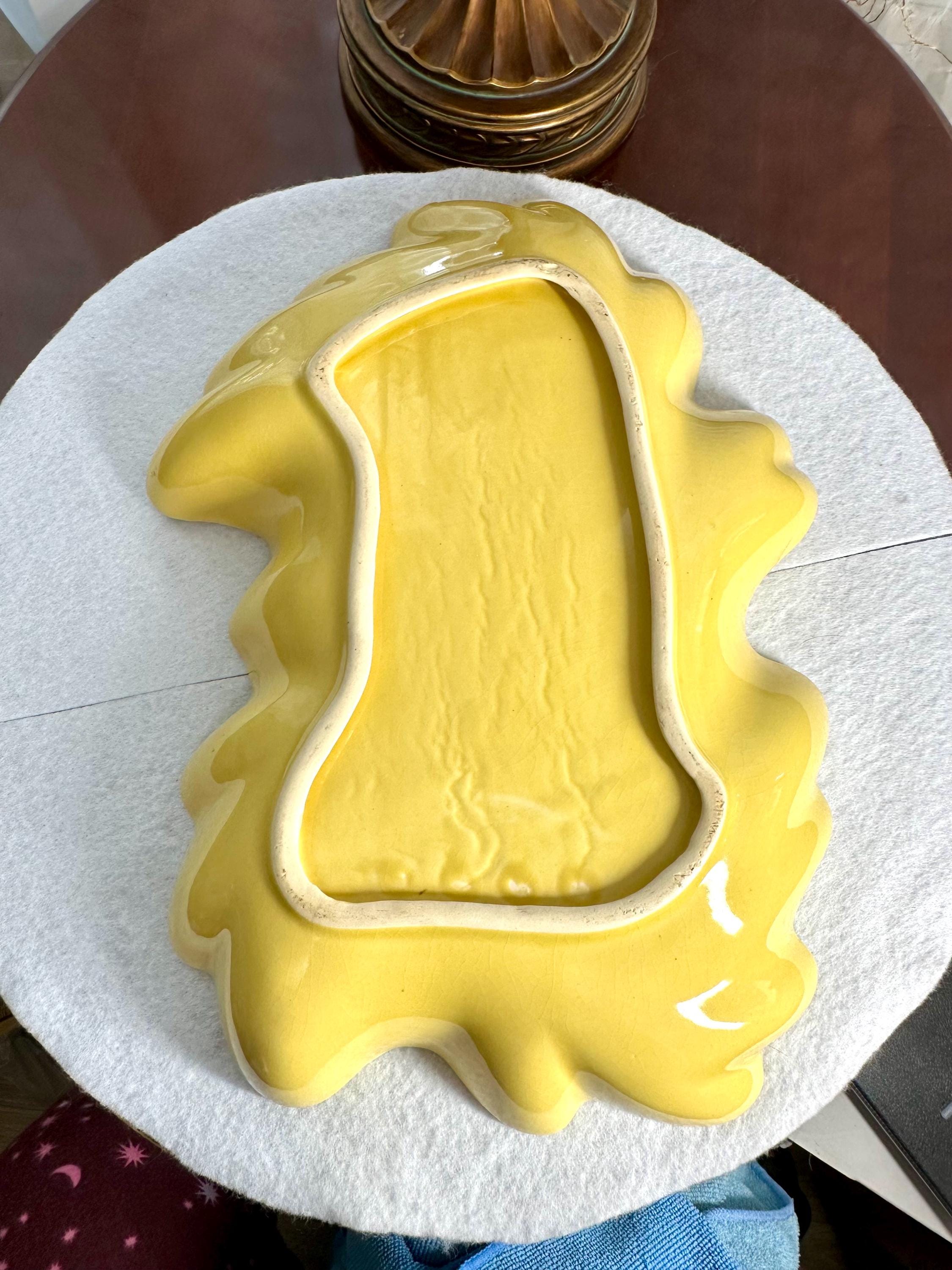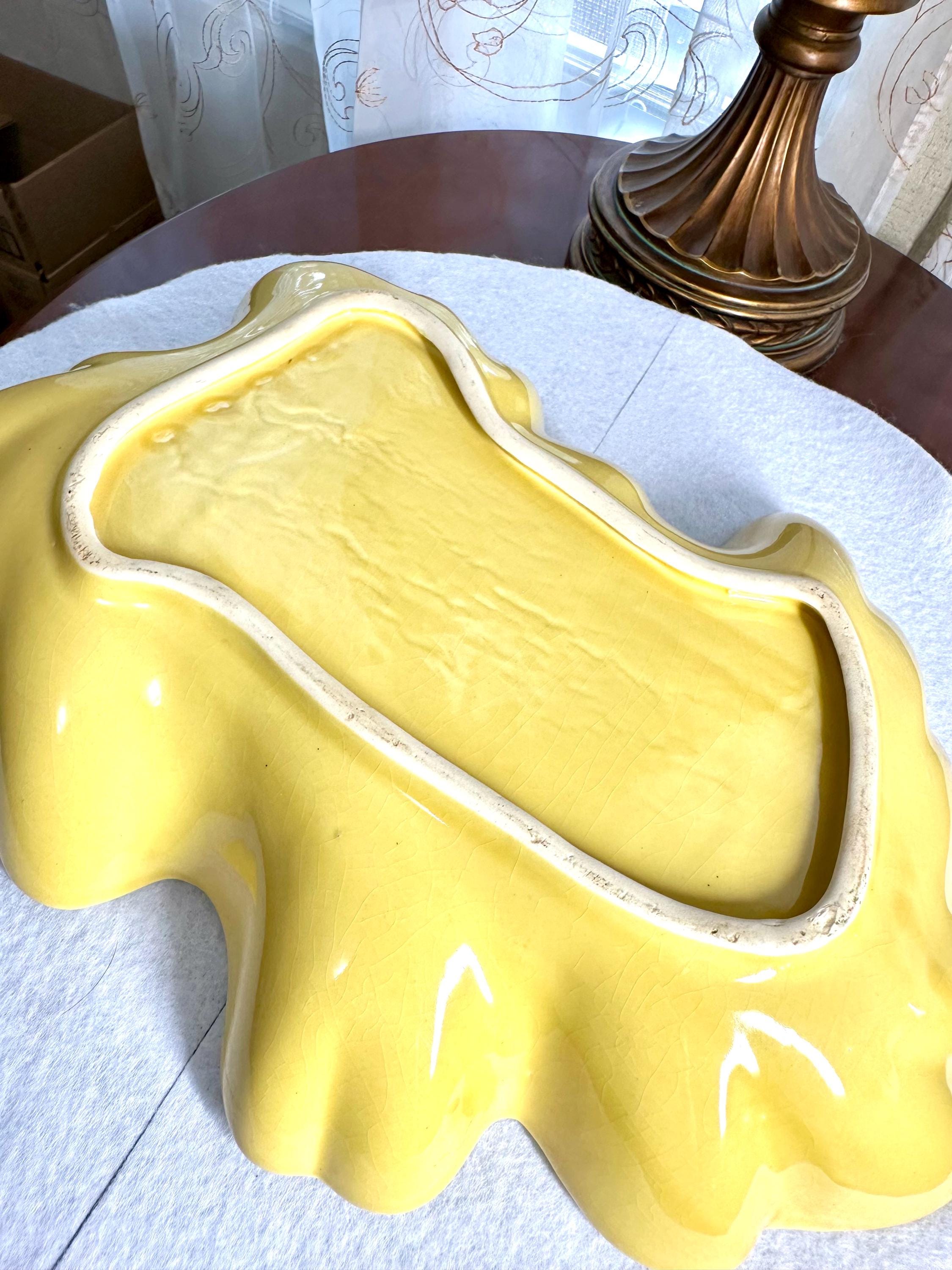 This is a Mid-Century Modern Yellow Serving Platter that I am ready to go to a new home. This is a beautiful banana yellow platter that is 13 1/2 inches long and 9 1/2 inches wide. This does have some black specs on the bottom of the platter, but it appears that it was something that was there when they made the platter. There is some age-appropriate crazing on this serving dish. The bottom of this has chipping where it is not glazed around the edges, where it is placed down on the counters.