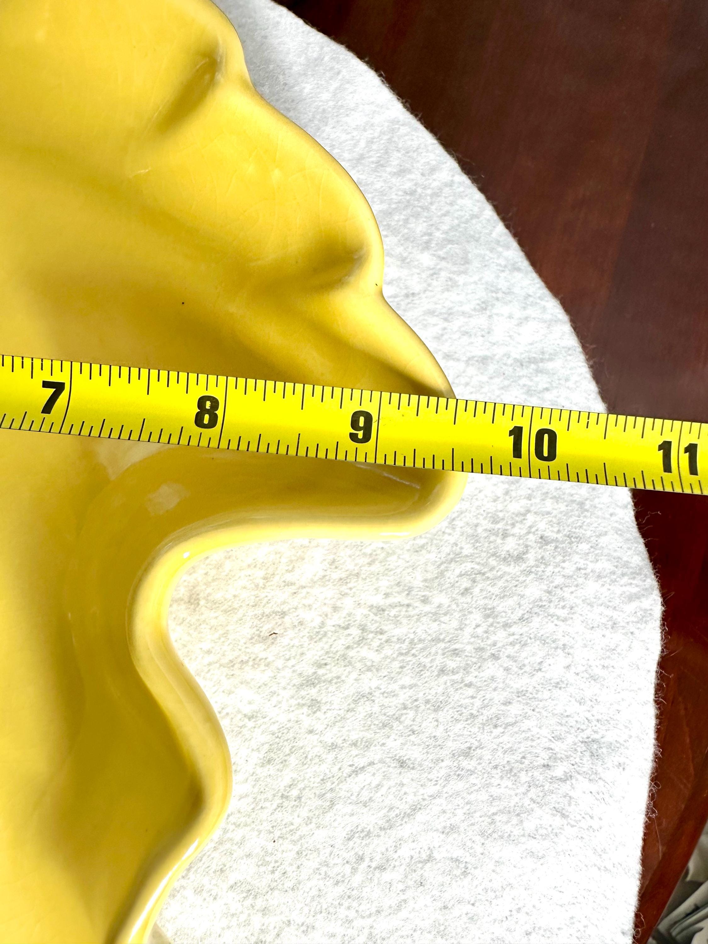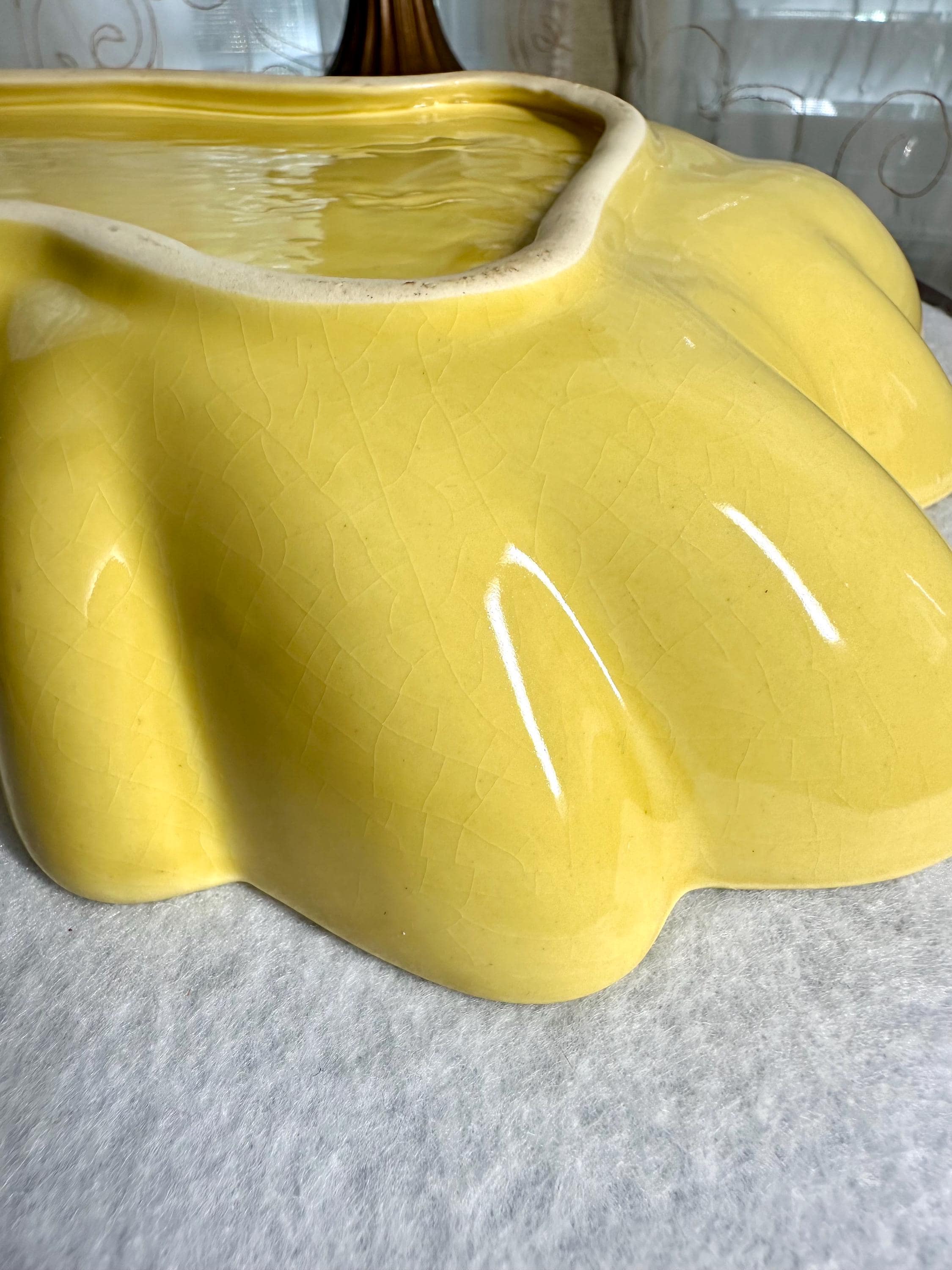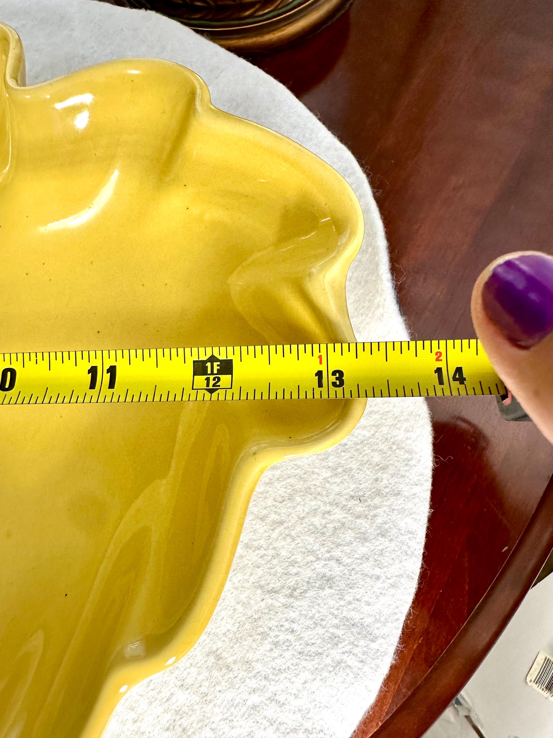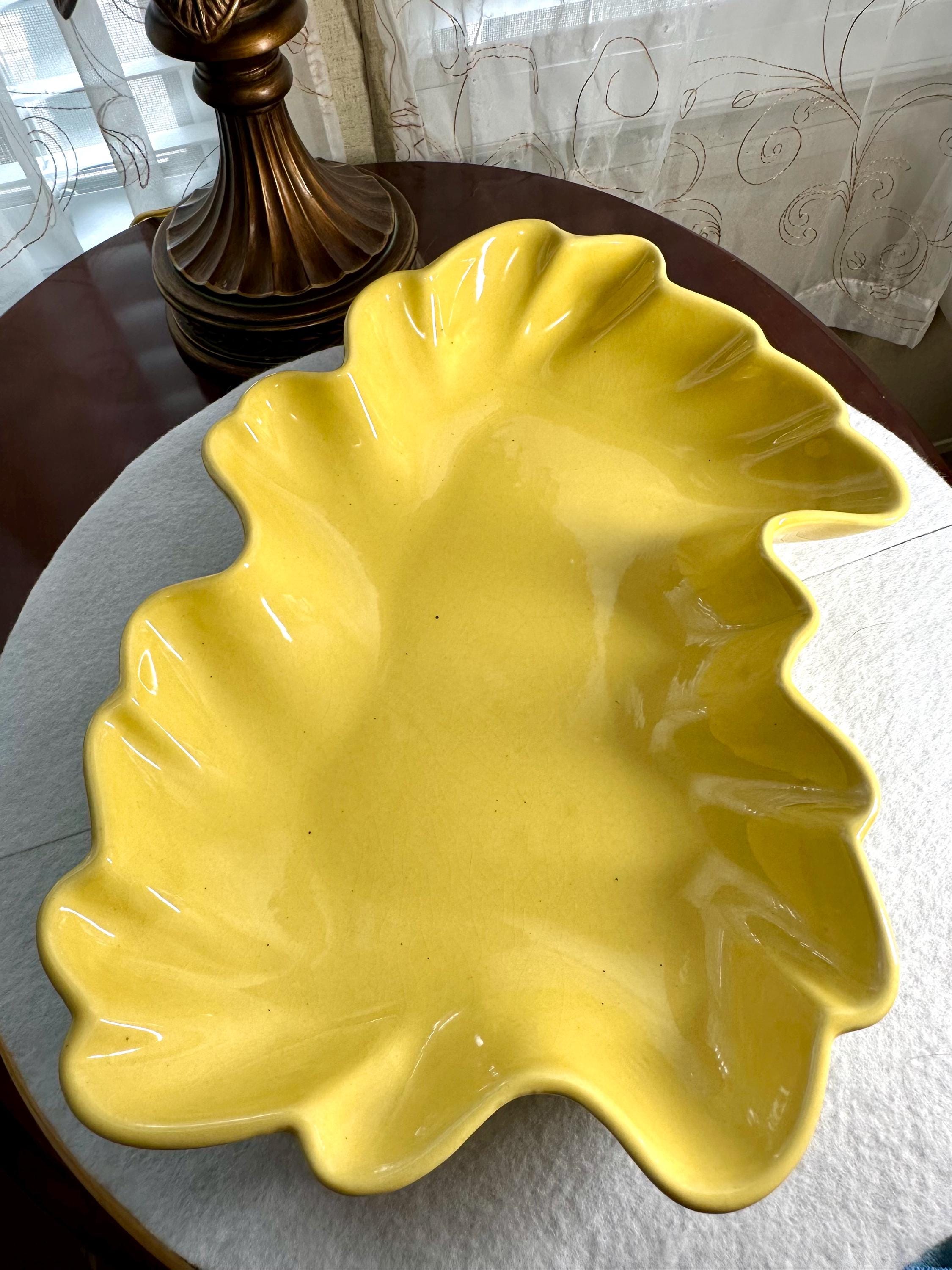 This is a Mid-Century Modern Yellow Serving Platter that I am ready to go to a new home. This is a beautiful banana yellow platter that is 13 1/2 inches long and 9 1/2 inches wide. This does have some black specs on the bottom of the platter, but it appears that it was something that was there when they made the platter. There is some age-appropriate crazing on this serving dish. The bottom of this has chipping where it is not glazed around the edges, where it is placed down on the counters.