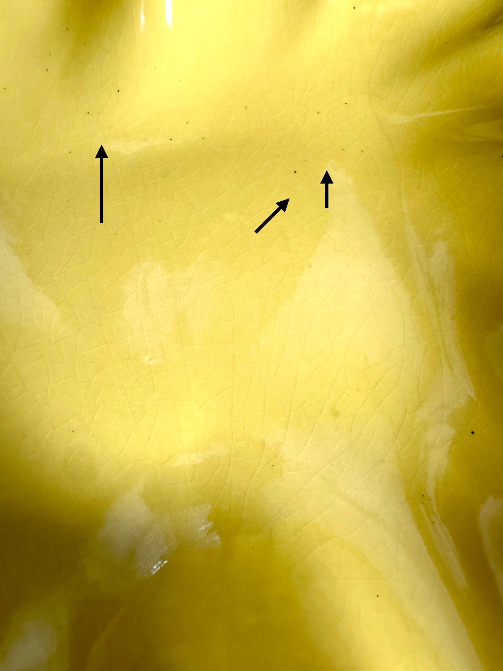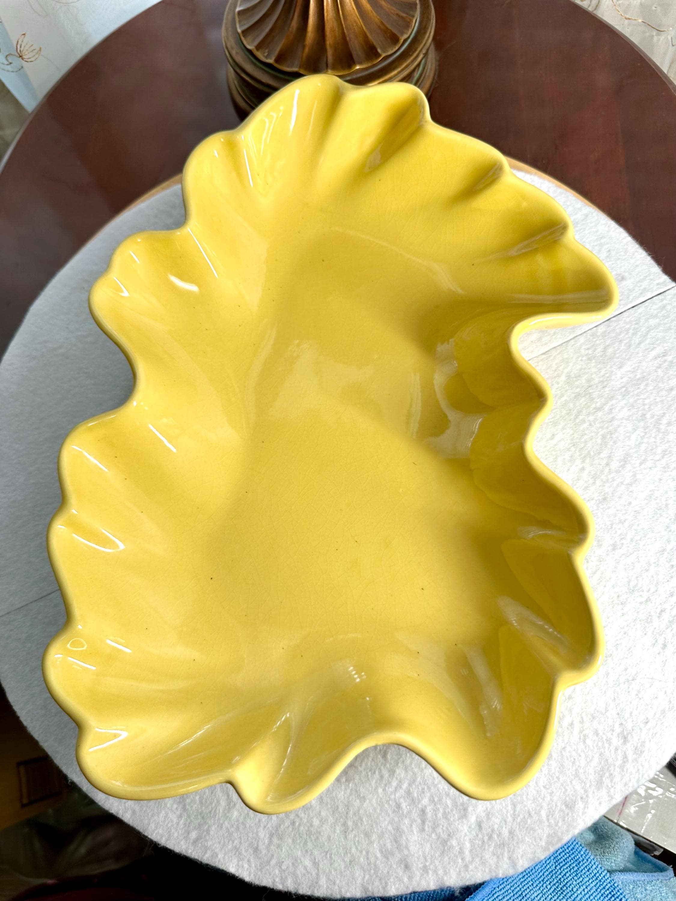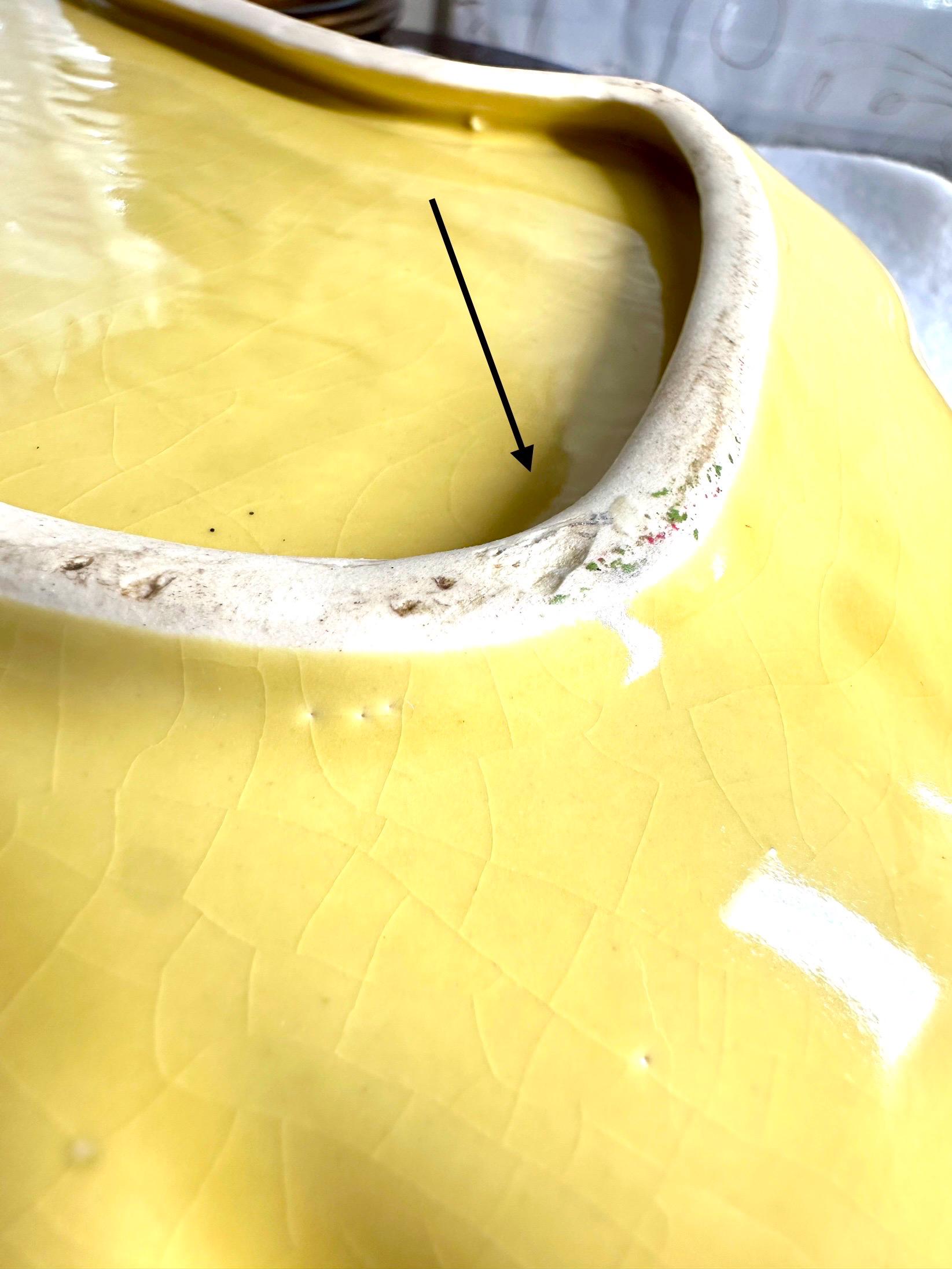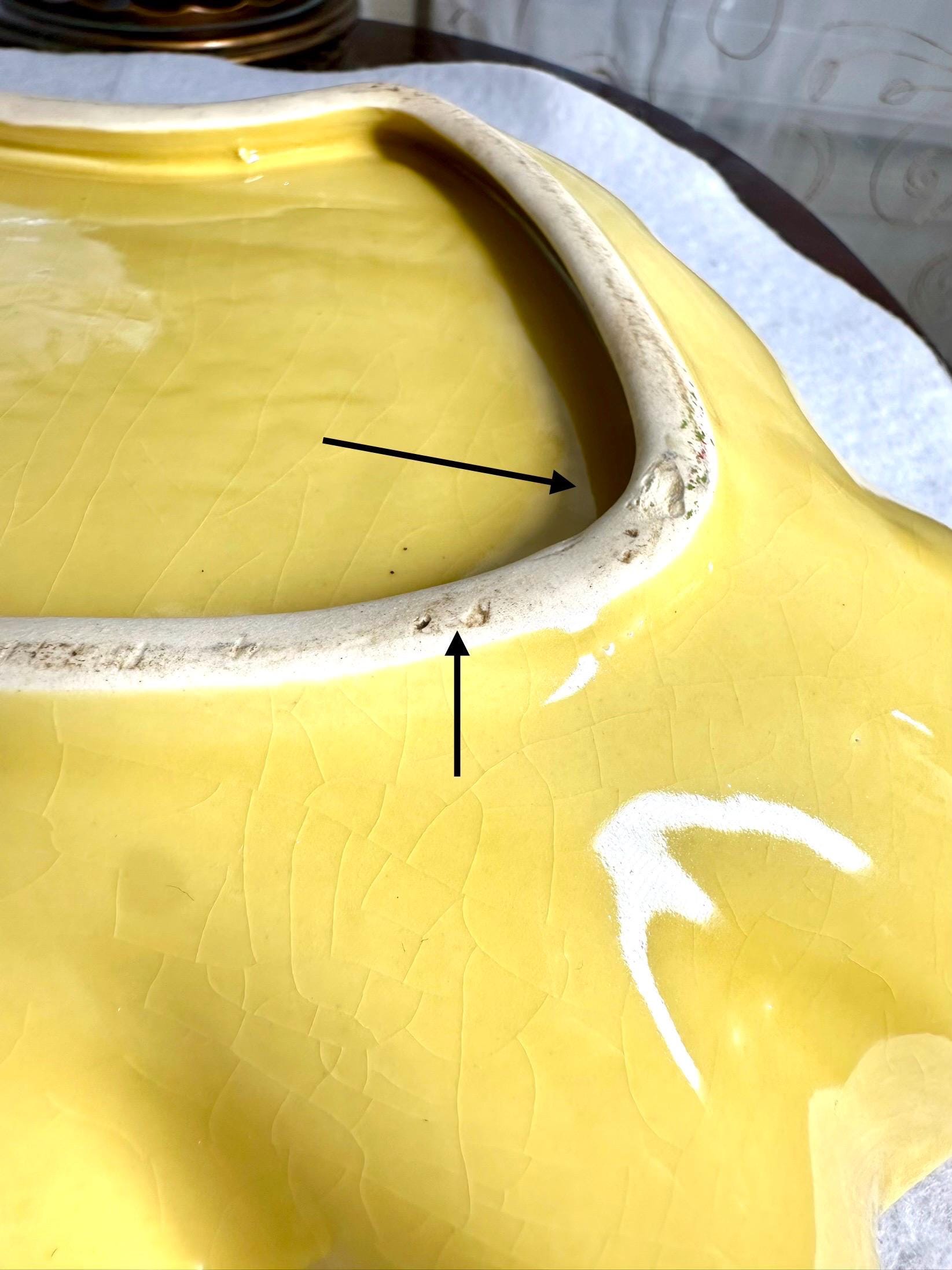 This is a Mid-Century Modern Yellow Serving Platter that I am ready to go to a new home. This is a beautiful banana yellow platter that is 13 1/2 inches long and 9 1/2 inches wide. This does have some black specs on the bottom of the platter, but it appears that it was something that was there when they made the platter. There is some age-appropriate crazing on this serving dish. The bottom of this has chipping where it is not glazed around the edges, where it is placed down on the counters.