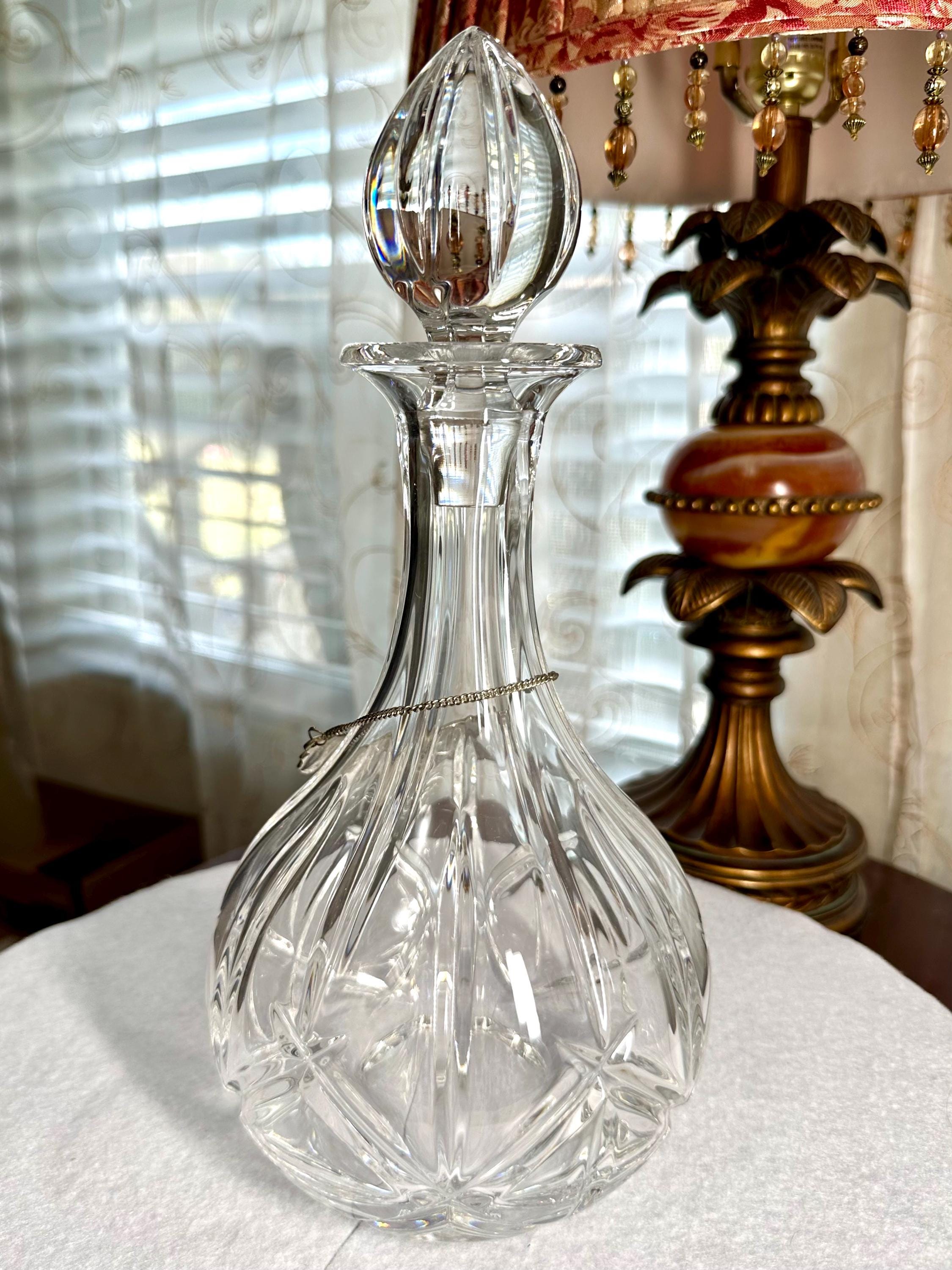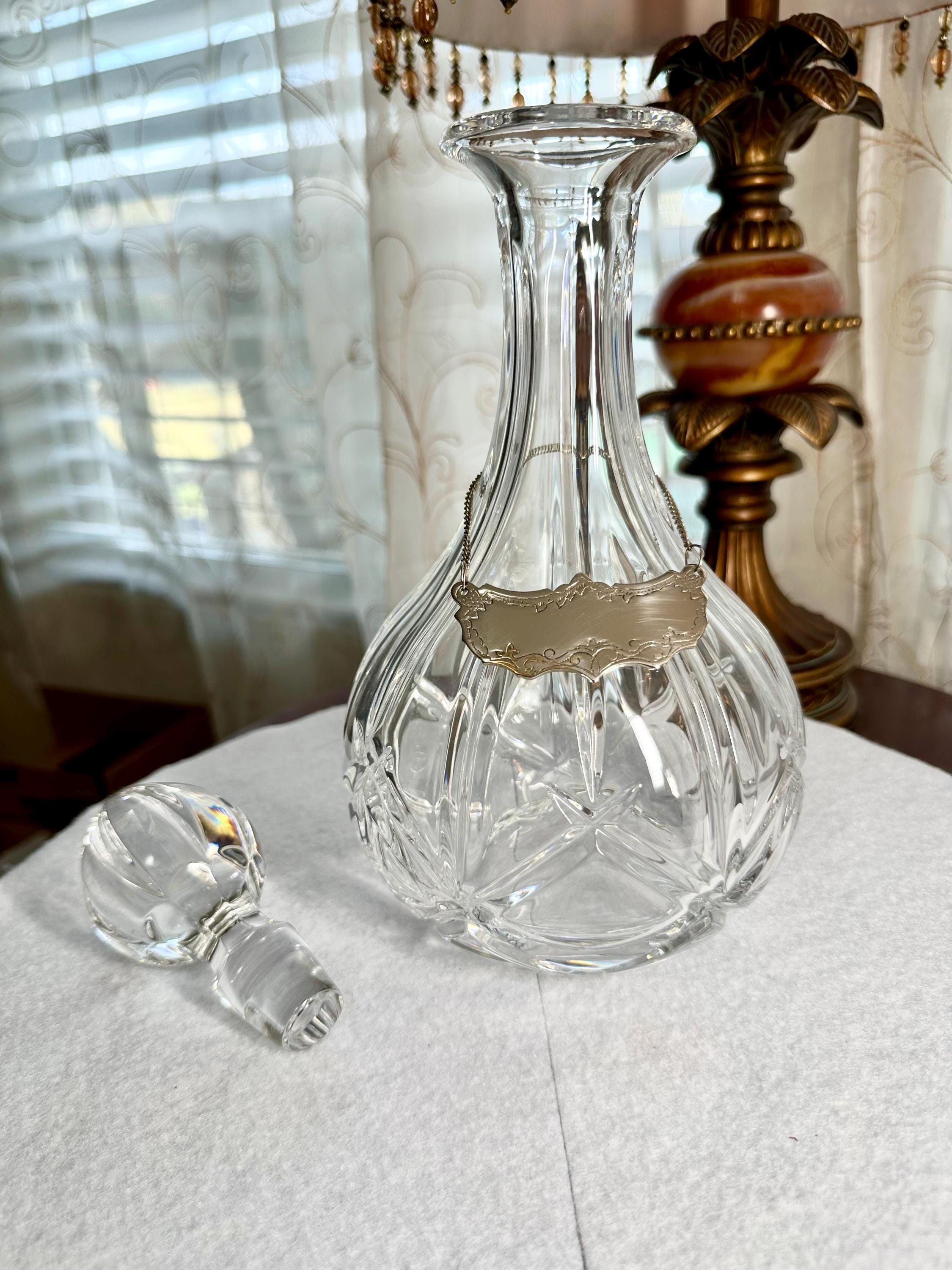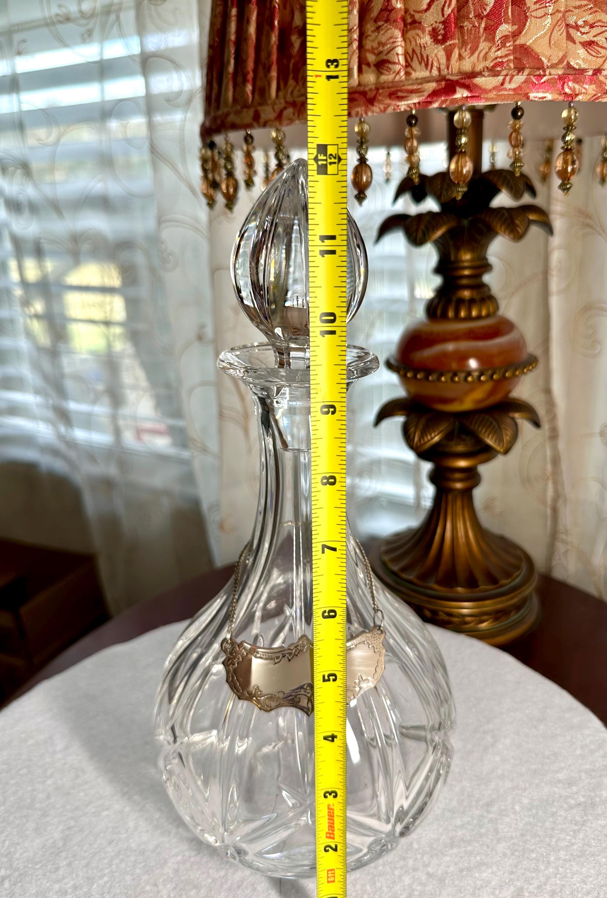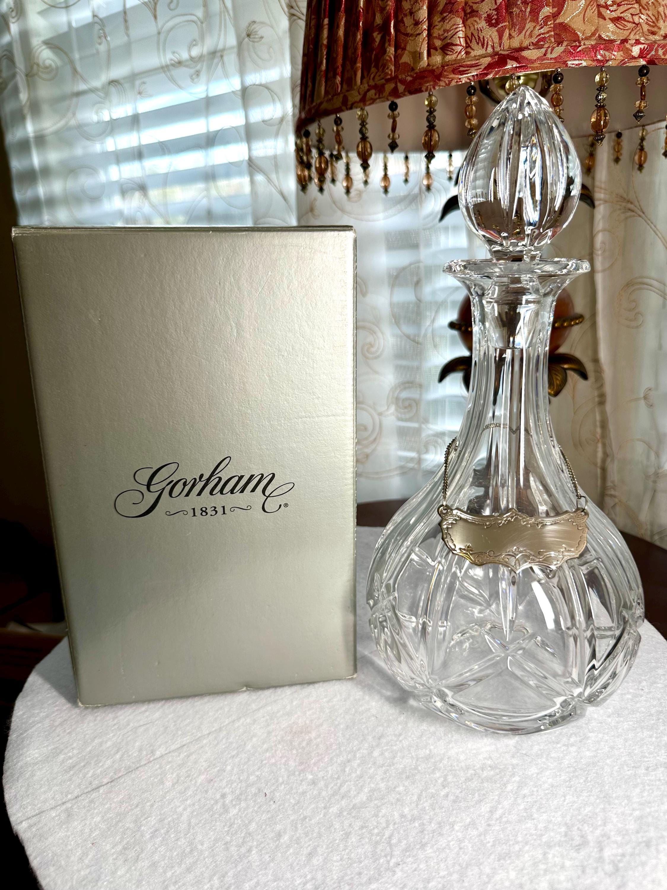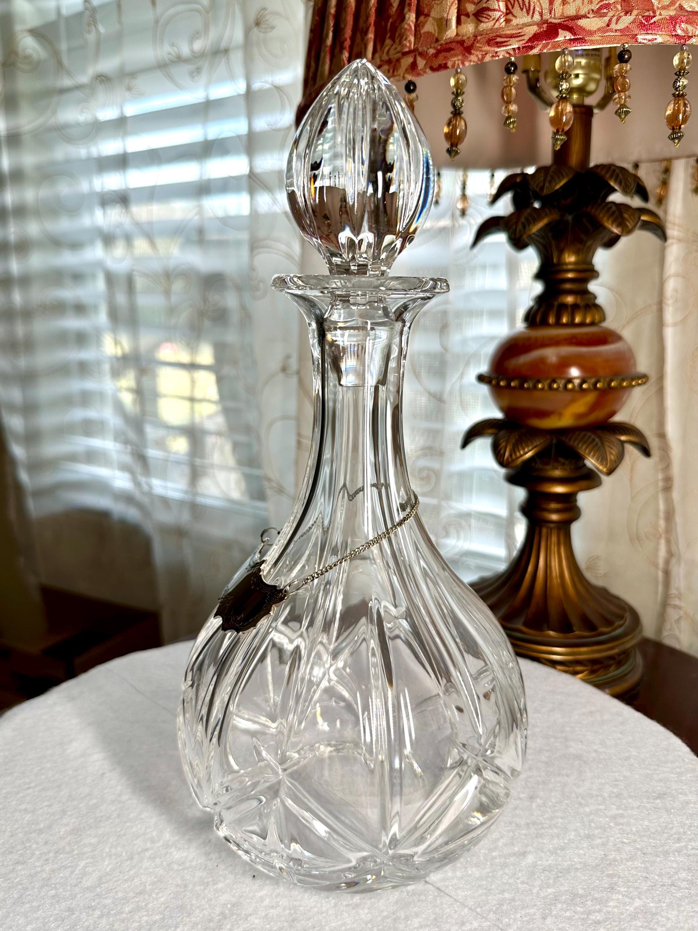 This is a beautiful Gorham Lady Anne Crystal Wine Decanter. This comes with the original box and metal tag that has not been engraved on. This is perfect for your personal bar at home or to be given as a gift. There are no cracks, scratches, or blemishes that I have been able to find. There is a slight discoloration on the metal tag. The stopper in the decanter is 12 1/2 inches tall; without the stopper, the decanter is 9 inches tall. The metal tag is 2 1/2 inches long and 1/2 inch tall. There are pictures of the blemished tag and the dimensions of the decanter. We do not recommend that you put this item in the dishwasher, microwave, or on the stove. Hand wash this item only with mild soap and warm water.