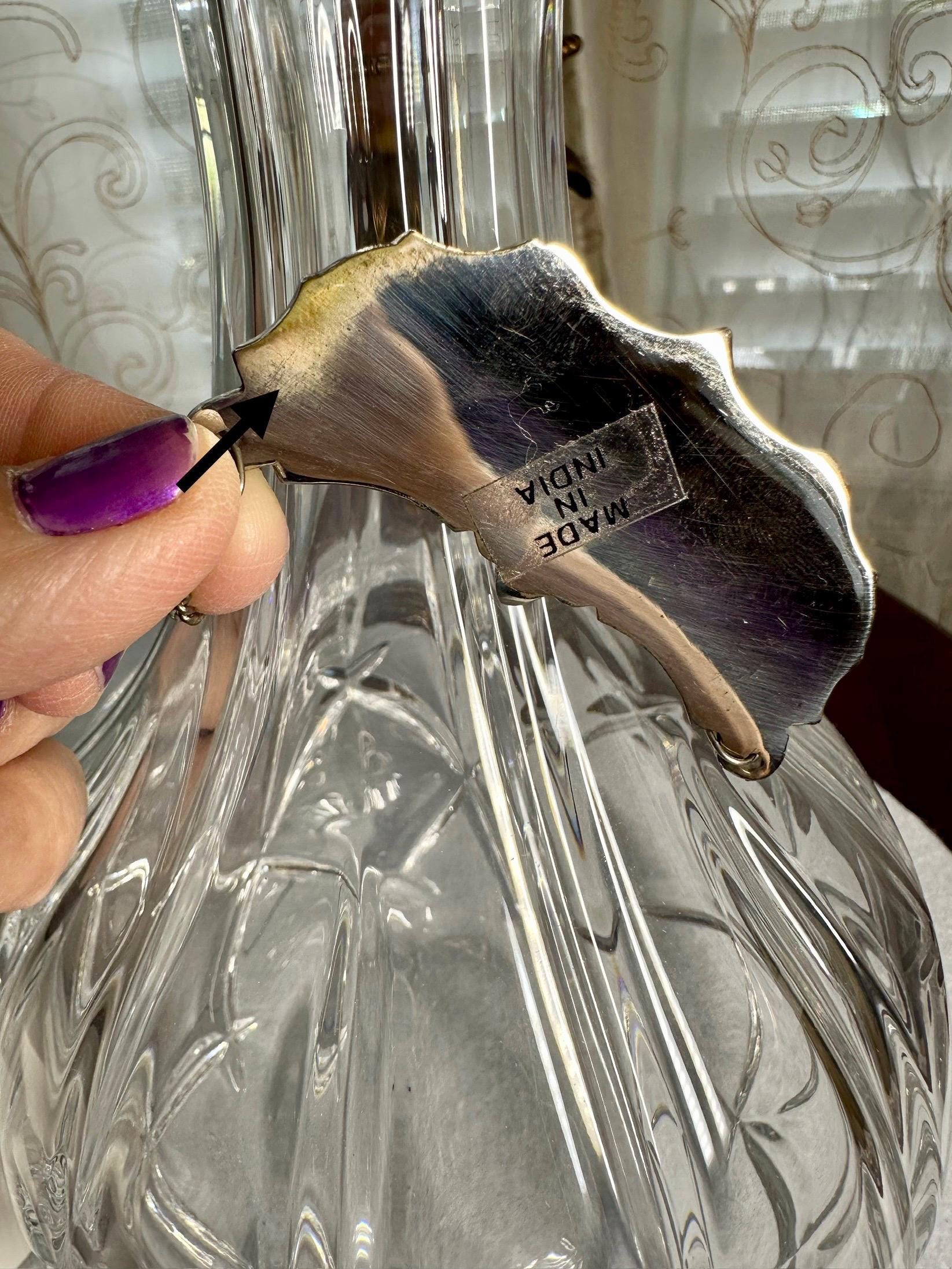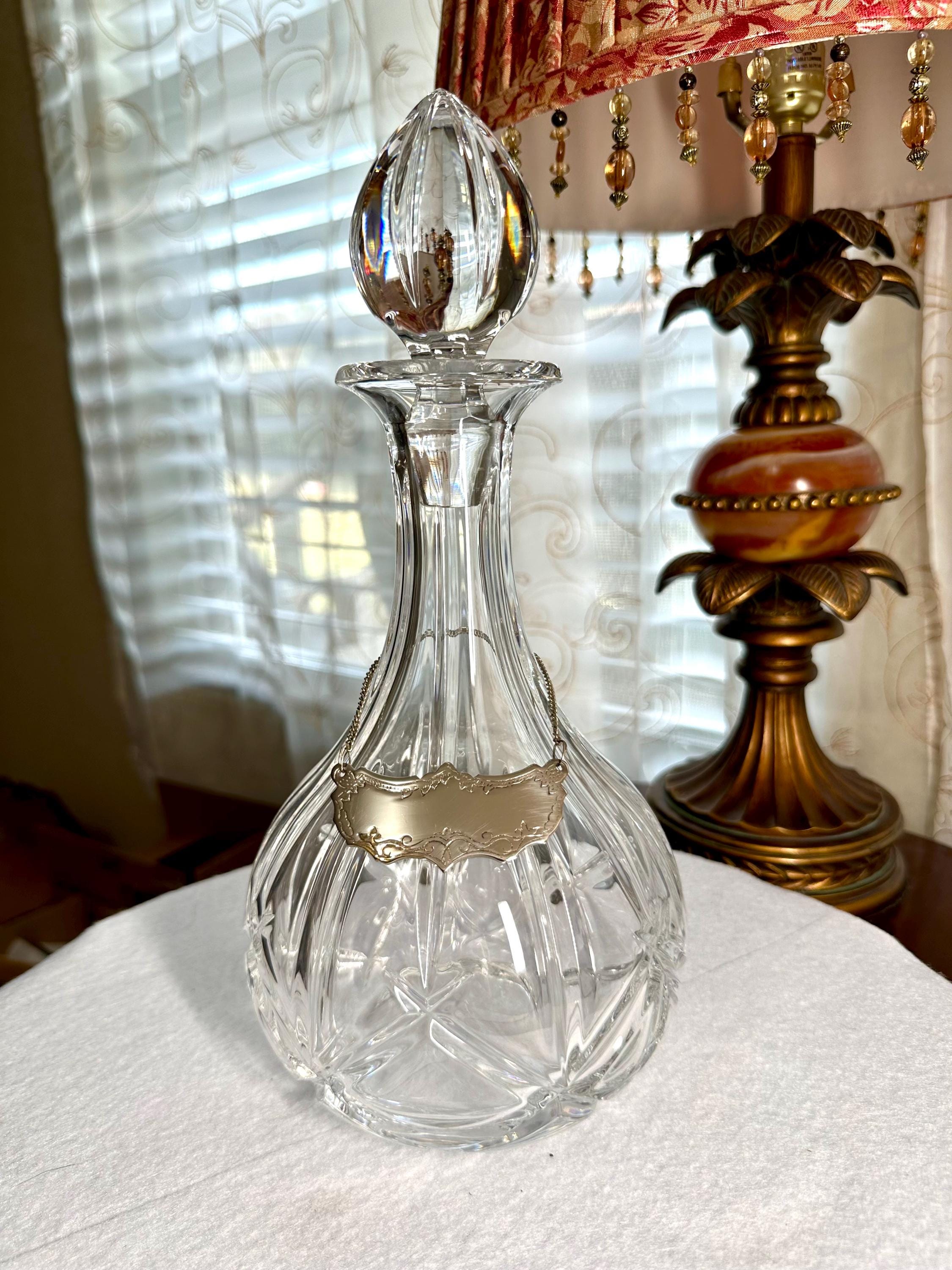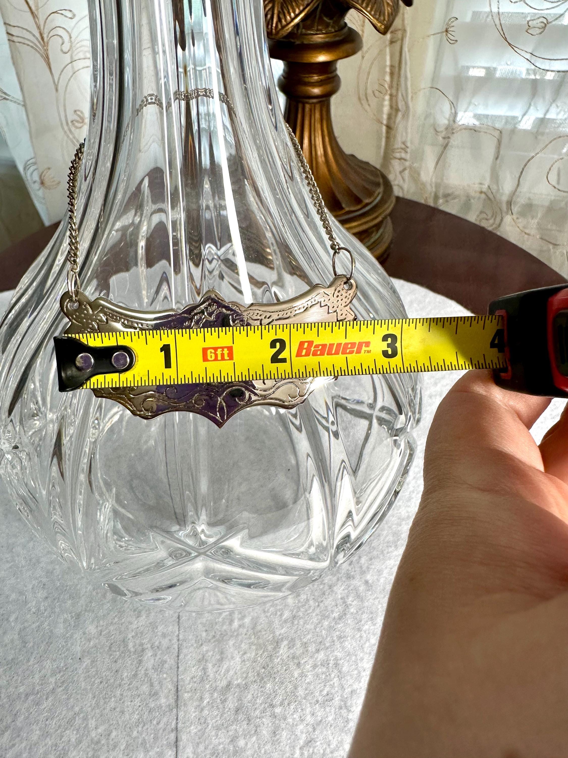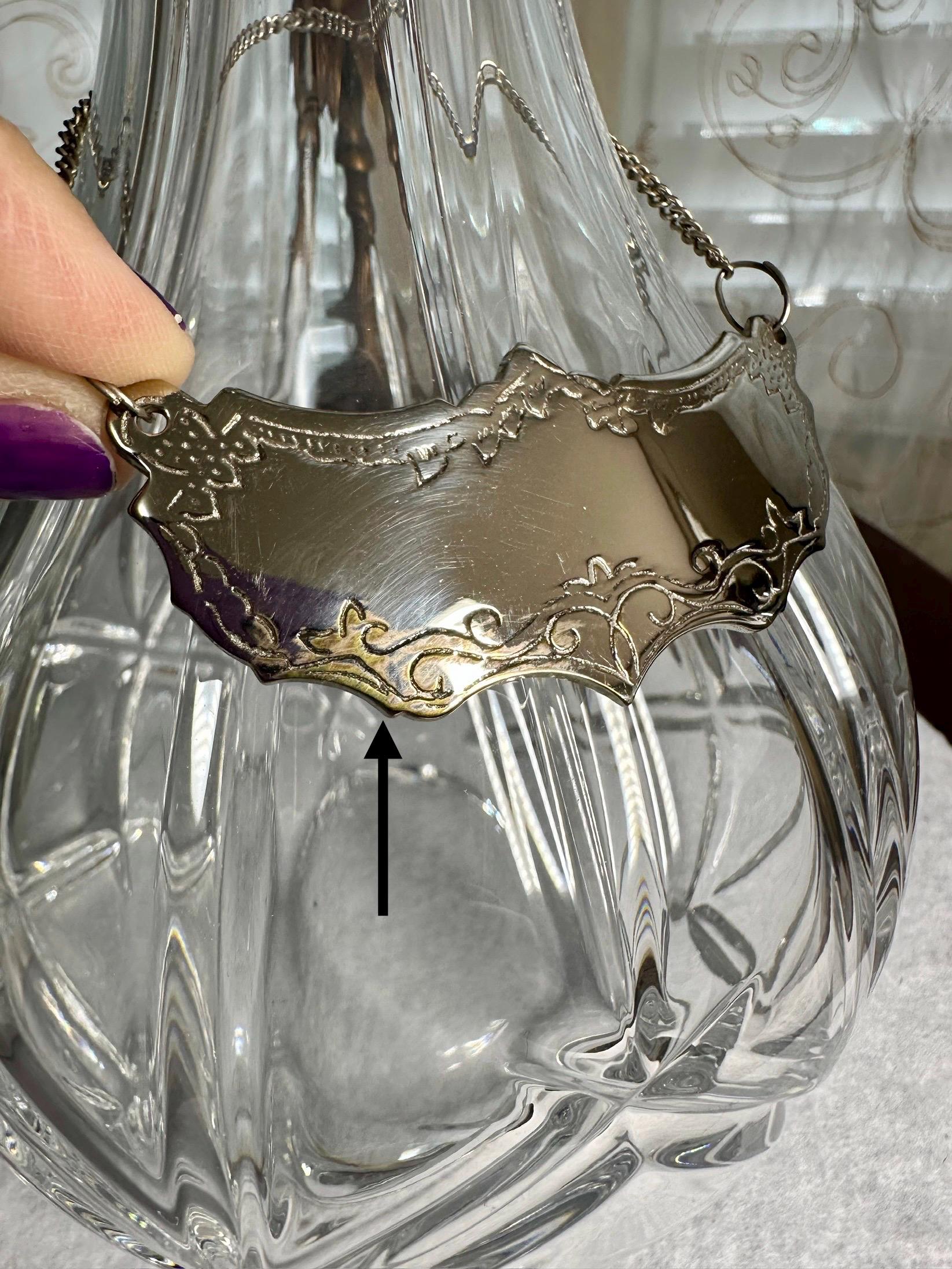 This is a beautiful Gorham Lady Anne Crystal Wine Decanter. This comes with the original box and metal tag that has not been engraved on. This is perfect for your personal bar at home or to be given as a gift. There are no cracks, scratches, or blemishes that I have been able to find. There is a slight discoloration on the metal tag. The stopper in the decanter is 12 1/2 inches tall; without the stopper, the decanter is 9 inches tall. The metal tag is 2 1/2 inches long and 1/2 inch tall. There are pictures of the blemished tag and the dimensions of the decanter. We do not recommend that you put this item in the dishwasher, microwave, or on the stove. Hand wash this item only with mild soap and warm water.